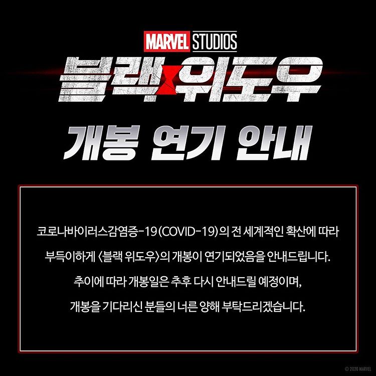현재 전 세계적으로 확산되고 있는 코로나바이러스감영증-19(COVID-19)로 인해 각국에 피해가 잇따르고 사람들이 많이 모이는 영화관엔 기대작들의 개봉을 미루는 일이 벌어졌습니다. 마블 시네마틱 유니버스의 영화 <블랙 위도우> 역시 그중 하나지요. 비단, <블랙 위도우> 뿐만 아니라 디즈니+로 공개될 드라마 <팔콘과 윈터 솔져>, <완다비전>, <로키> 역시 촬영 일정이 밀려 본래 공개 일정에서 미뤄지는 걸로 결정되었답니다.