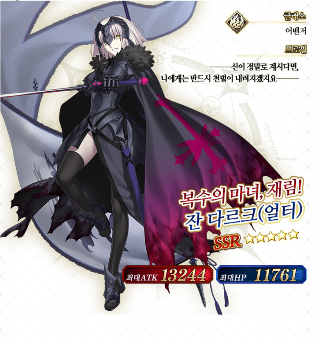 성녀 잔 다르크에겐 반전 측면인 얼터가 존재할 수 없으나, 질 드 레가 성배의 진흙으로 만든 존재. 즉, 자작 서번트(…) 본래는 영령도 아니기에 소환할 수 없는 존재이나, 잔 다르크는' 조국에 버림 받고 죽었으니 복수할 권리가 있다'는 사람들의 몽상을 이용해 영령의 좌에 등록. 칼데아에 소환되는 서번트입니다. Fate 시리즈에선 오리지널인 룰러 잔 다르크가 성인聖人으로서 인간성이 좀 부족한 묘사가 많았는데, 어벤저 잔 다르크는 인간성이 풍부하게 묘사된 덕분에 캐릭터로서의 매력이 더 뛰어나 원본의 인기를 뛰어넘은 캐릭터라 할 수 있습니다.