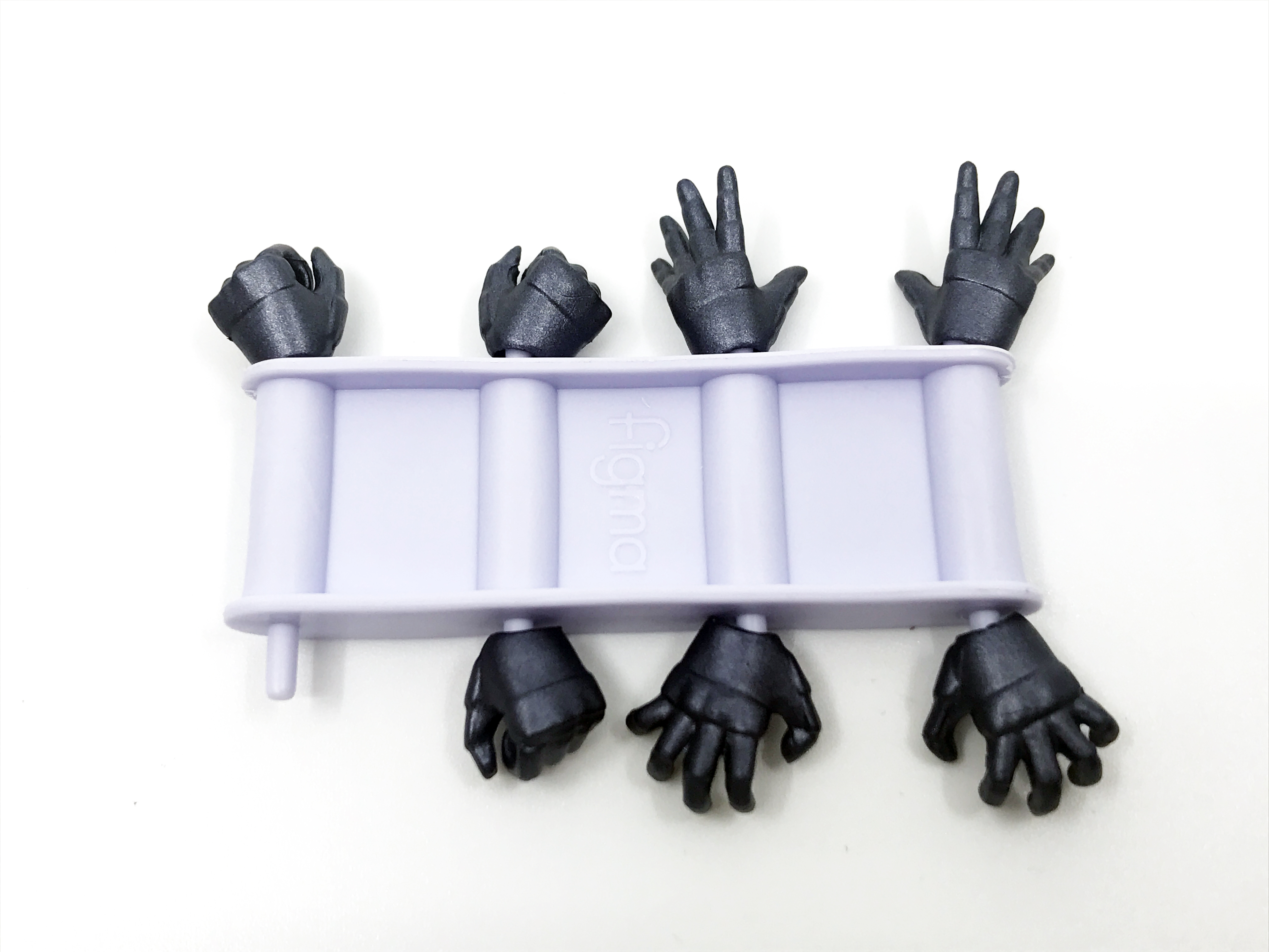 구성품. 피그마 스탠드와 예비 손목 관절, 교체용 손 부품들.