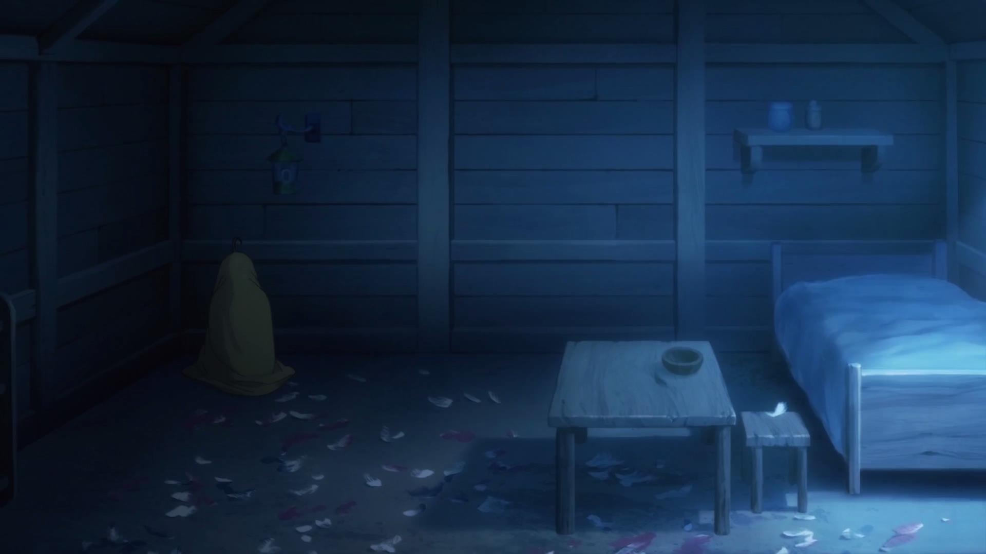 엔딩이 올라온 후, 깃털이 빠져버려 담요로 몸을 감싸는 이리를 보여줍니다.