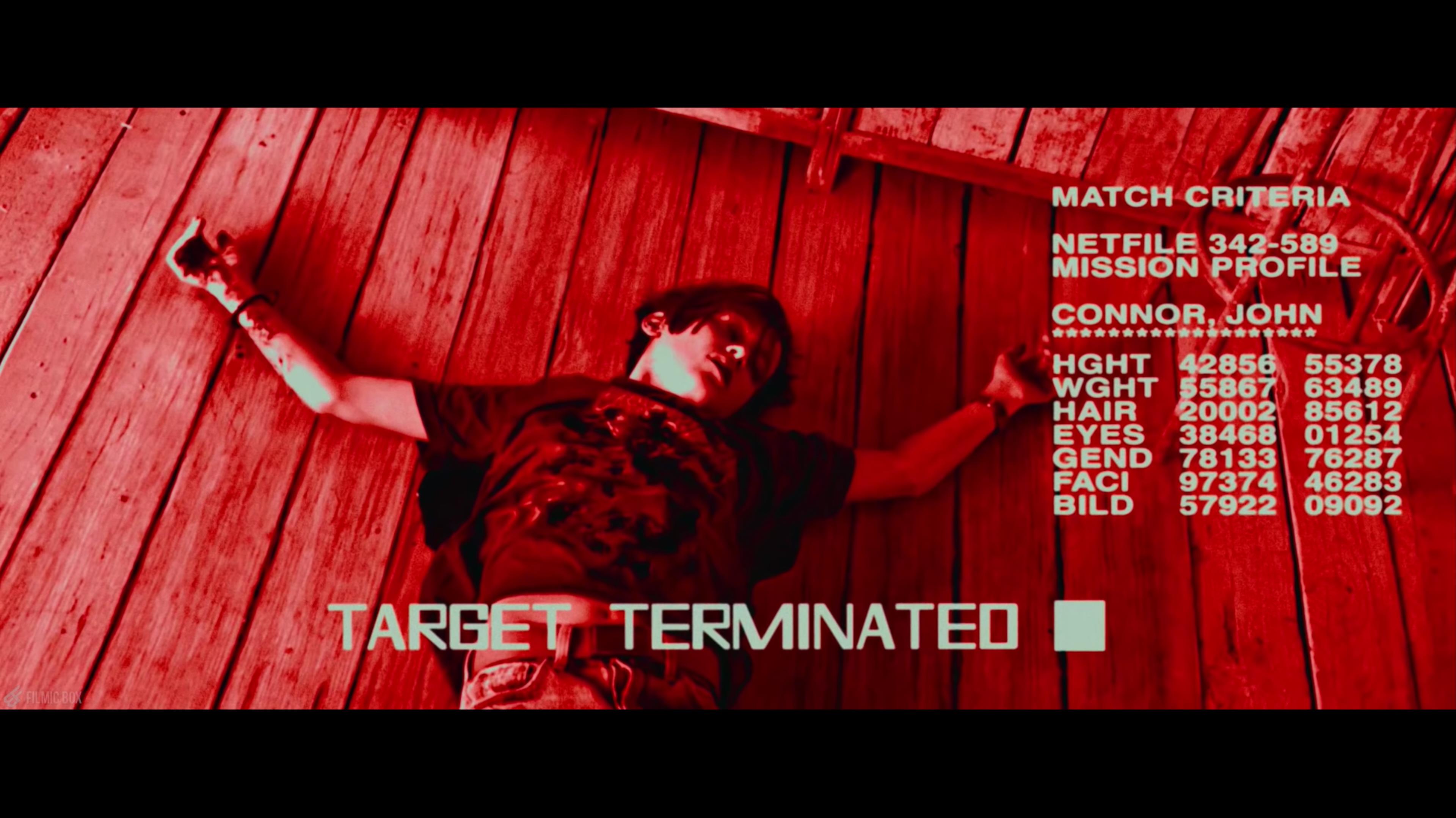 20세기 폭스 타이틀이 올라오면서 영화 <터미네이터 2: 심판의 날>에 나왔던 사라 코너의 정신 병원 취조 테이프 장면을 보여줍니다. 심판의 날이 1997년 8월 29일 동부표준시간 새벽 2시 14분에 올 걸 알고 있지만, 세상은 그렇지 않기에 그녀를 정신병원에 가둔 것.