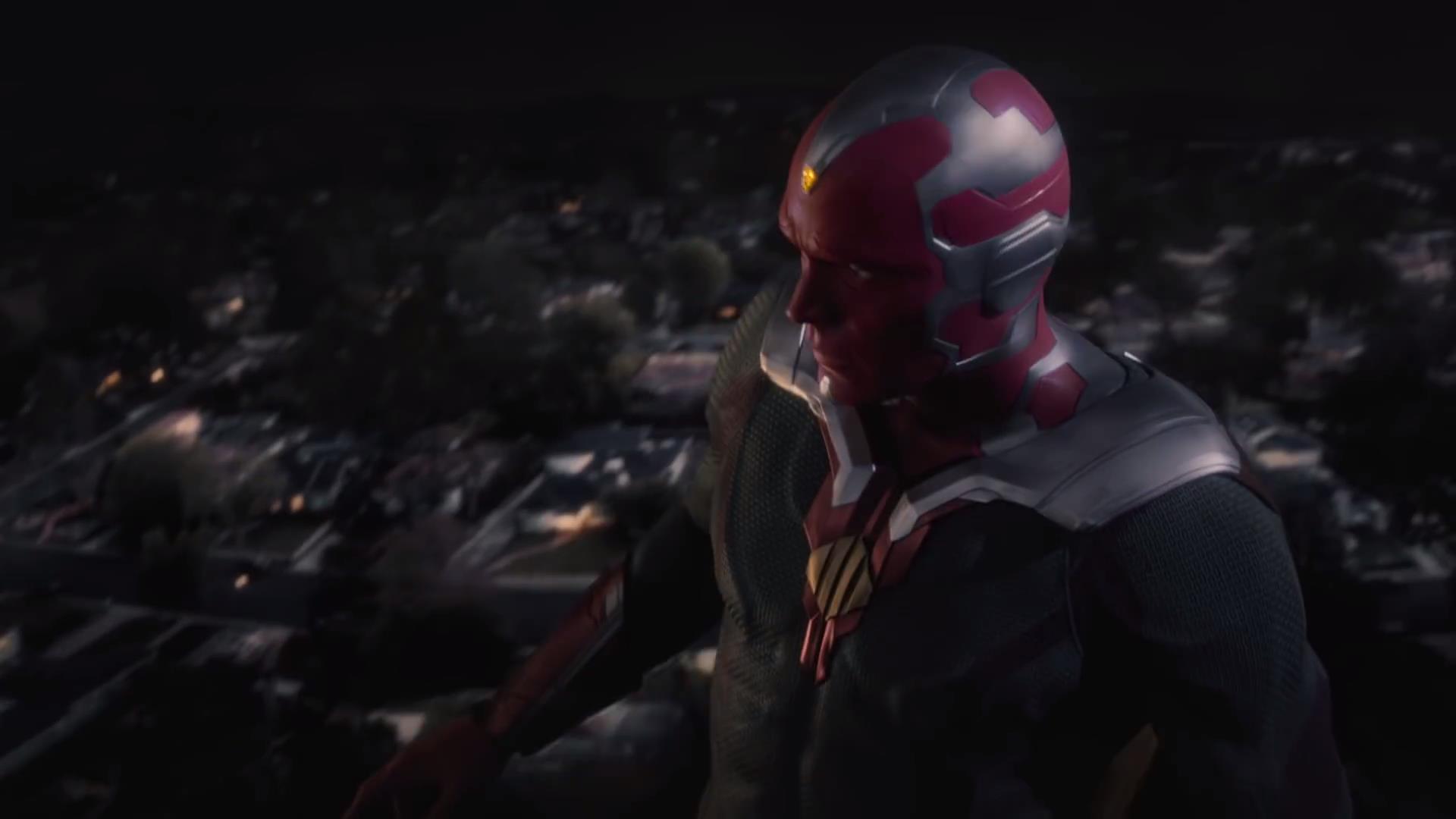 본연의 모습을 취해 비행하는 비전. 마을의 분위기가 심상치 않습니다.