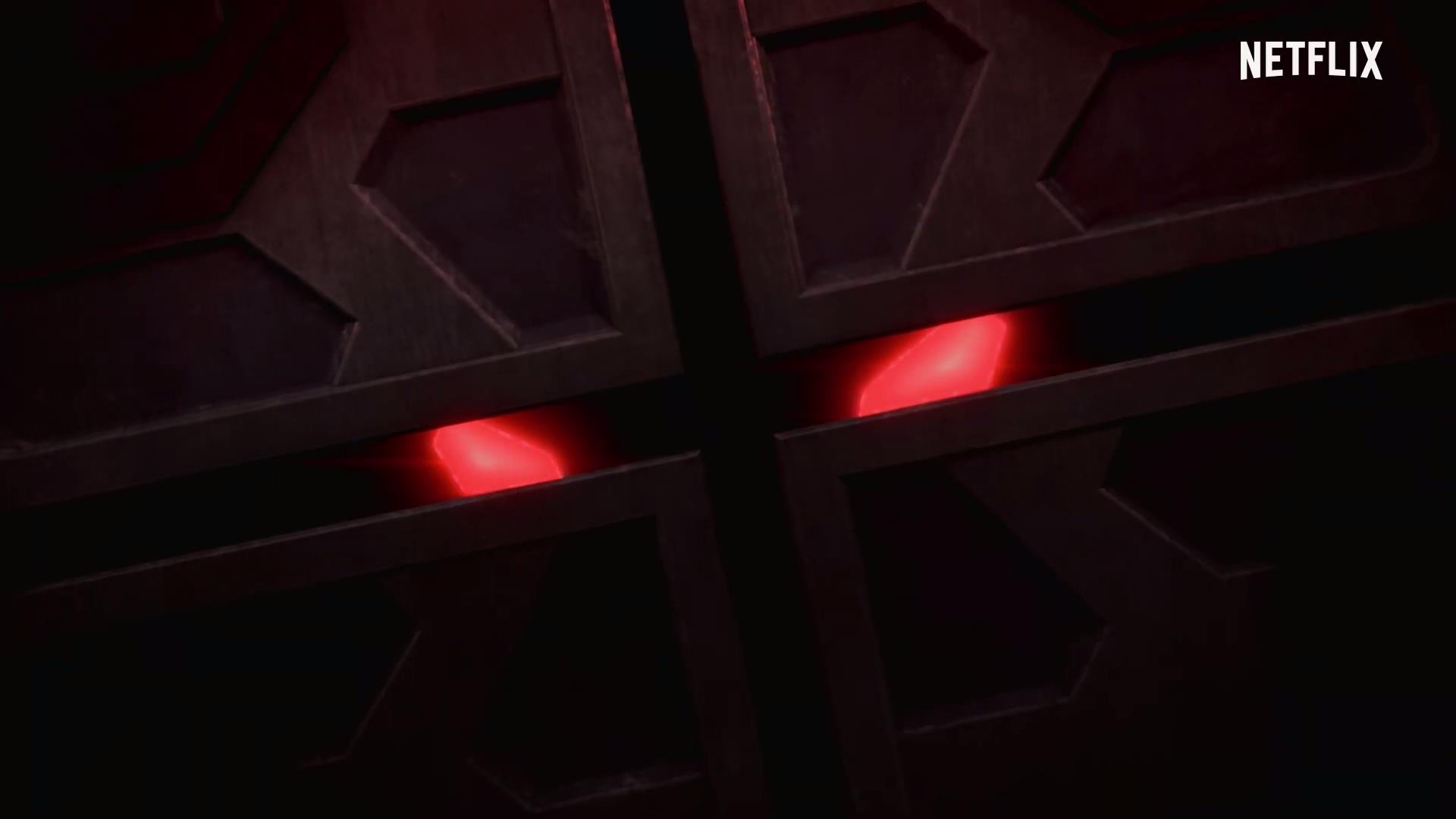문 밖에 있는 수수께끼의 거대한 붉은 눈.