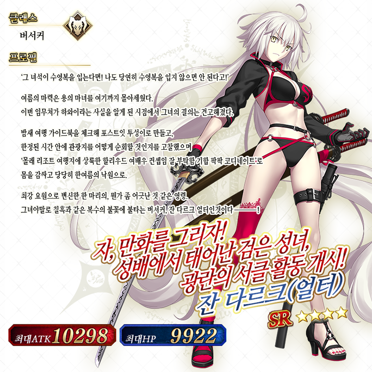 수영복 이벤트의 배포 캐릭터로 출시된 버서커 서번트 잔 다르크 [얼터]. 얼터가 참전한 이벤트의 경우, 서번트 서머 페스티벌이라는 동인지 판매를 목표로 하고 있고, 잔 다르크를 동인지 판매량으로 이기기 위해서 수영복 이벤트 내내 호텔에서 그림만 그려서 별다른 이벤트가 없는 것은 아쉬운 점이지요.