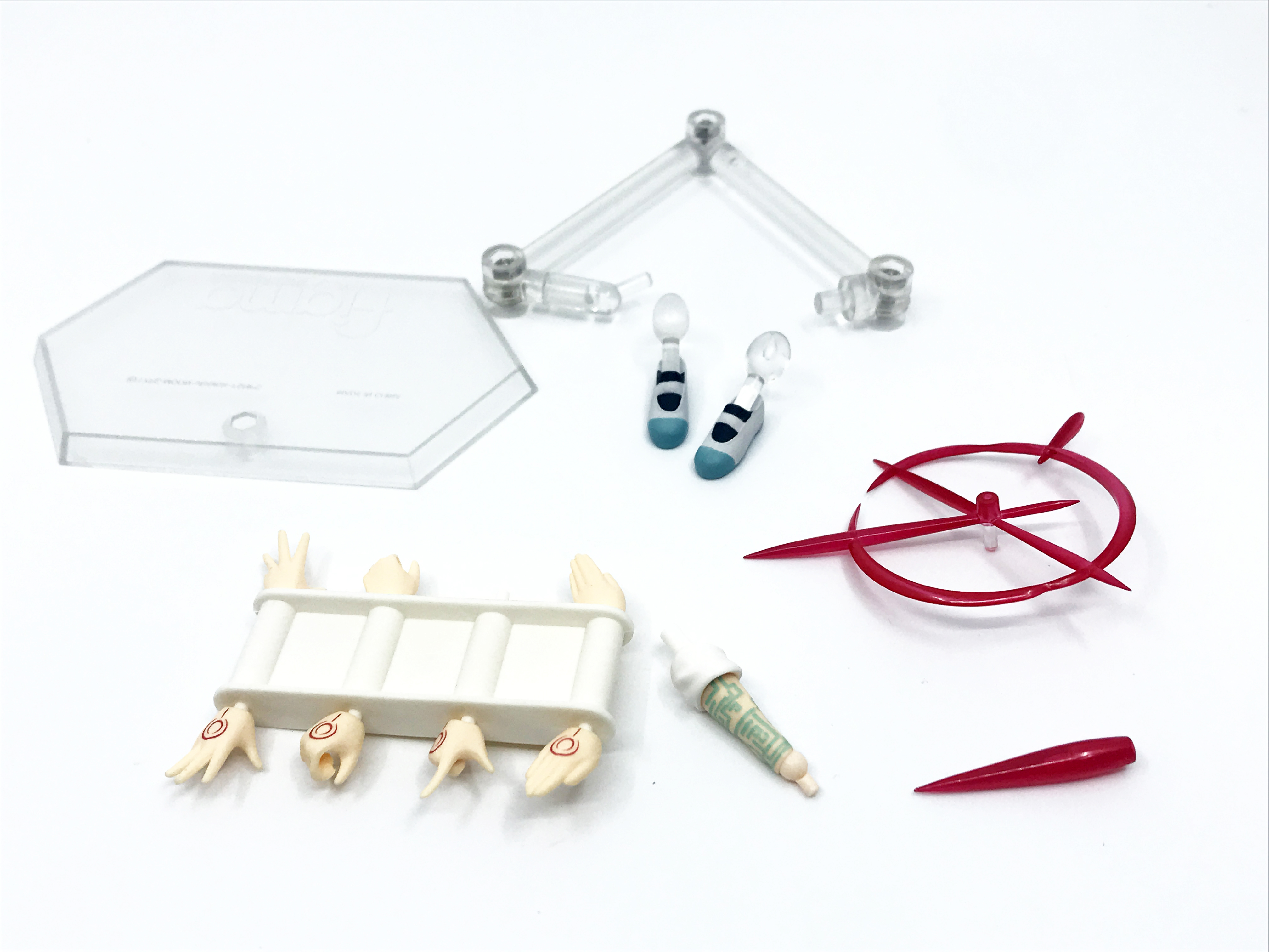 액세서리 구성. 피그마 스탠드와 실내화, 교체용 손과 마술각인이 새겨진 왼팔, 간드 효과들입니다.