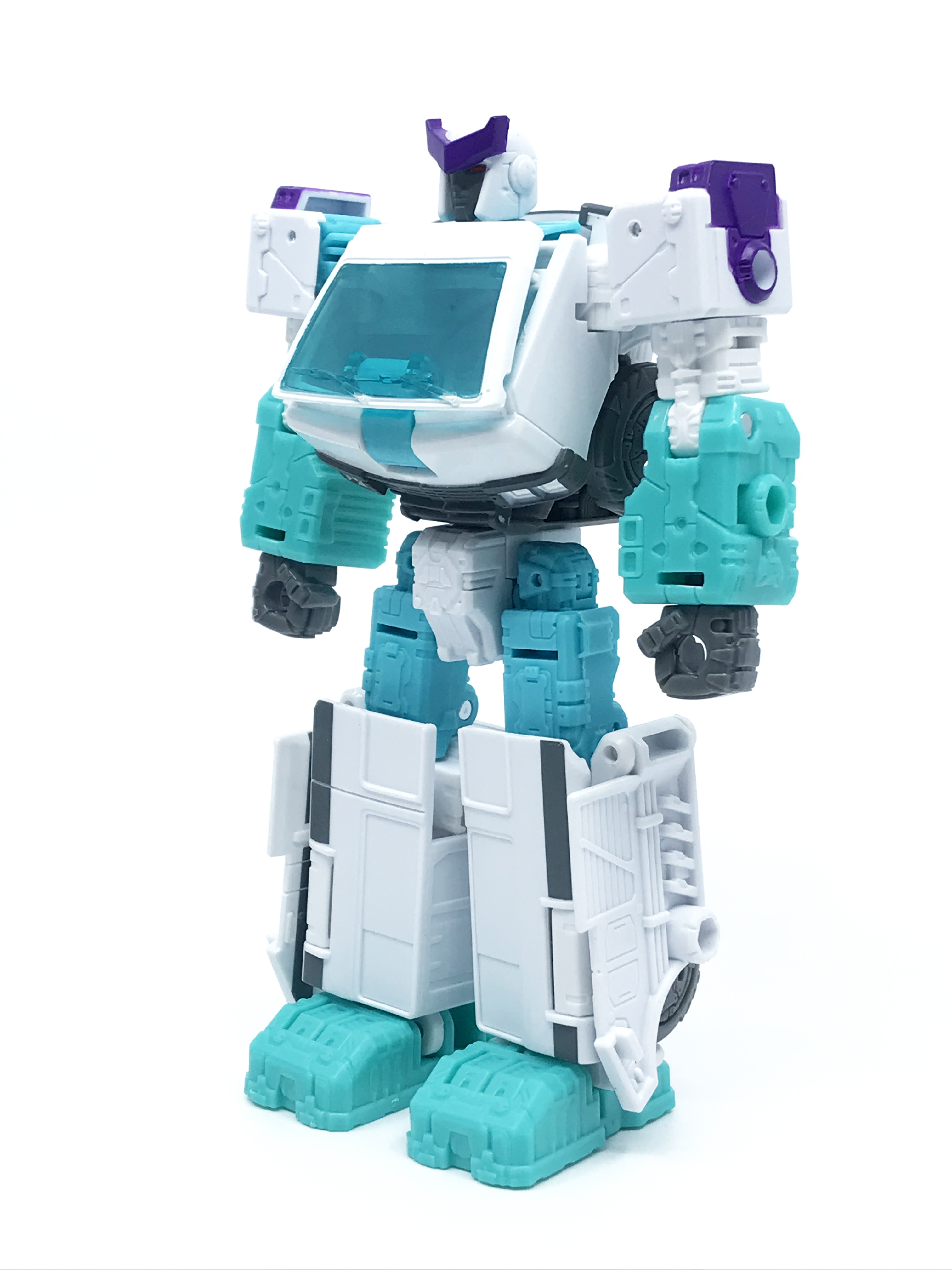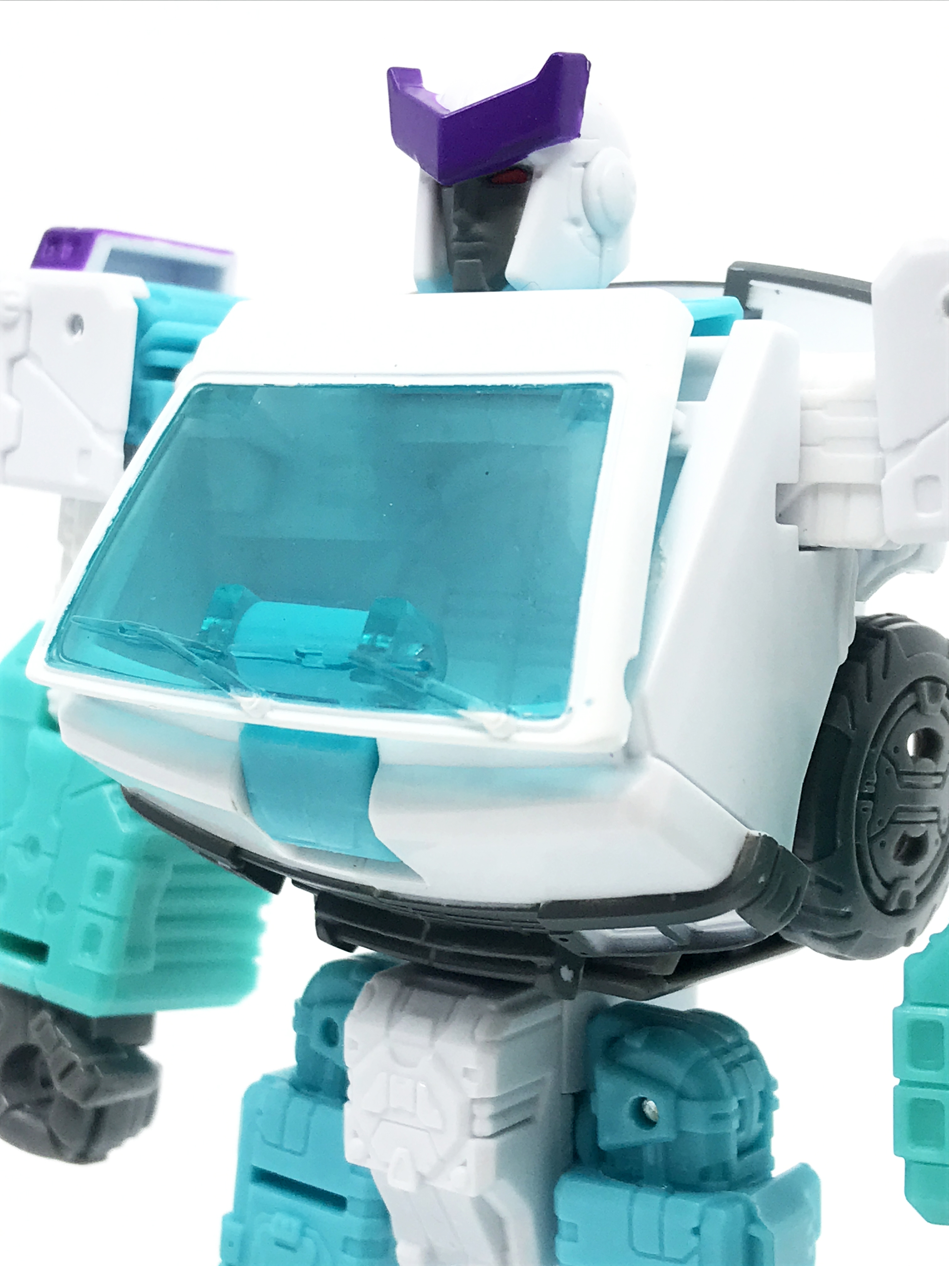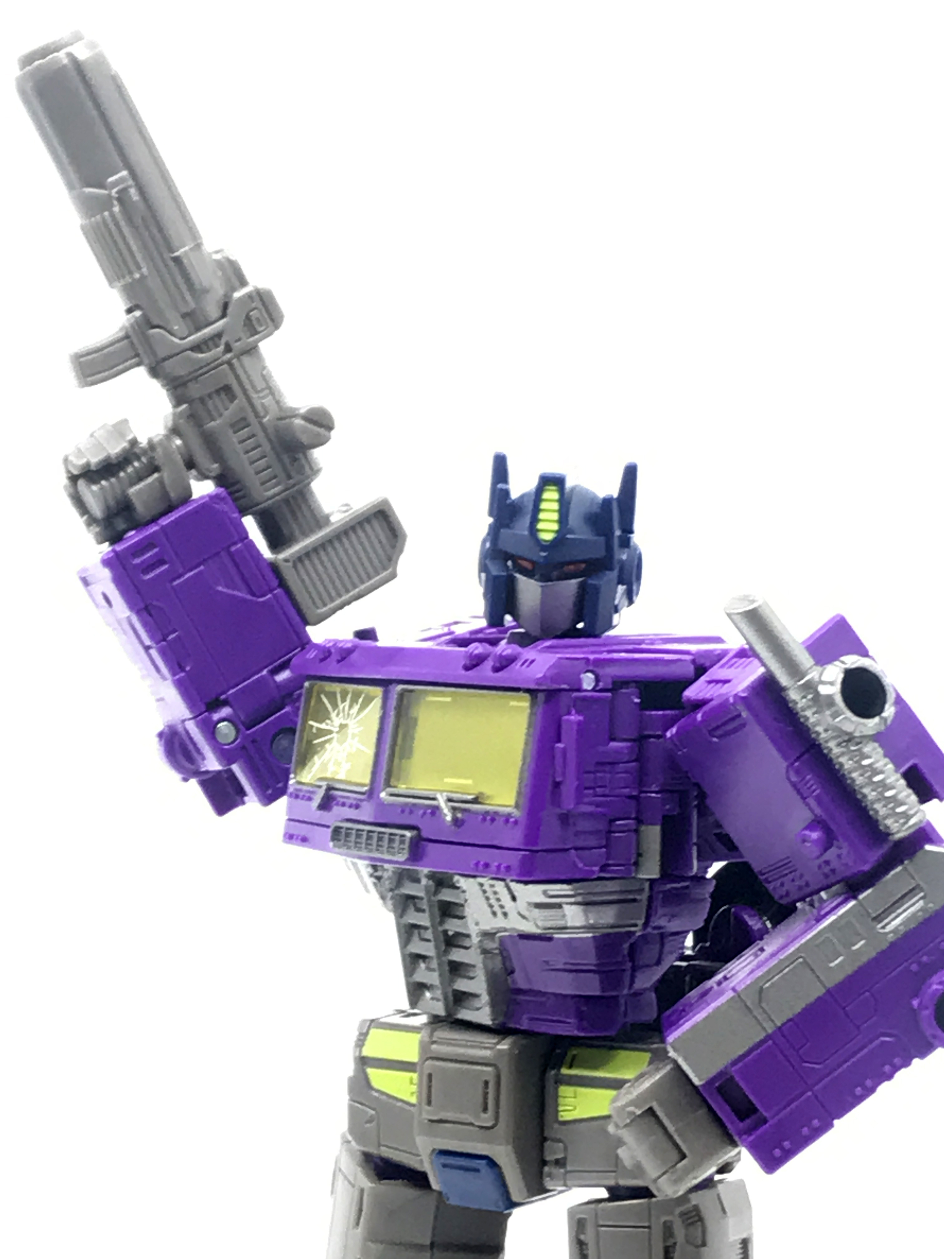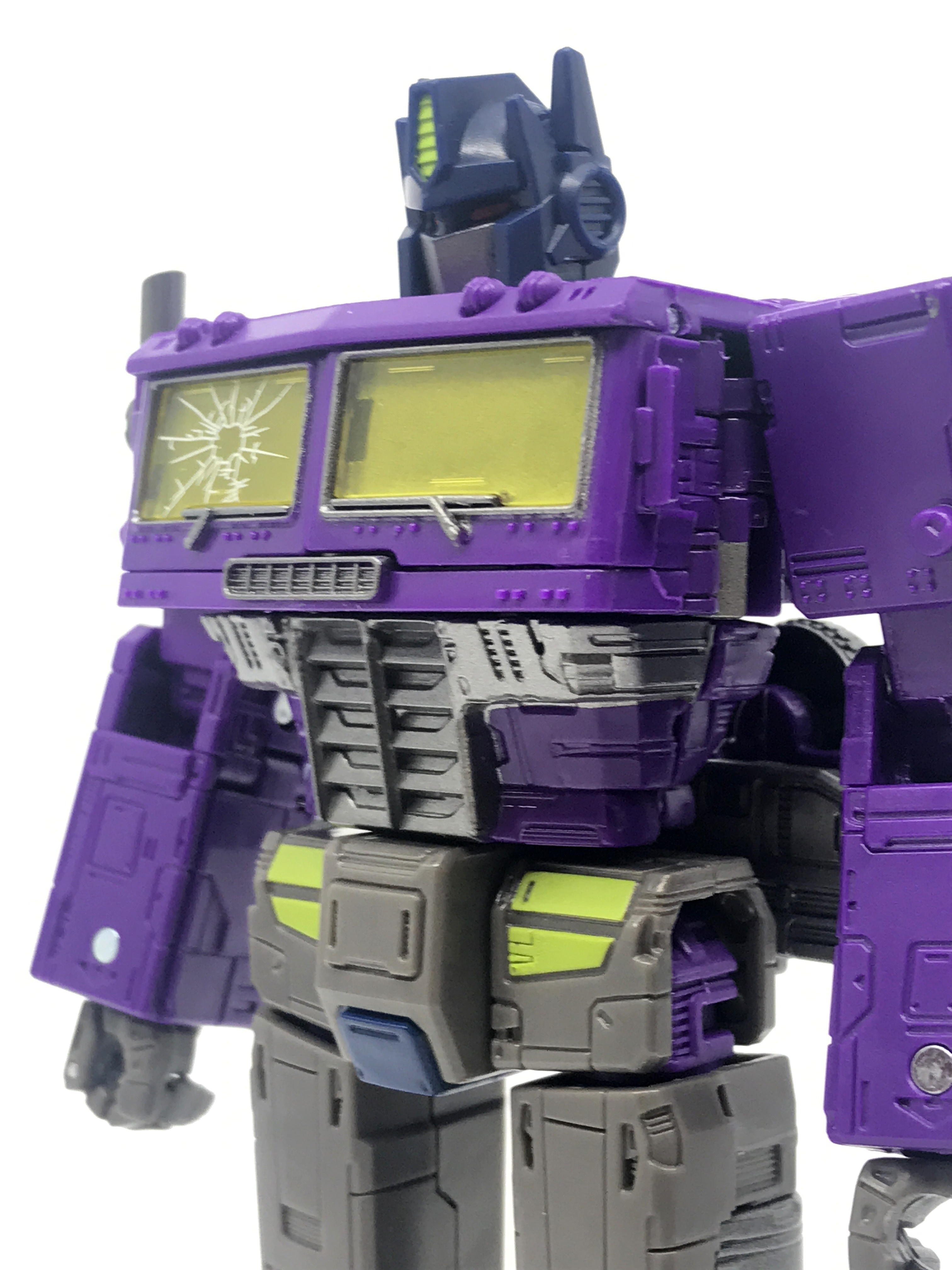 보라색 머리 장식과 회색 얼굴에 빨간 눈은 사악한 오토봇에 걸맞는 인상.