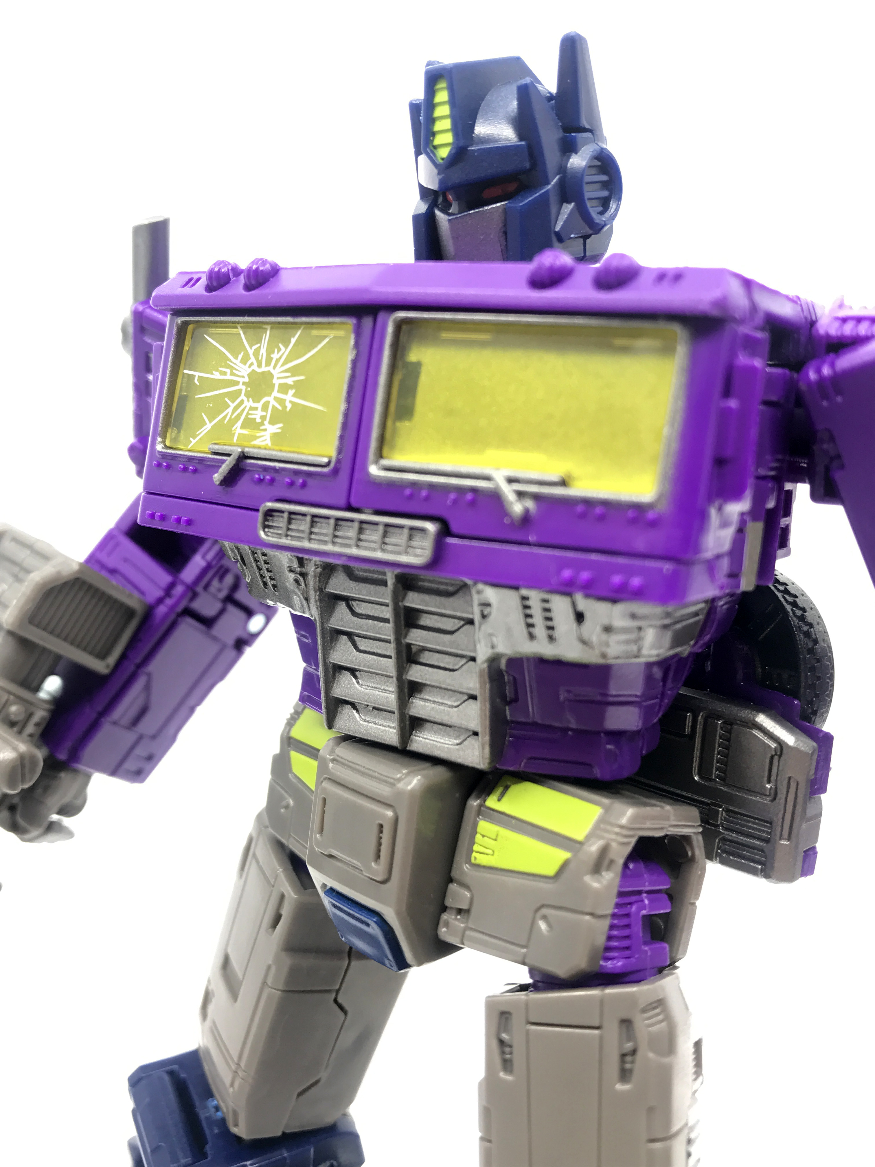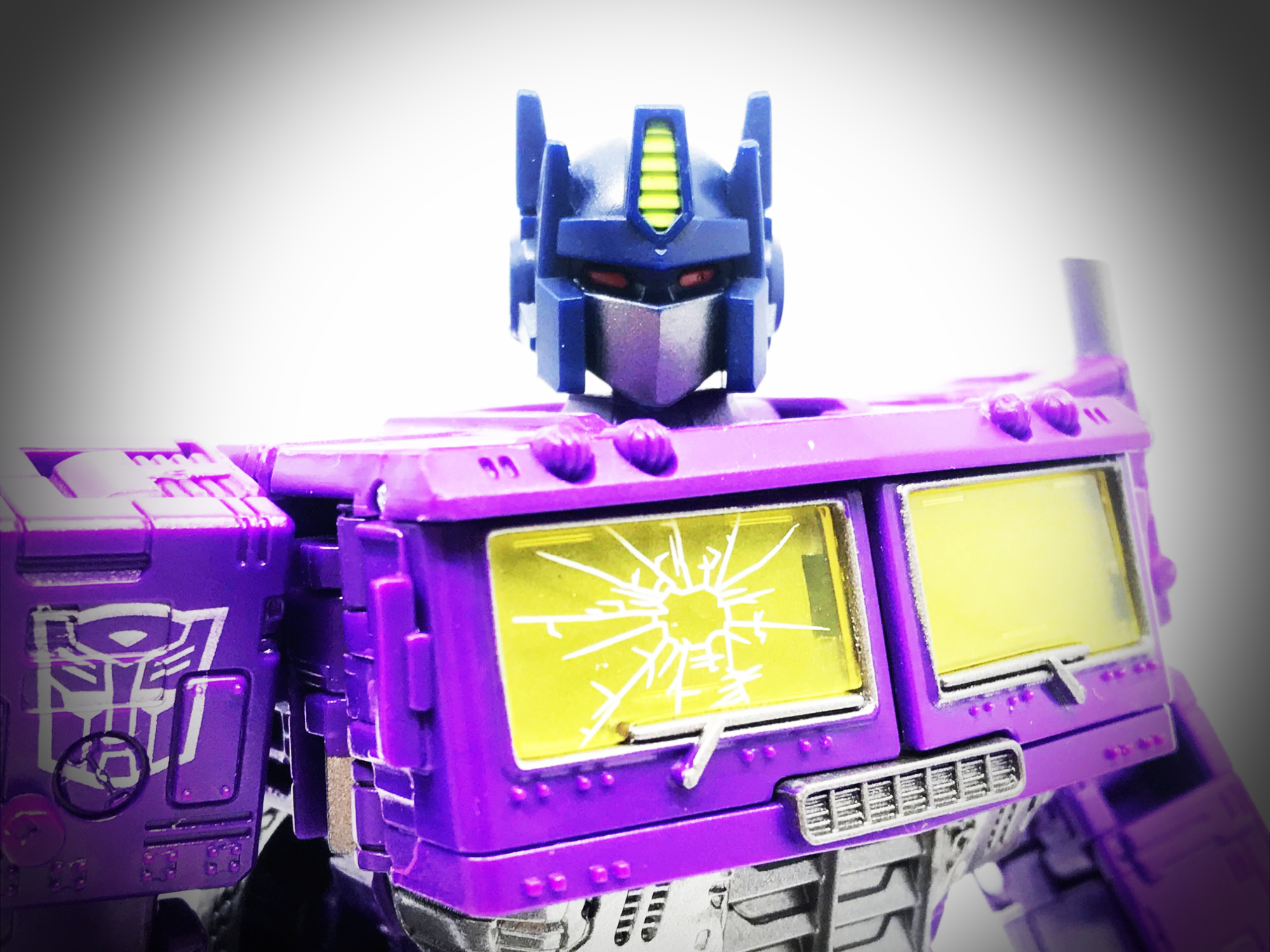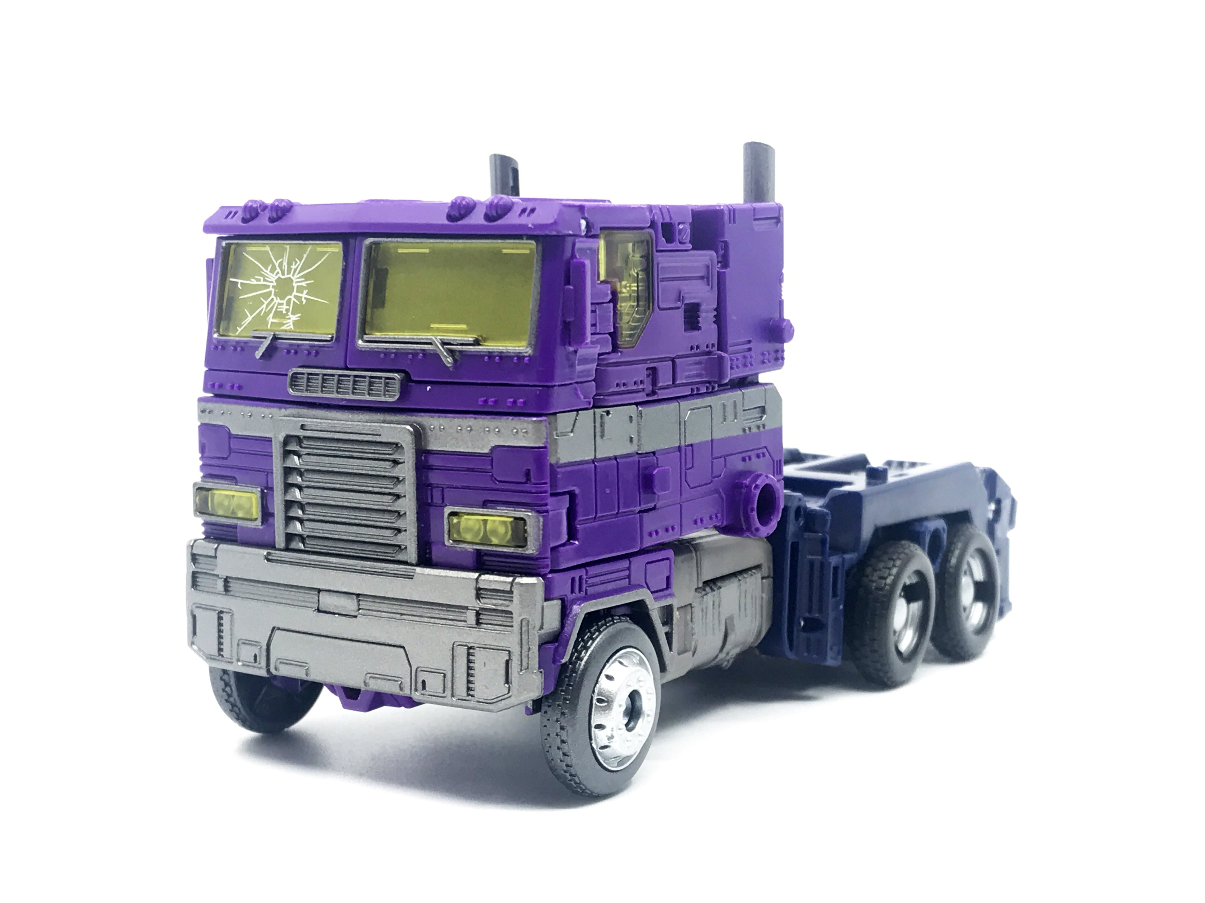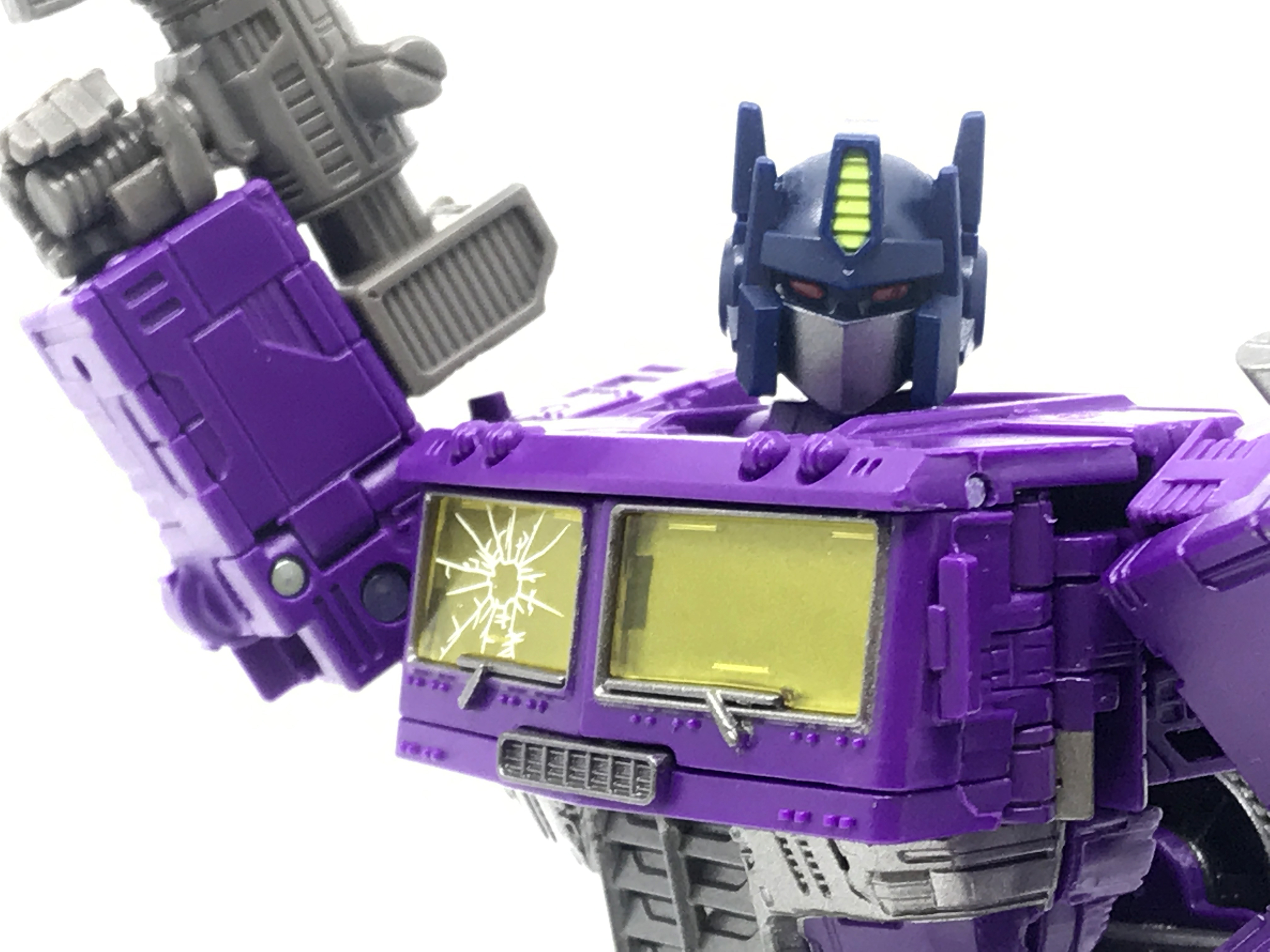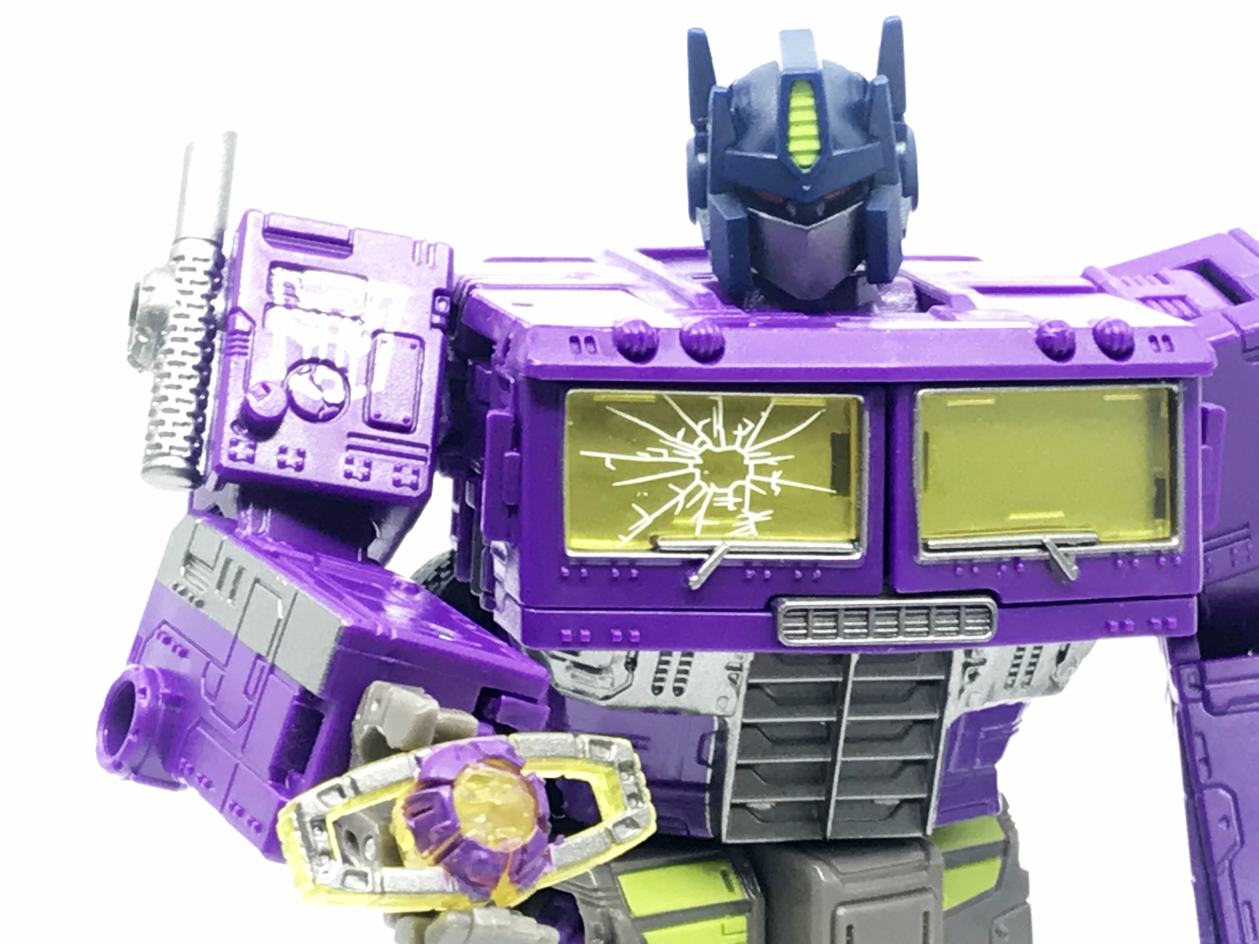 기존 옵티머스 프라임의 붉은색에서 자주색 트럭으로 변경됐고, 푸른 클리어 부품은 노란색 계열의 클리어 부품으로 변경됐습니다. 우측 창문엔 SG 옵티머스 프라임의 특유의 '깨진 유리 Shattered Glass'가 특징. 조금 아쉬운 점은, 이쪽은 SG 라쳇과 합본으로 나오면서 트럭이 없다는 것.