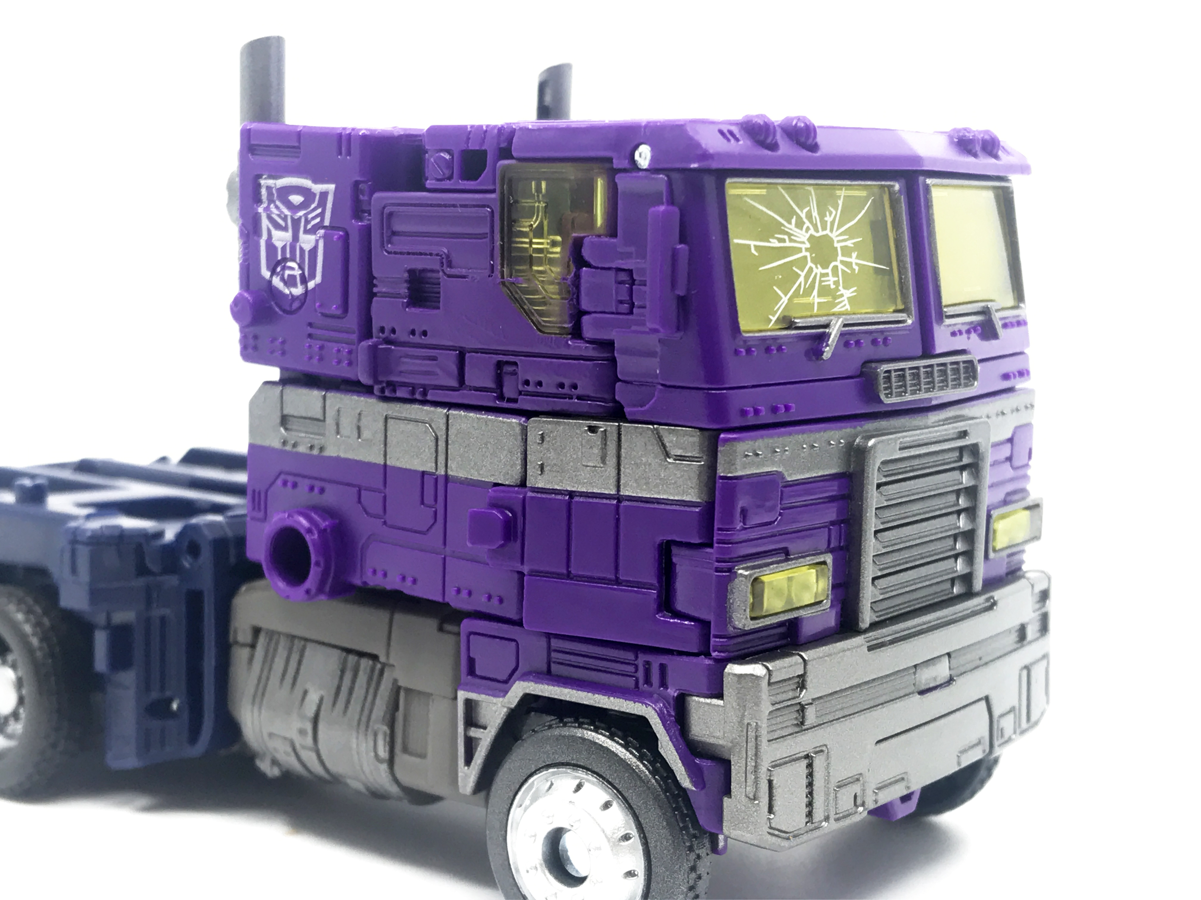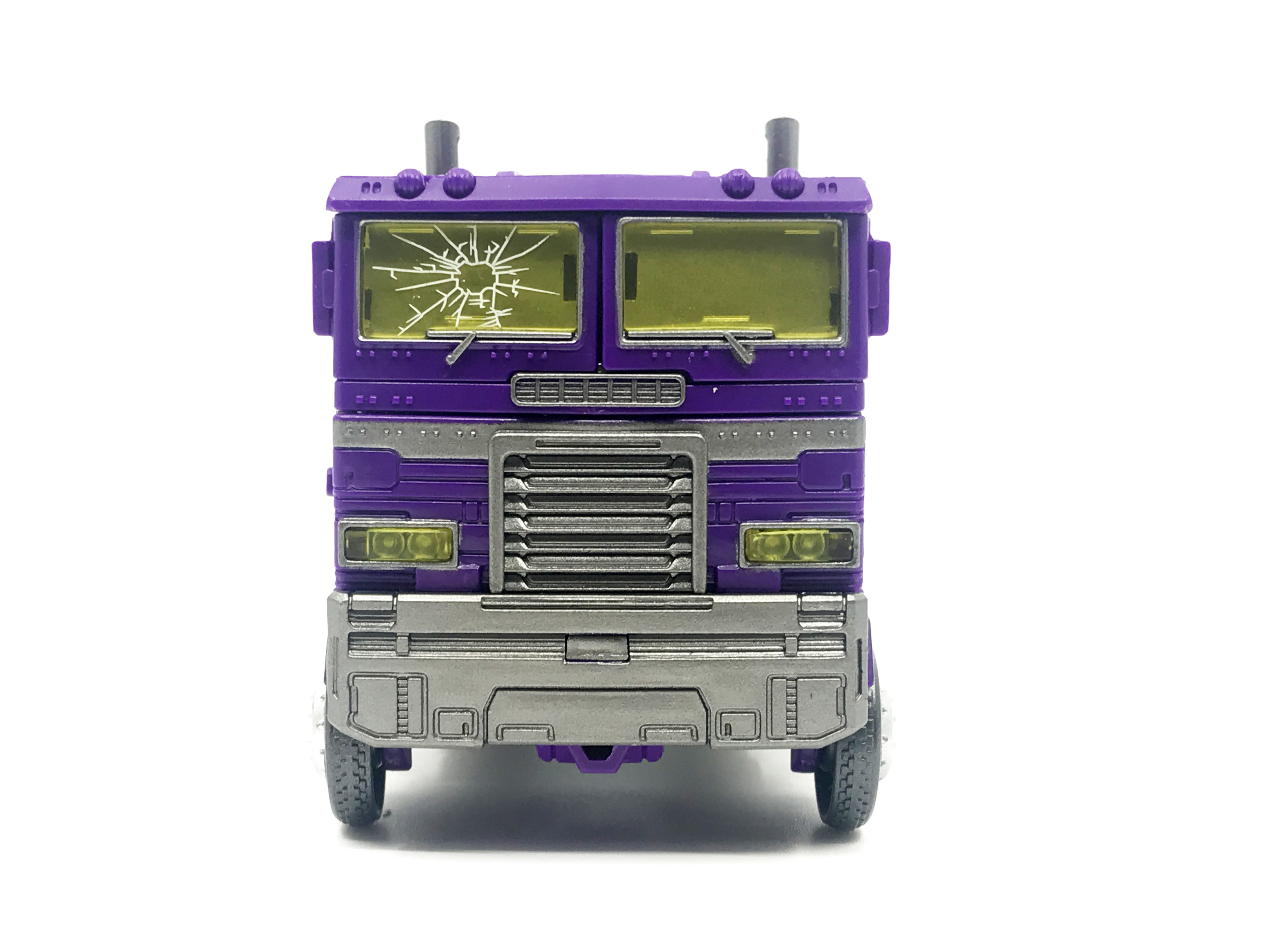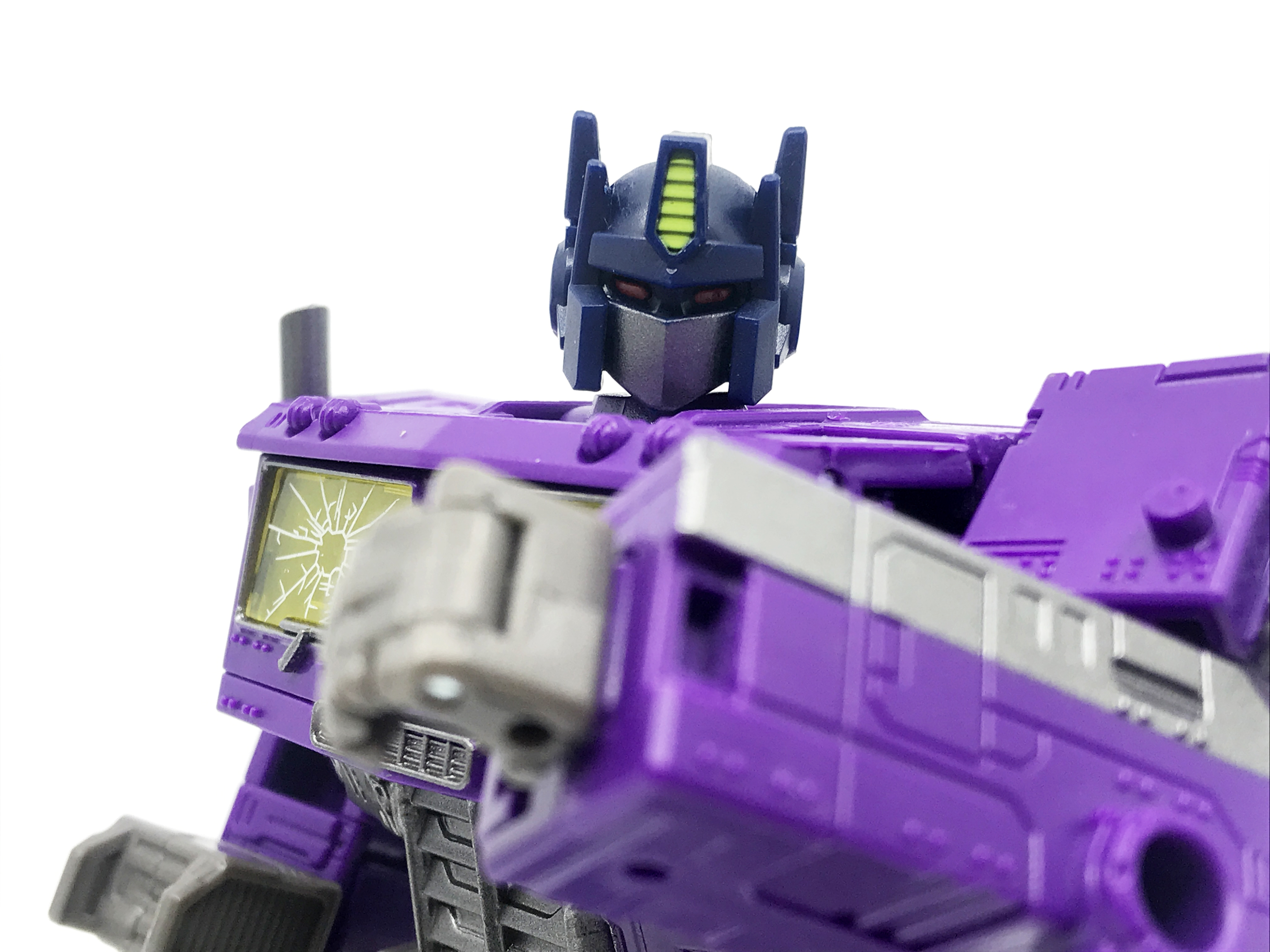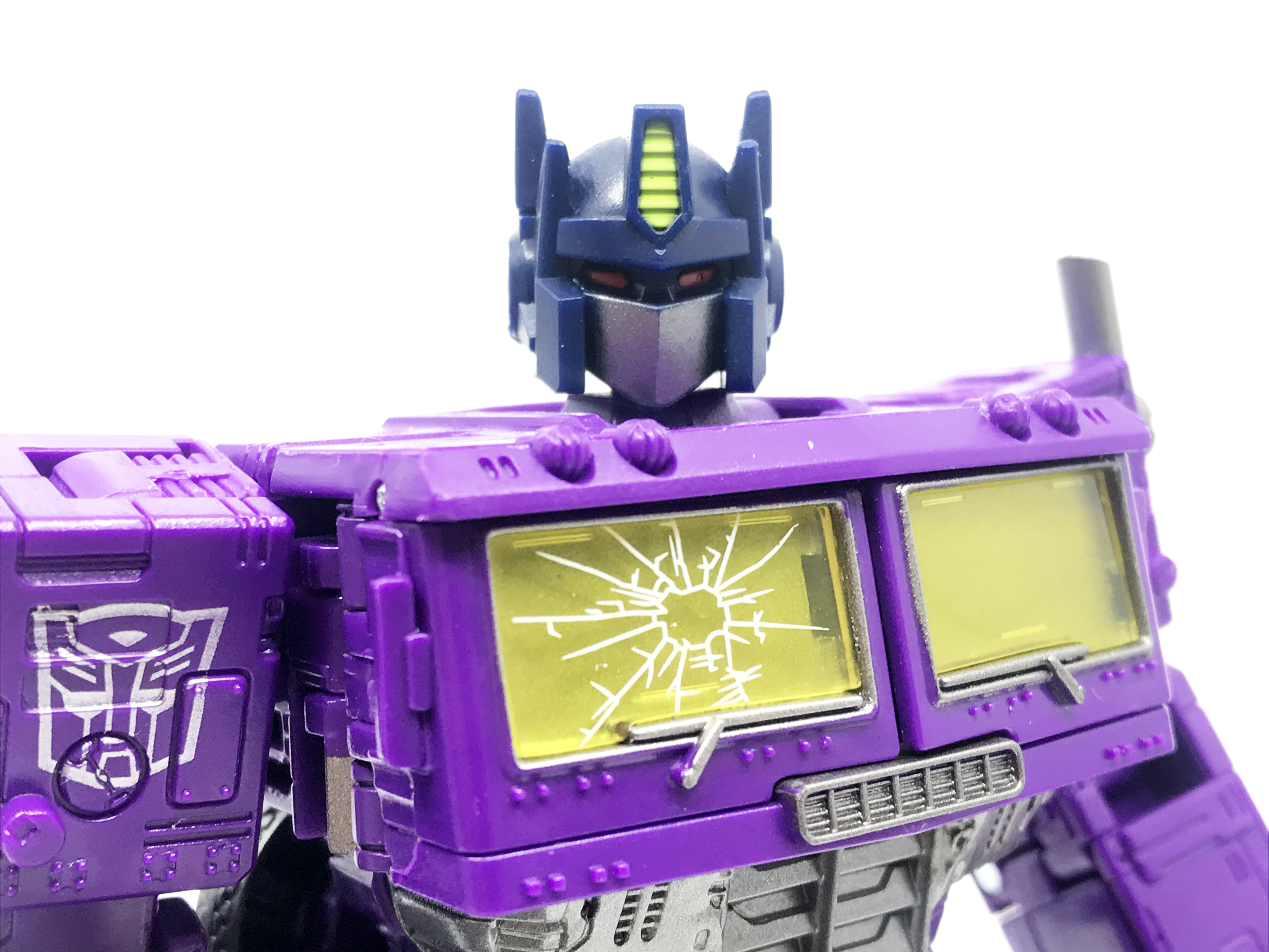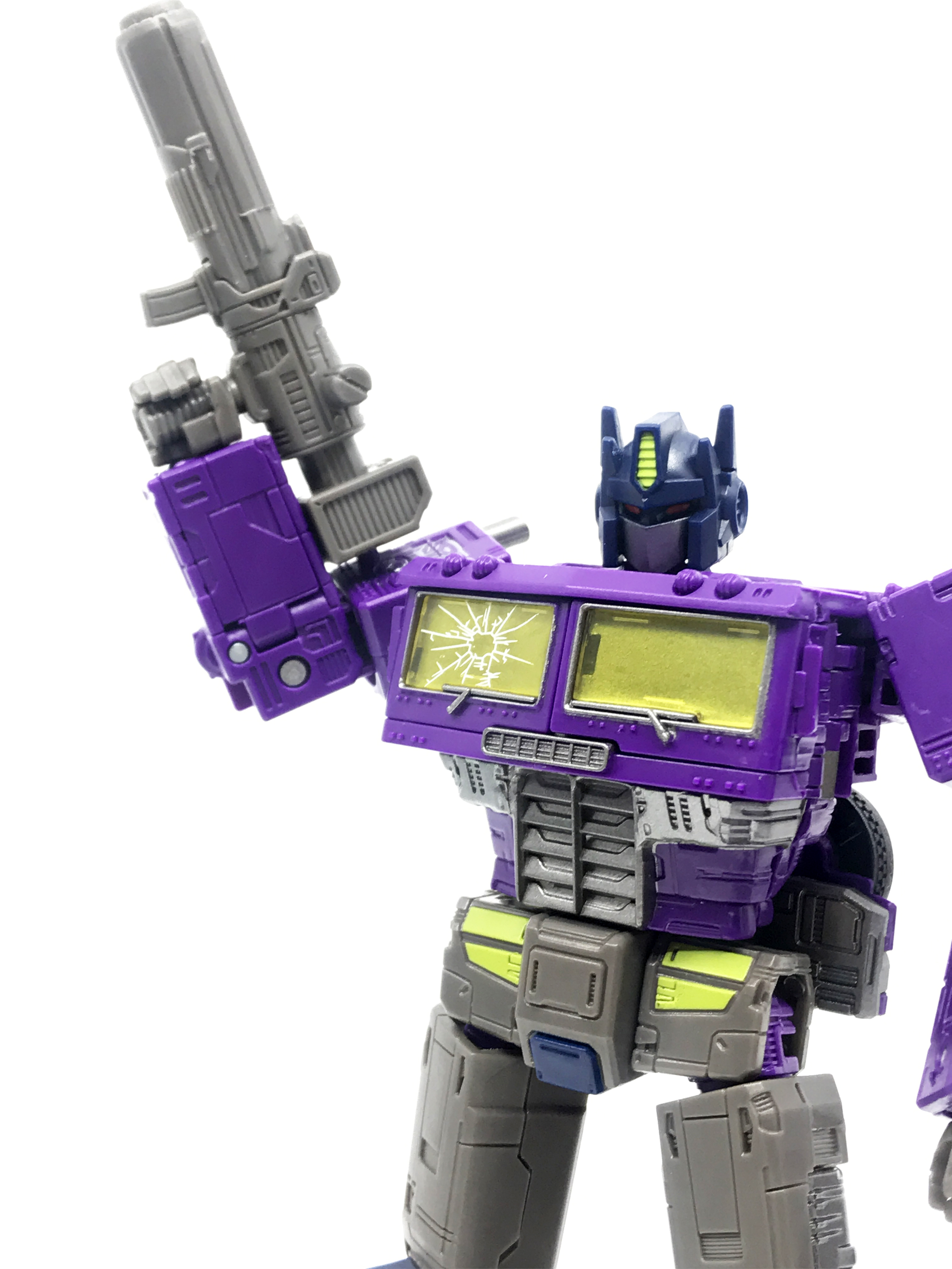 기존 옵티머스 프라임의 붉은색에서 자주색 트럭으로 변경됐고, 푸른 클리어 부품은 노란색 계열의 클리어 부품으로 변경됐습니다. 우측 창문엔 SG 옵티머스 프라임의 특유의 '깨진 유리 Shattered Glass'가 특징. 조금 아쉬운 점은, 이쪽은 SG 라쳇과 합본으로 나오면서 트럭이 없다는 것.