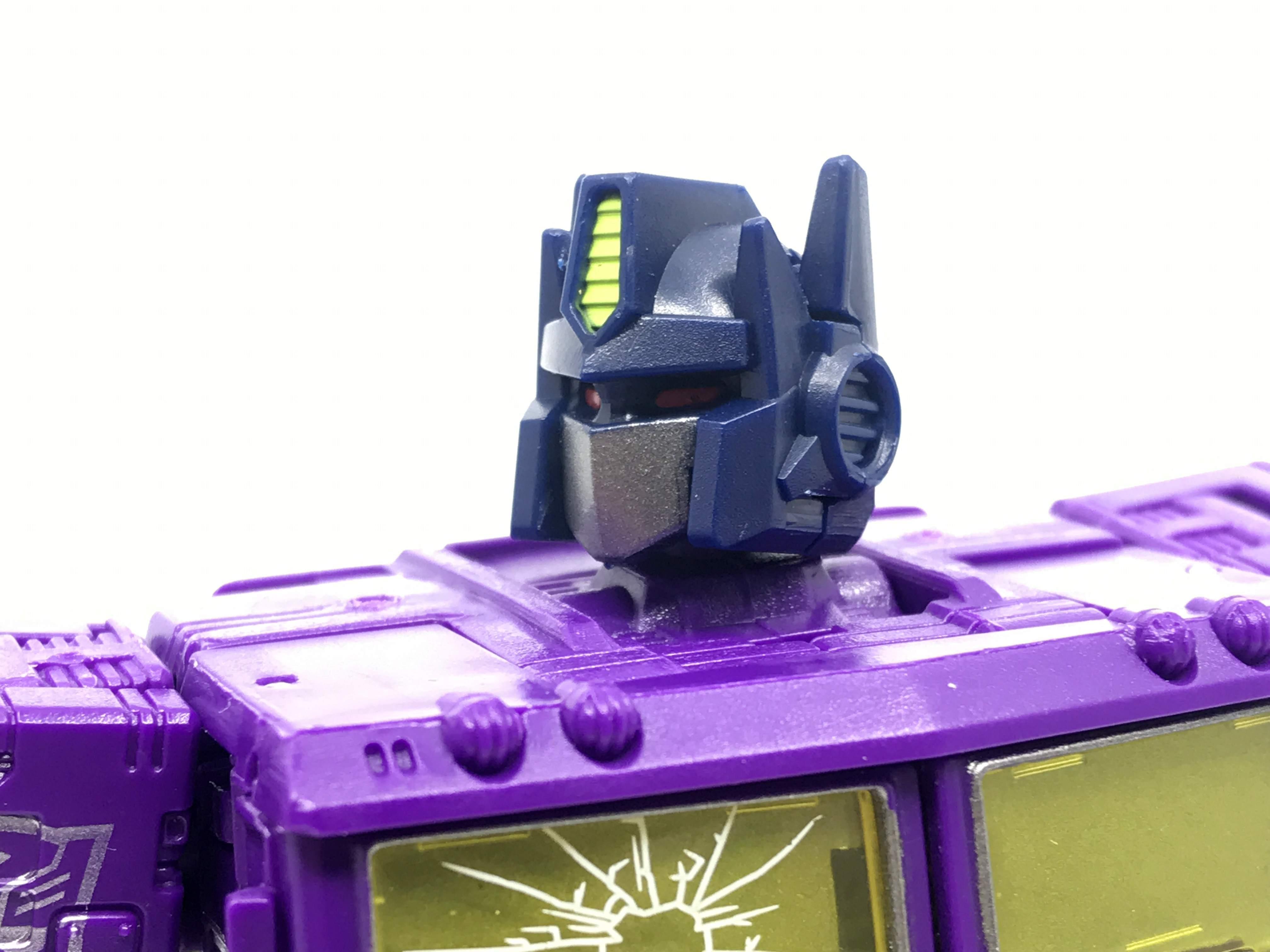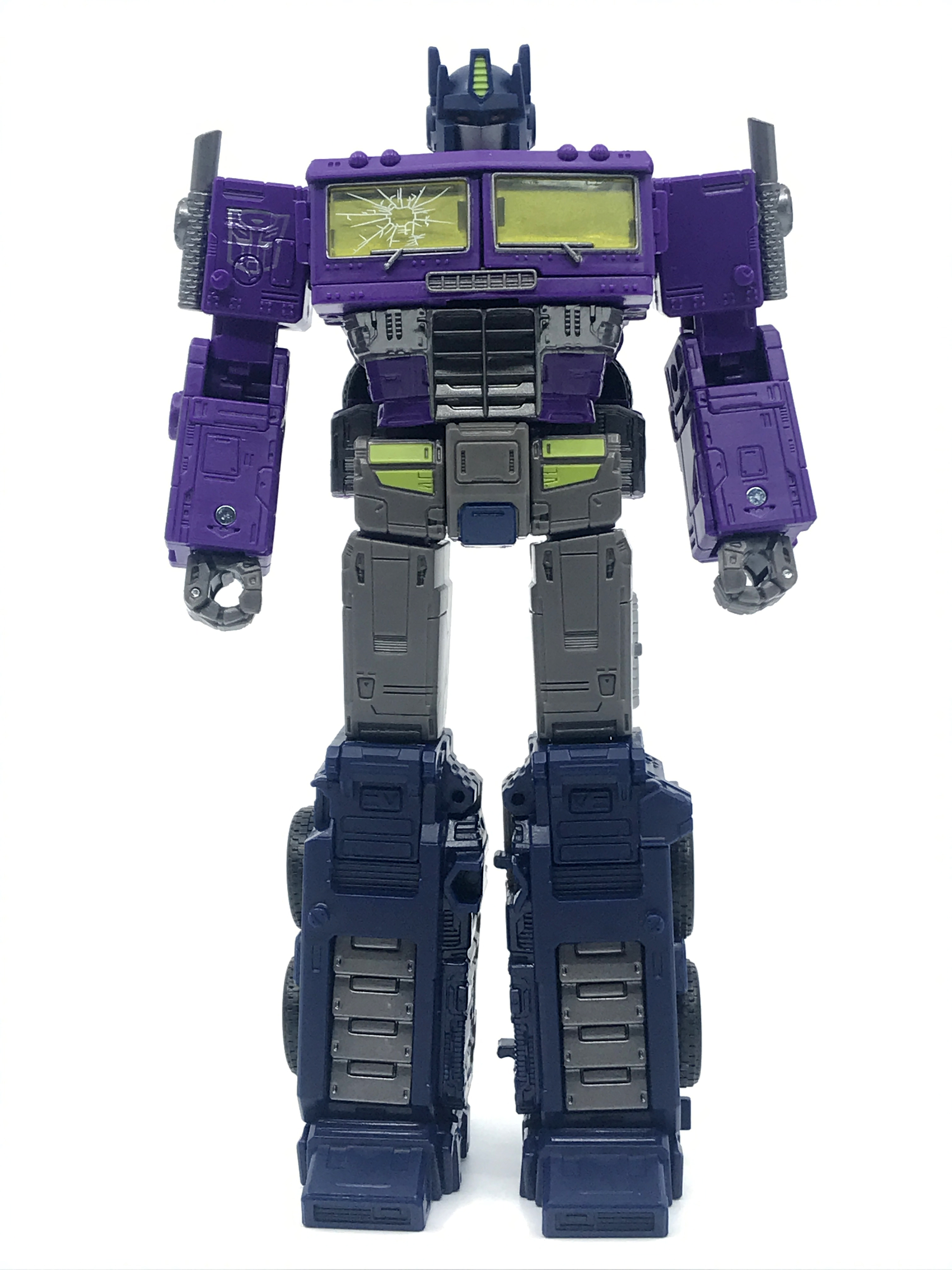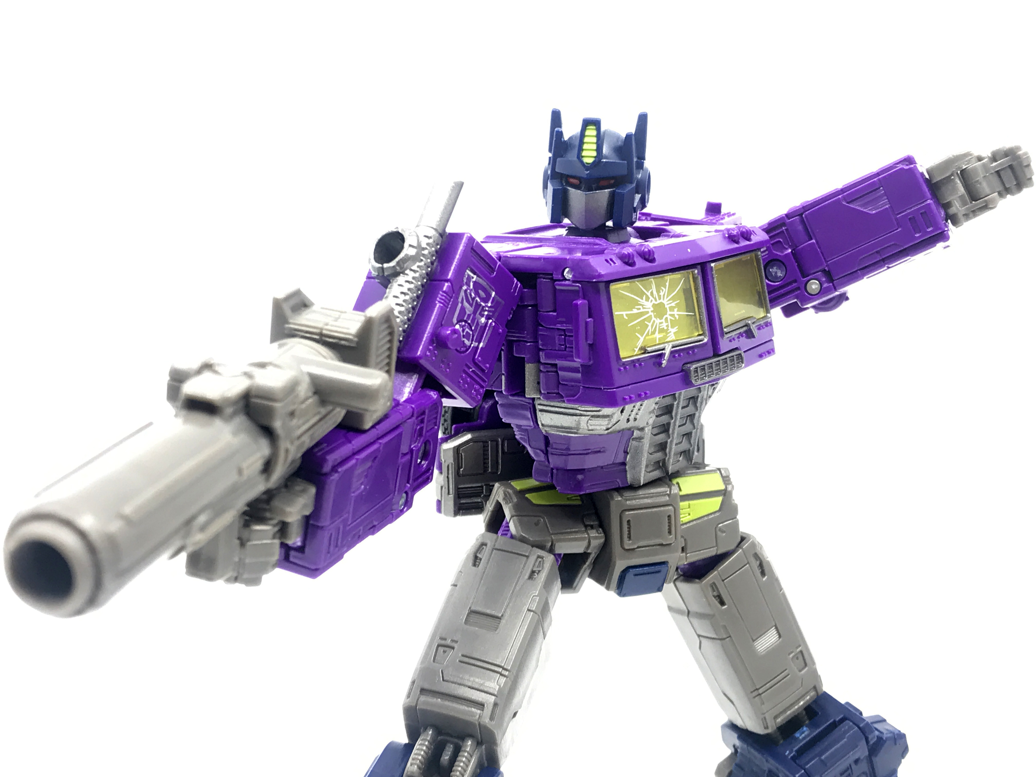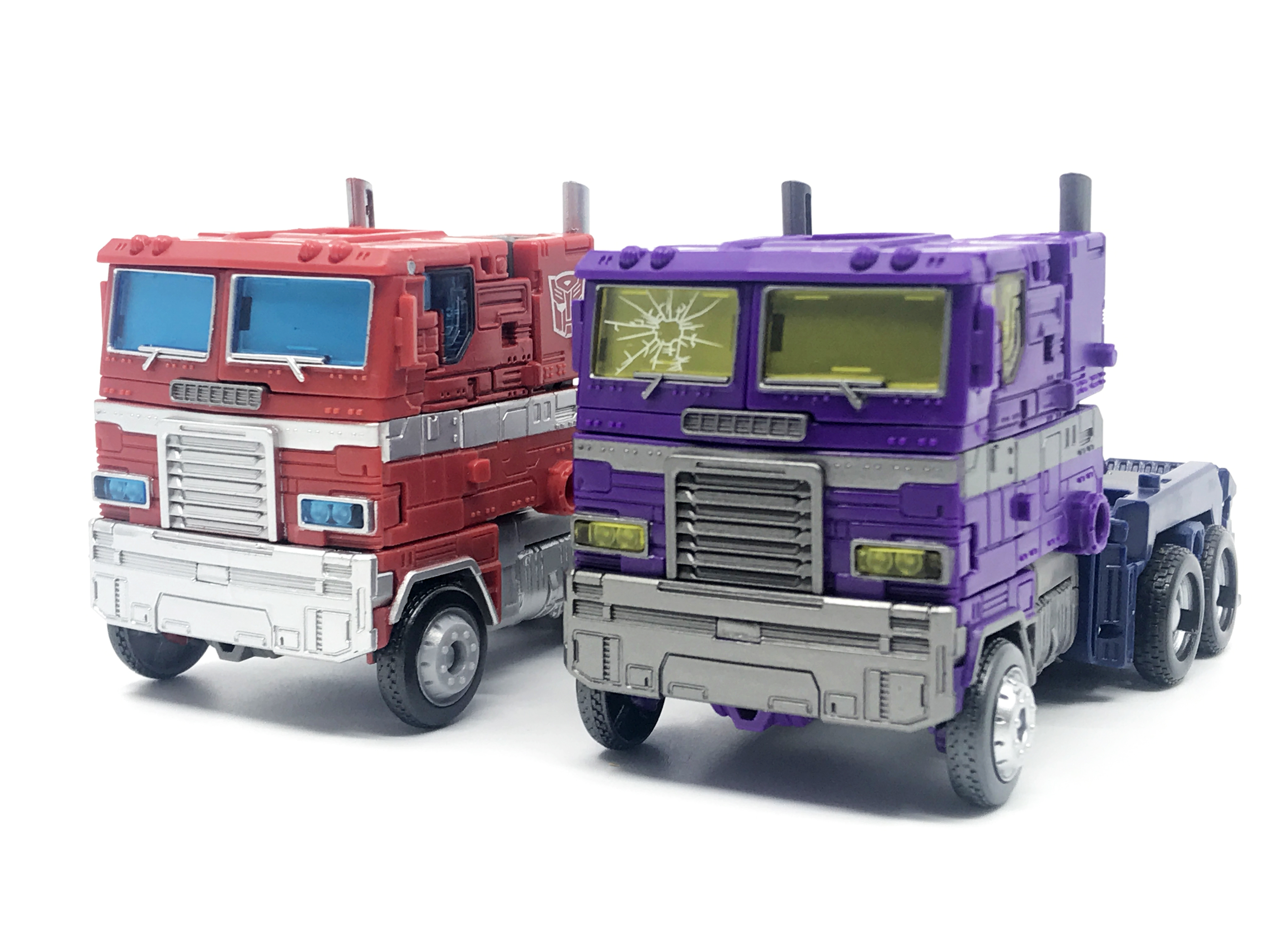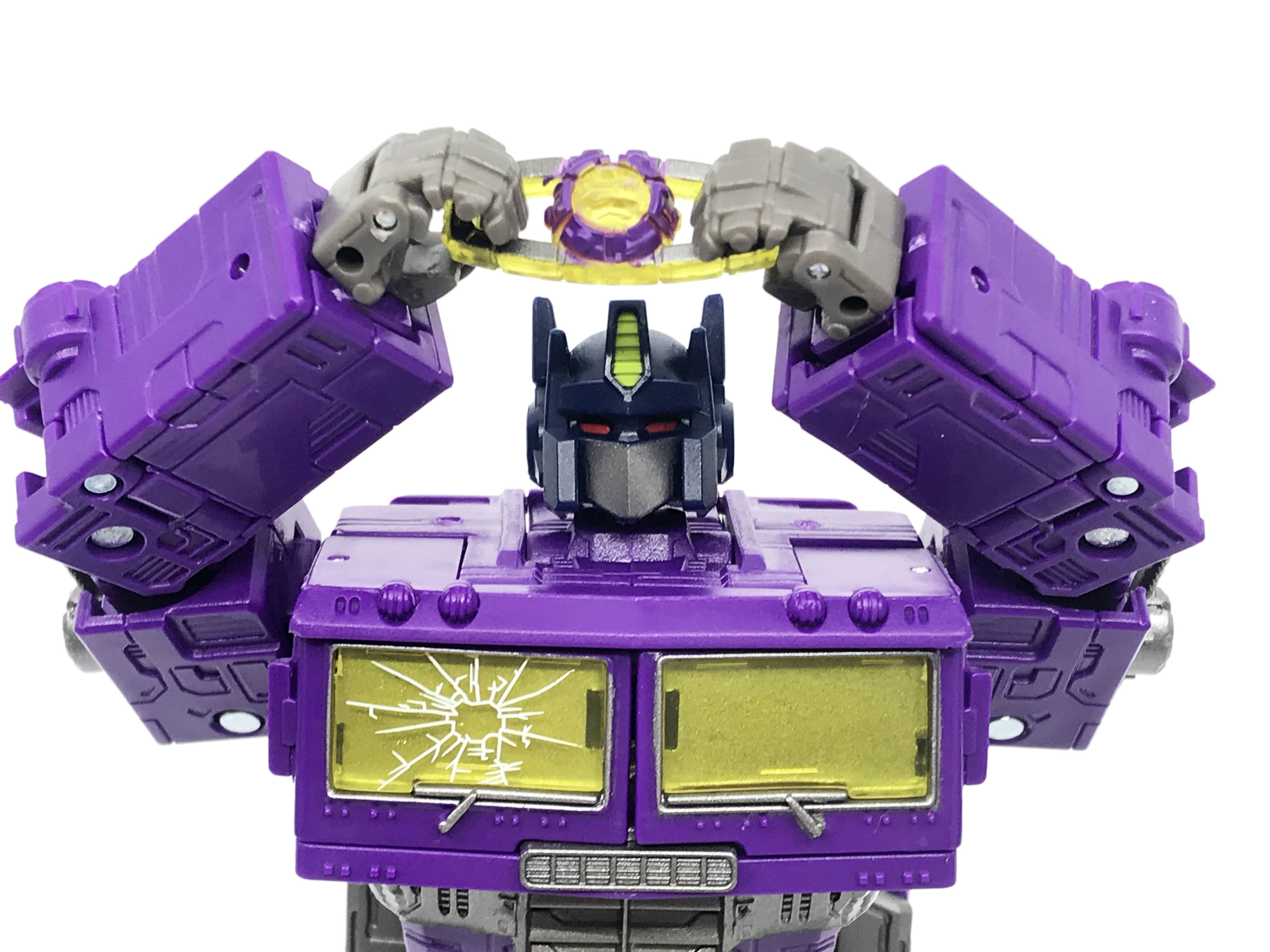기존 옵티머스 프라임의 붉은색에서 자주색 트럭으로 변경됐고, 푸른 클리어 부품은 노란색 계열의 클리어 부품으로 변경됐습니다. 우측 창문엔 SG 옵티머스 프라임의 특유의 '깨진 유리 Shattered Glass'가 특징. 조금 아쉬운 점은, 이쪽은 SG 라쳇과 합본으로 나오면서 트럭이 없다는 것.