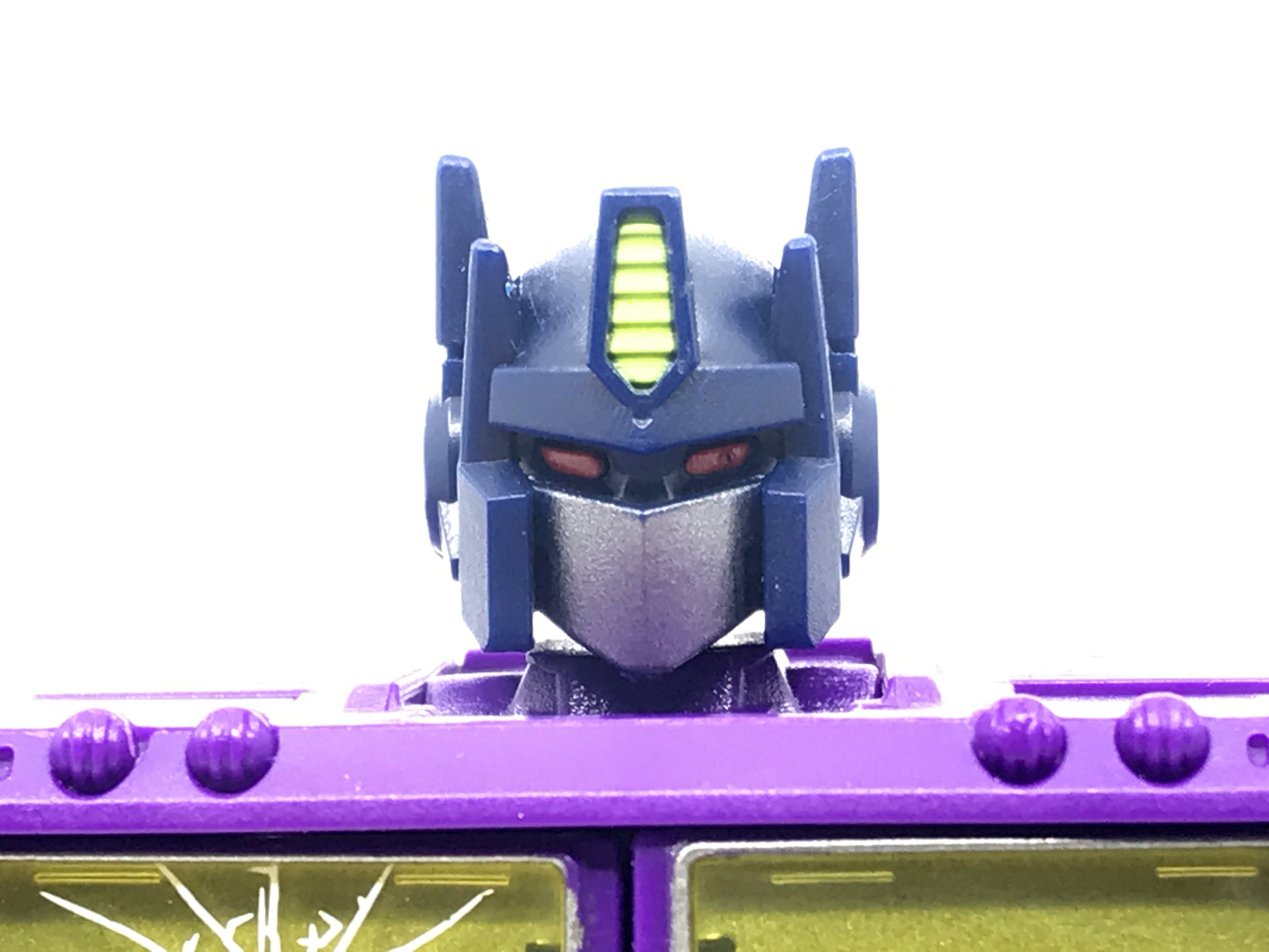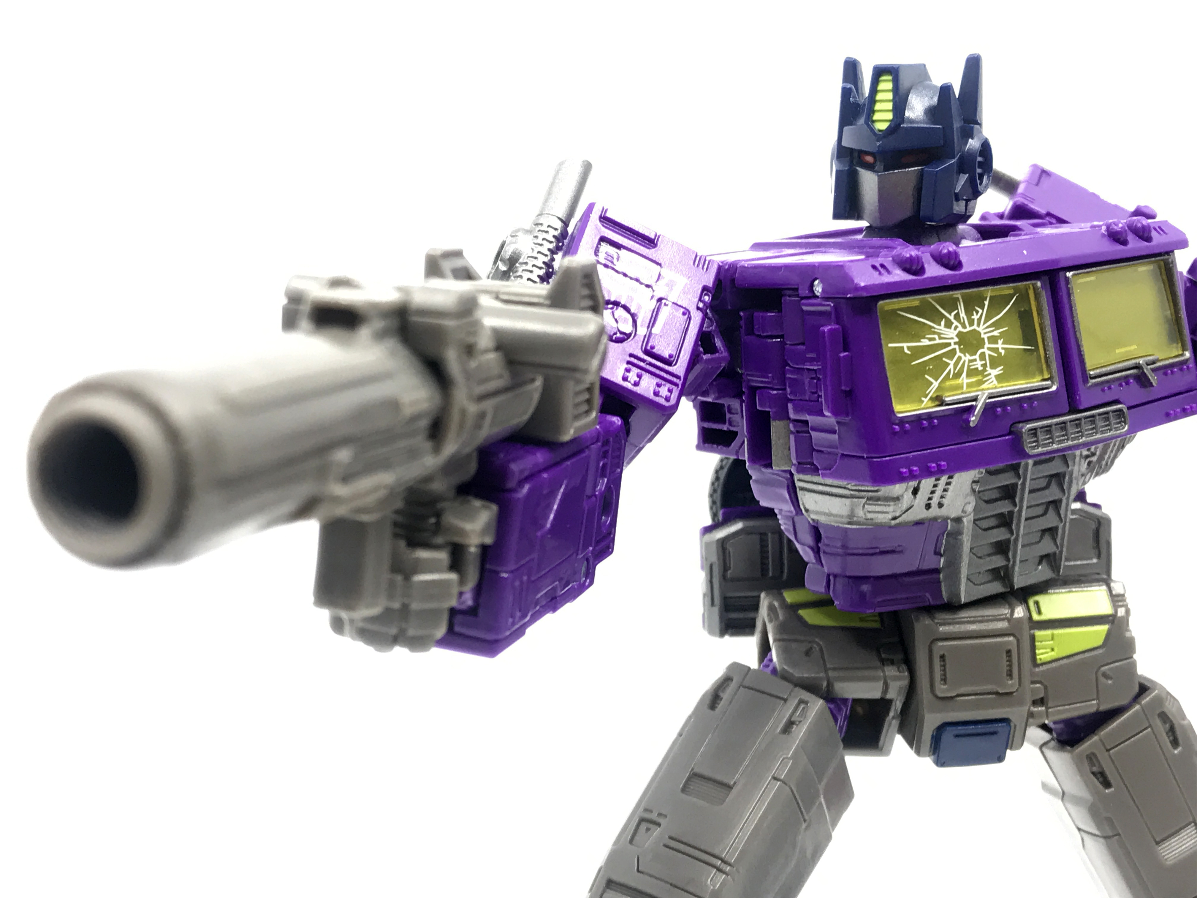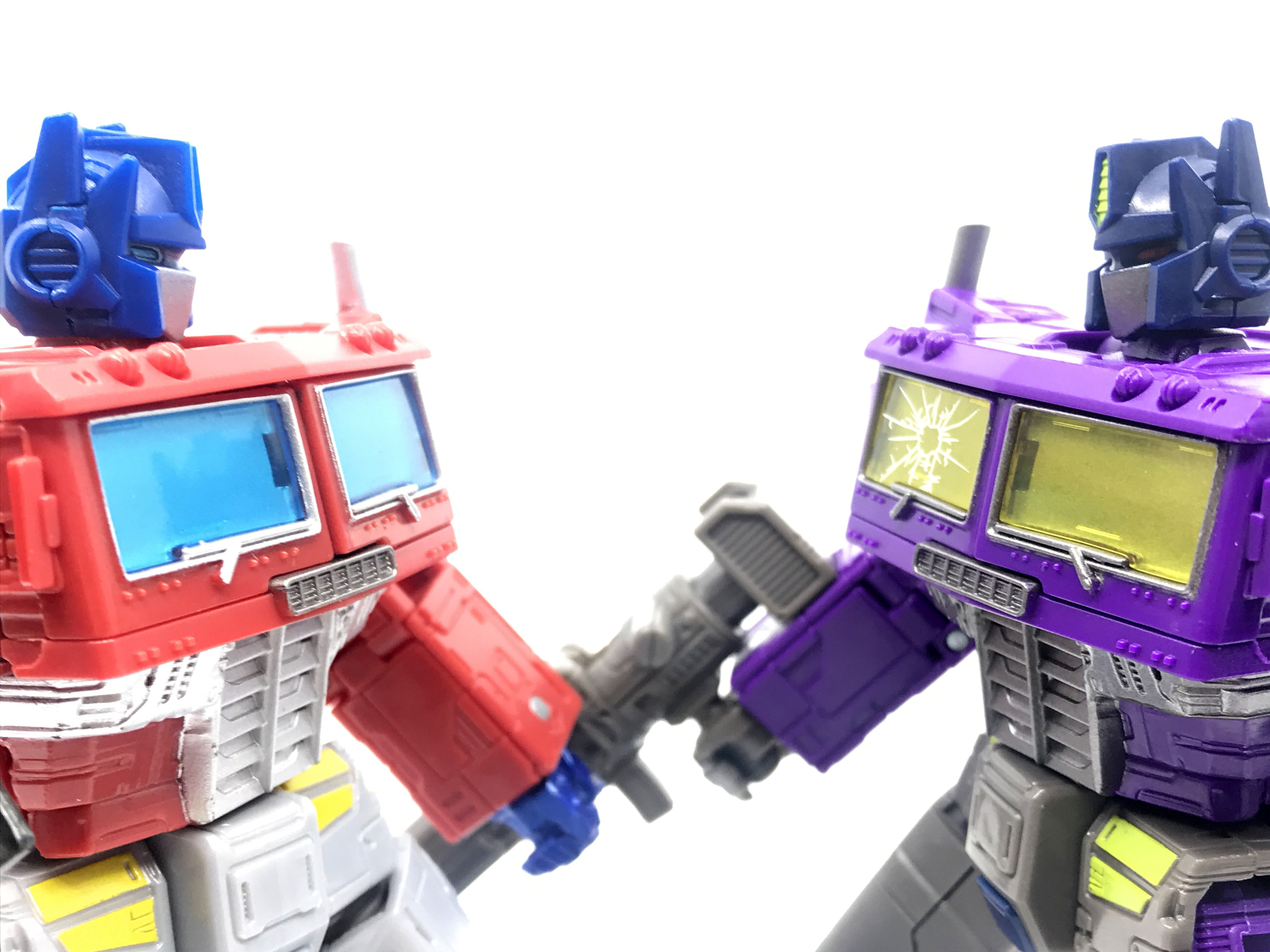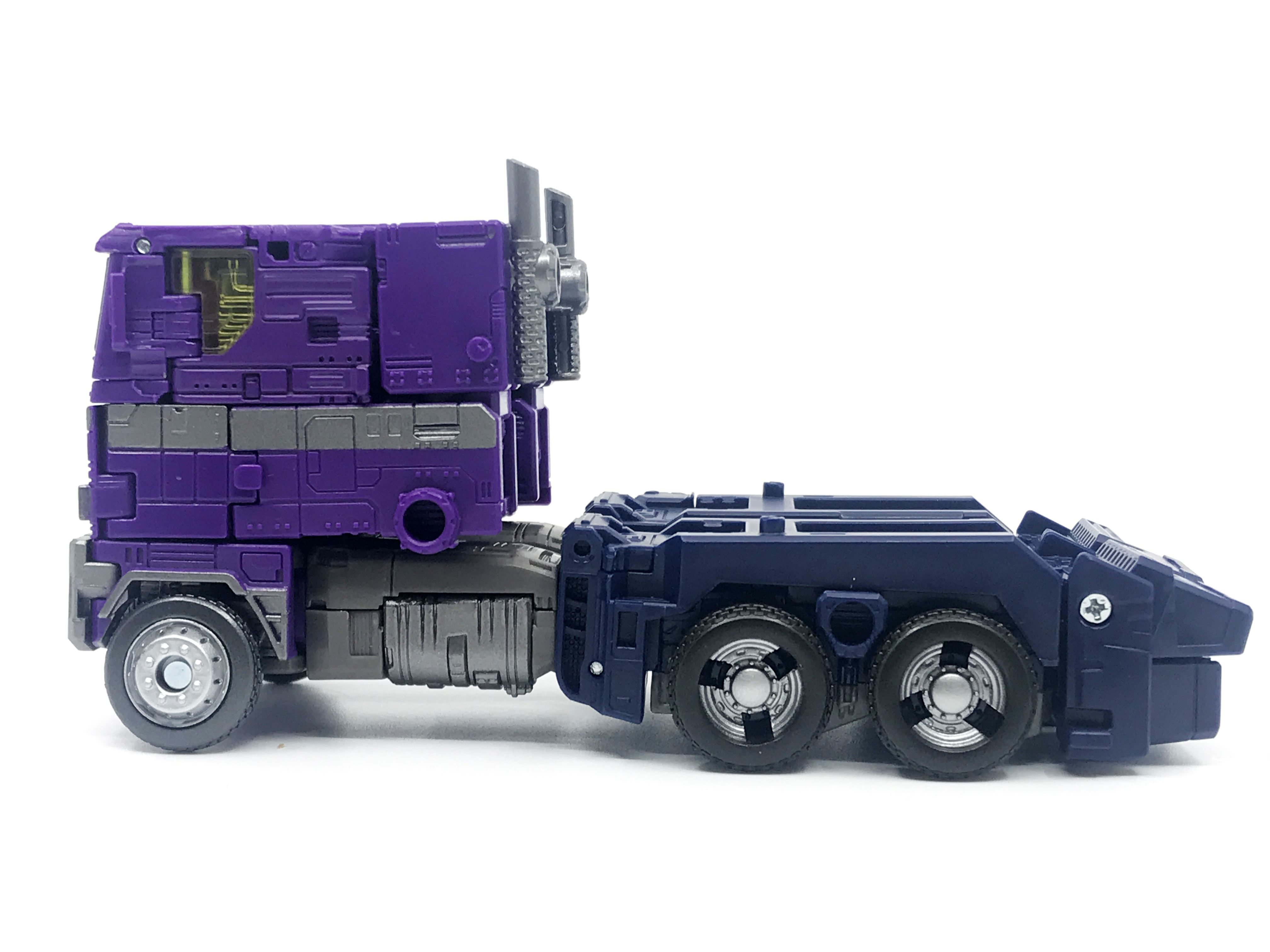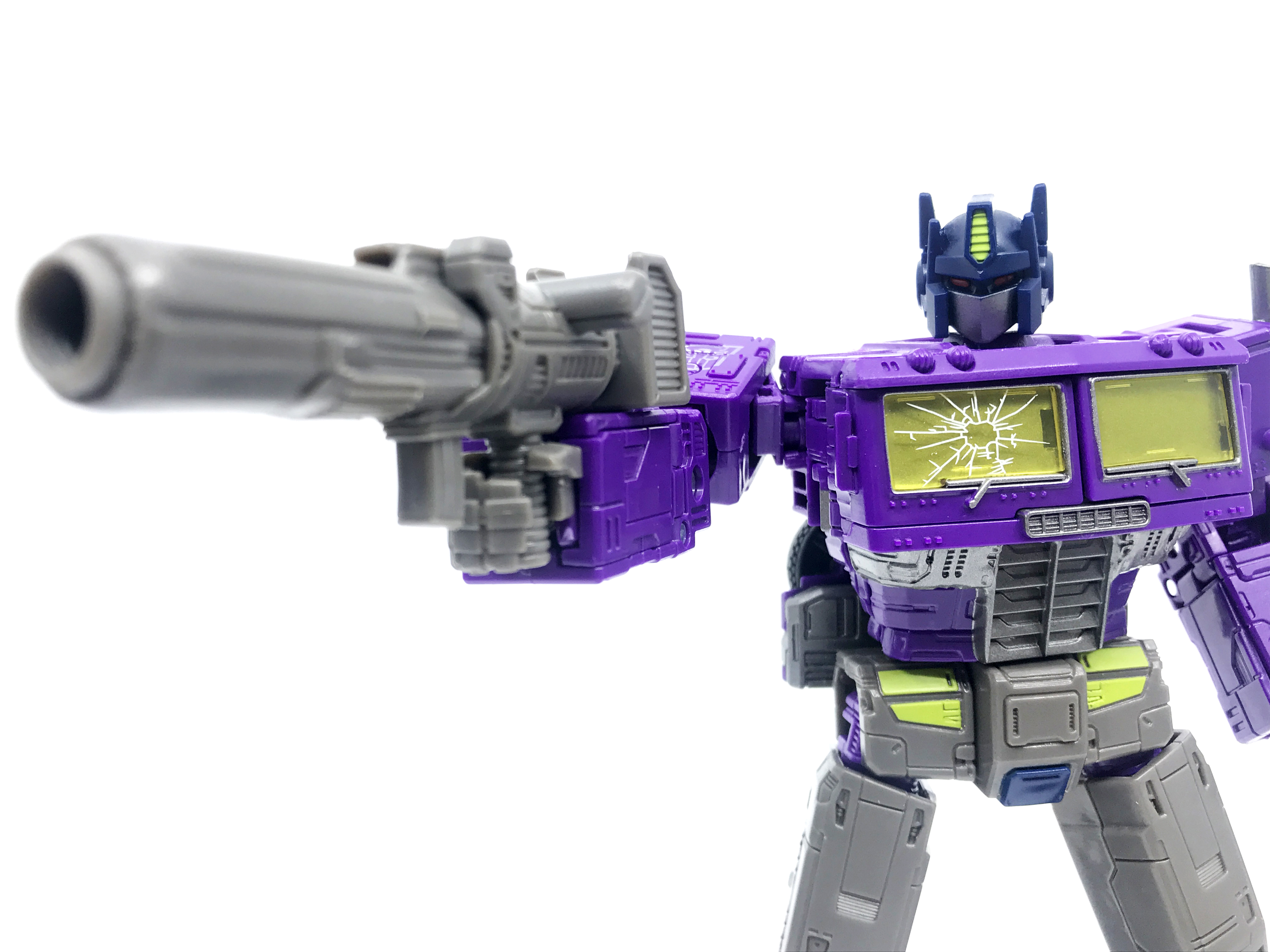 기존 옵티머스 프라임의 붉은색에서 자주색 트럭으로 변경됐고, 푸른 클리어 부품은 노란색 계열의 클리어 부품으로 변경됐습니다. 우측 창문엔 SG 옵티머스 프라임의 특유의 '깨진 유리 Shattered Glass'가 특징. 조금 아쉬운 점은, 이쪽은 SG 라쳇과 합본으로 나오면서 트럭이 없다는 것.