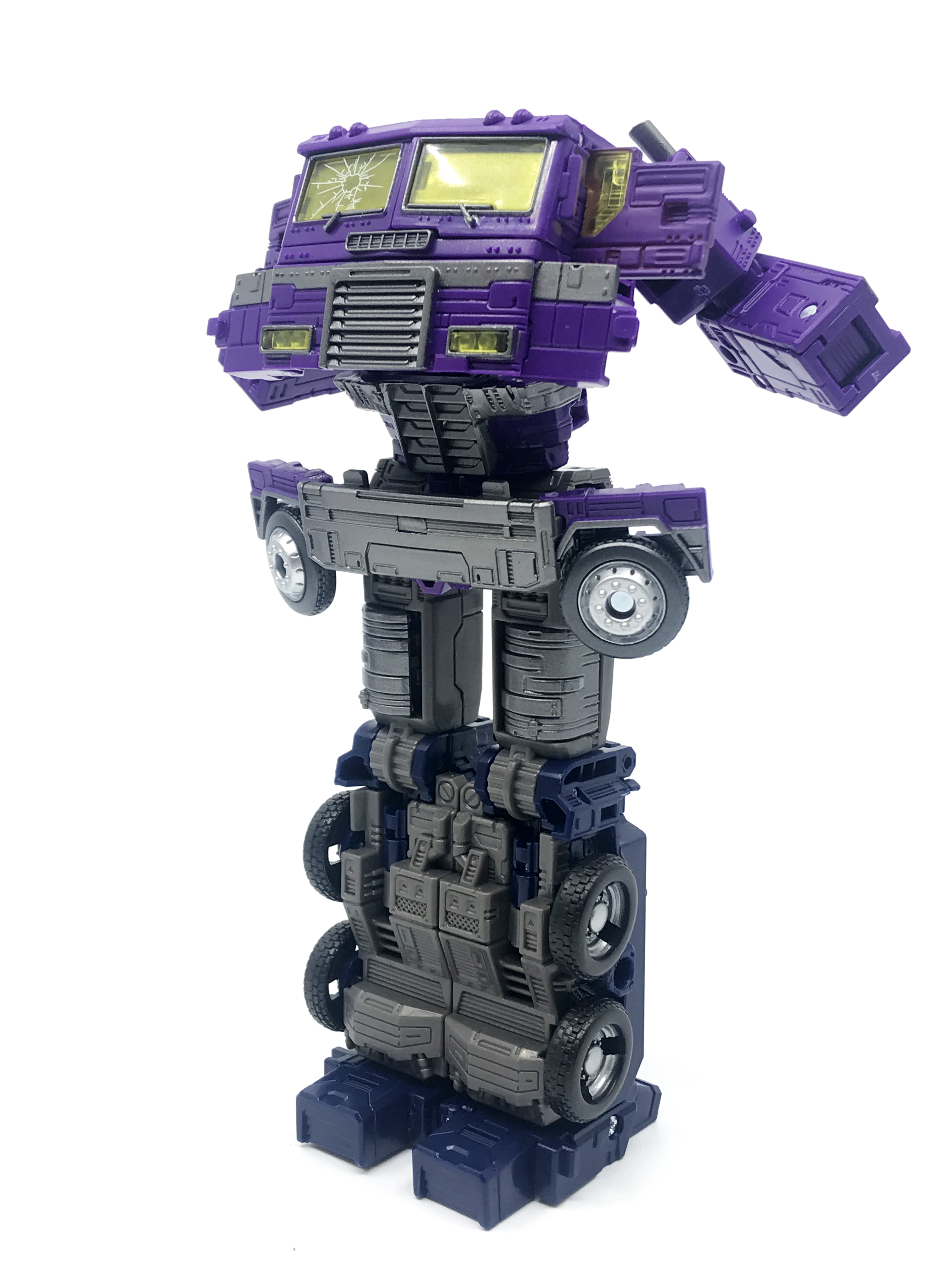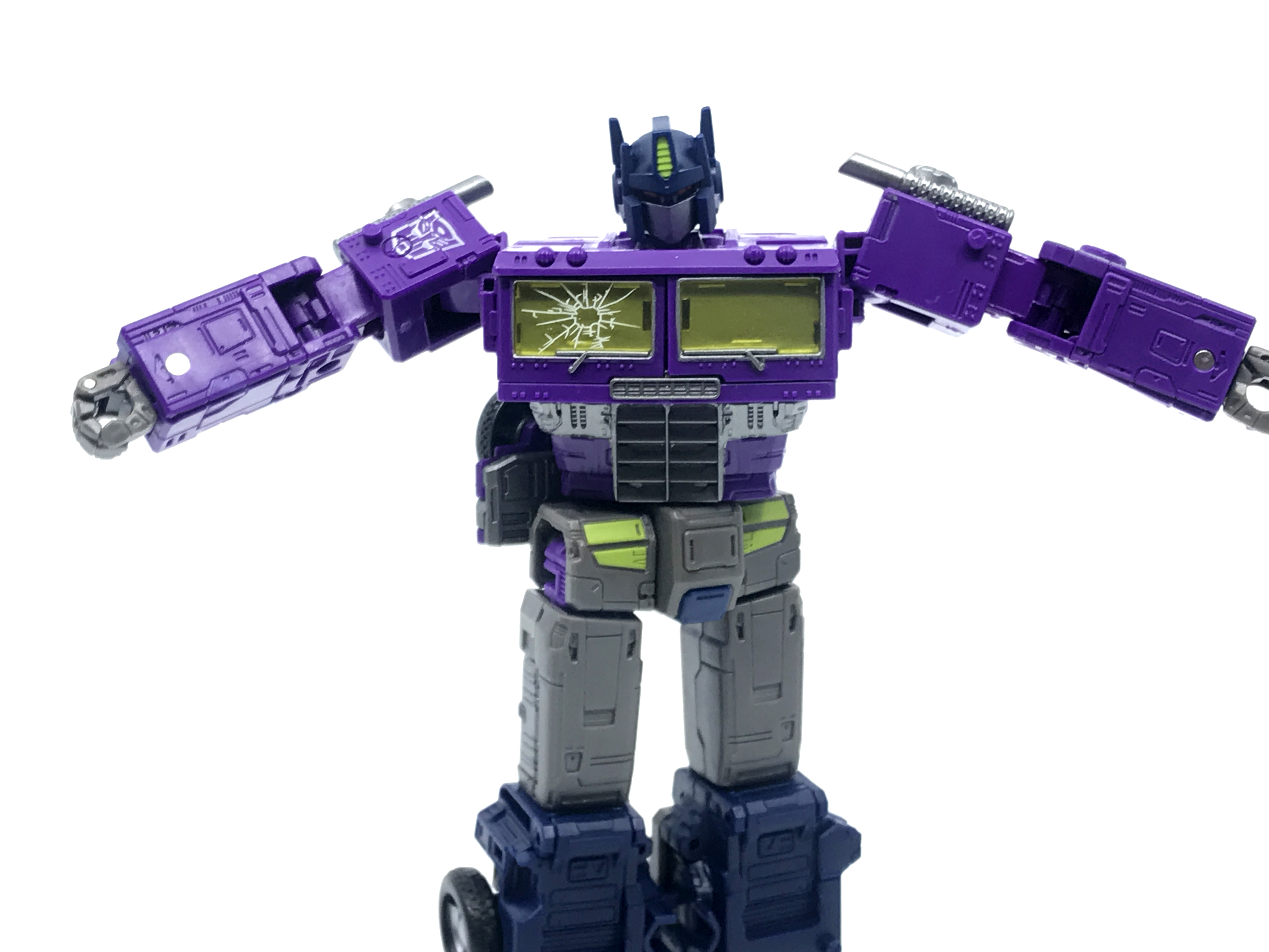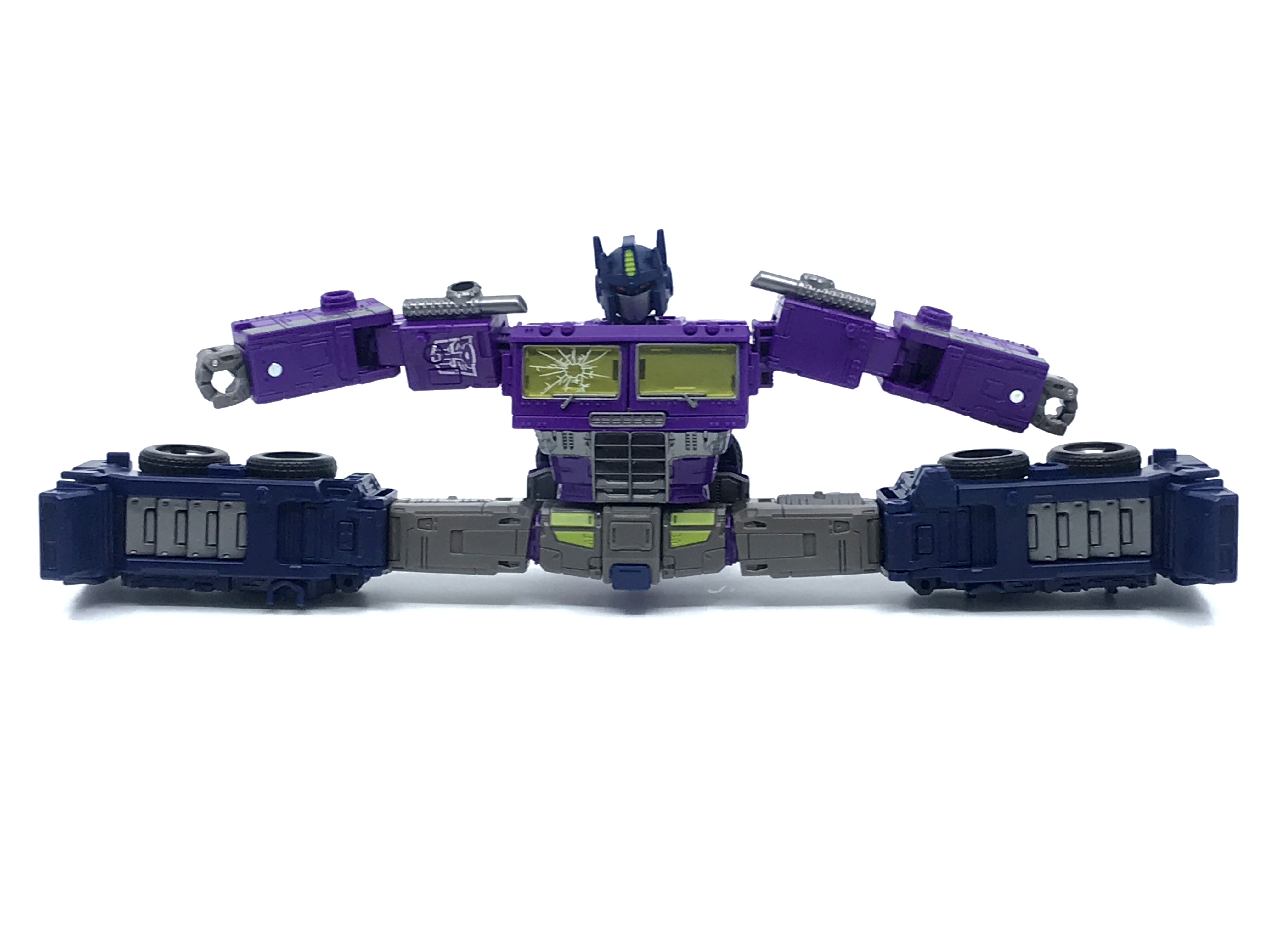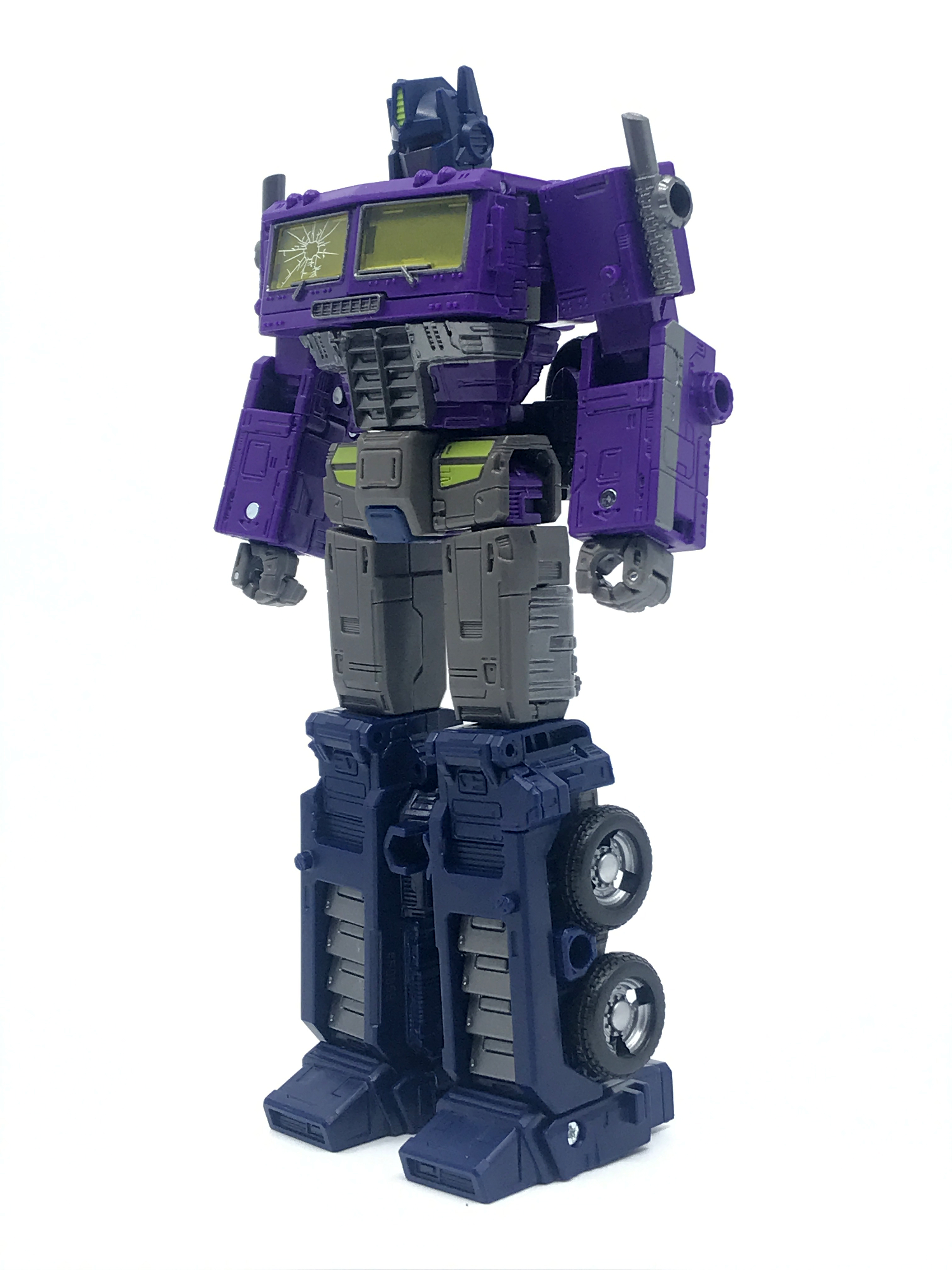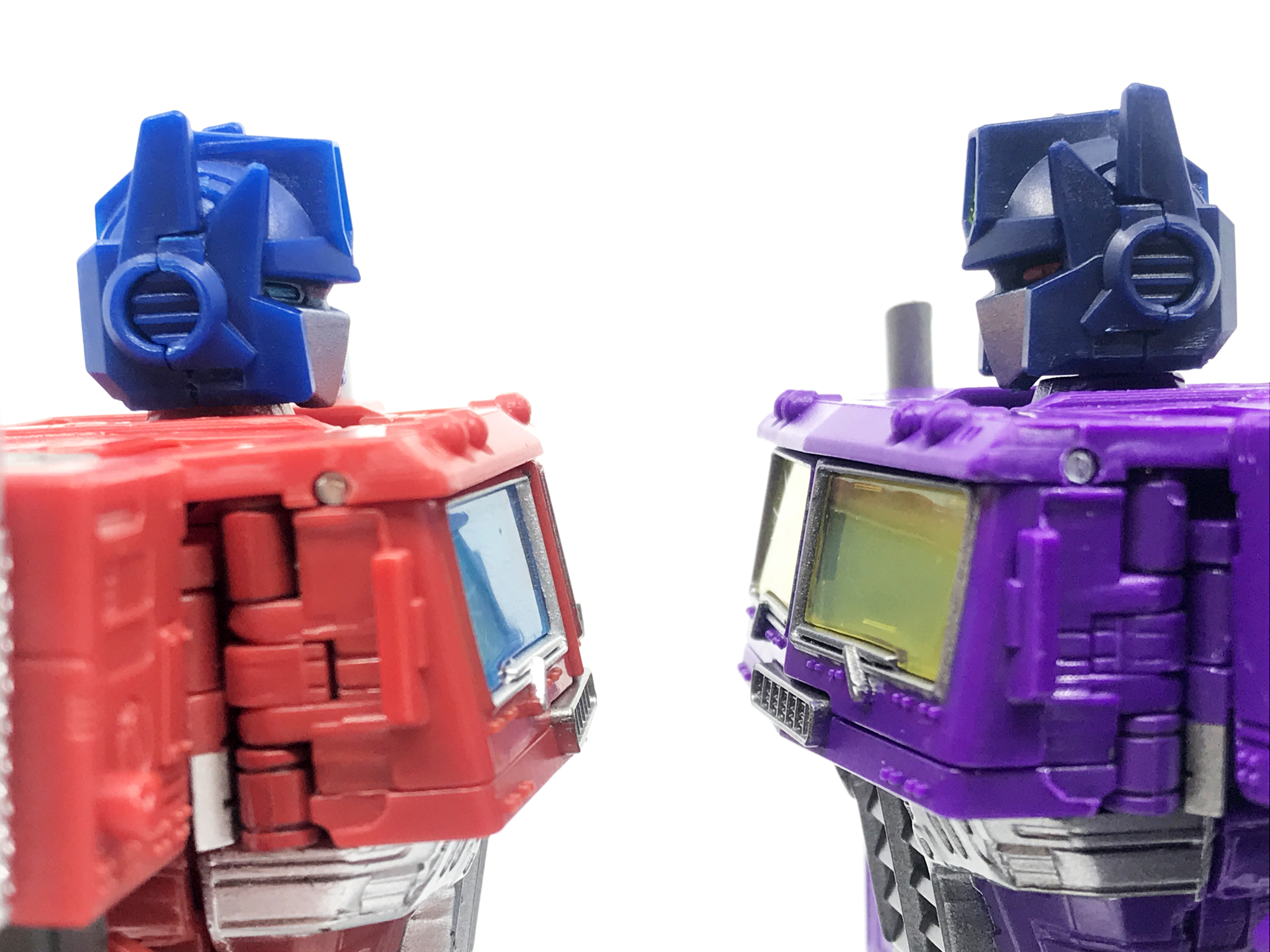 기존 옵티머스 프라임의 붉은색에서 자주색 트럭으로 변경됐고, 푸른 클리어 부품은 노란색 계열의 클리어 부품으로 변경됐습니다. 우측 창문엔 SG 옵티머스 프라임의 특유의 '깨진 유리 Shattered Glass'가 특징. 조금 아쉬운 점은, 이쪽은 SG 라쳇과 합본으로 나오면서 트럭이 없다는 것.