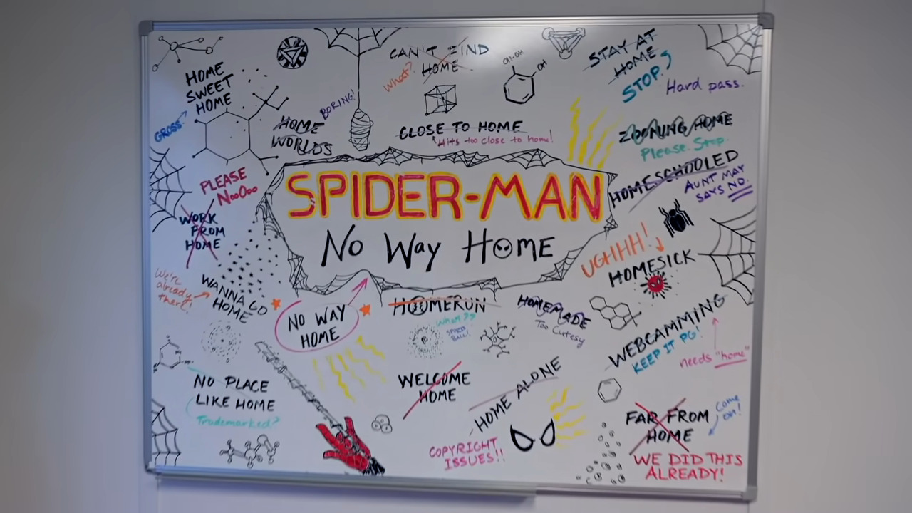 제목 관련 화이트 보드. 대충 전작 <스파이더맨: 파 프롬 홈>에서 스파이더맨의 정체가 피터 파커란 것이 밝혀졌고 대중에게 히어로로 알려진 미스테리오의 살해자라는 자료가 폭로된 상황이라, 스파이더맨을 환영하지 않는 분위기를 보이고 있습니다.