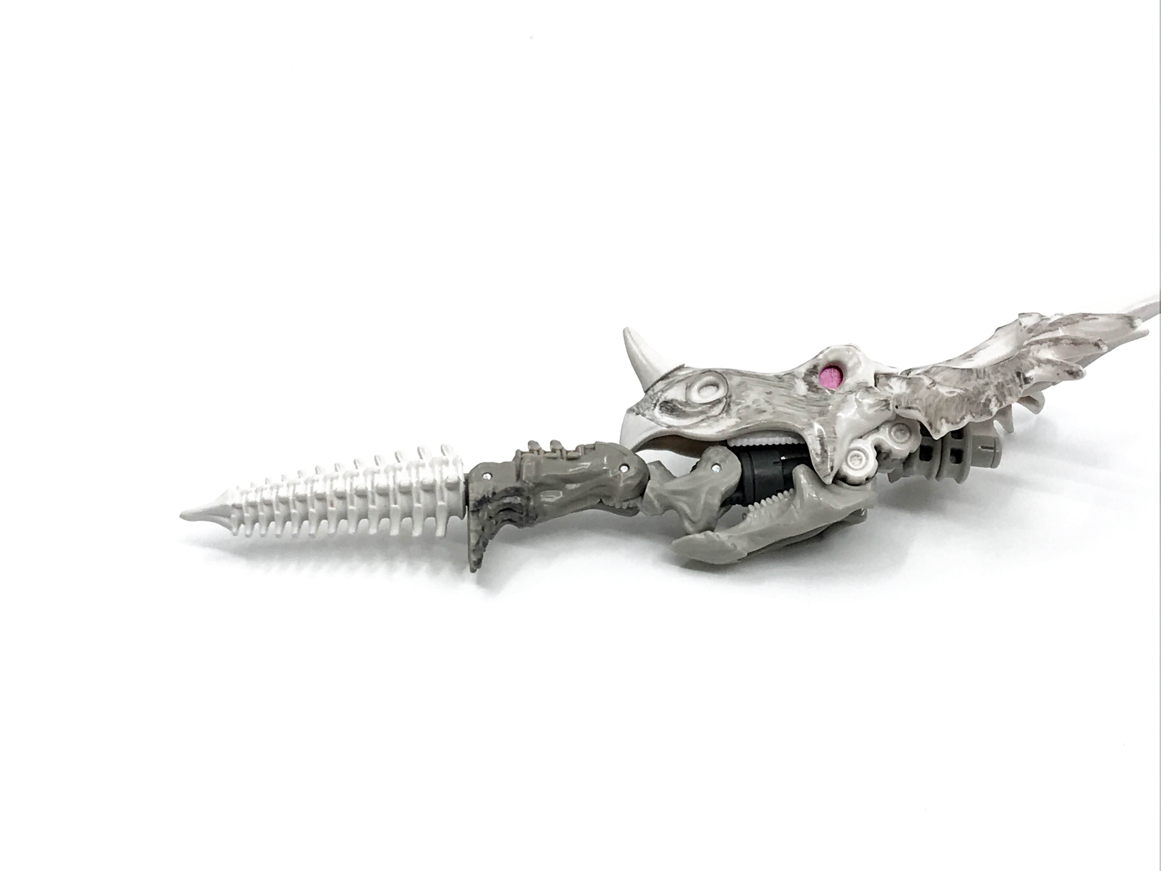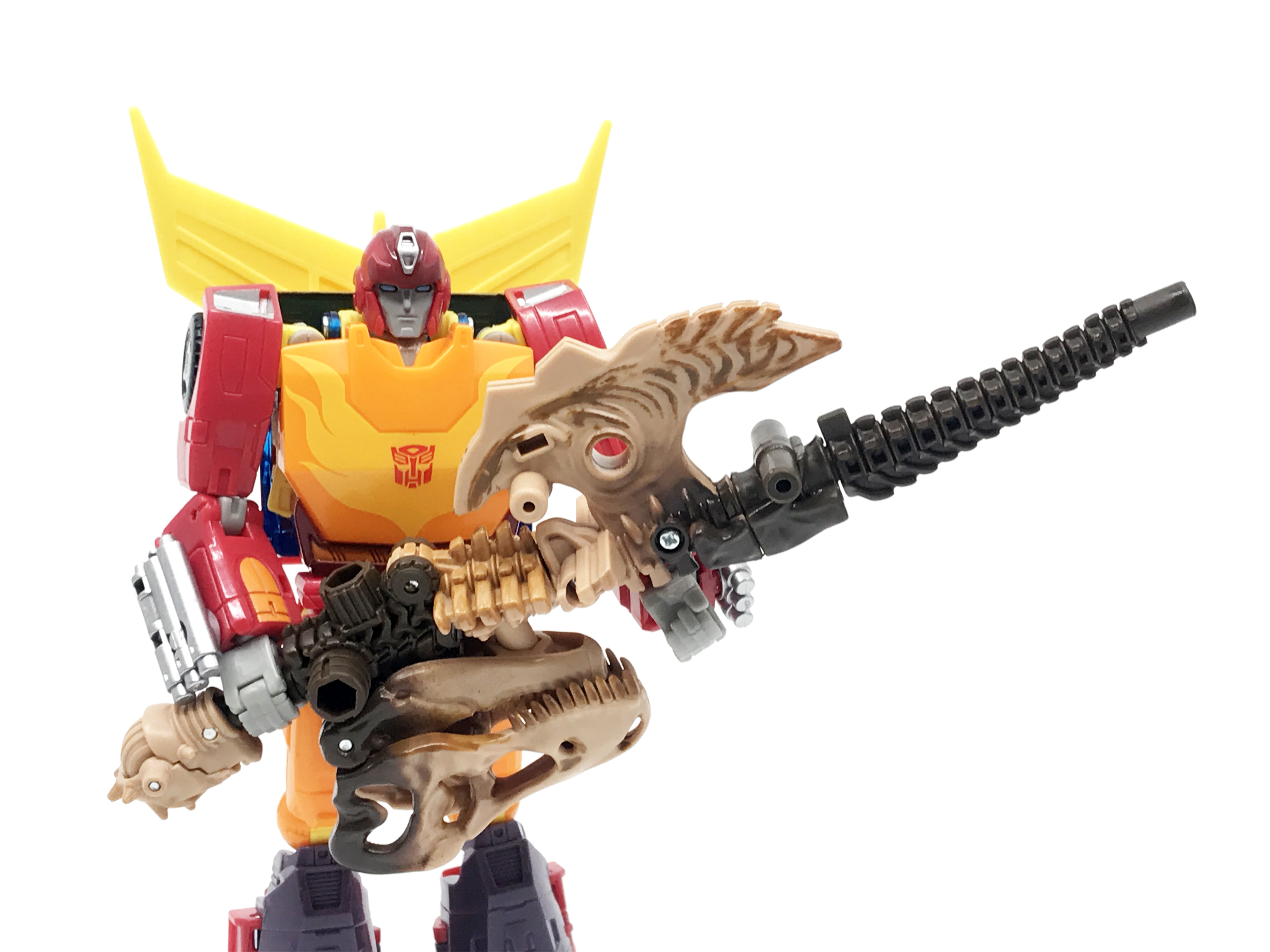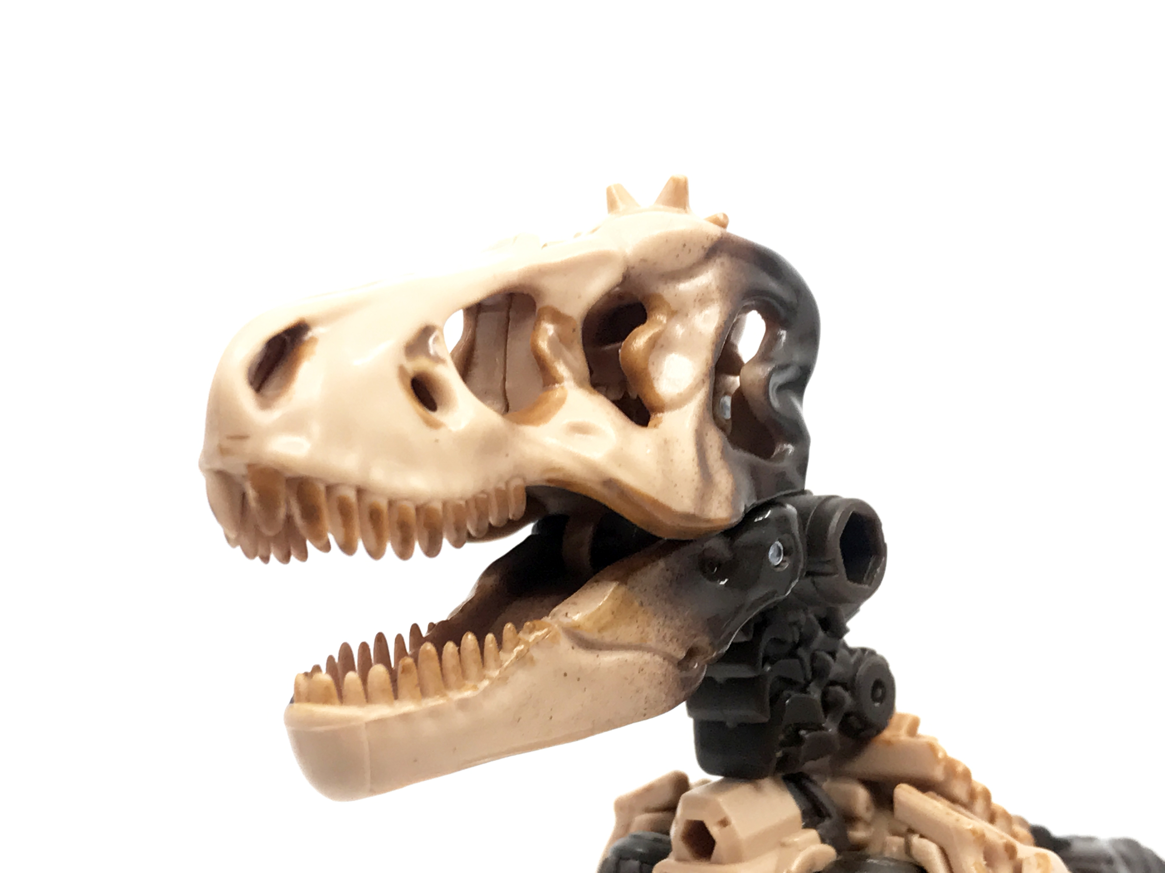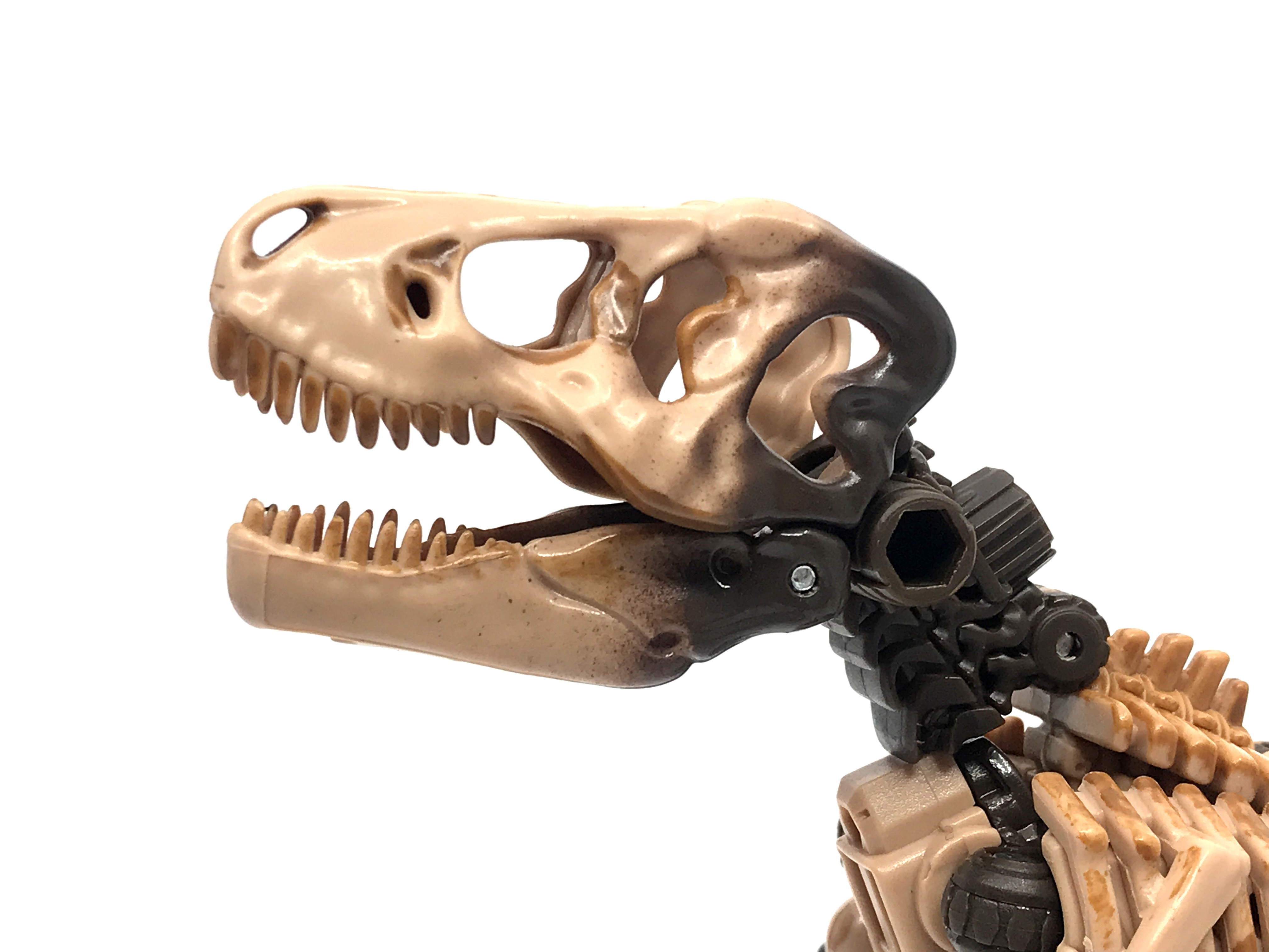 로봇 모드 머리를 티라노사우루스 두개골 뒤쪽에 끼우는 방식입니다.