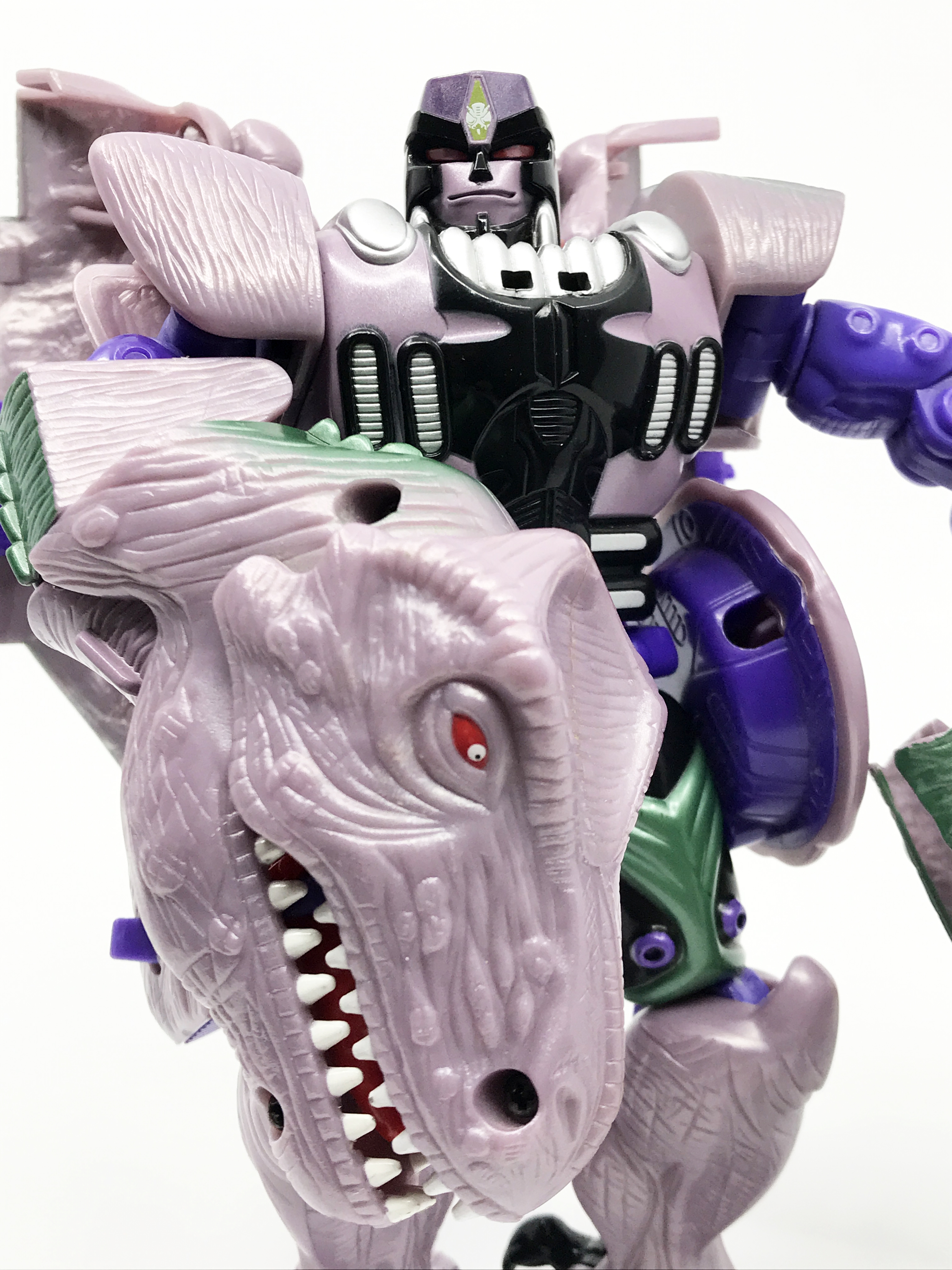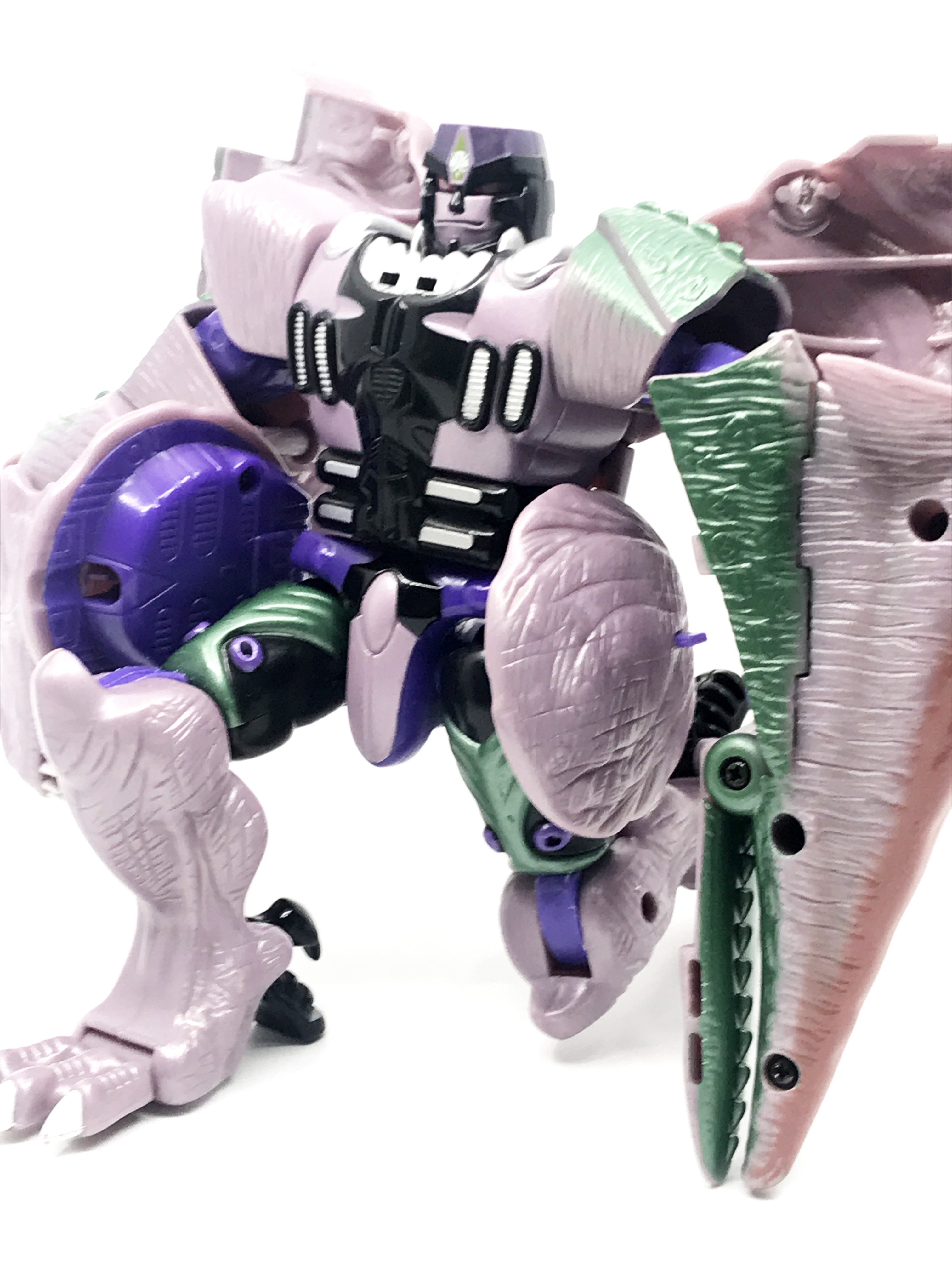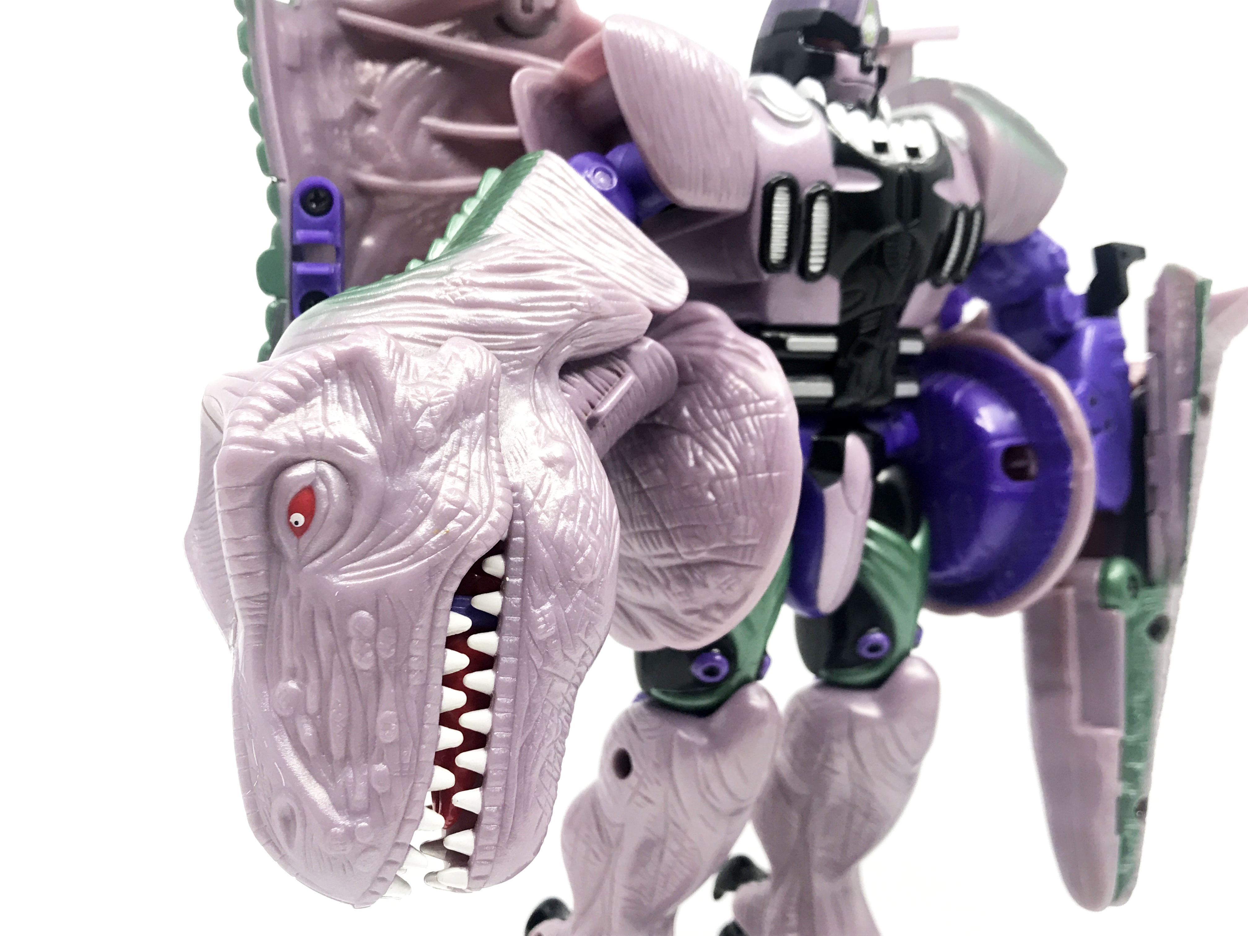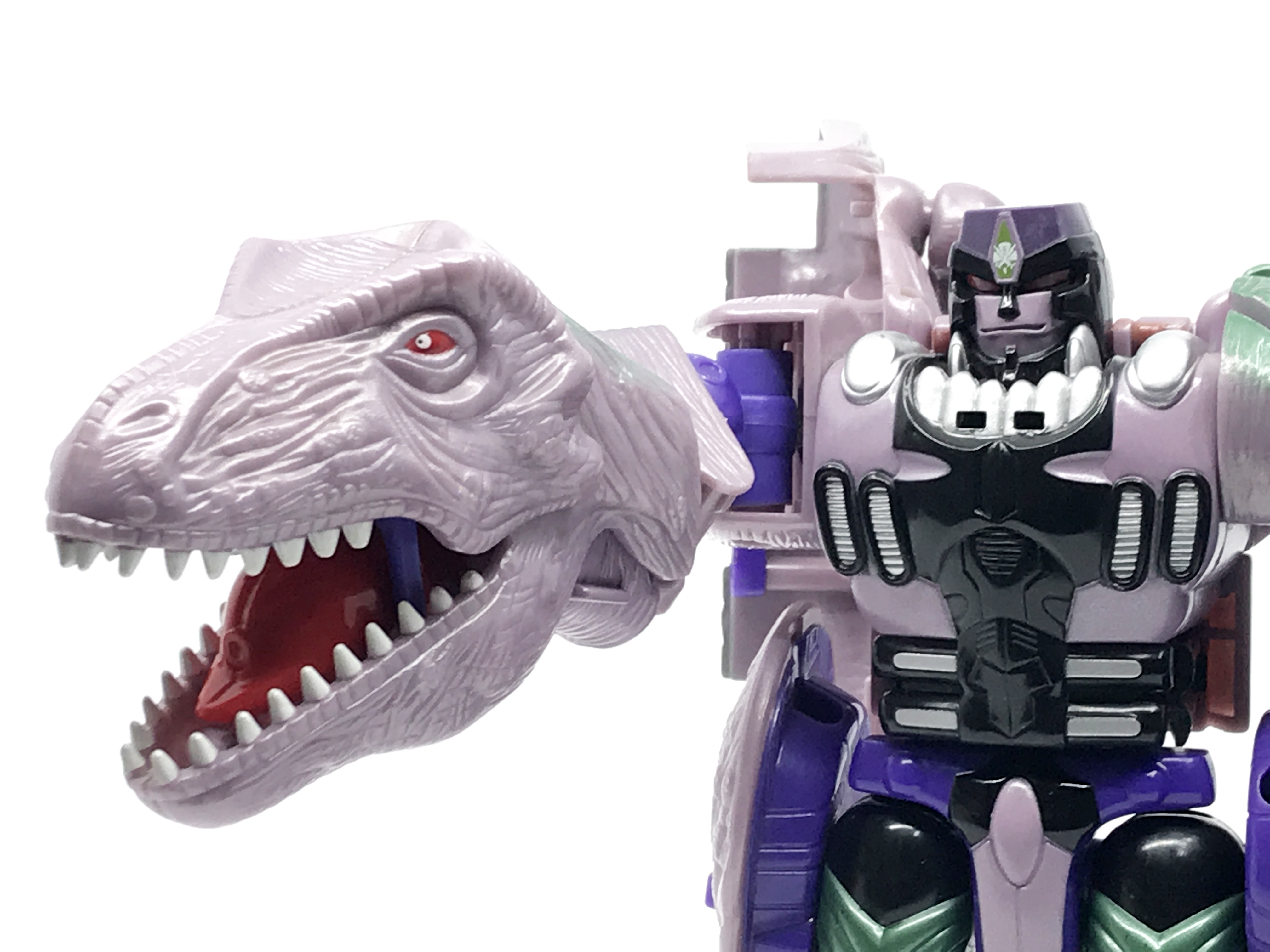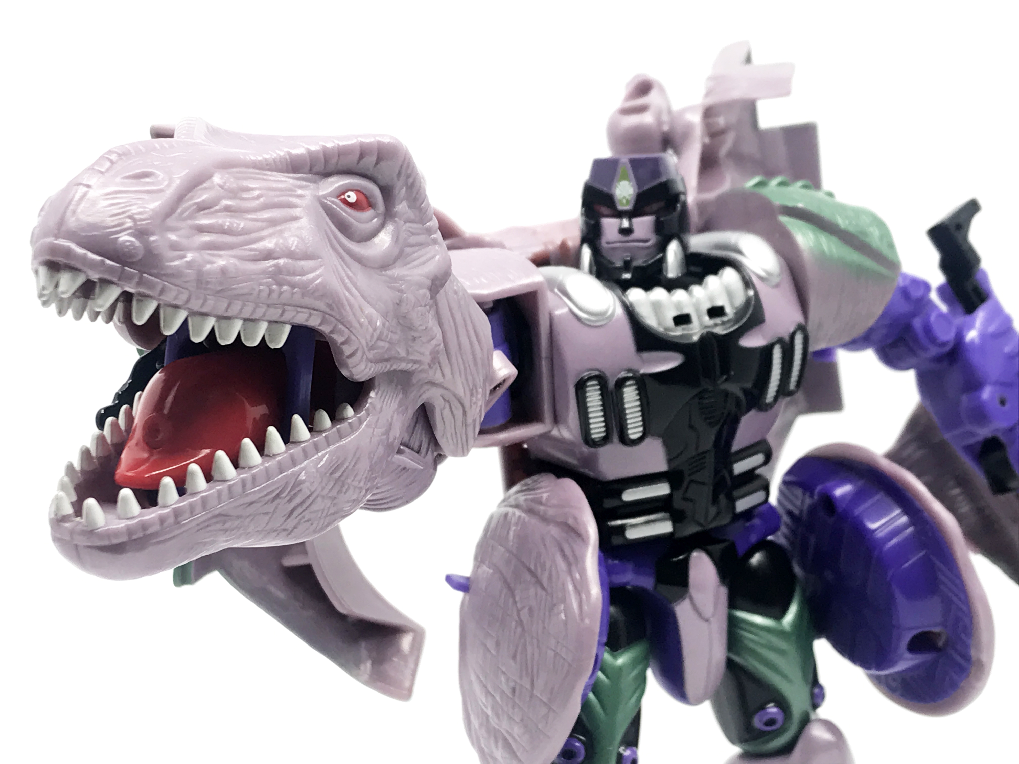 비스트 모드는 티라노사우루스. 애니메이션 방영 이전, 완구 초창기엔 악어로 변신하는 캐릭터였으나 좀 더 멋진 티라노사우루스로 디자인이 변경된 케이스입니다. 1996년 완구의 조형을 그대로 사용하기에 꽤 두꺼운 인상입니다.