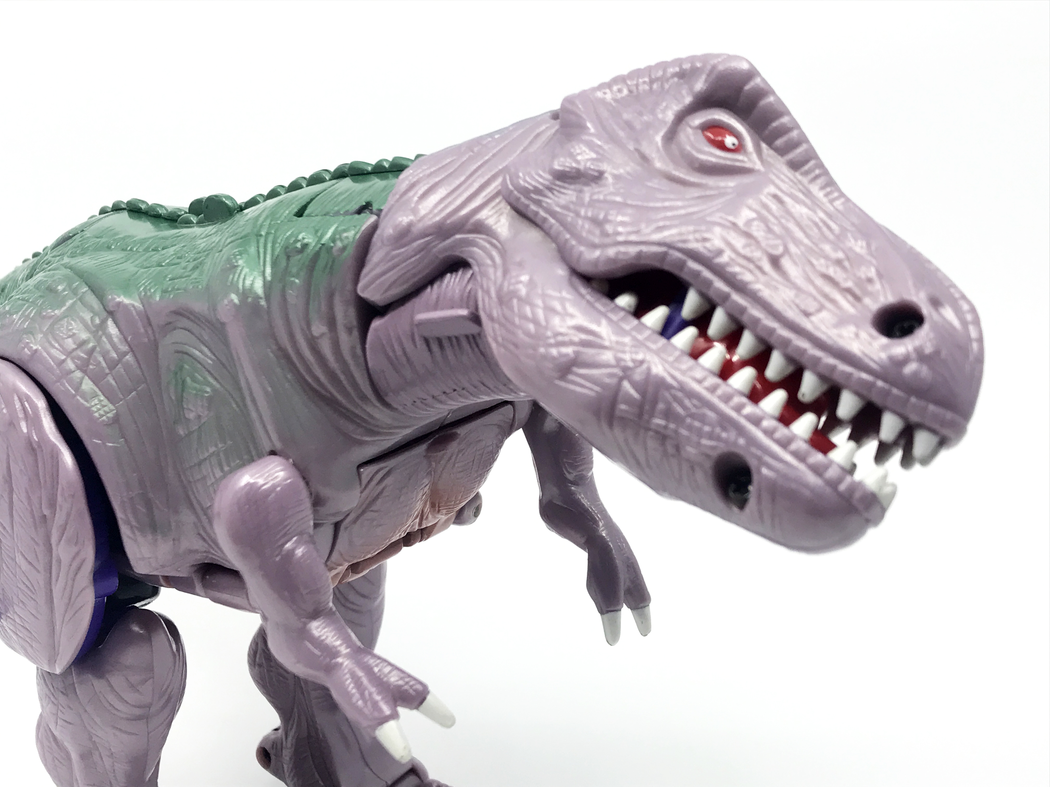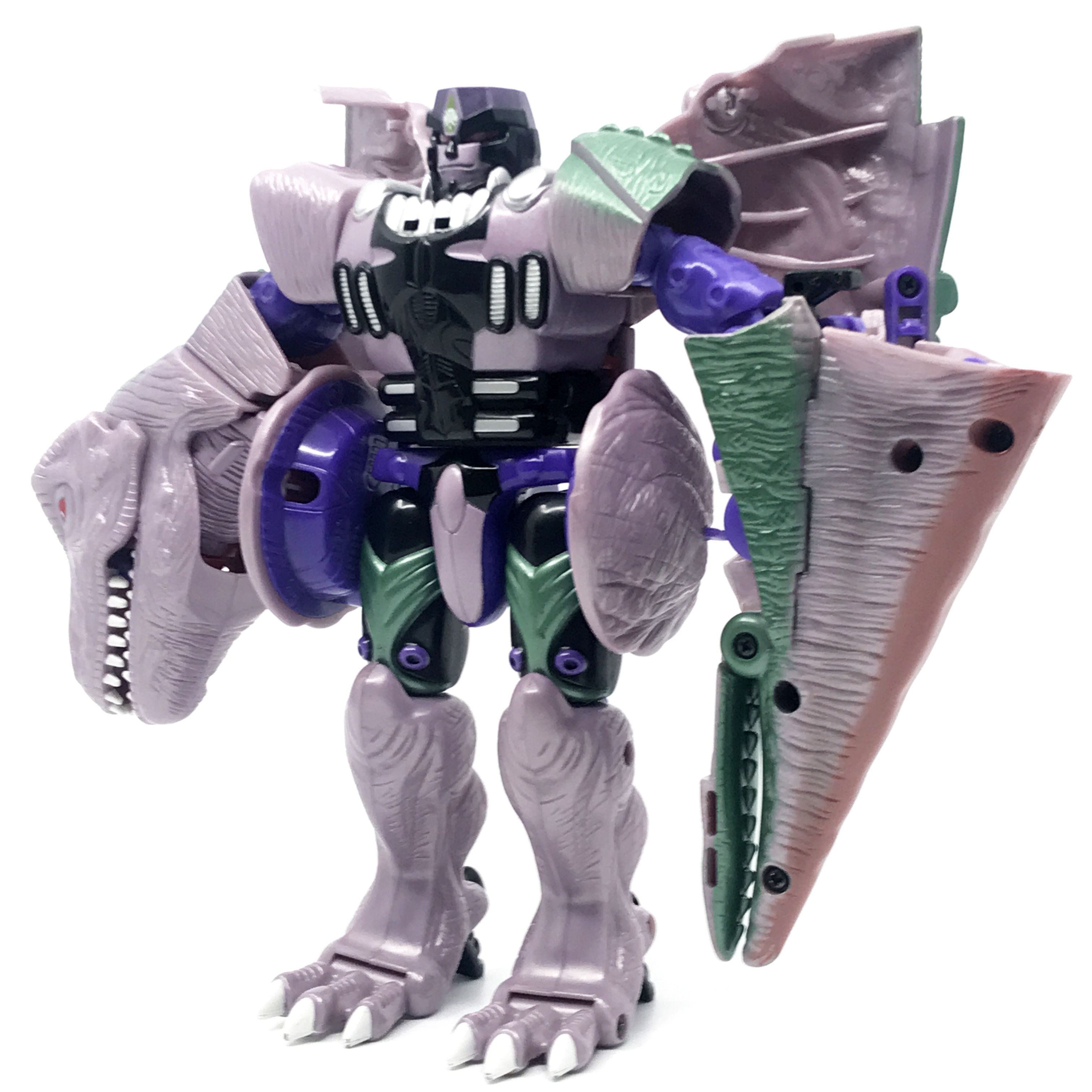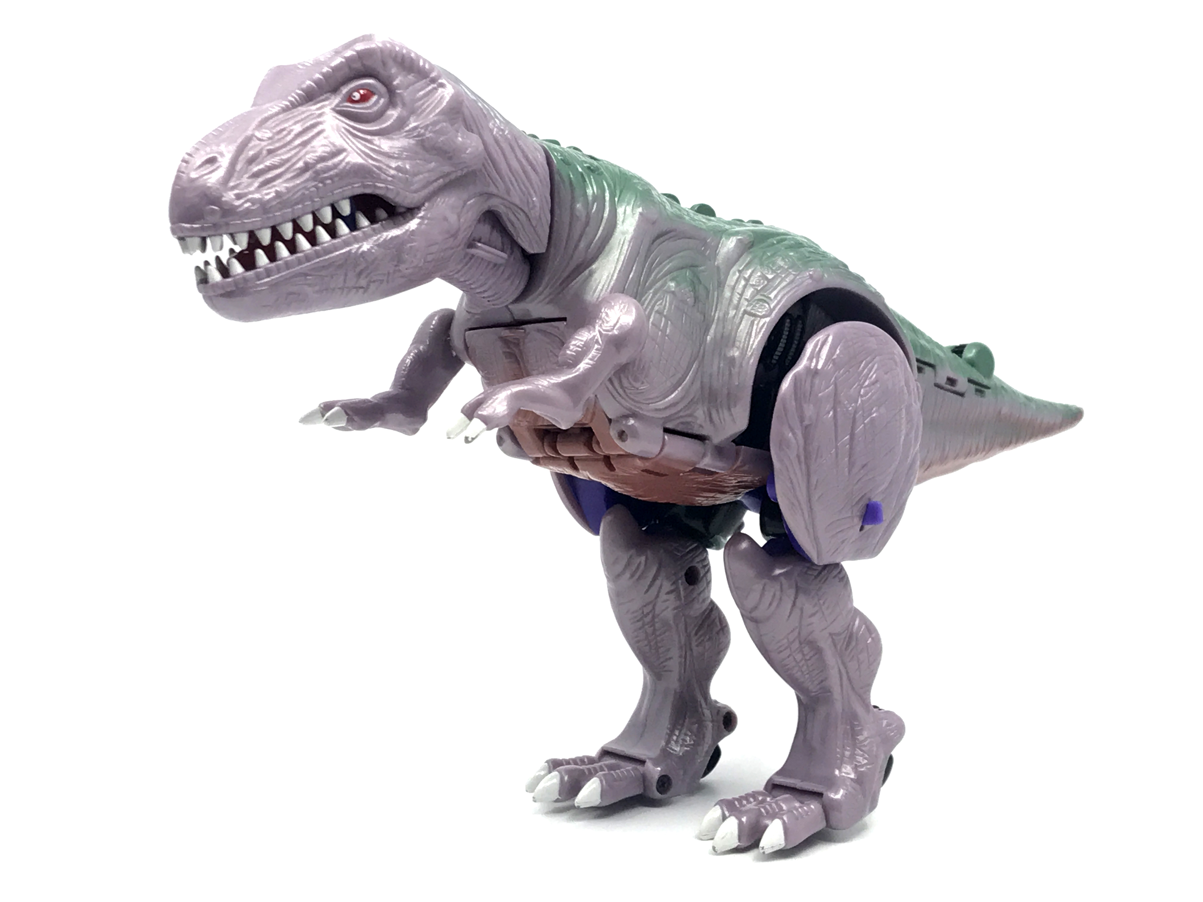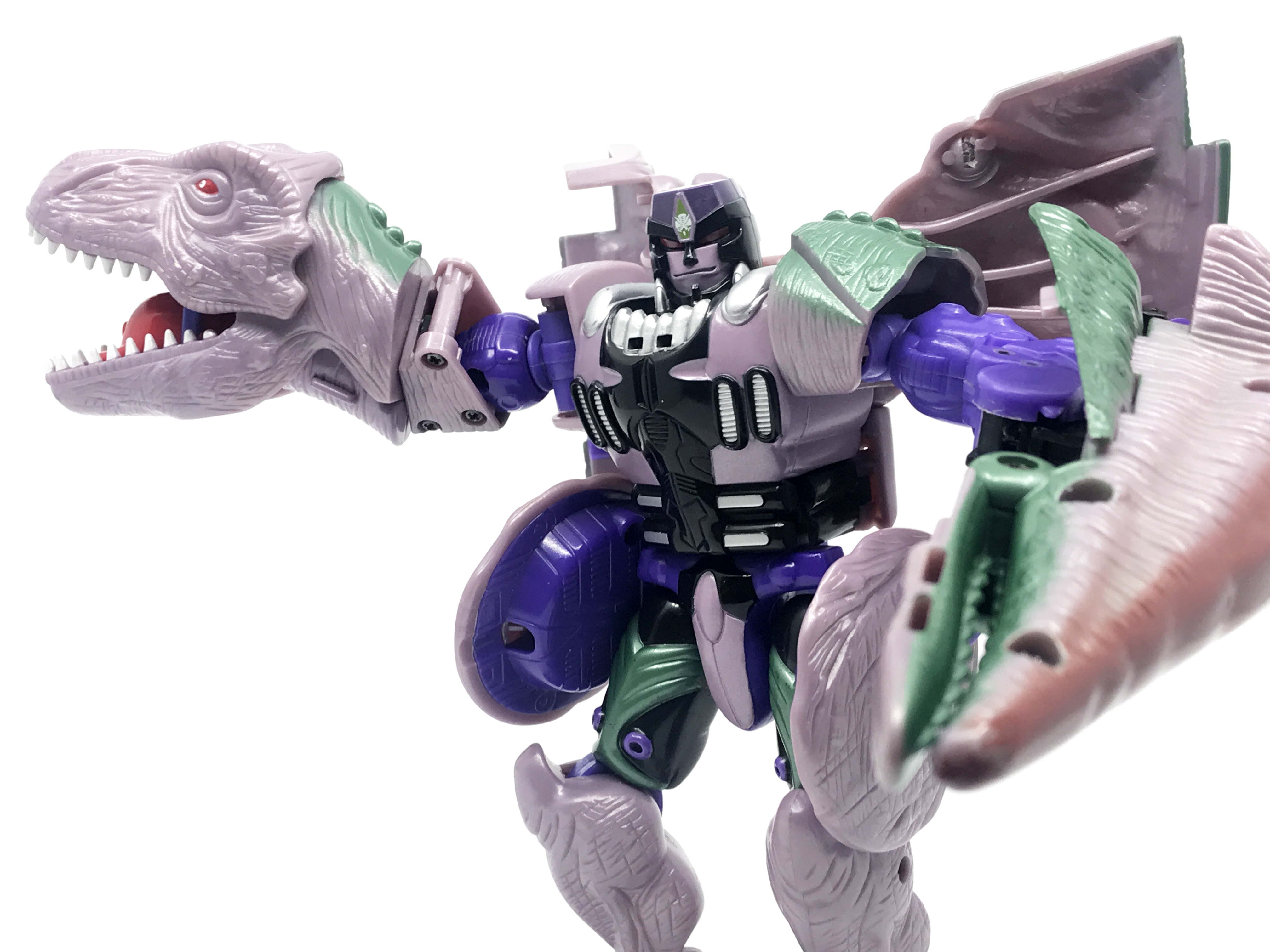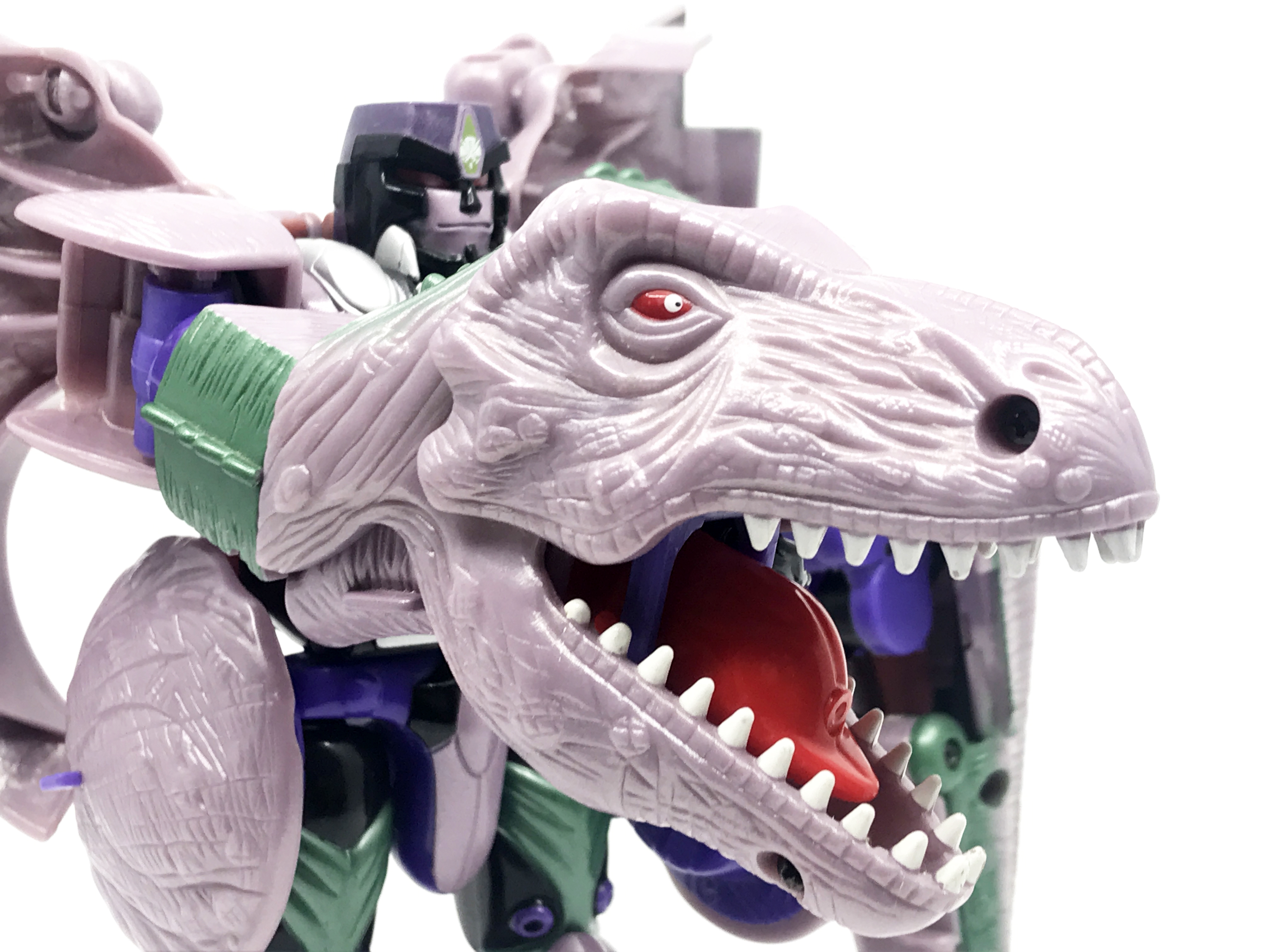 비스트 모드는 티라노사우루스. 애니메이션 방영 이전, 완구 초창기엔 악어로 변신하는 캐릭터였으나 좀 더 멋진 티라노사우루스로 디자인이 변경된 케이스입니다. 1996년 완구의 조형을 그대로 사용하기에 꽤 두꺼운 인상입니다.