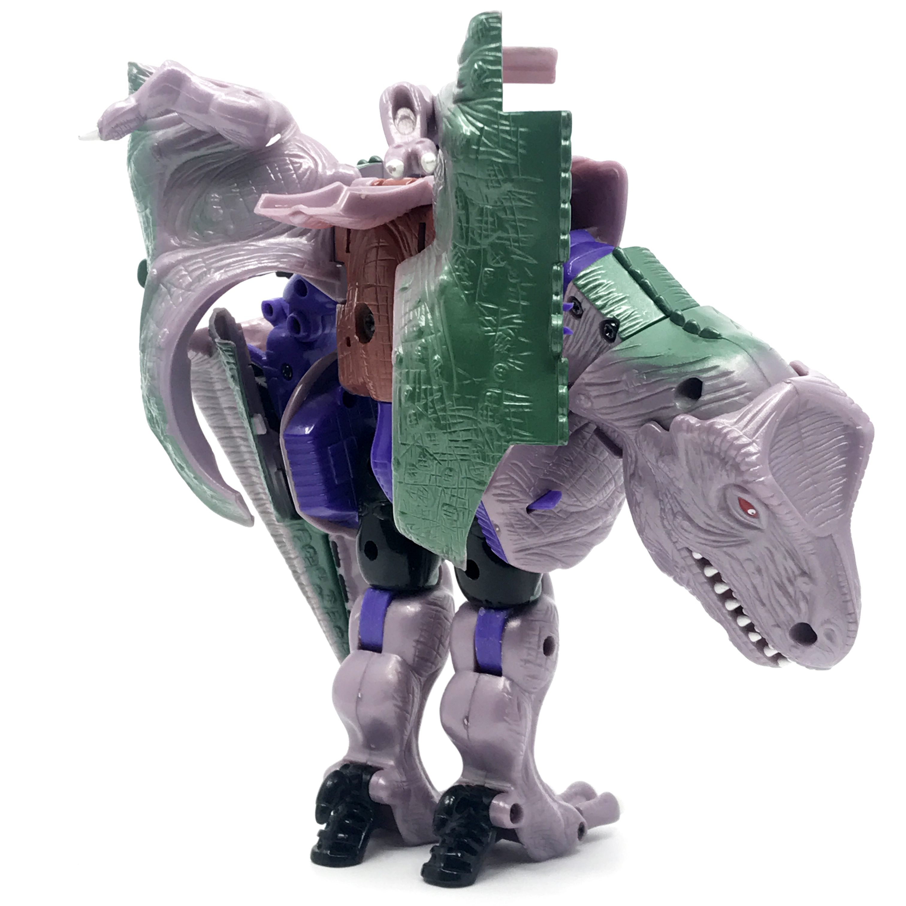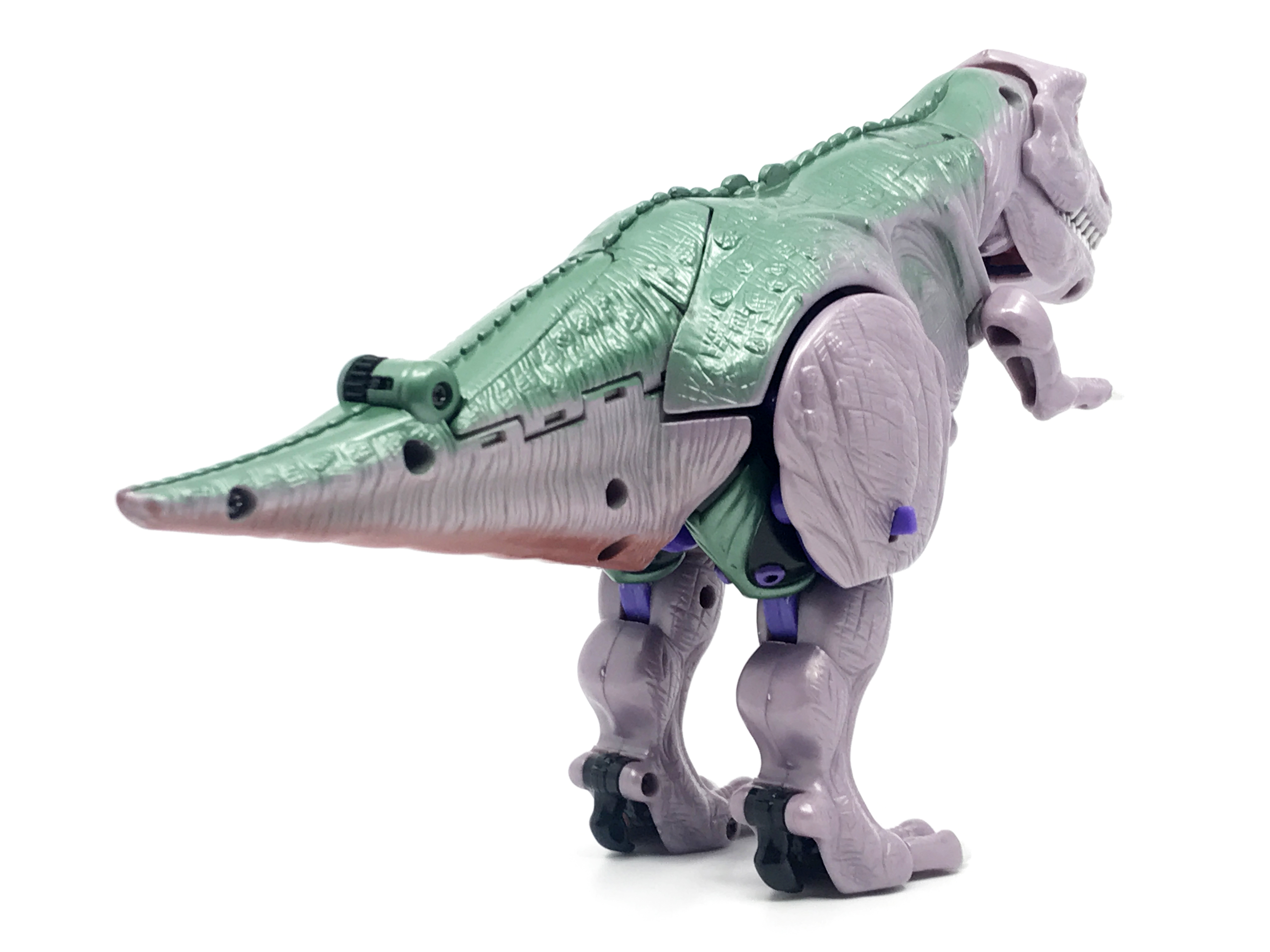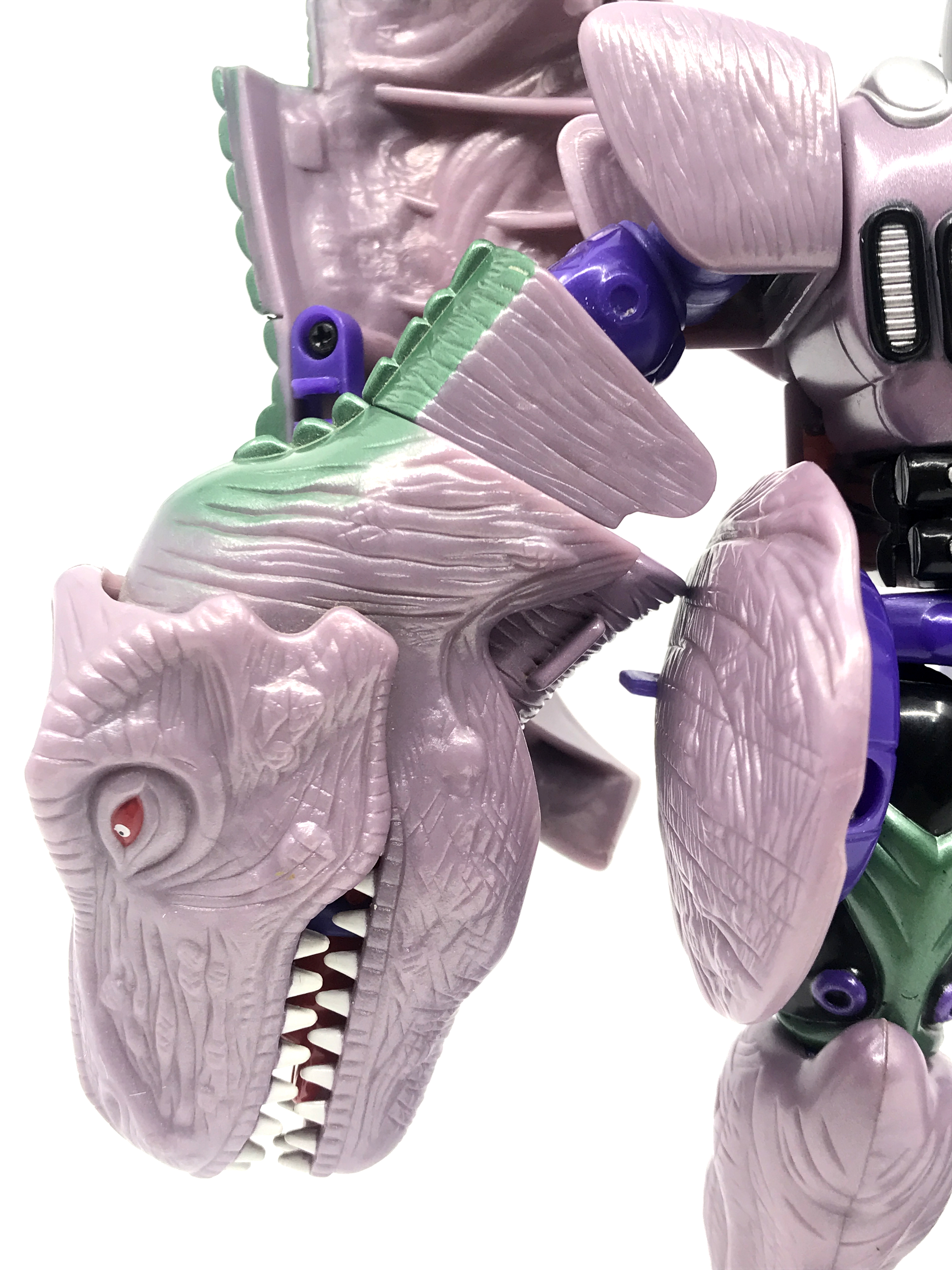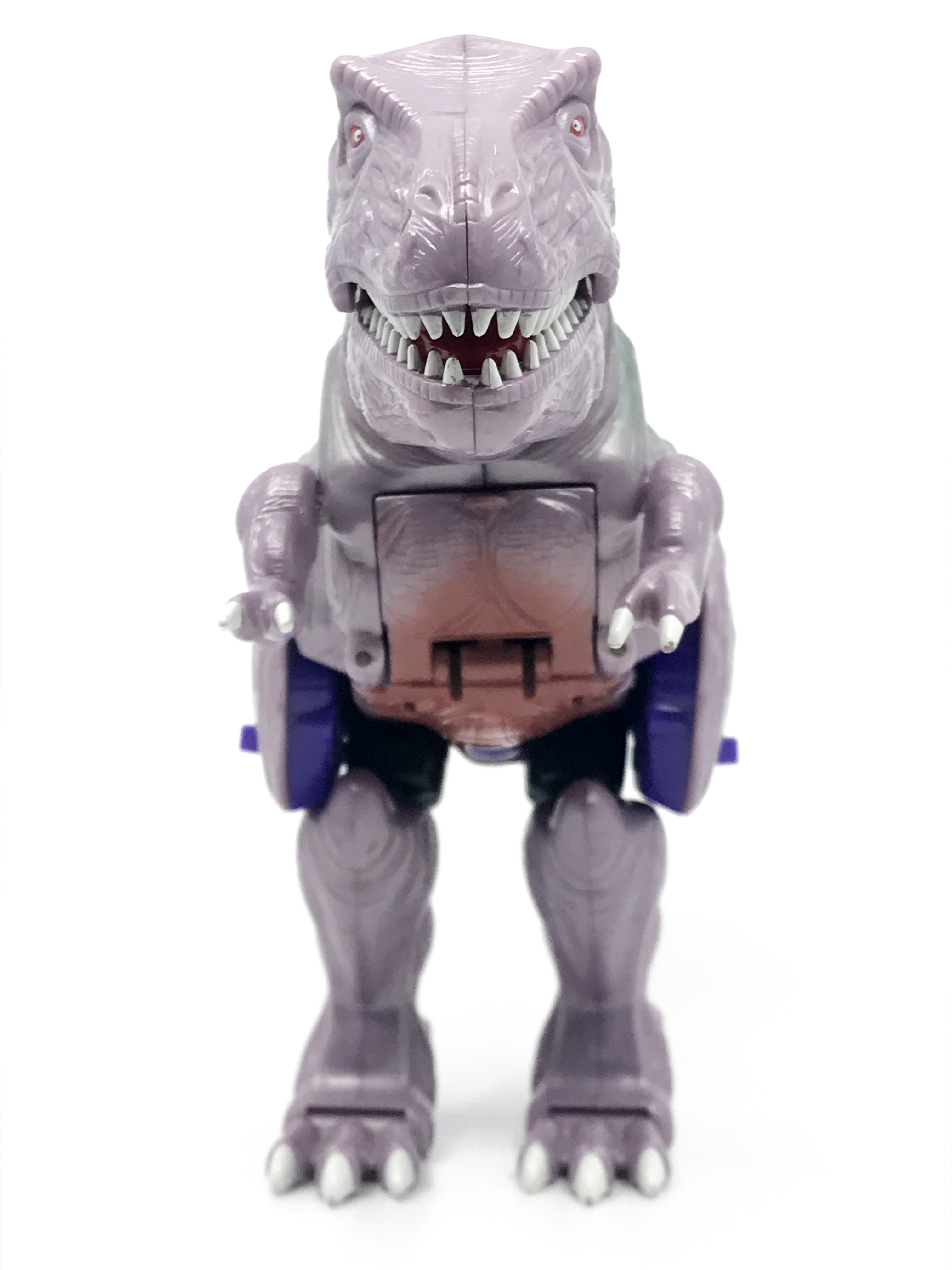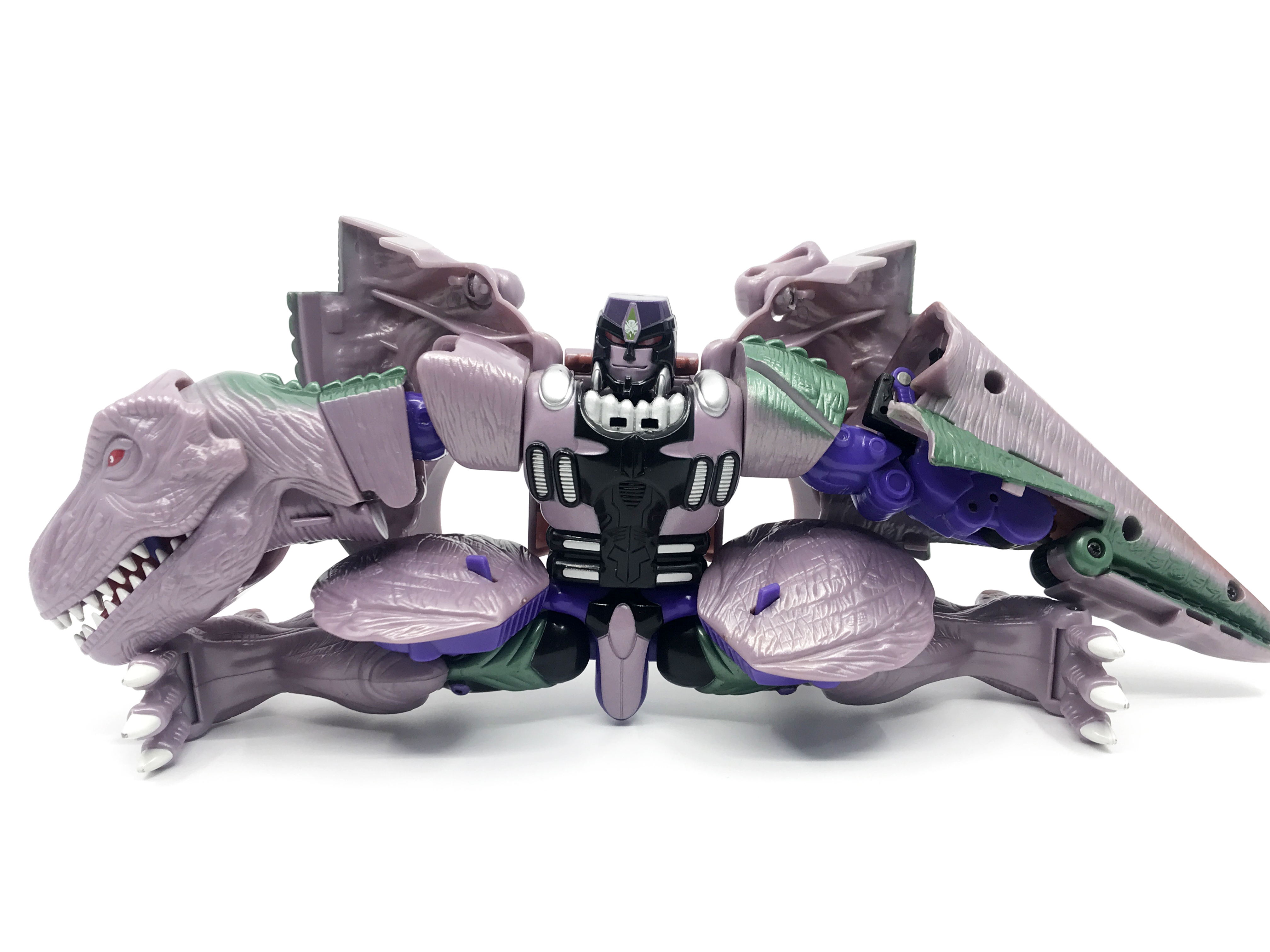 비스트 모드는 티라노사우루스. 애니메이션 방영 이전, 완구 초창기엔 악어로 변신하는 캐릭터였으나 좀 더 멋진 티라노사우루스로 디자인이 변경된 케이스입니다. 1996년 완구의 조형을 그대로 사용하기에 꽤 두꺼운 인상입니다.