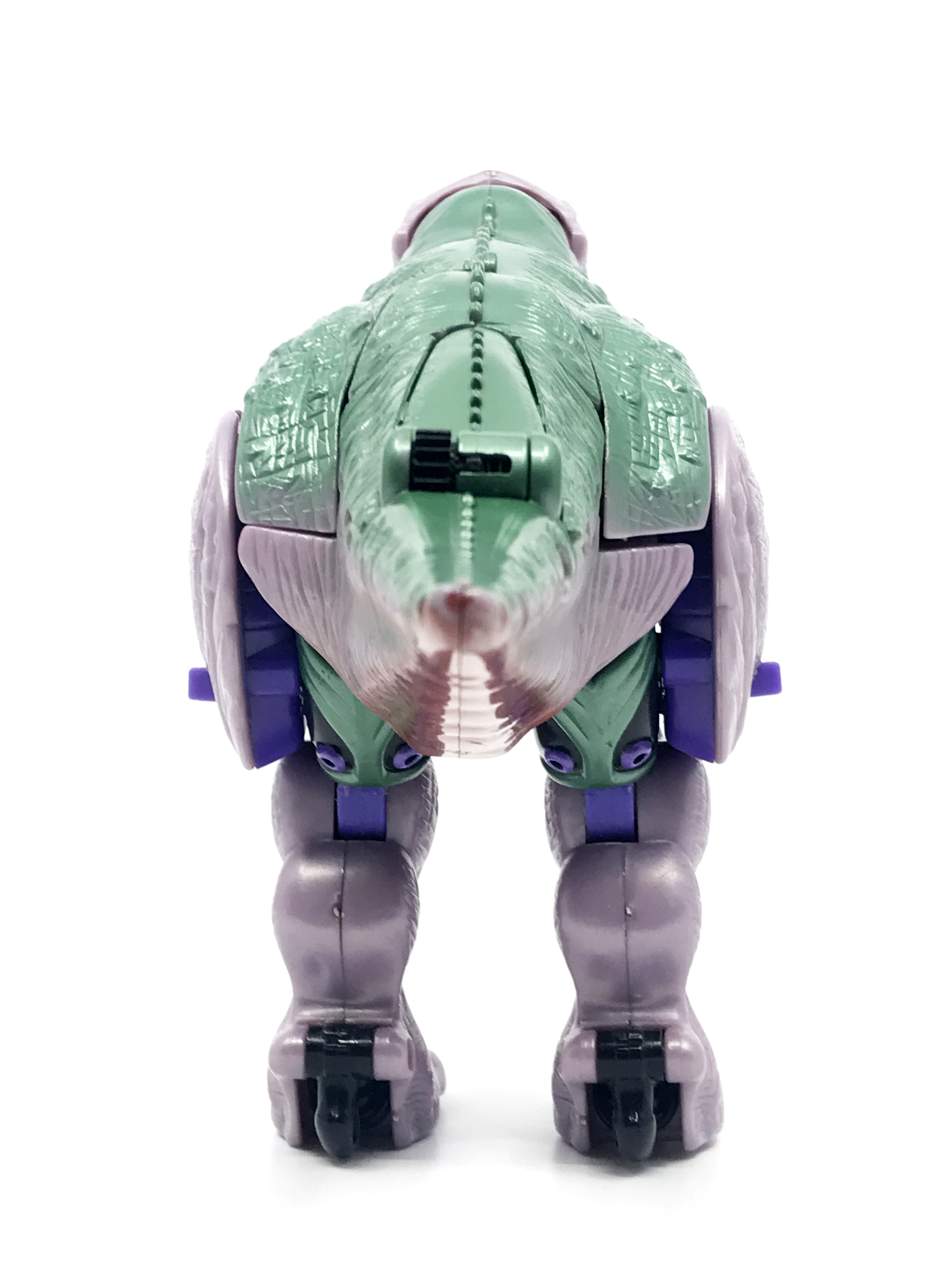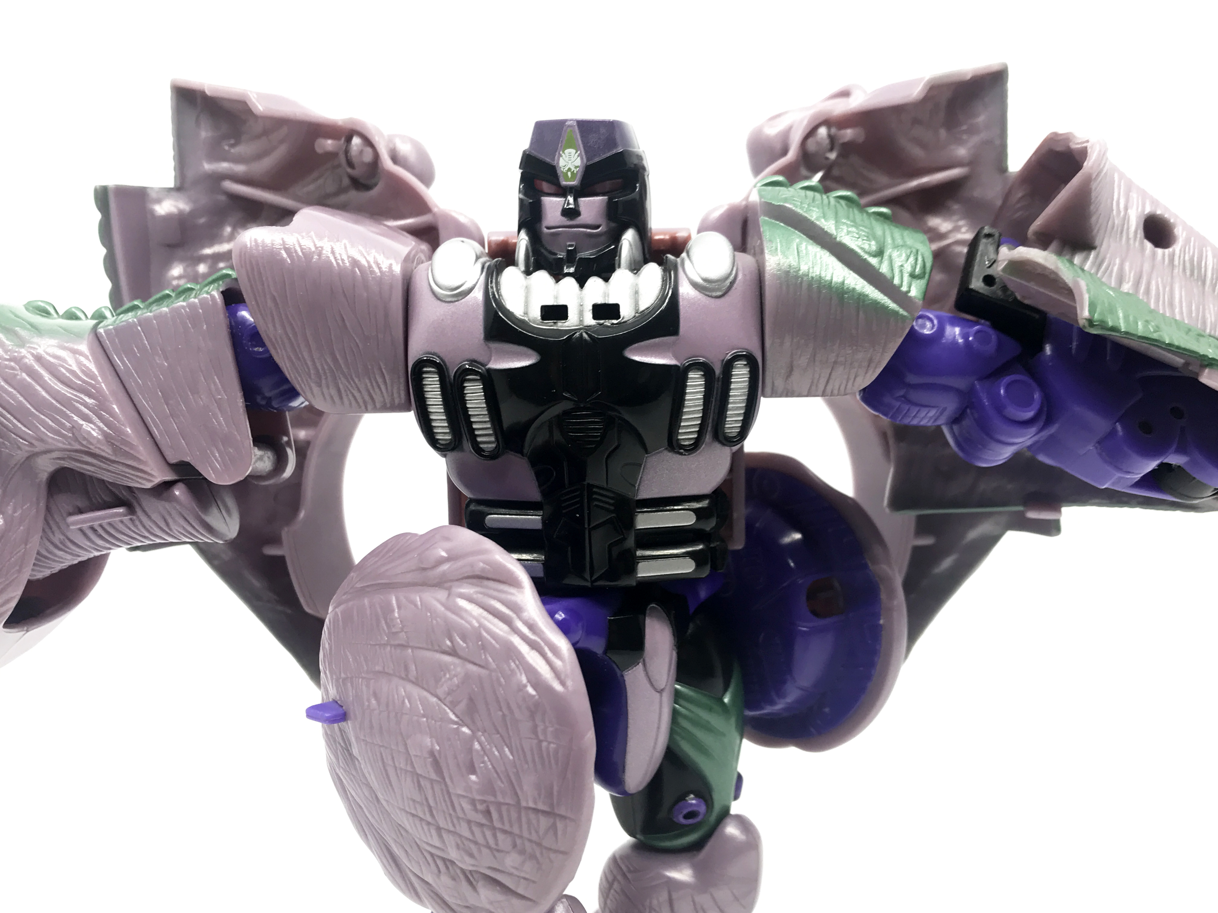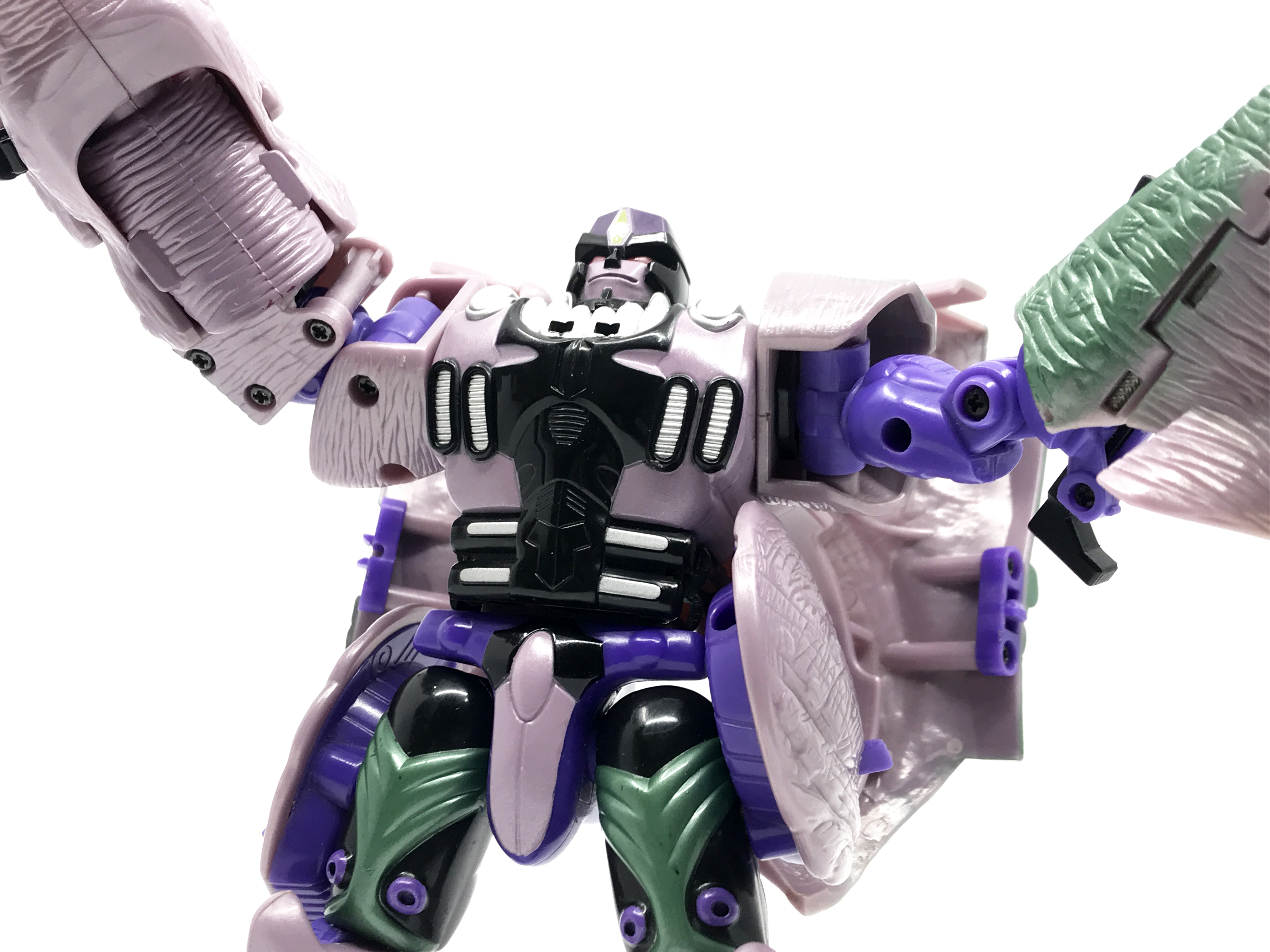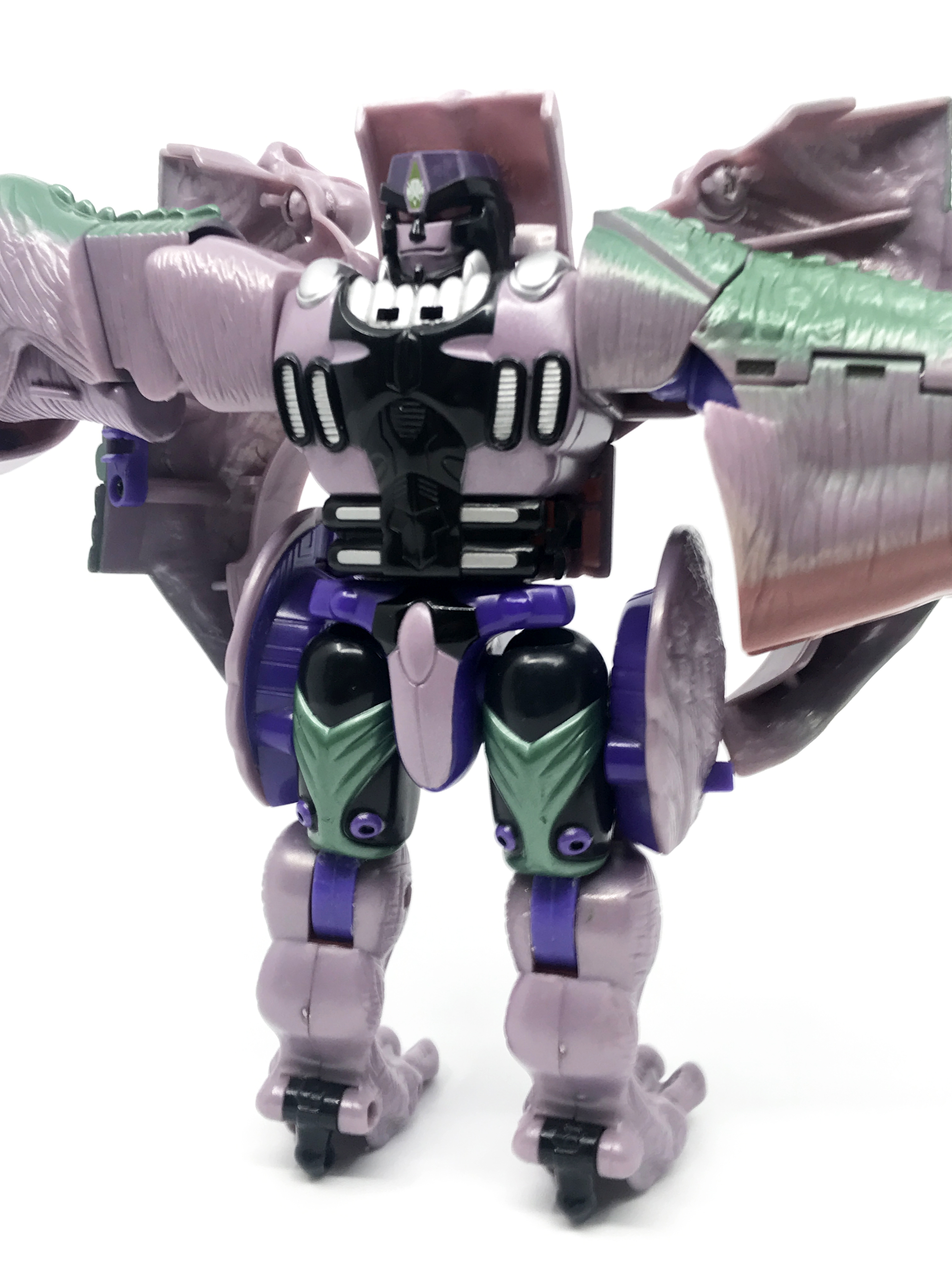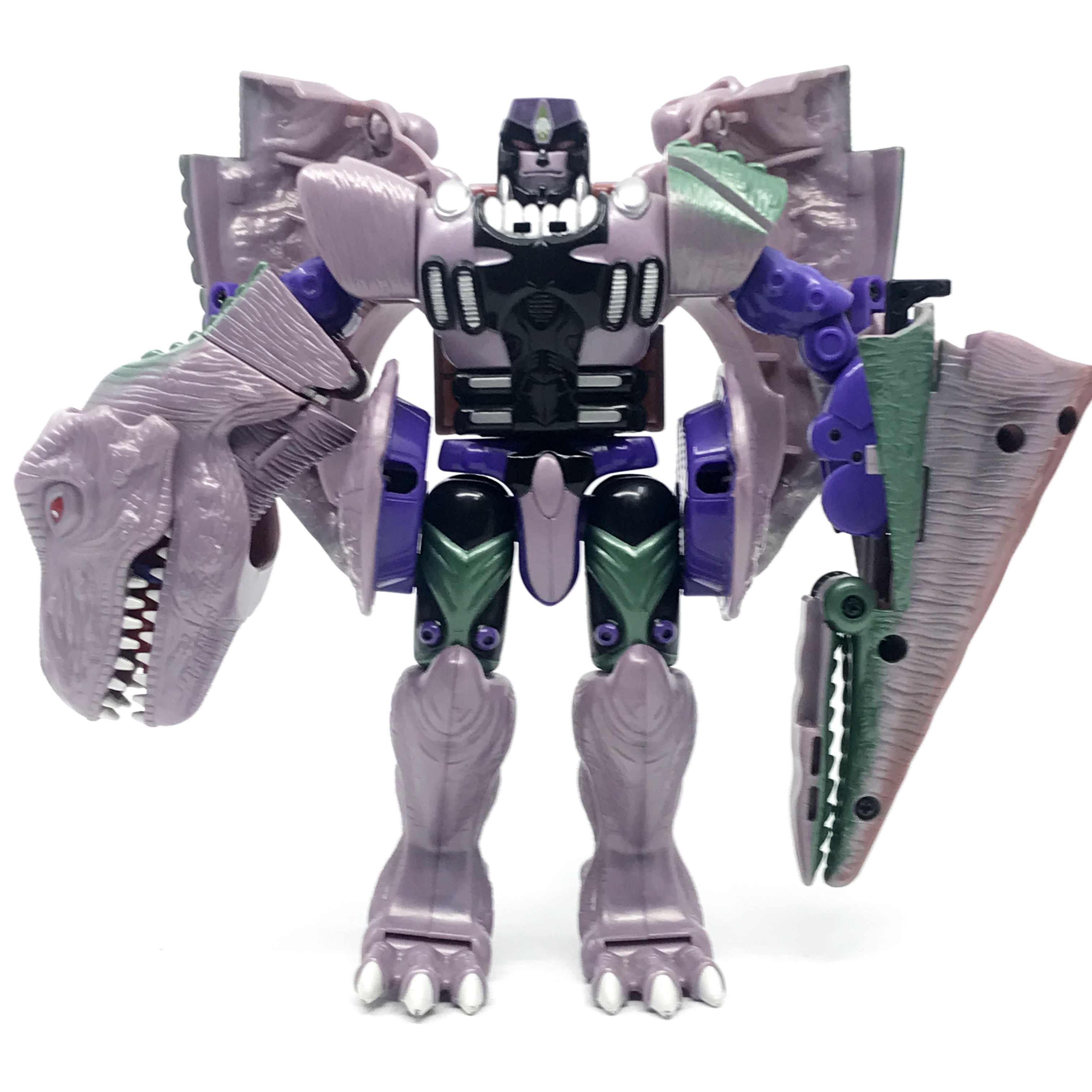 비스트 모드는 티라노사우루스. 애니메이션 방영 이전, 완구 초창기엔 악어로 변신하는 캐릭터였으나 좀 더 멋진 티라노사우루스로 디자인이 변경된 케이스입니다. 1996년 완구의 조형을 그대로 사용하기에 꽤 두꺼운 인상입니다.