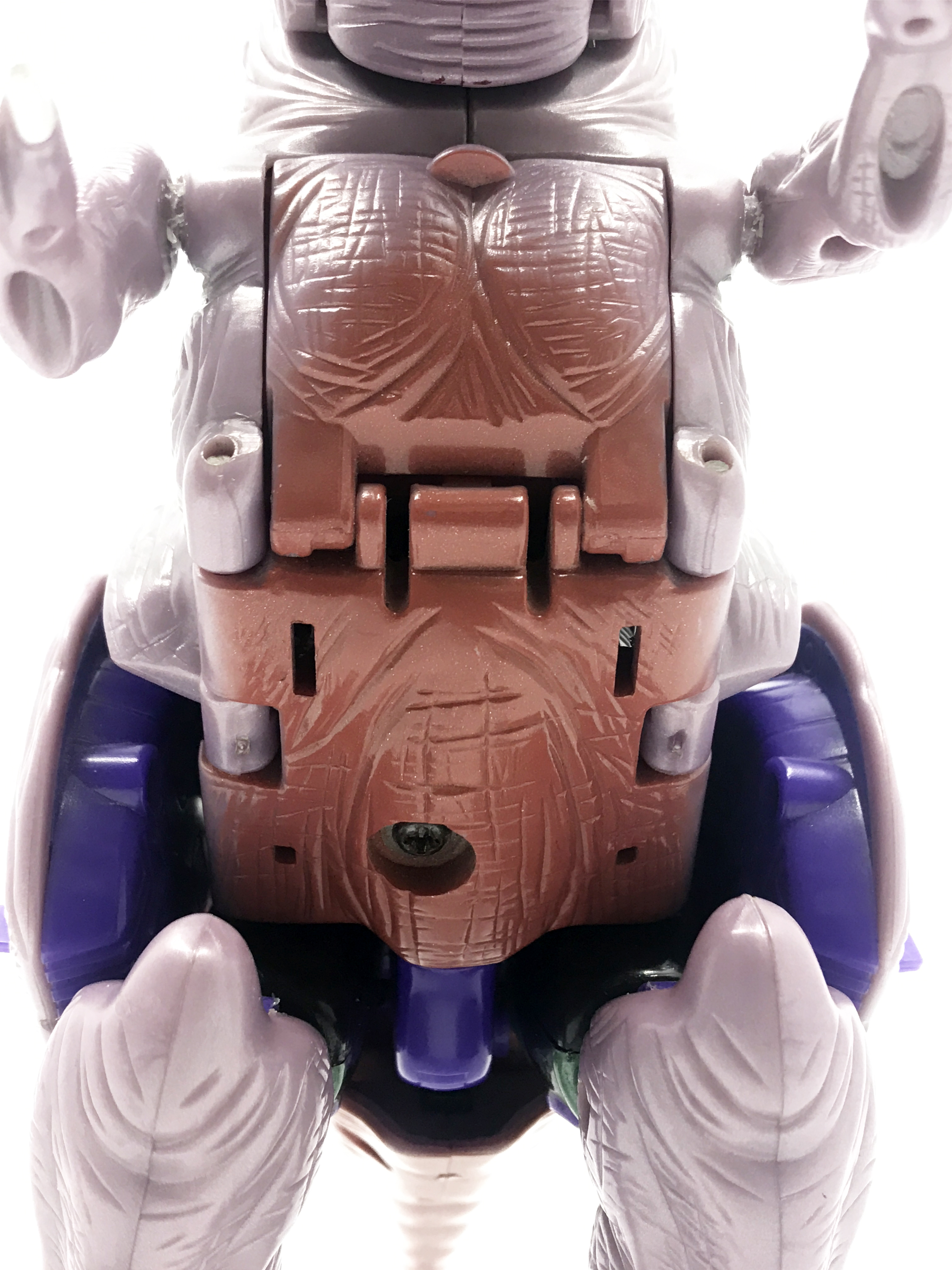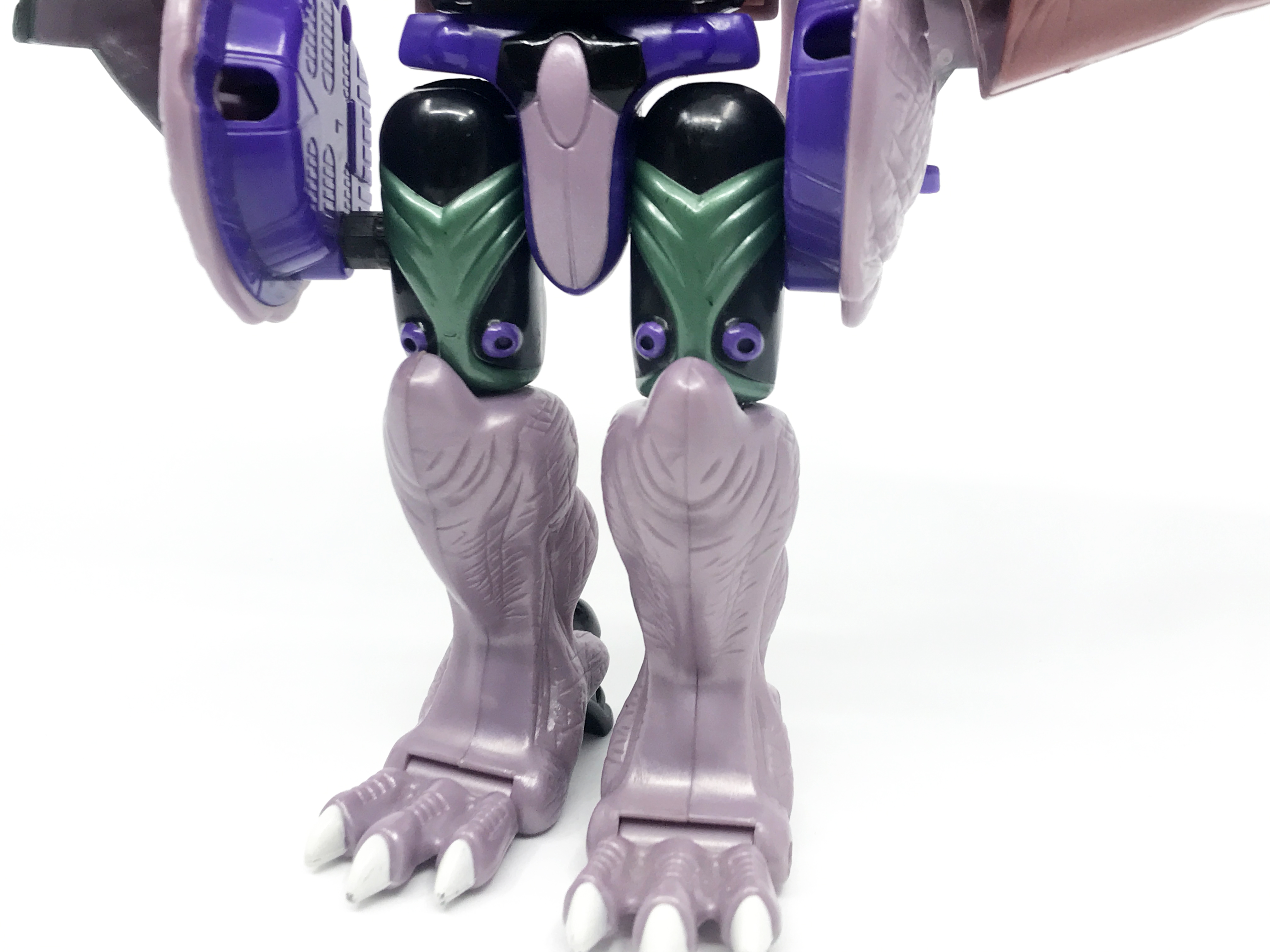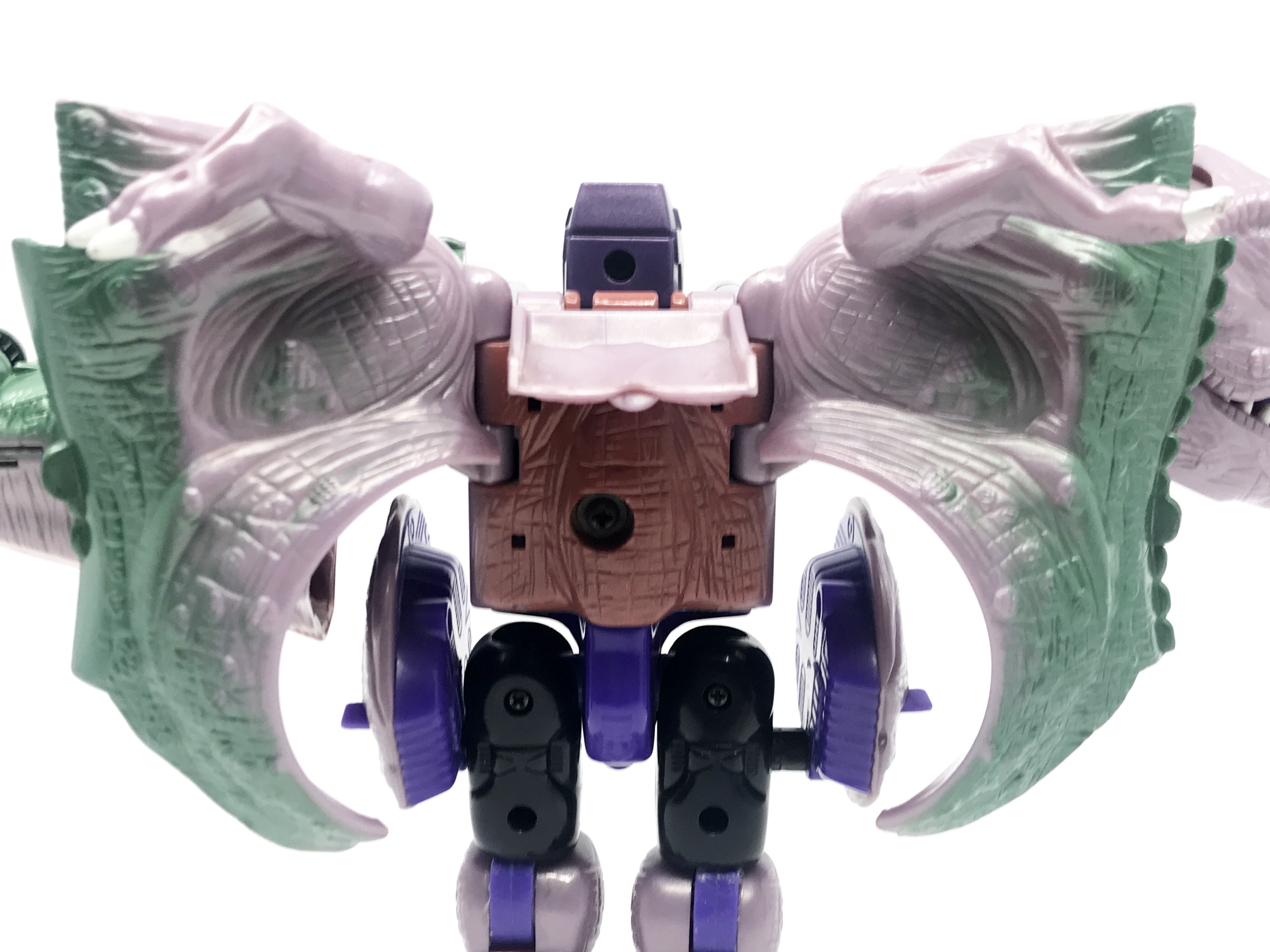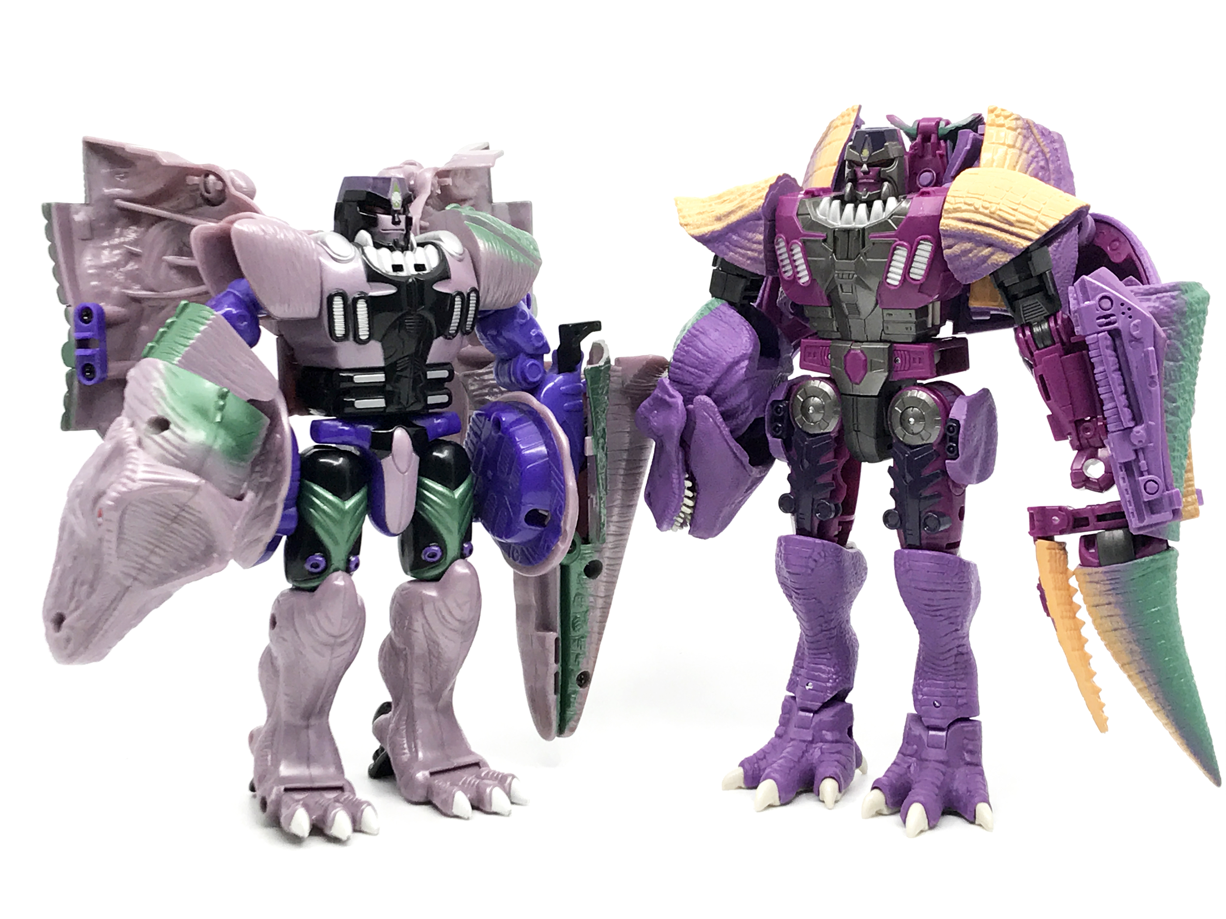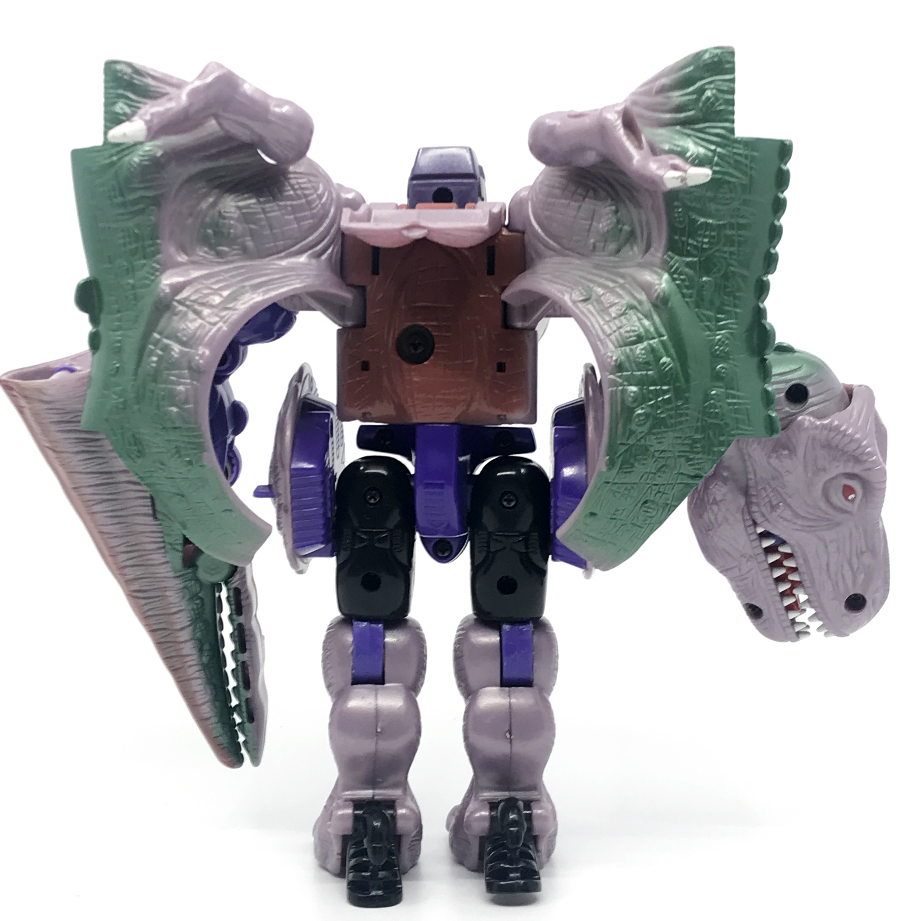 비스트 모드는 티라노사우루스. 애니메이션 방영 이전, 완구 초창기엔 악어로 변신하는 캐릭터였으나 좀 더 멋진 티라노사우루스로 디자인이 변경된 케이스입니다. 1996년 완구의 조형을 그대로 사용하기에 꽤 두꺼운 인상입니다.
