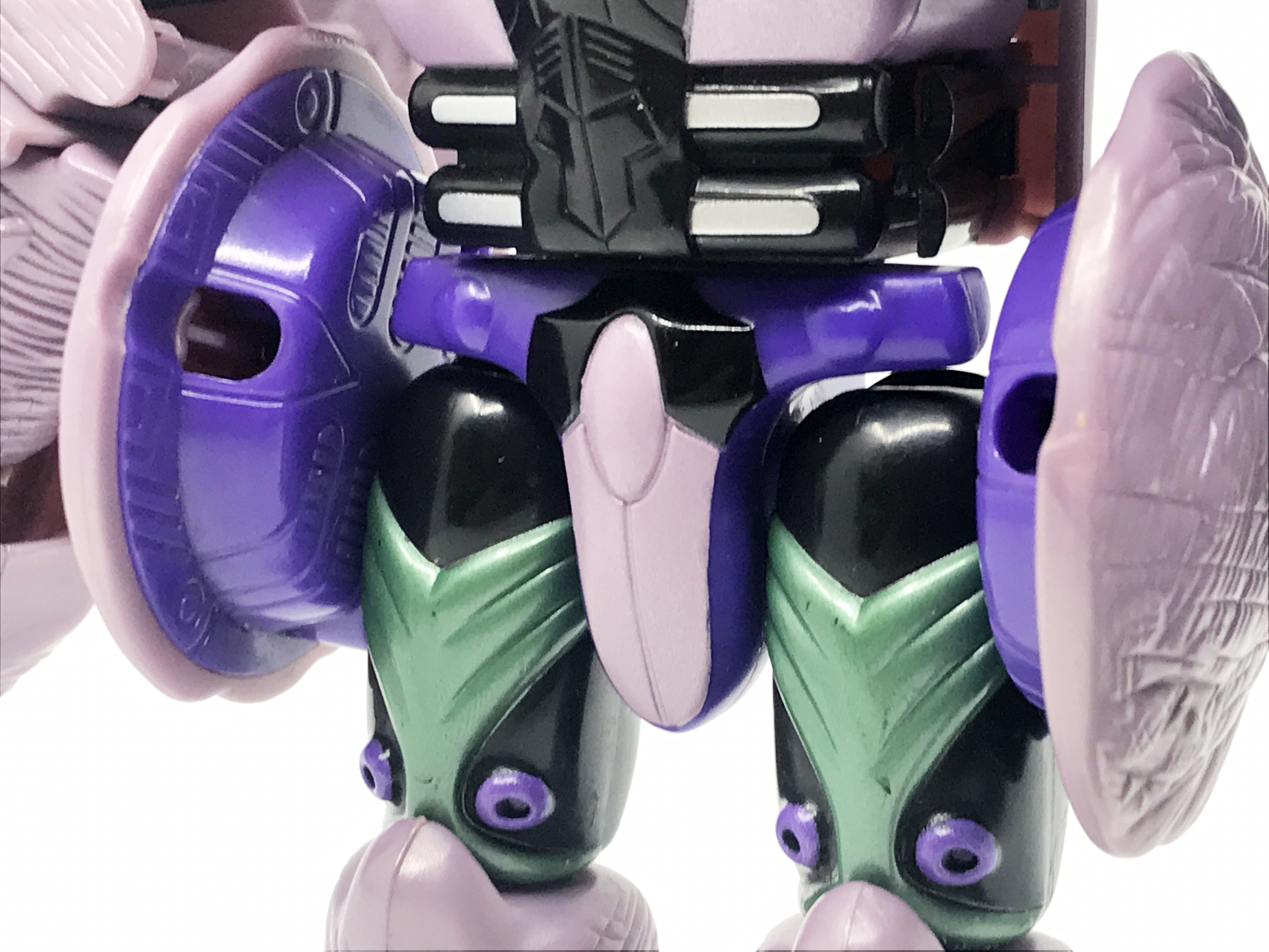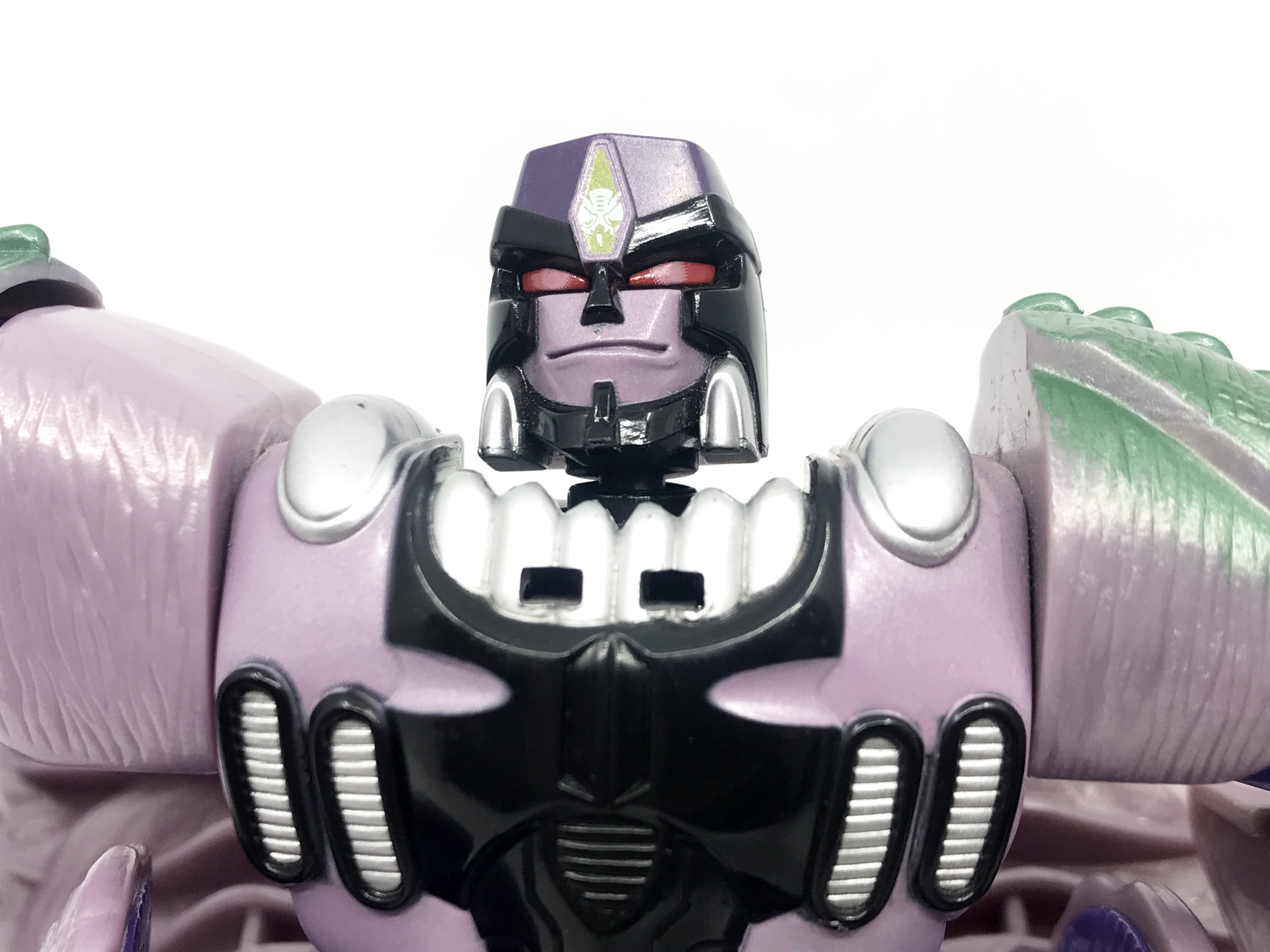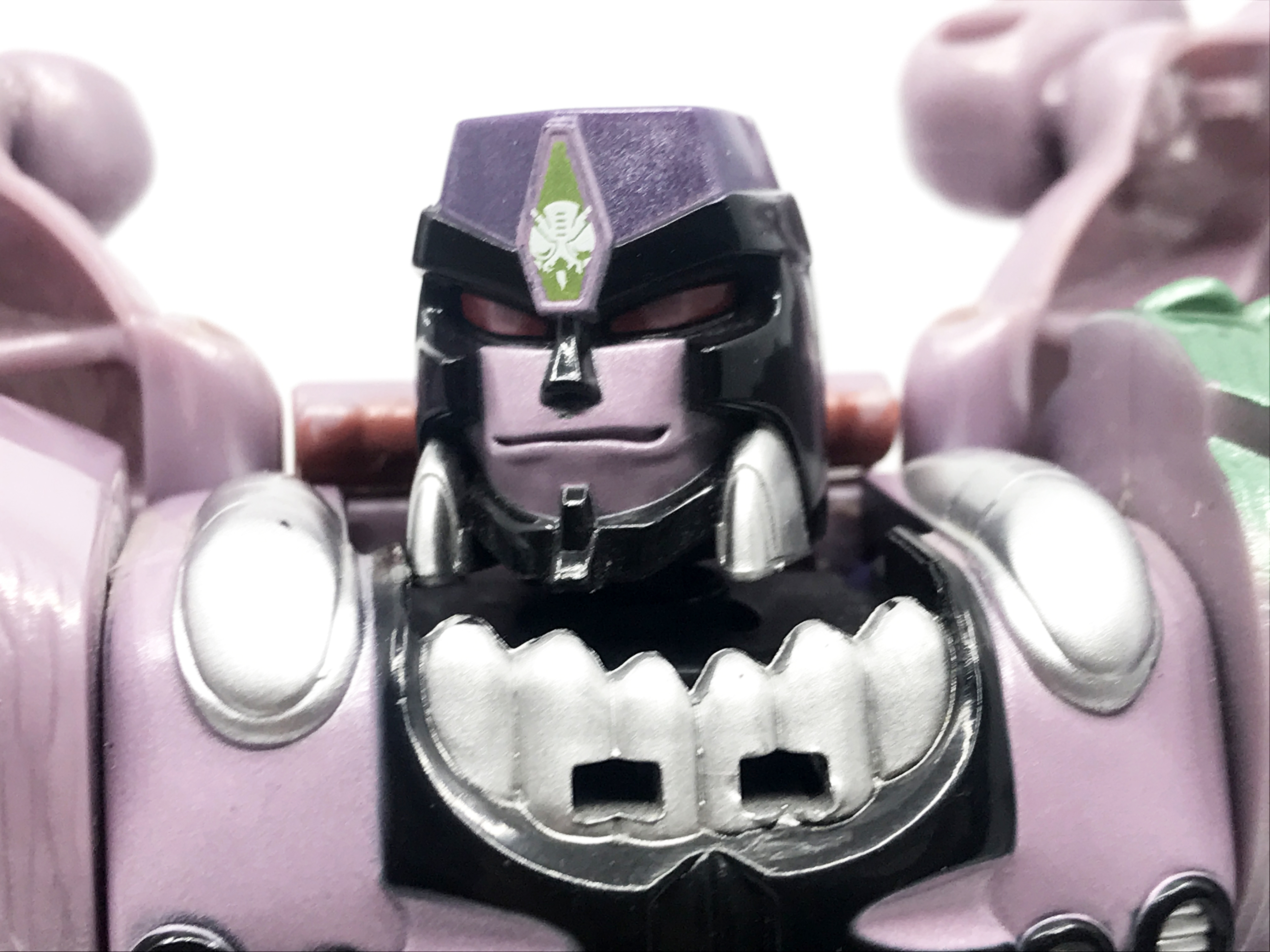 중고 제품이라 그런지 이마의 프레데콘 마크가 약간 훼손된 형태입니다. 큰 도색 미스는 없지요. 이 애니메이션에 가까운 머리 조형은 오직 10주년 기념판에서만 사용됐는데, DX 조형의 재출시가 몇 번 이뤄졌음에도 이 머리 조형은 10주년 제품에만 사용됐기에, 꽤 레어한 얼굴 조형이라 할 수 있지요.