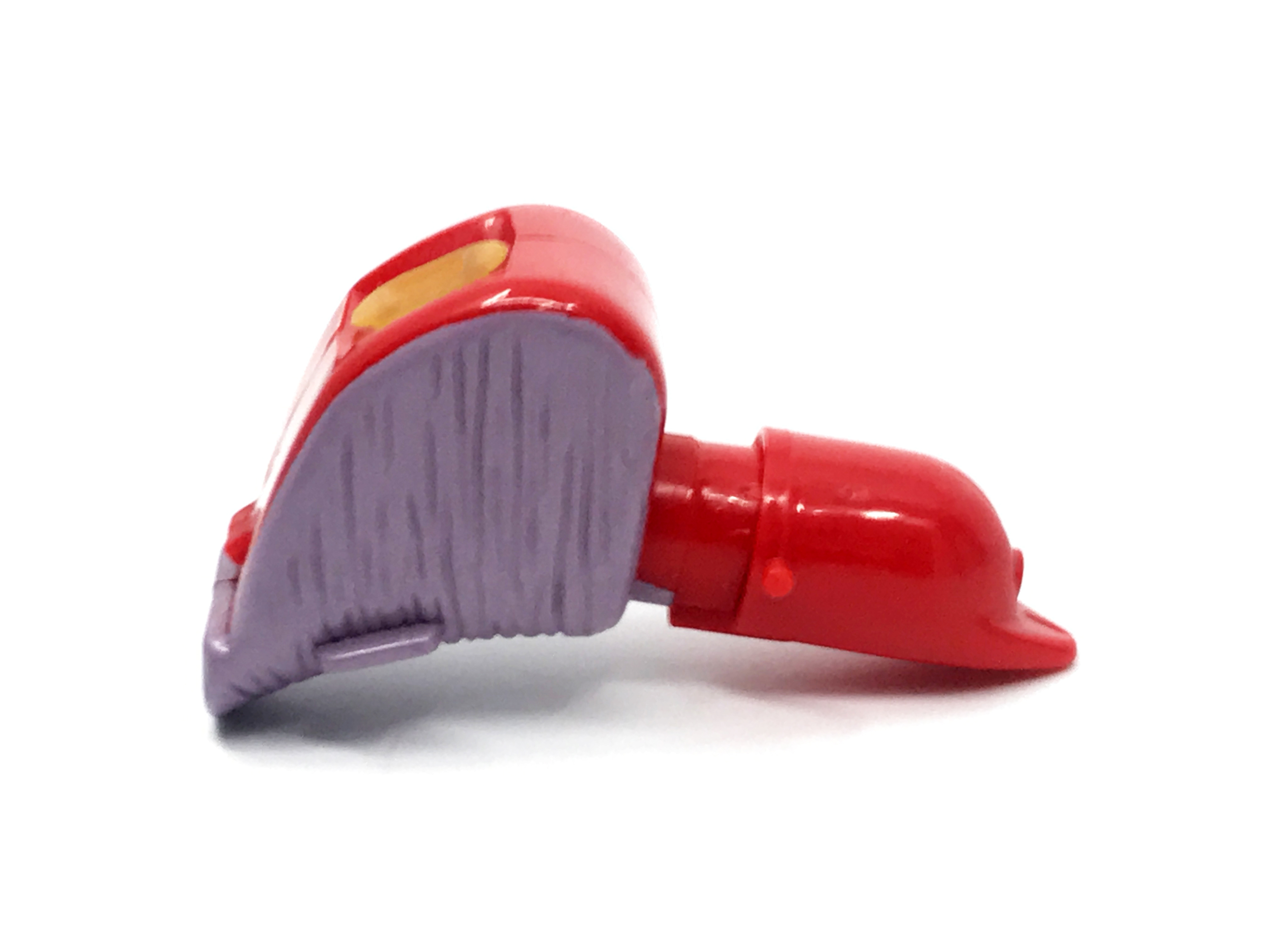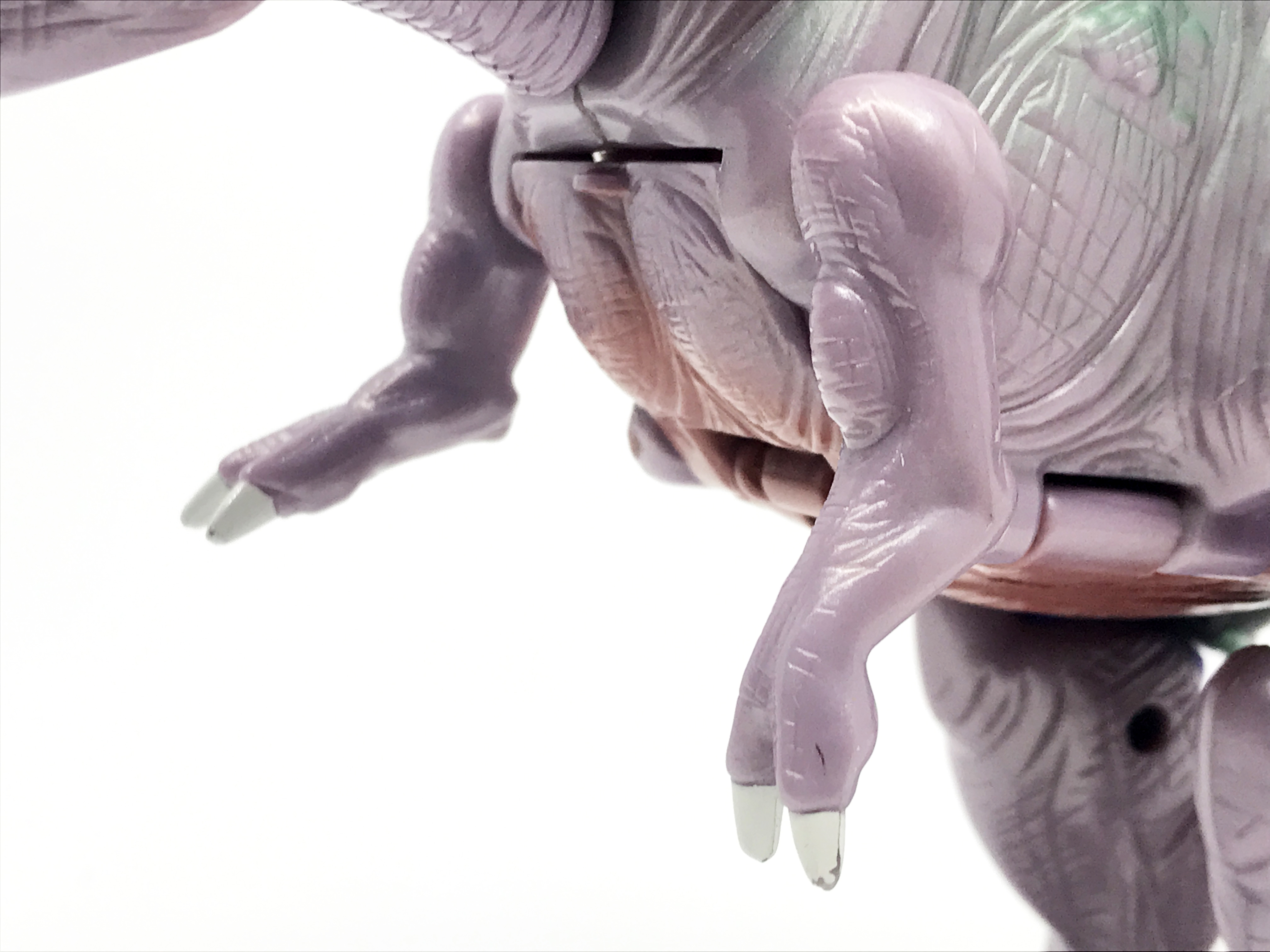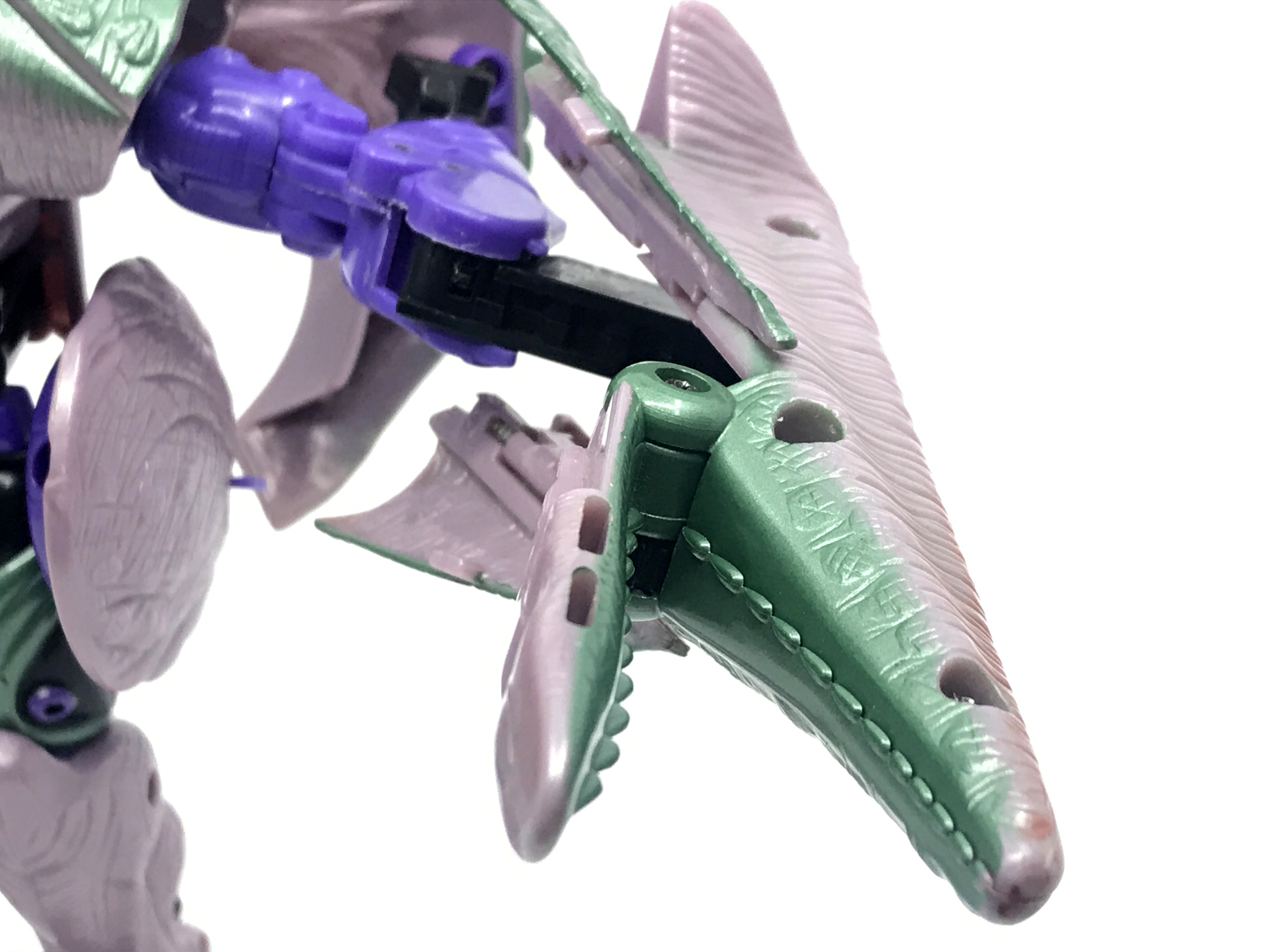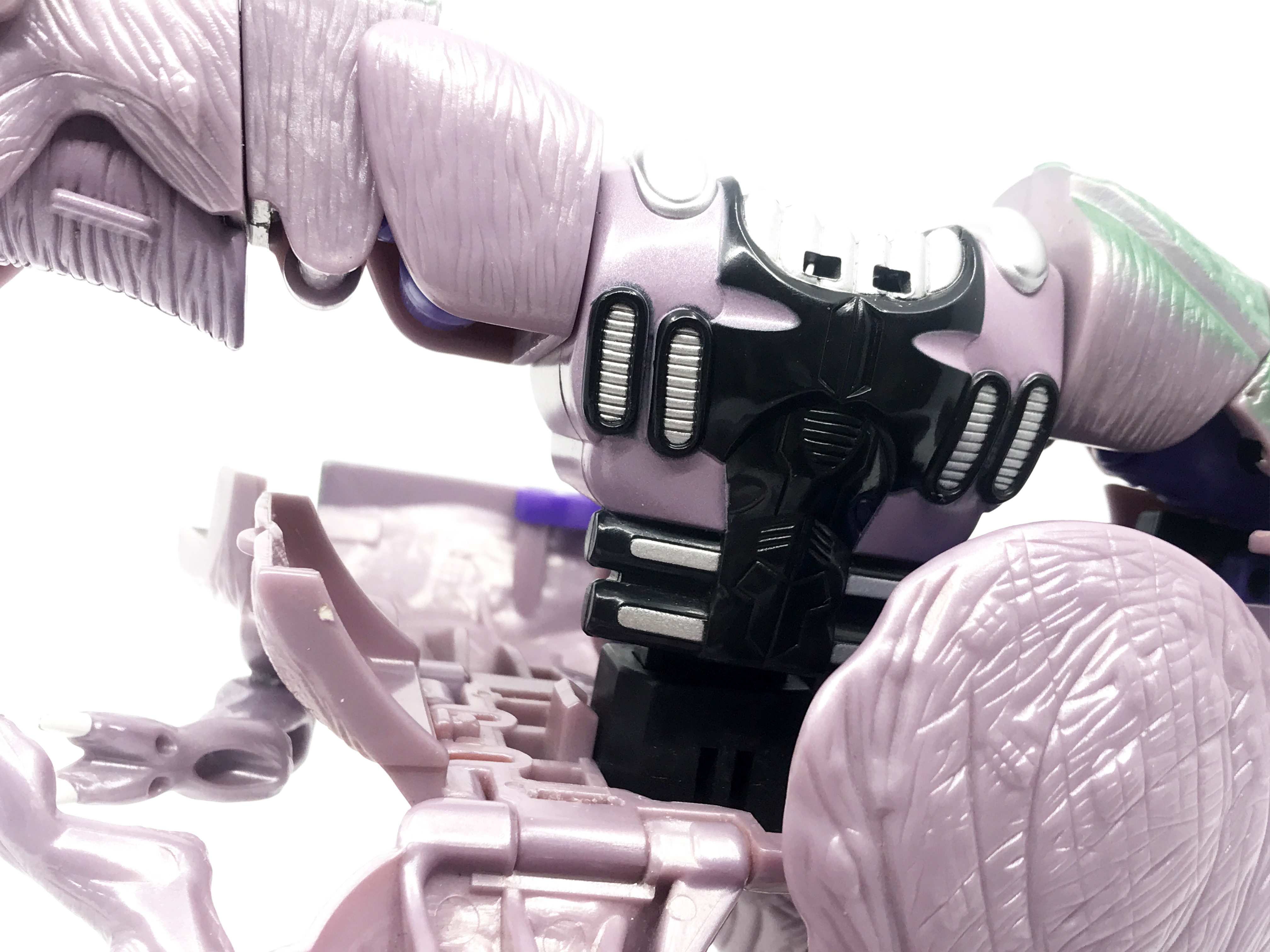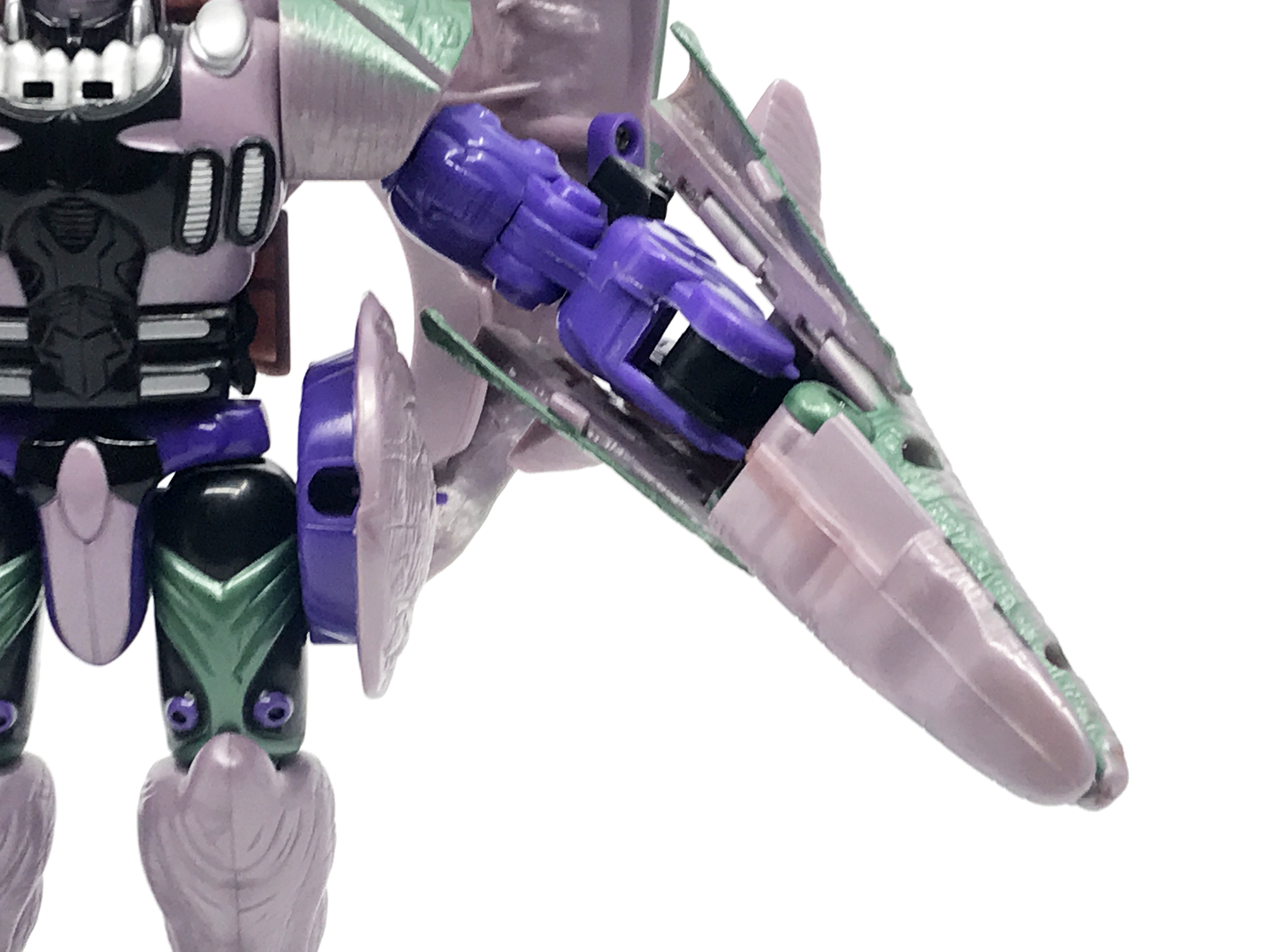 왼팔은 공룡 꼬리가 장착된 형상입니다. 애니메이션에선 꼬리를 분리해 멀쩡한 왼손을 보여주긴 하지만, 완구에선 용수철 기믹이 내장되어 꼬리와 일체화된 형상입니다. 스프링을 통해 꼬리를 가위처럼 사용하는 기믹을 보여줍니다.