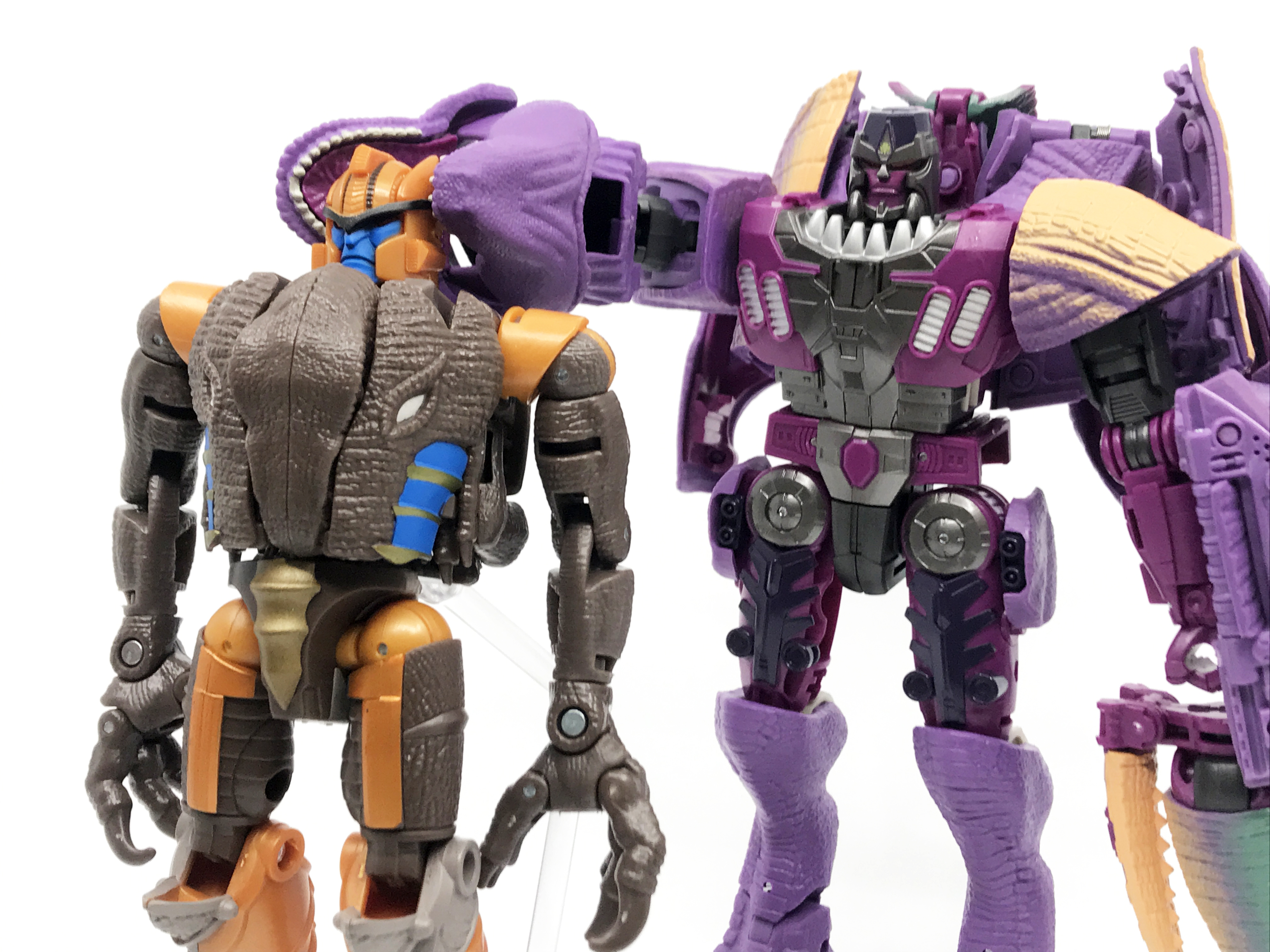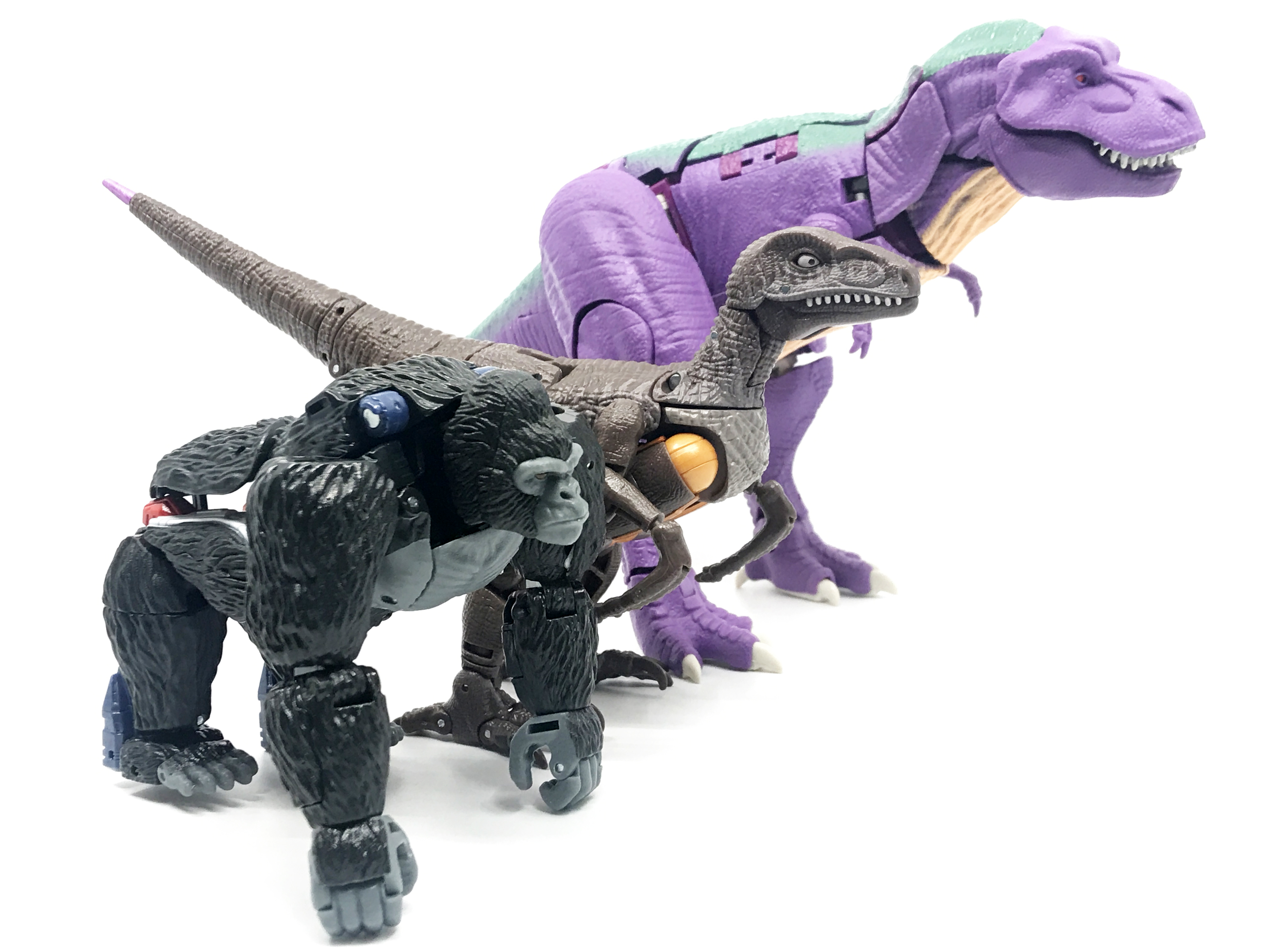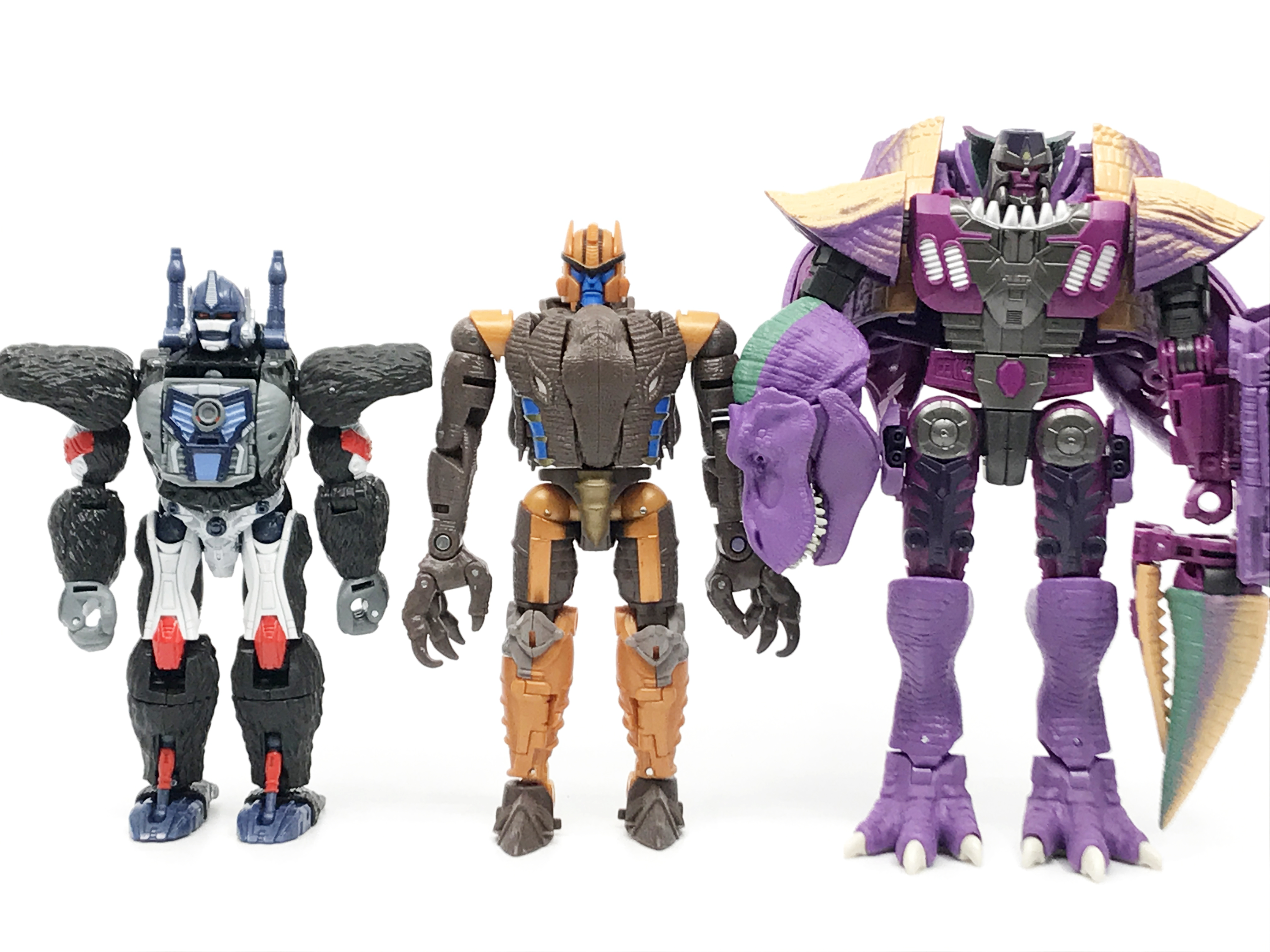 다른 비스트 워즈 캐릭터들과 비교. 다이노봇은 거의 디럭스급 완구의 키를 가집니다. 다이노봇이 극중에선 직립 보행을 한 옵티머스와 비슷한 키였는데, 완구상으론 많이 작아진 것도 특징.