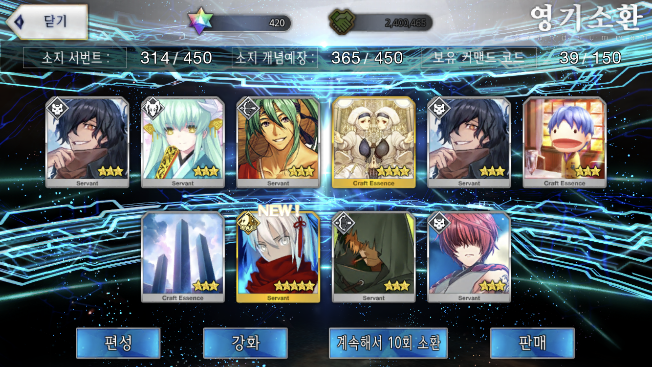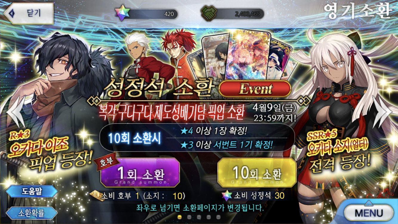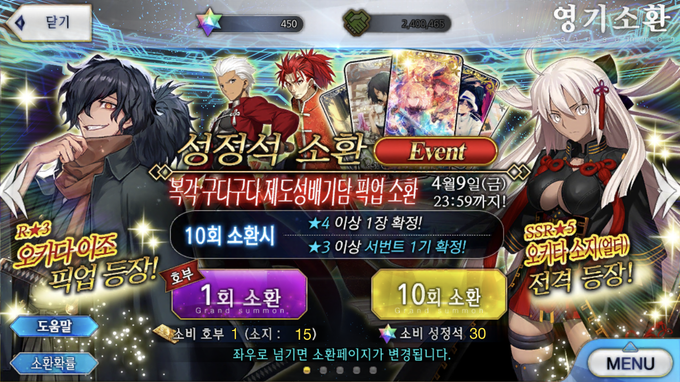 게임 <Fate/Grand Order>의 한국 서비스. 통칭 한그오의 신규 이벤트는 <구다구다 재도성배기담>의 복각 이벤트. 카마 뽑기에 돌 소모가 심각했던 만큼 돌을 아껴야 했지만, 한정 3성 서번트 오카타 이조의 픽업이 있어 이조의 보구 레벨을 올리기 위해 5개의 호부와 한 번의 10연차 소환을 하게 됩니다.