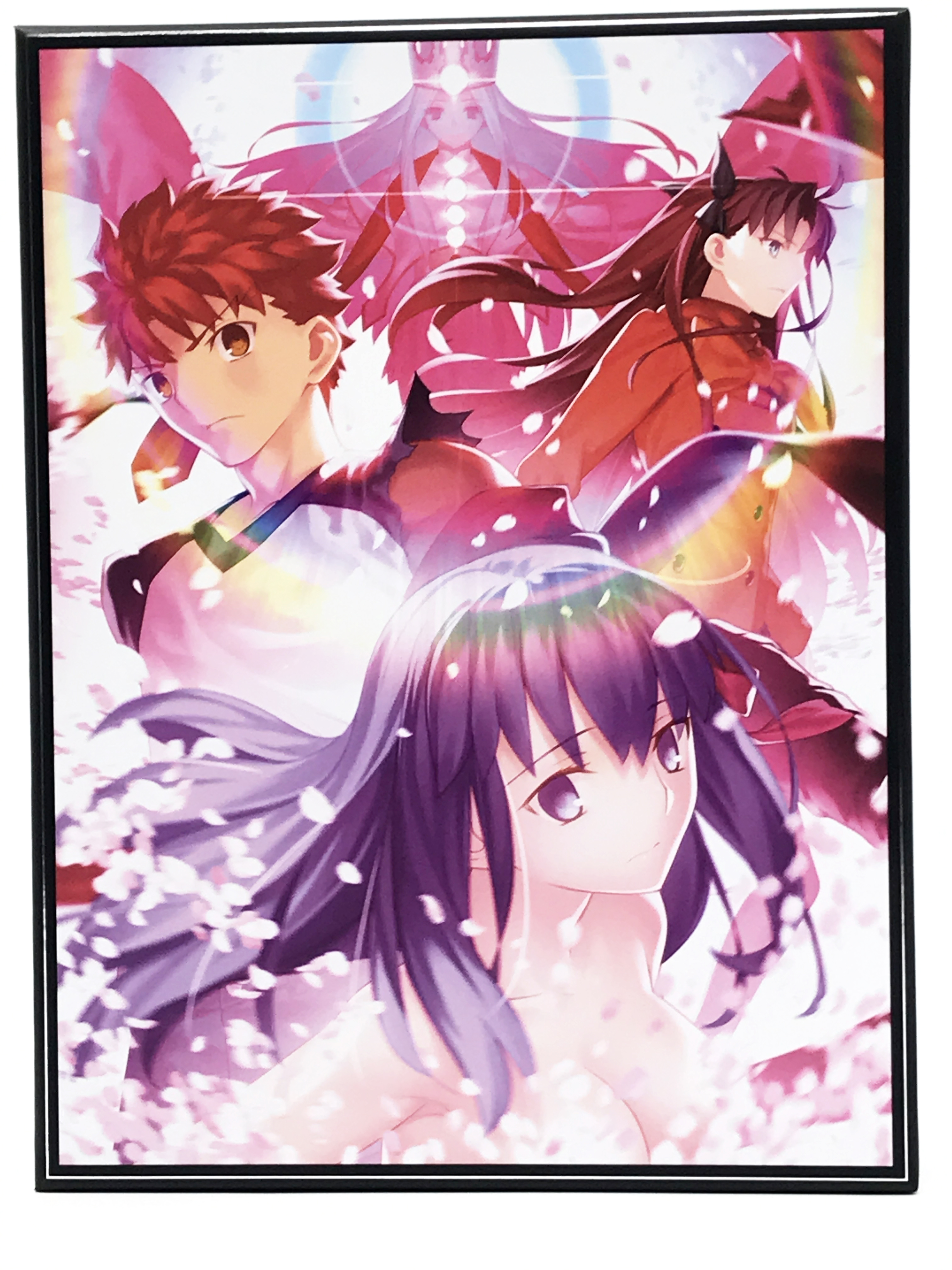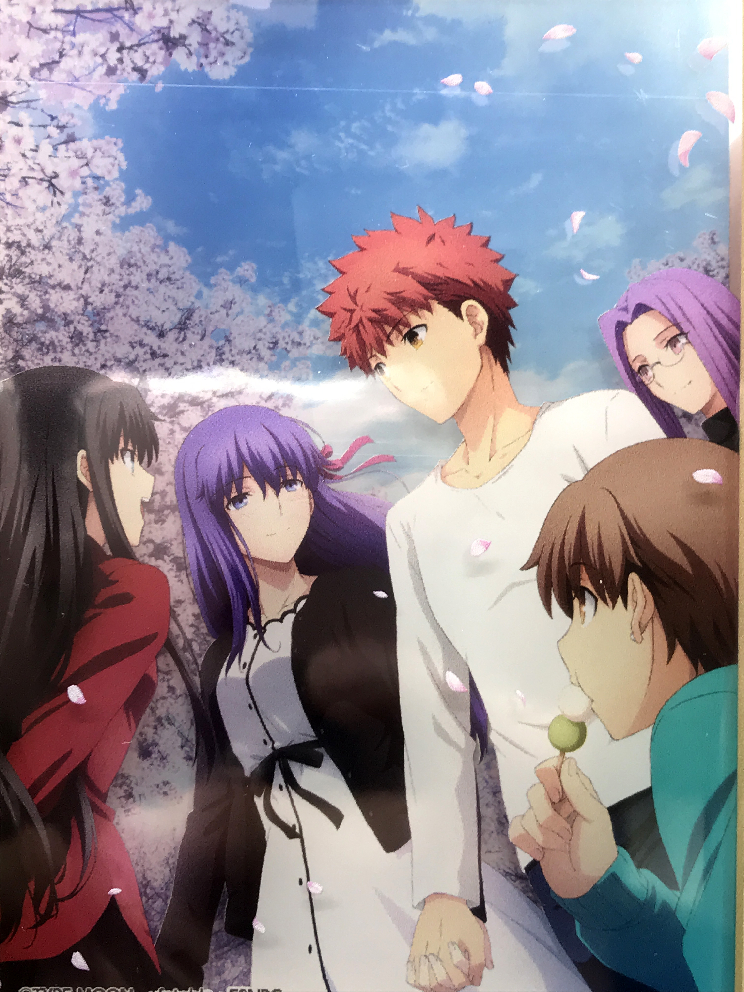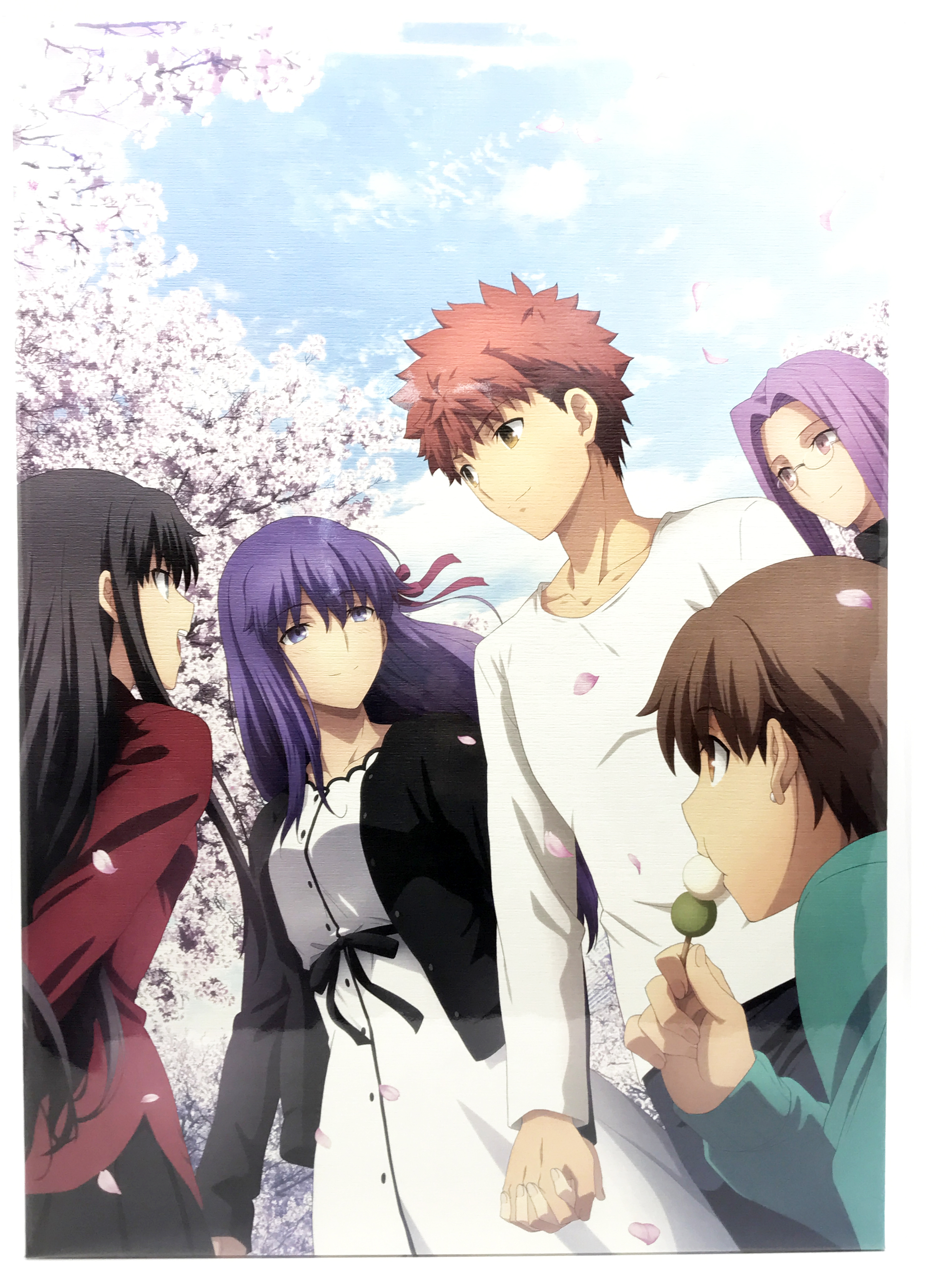 애니플렉스+에선 A3 사이즈 캔버스 카드를 증정합니다. 일러스트는 딱 엔딩 직후 시점을 그리는데 손을 잡지 않고 나아간 시로와 사쿠라가 이 장면에선 손을 잡고 있고 둘을 맞이해주는 린, 라이더, 타이가의 모습을 보여줍니다.