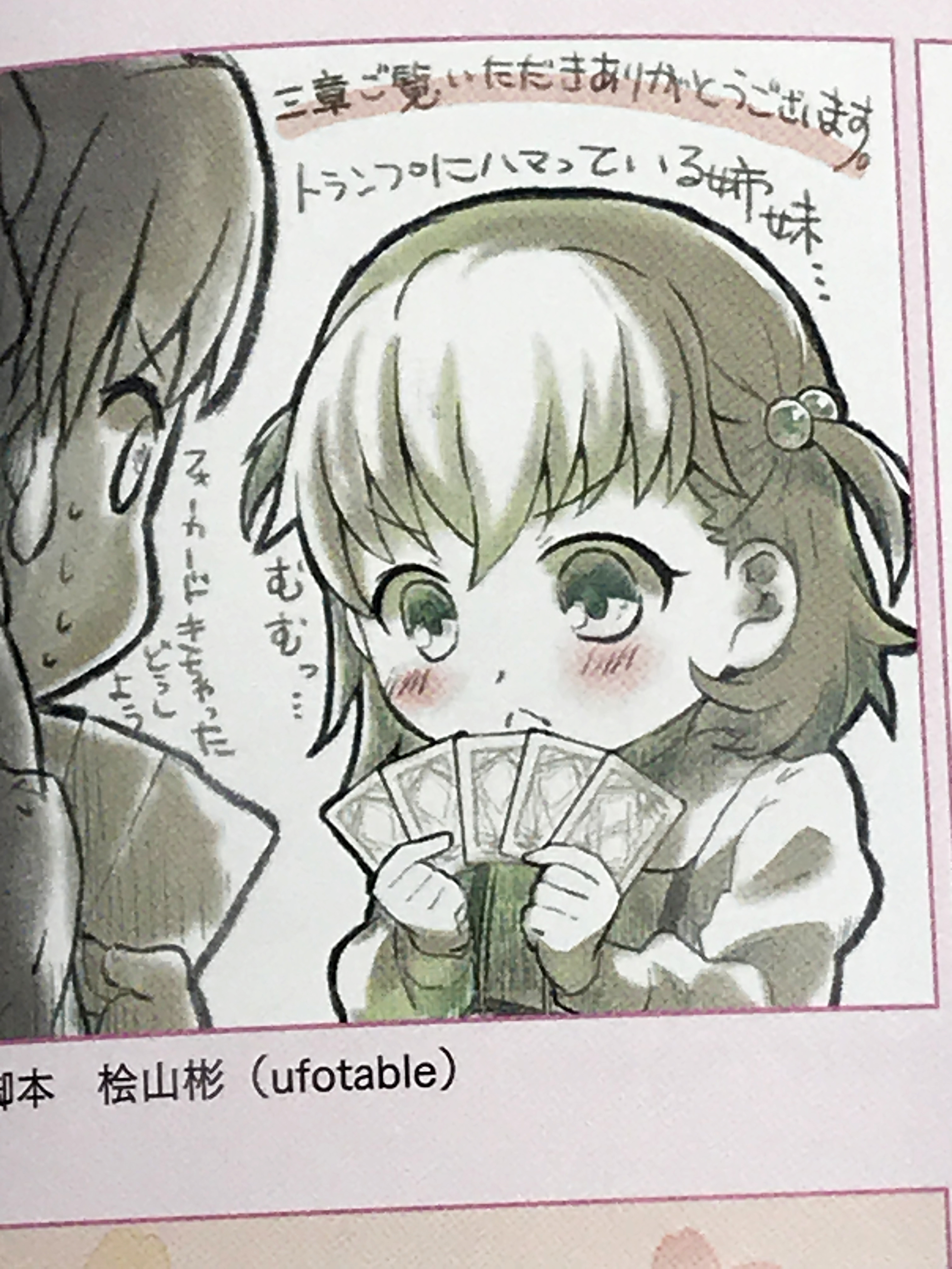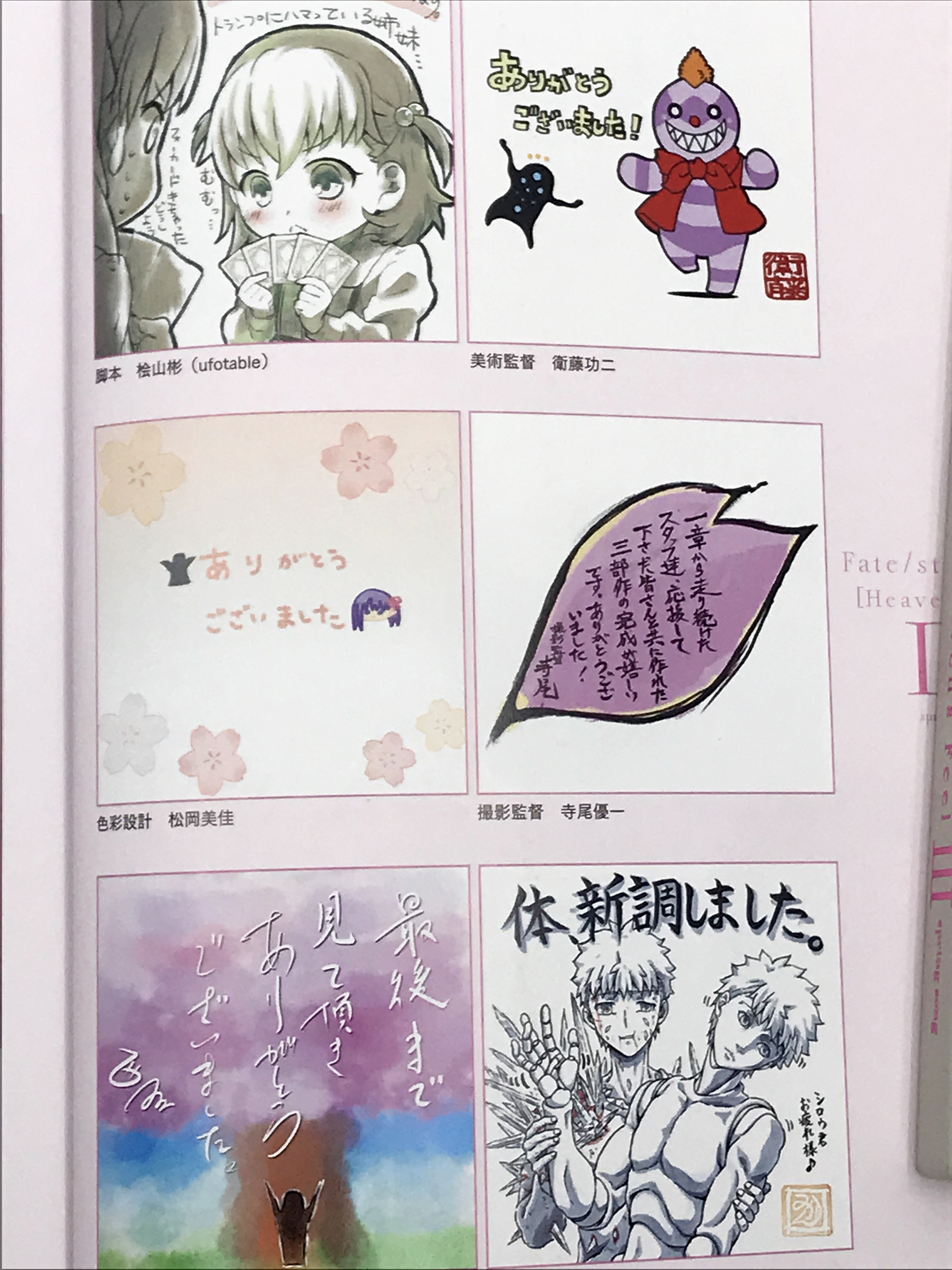 제일 인상 깊게 본 것은 본작의 각본가인 히야마 아키라(桧山彬)가 그린 토오사카 자매의 트럼프 일러스트와 작화 감독인 아키야마 코지(秋山幸児)가 그린 시로 인형…