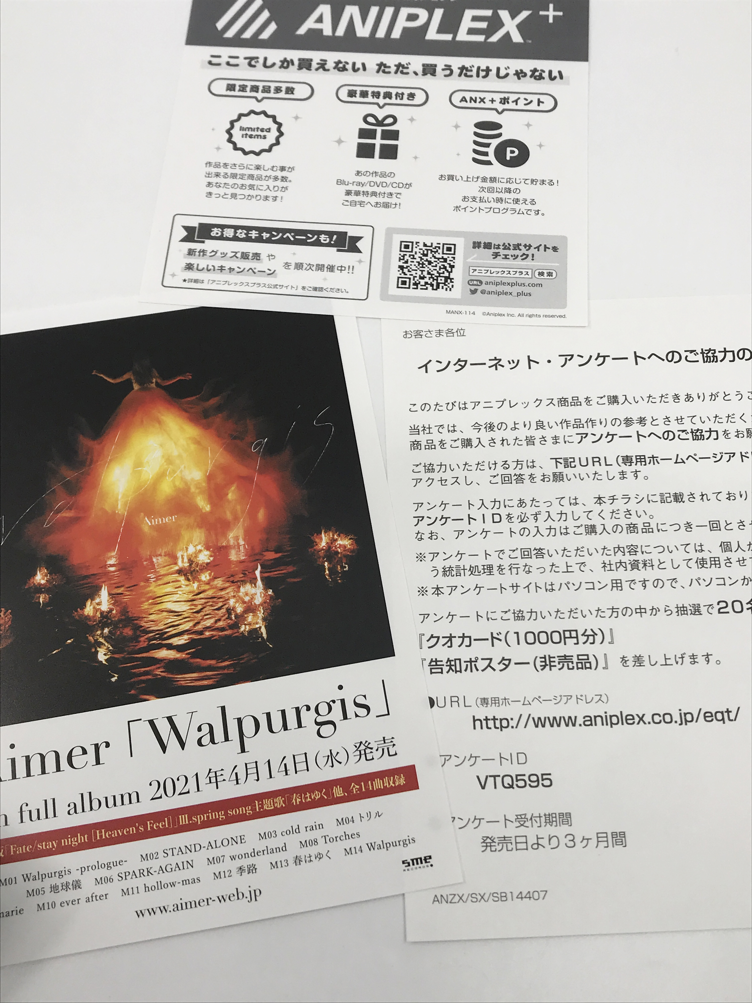 내부엔 홍보지가 있는데, 삽입곡을 부른 Aimer(에메)의 신 앨범 <Walpurgis>(발푸르기스)의 발매일일 제품을 개봉한 오늘인 2021년 4월 14일 수요일입니다. 우연치곤 기가막힌 타이밍이군요. 해당 앨범엔 <스프링 송>의 삽입곡인 <春はゆく> 역시 수록된 앨범입니다.
