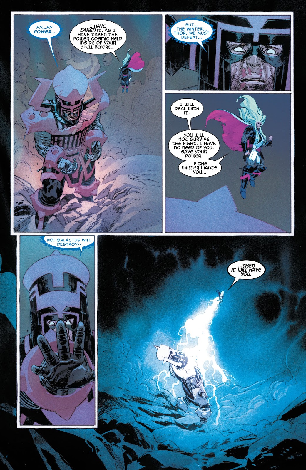 허나, 갤럭투스는 시간이 없다며 마지막 행성은 생명체가 있는 상태 그대로 먹어버린다. 이에 토르는 눈물을 흘린다. 그래도 갤럭투스는 검은 겨울을 직접 보면 죽음의 운명이 보인다며 토르의 눈을 안대로 가려라고 말하는 등 챙겨준다.