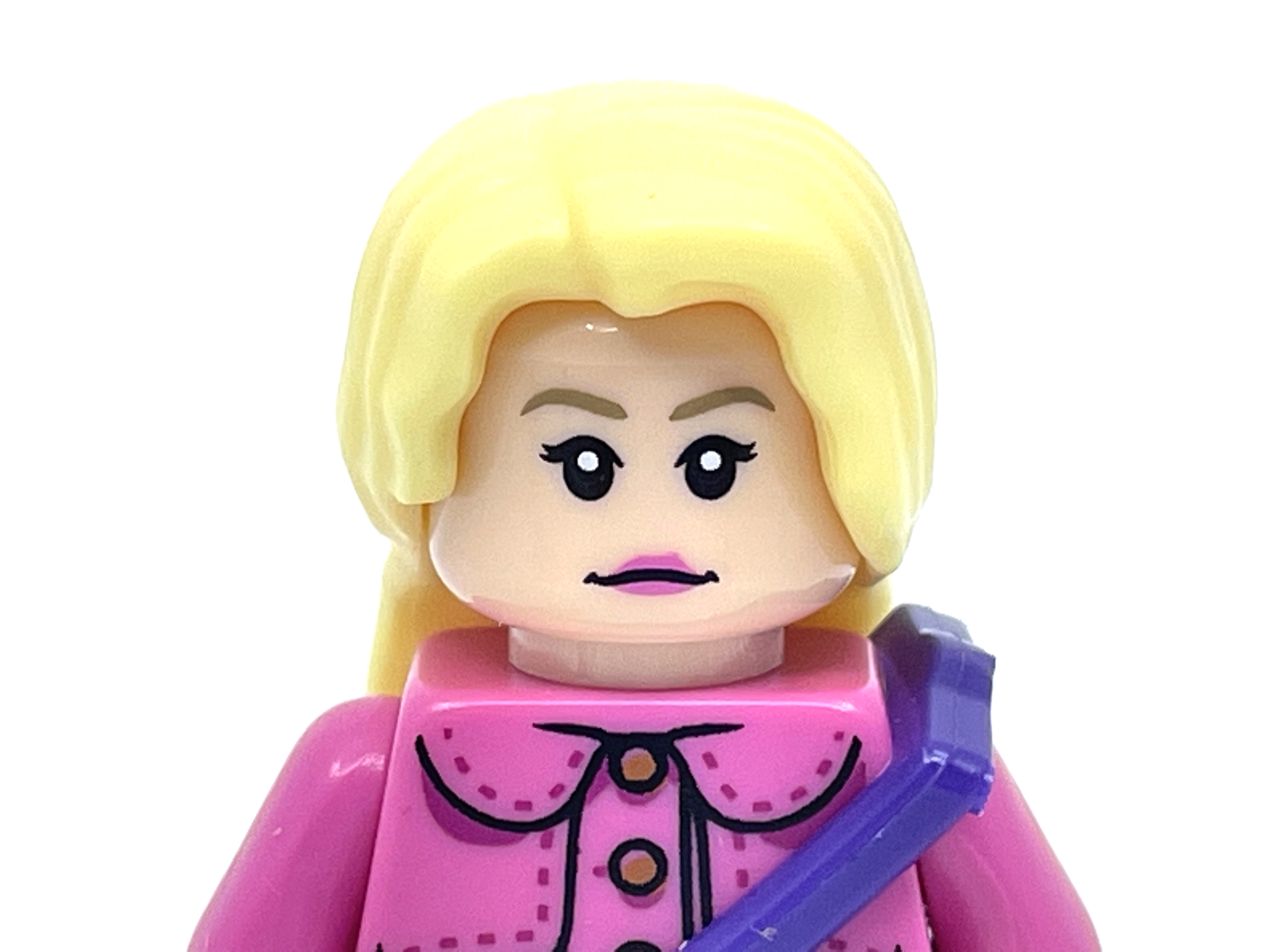 미니피겨 표정. 분홍 립스틱이 들어갔고 반대쪽 얼굴은 3D 안경 스펙터스펙스 Spectrespecs을 착용한 모습입니다.