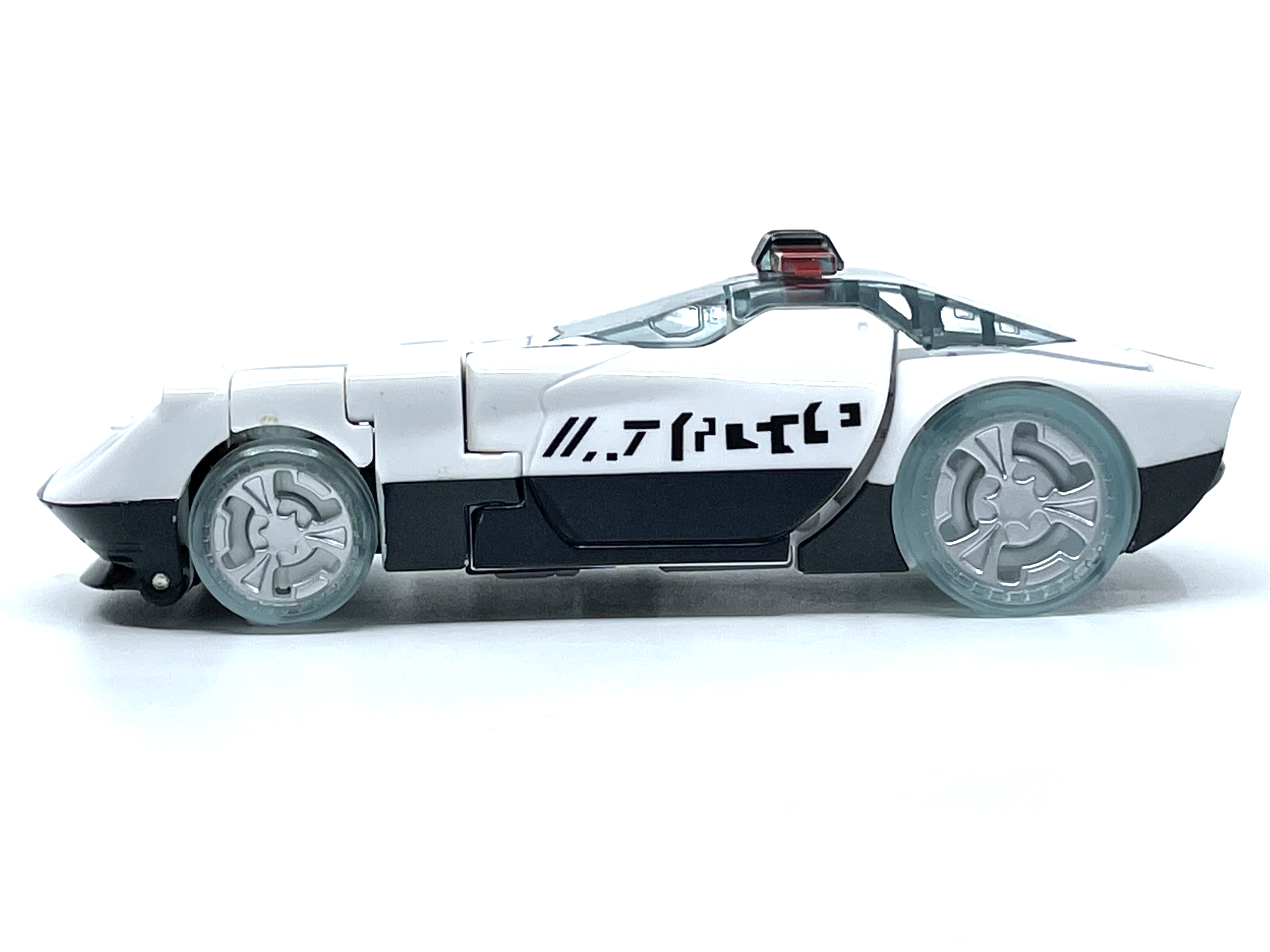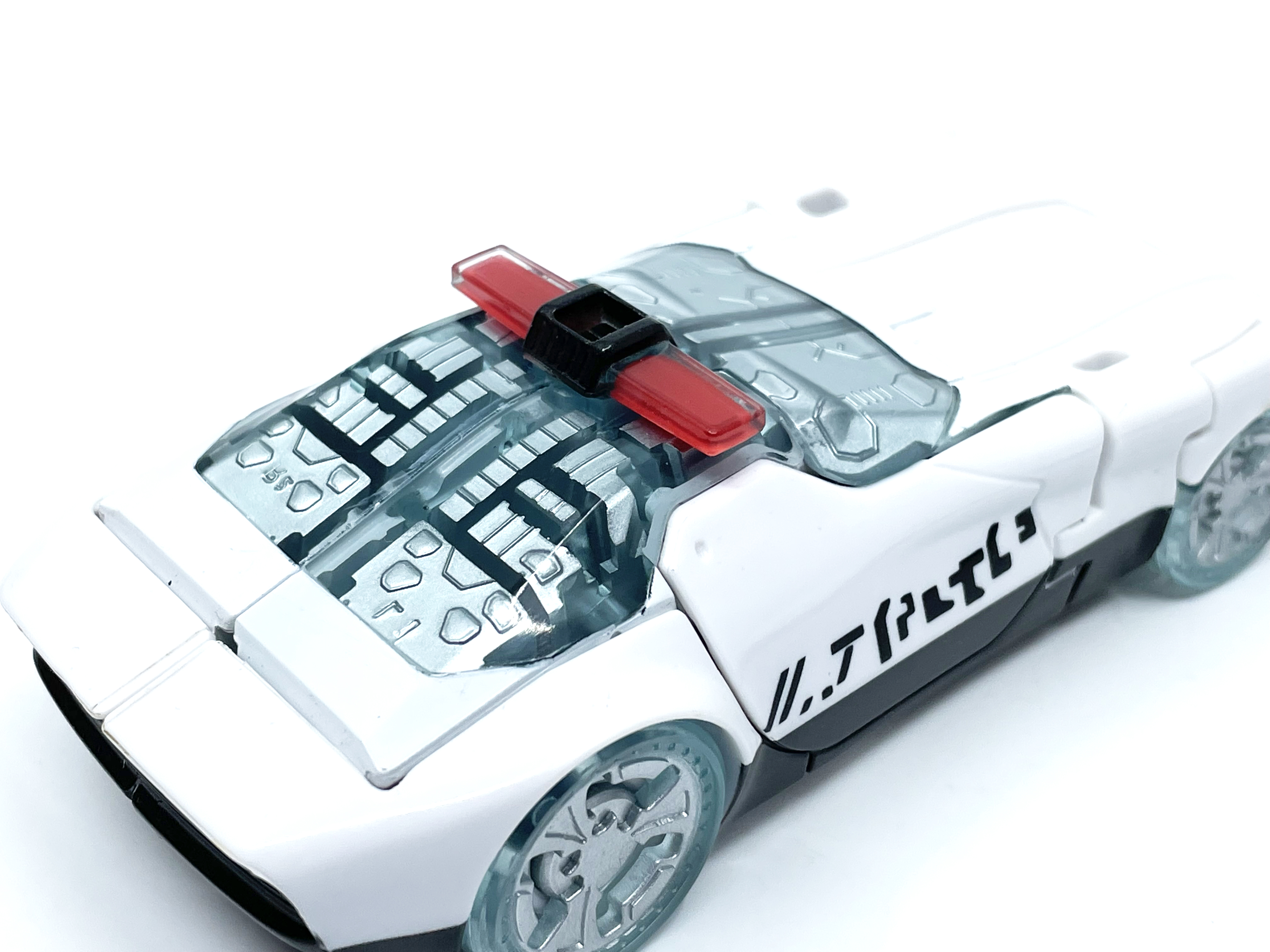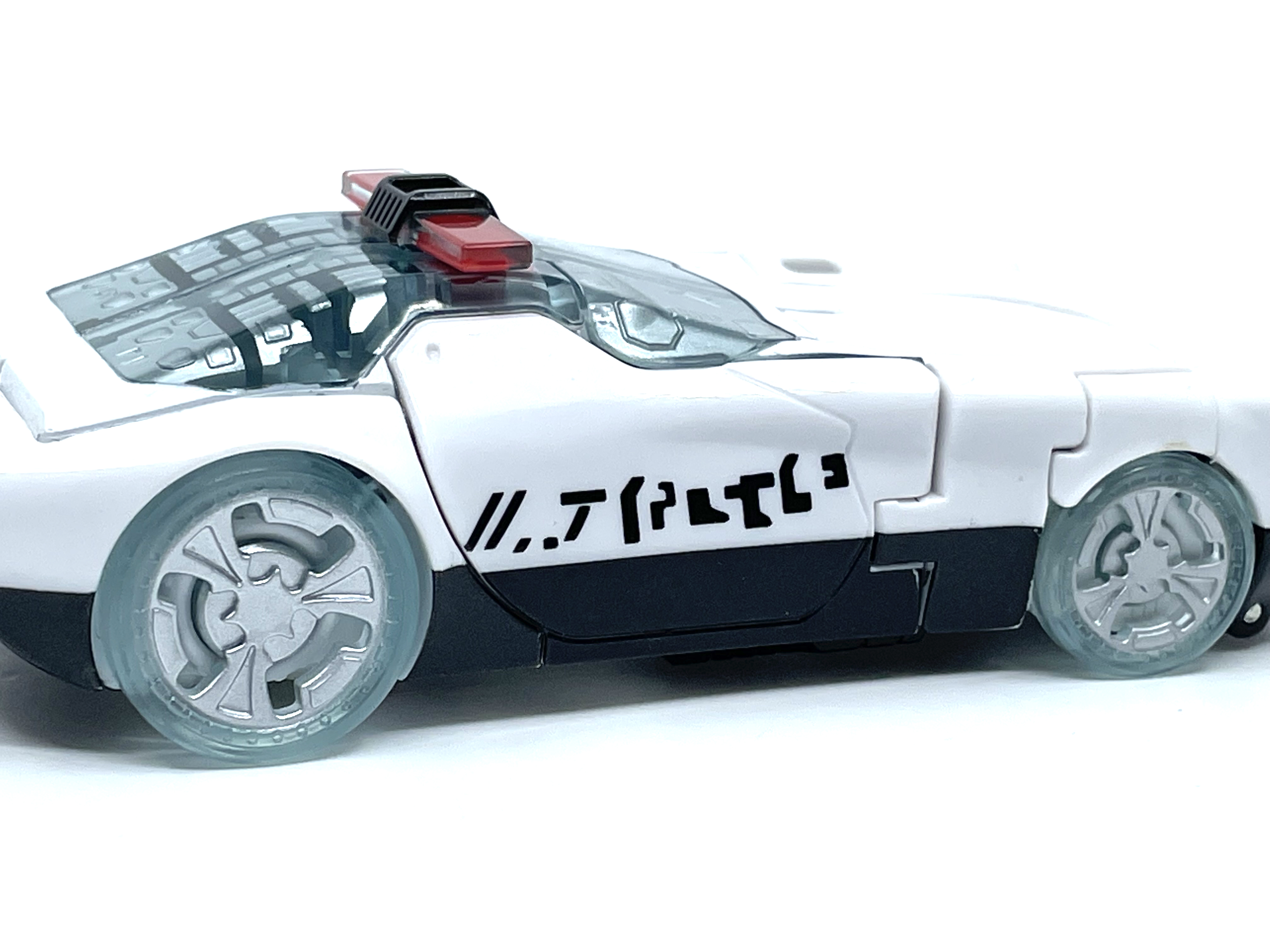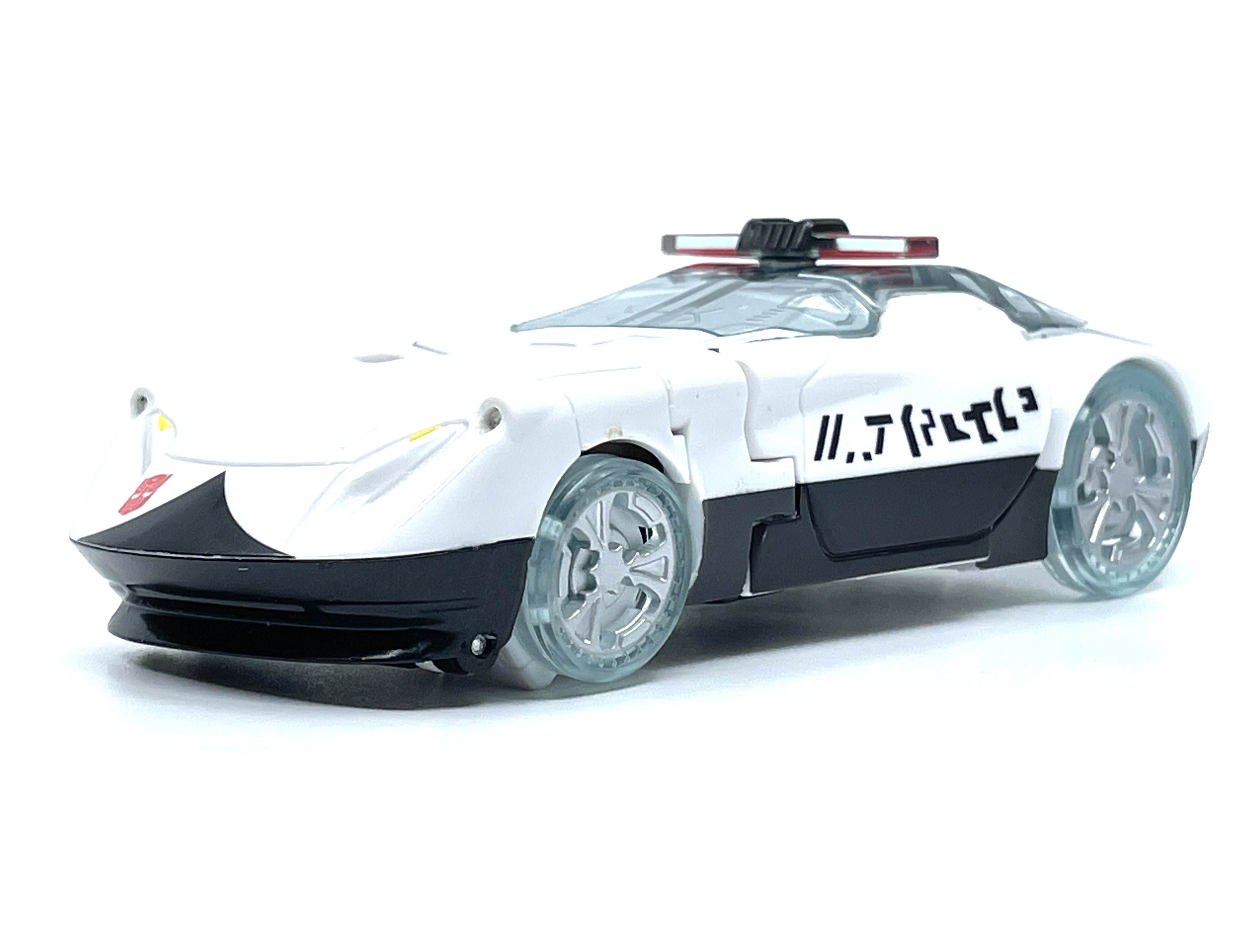 측면에 그려진 문자는 사이버트론어입니다. 프라울에 그려진 문구는 Police 라는 뜻.