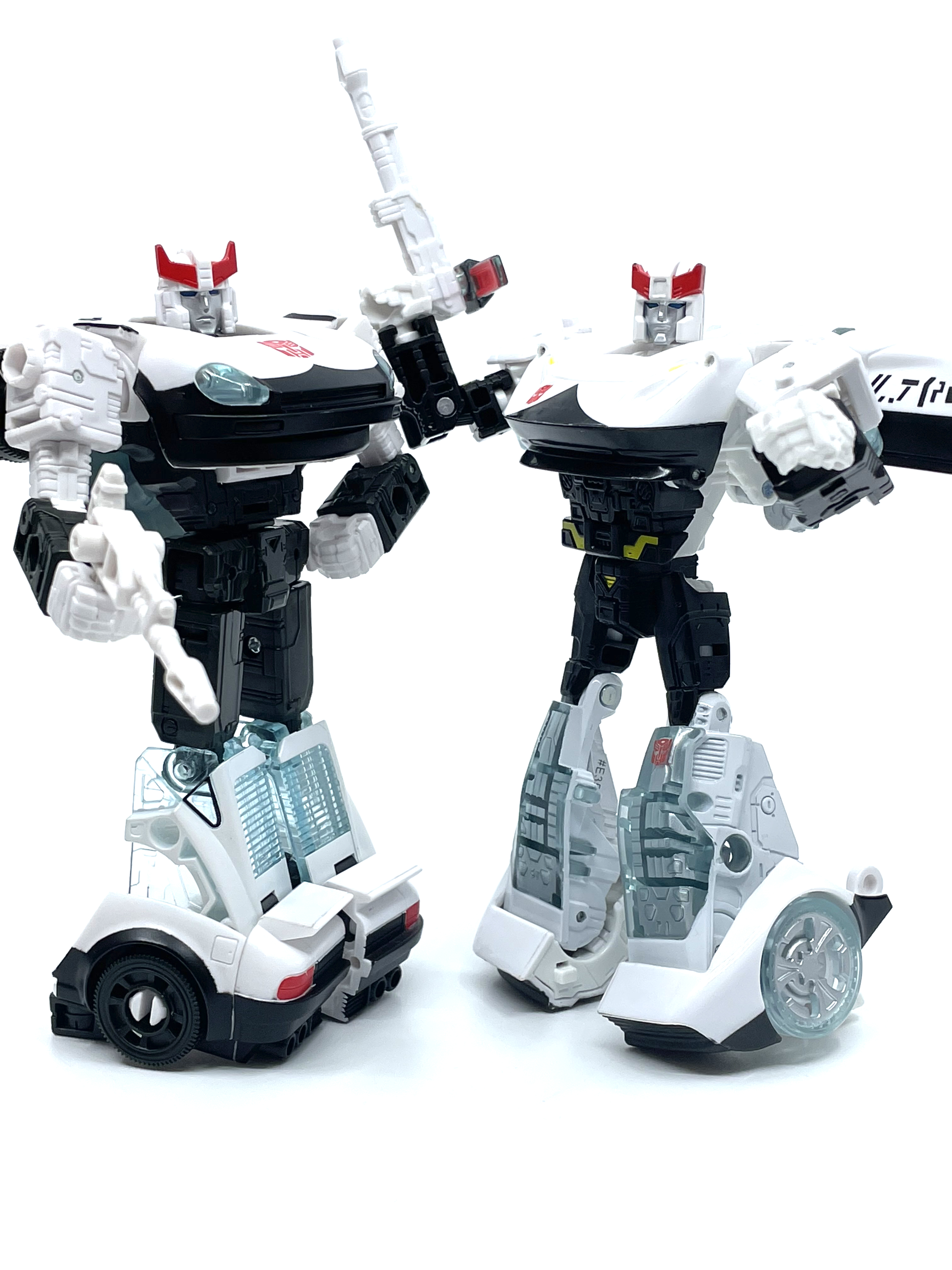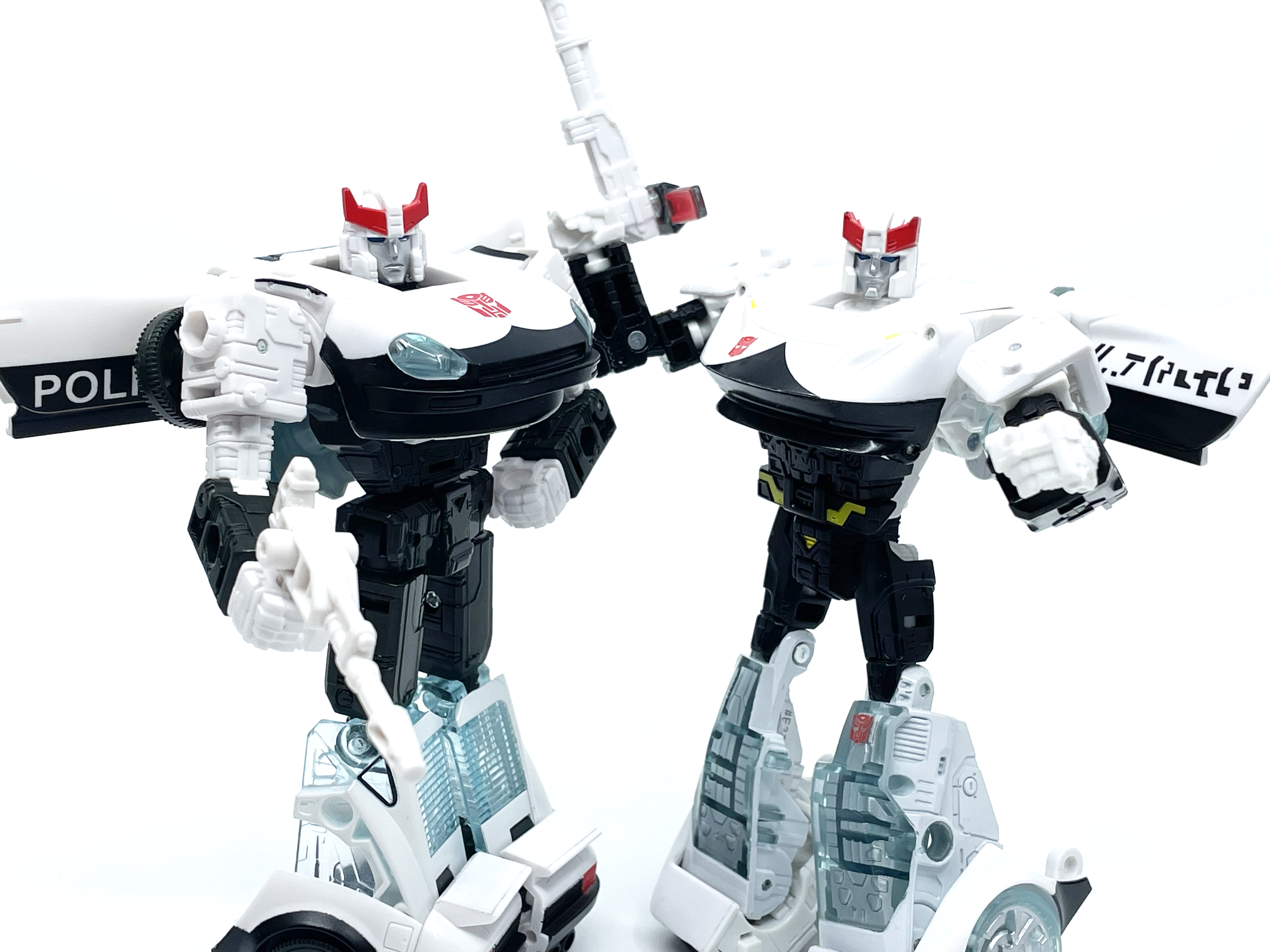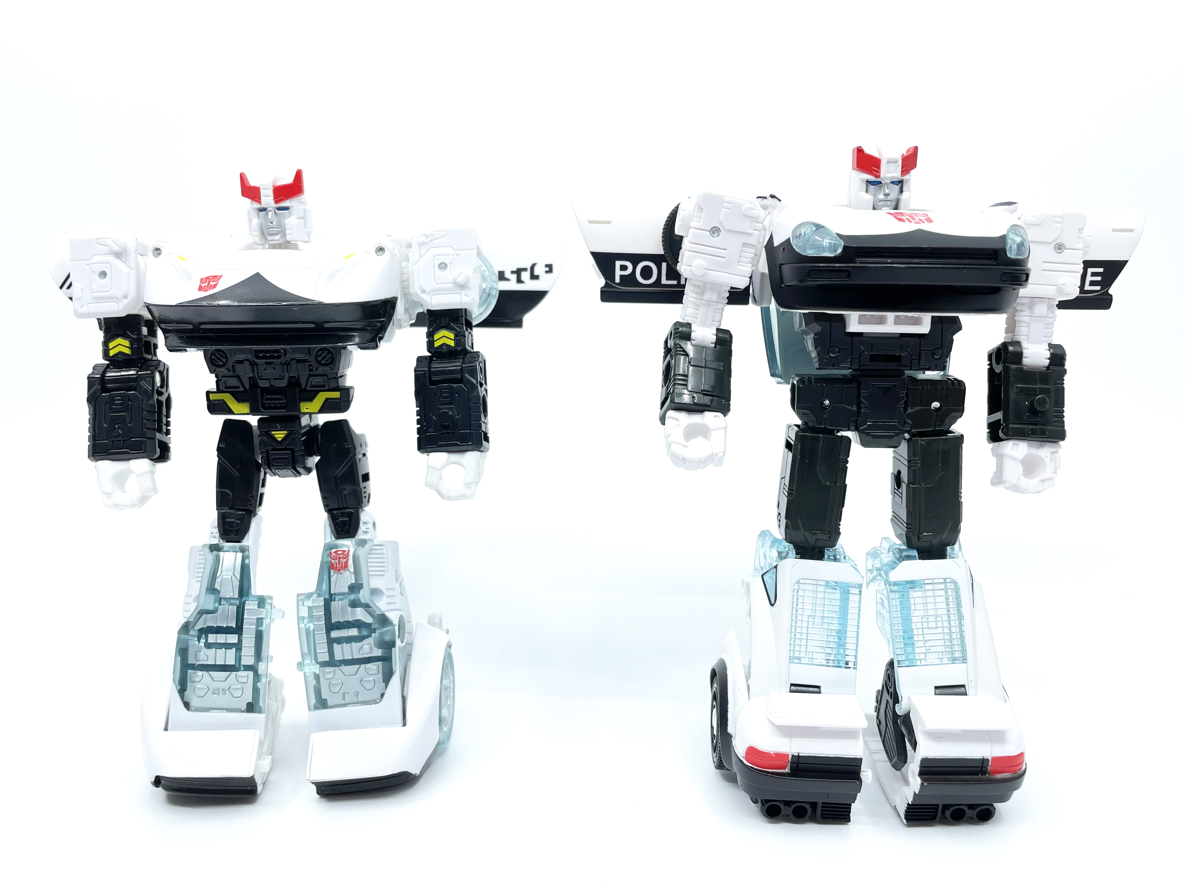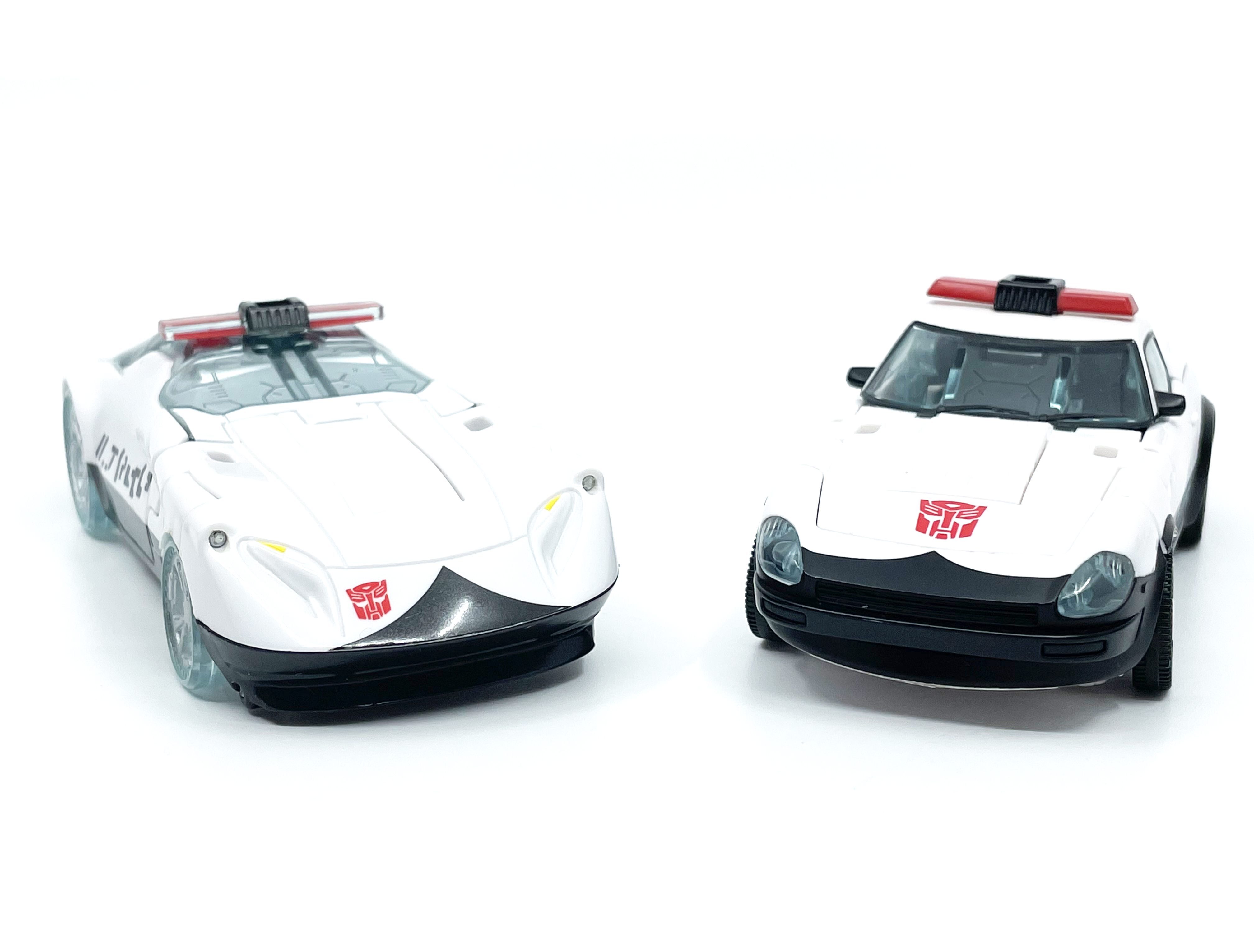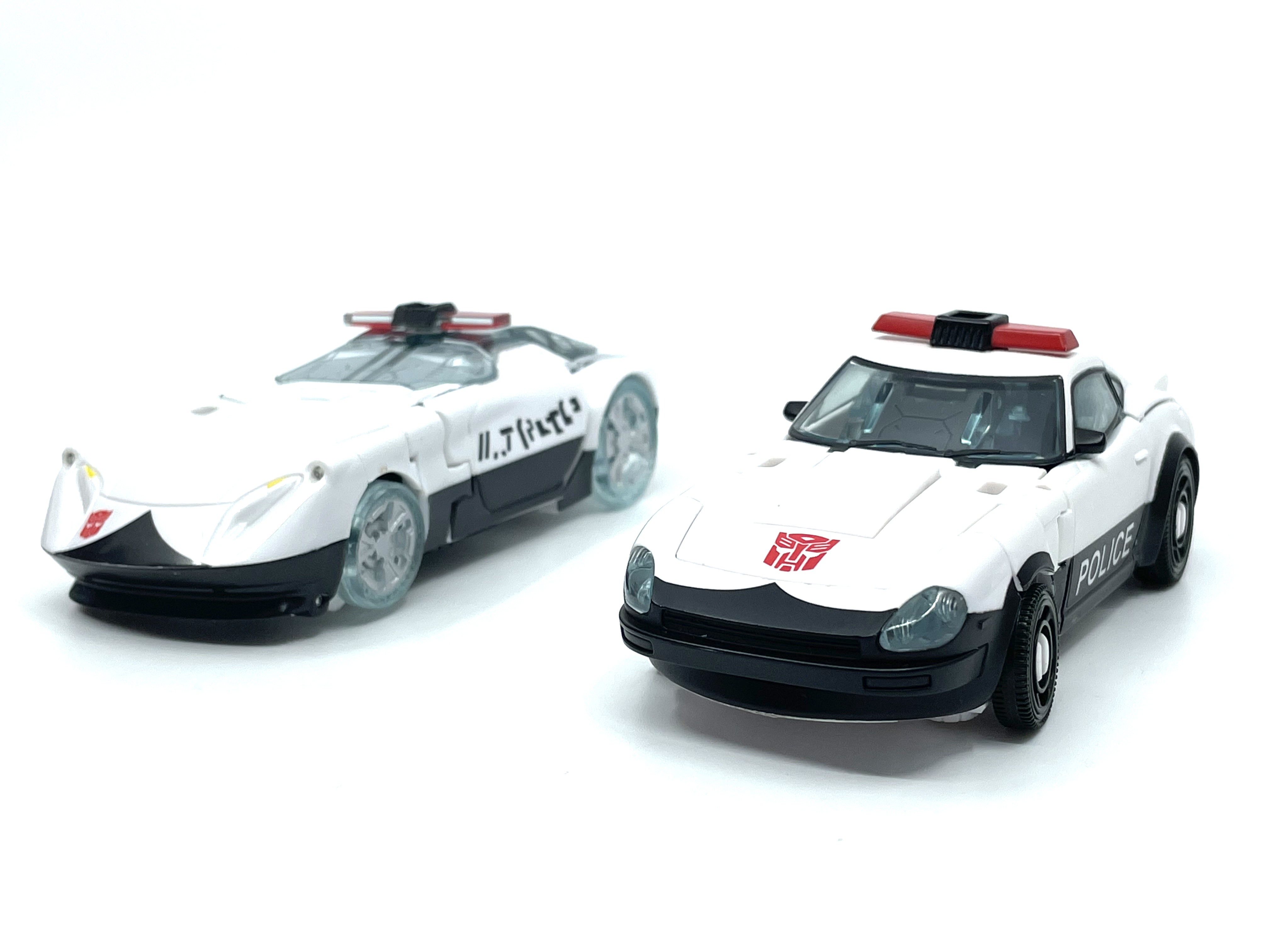 측면 비교. 양 차량 모두 좌우측에 사이버트론어와 영어로 Police라고 적힌 것이 특징.