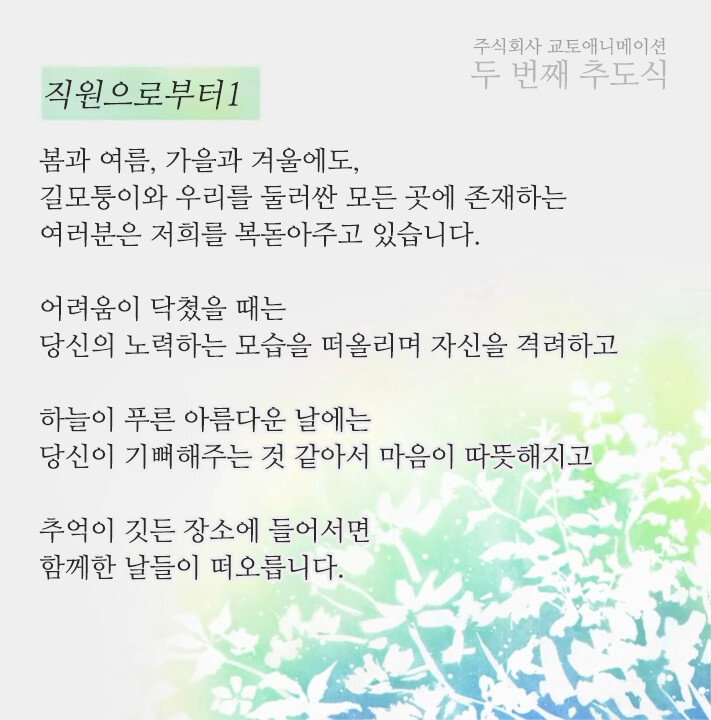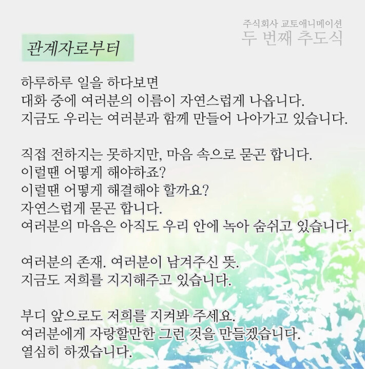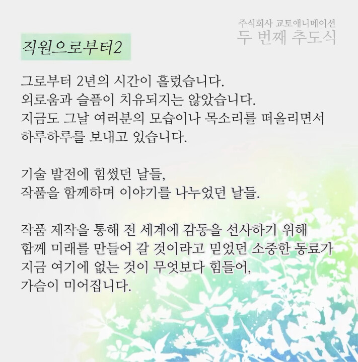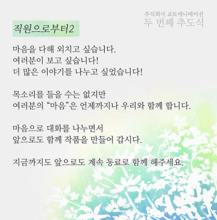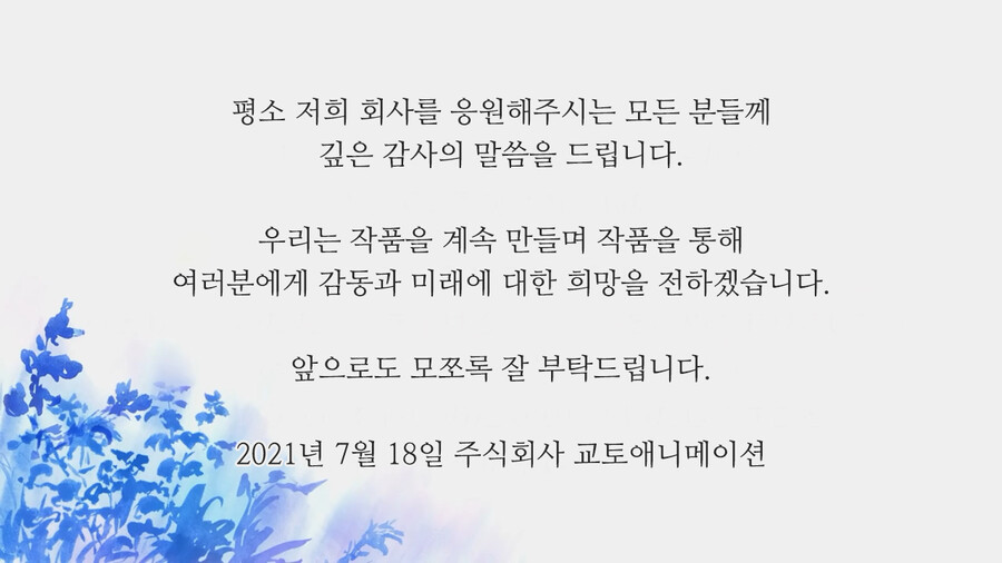 그런 안타까운 사건이 일어난지 벌써 2년이 흘렀습니다. 교토 애니메이션은 상처를 딛고 일어서며 2020년엔 <극장판 바이올렛 에버가든>을 2021년 3분기에는 <코바야시네 메이드래곤 S>를 제작했습니다. 여러 작품에 참여했던 스텝들이 그린 작품을 다시는 볼 수 없게 됐지만, 교토 애니메이션은 그들의 유지를 잇고 애니메이션 제작에 힘쓰고 있습니다.