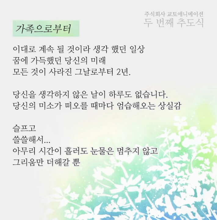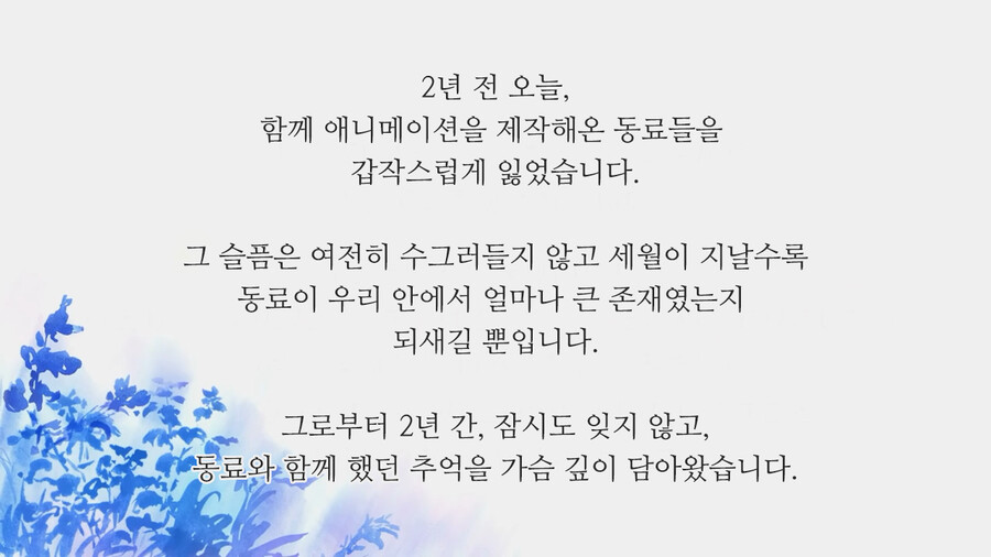 2년 전, 2019년 7월 18일에 믿을 수 없던 사건이 발생했습니다. 교토 애니메이션 제 1 스튜디오에 방화사건이 일어나 미처 대피하지 못한 애니메이션 제작 스텝들 대다수가 사망하는 안타까운 일이 있었습니다. 2년 전, 뉴스를 보다 우연히 발견한 이 모습은 차마 말을 할 수 없을 정도로 심각한 상황이었습니다.