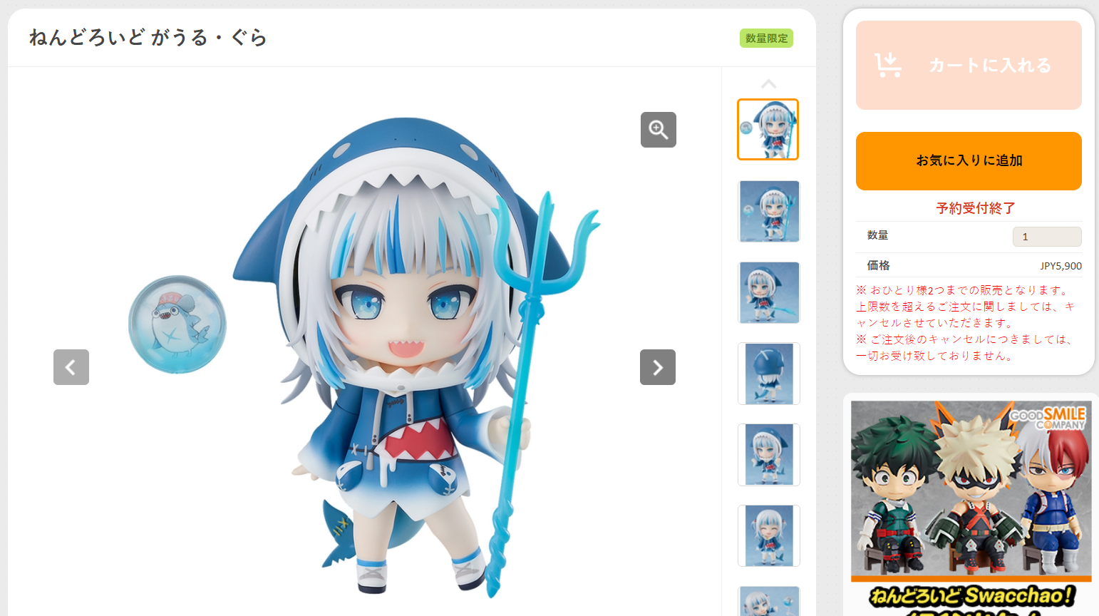전세계적으로 인기가 많은 캐릭터라 그런지 하루가 안 돼서 예약을 할 수 없는 수준으로 치솓았습니다. 1인당 예약을 2개로 한정 지었음에도 불구하고 아마존 재팬에선 3배 프리미엄이 붙었고 굿스마일 공식 온라인샵에서도 예약 상한을 도달해서 예약을 받을 수 없는 지경입니다. 인기가 많으니 이와 같은 상황을 짐작하긴 했지만 상상을 초월했다고 할까……