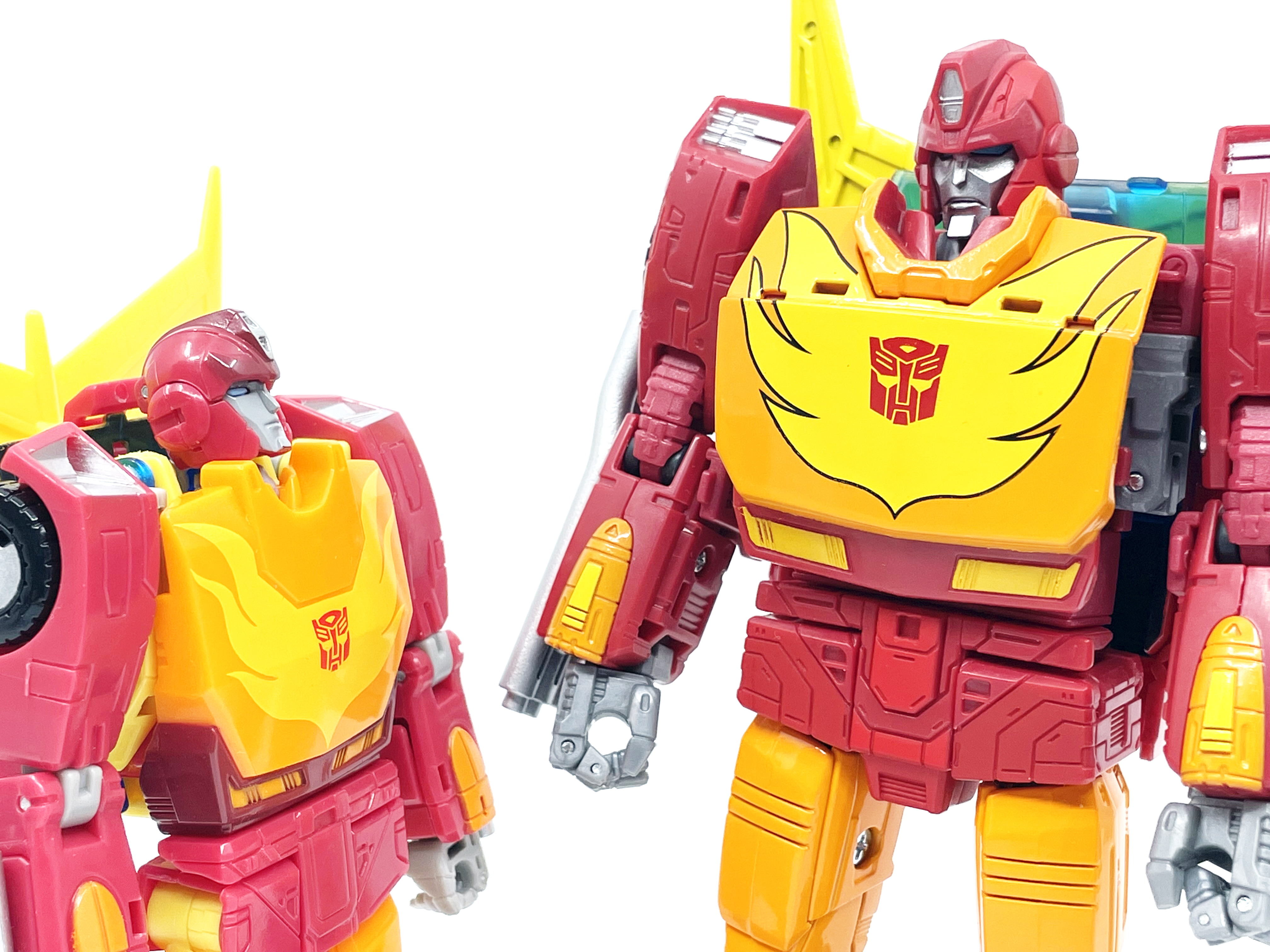 흔히 로디머스 프라임의 애니메이션 모습이라 하면 시즌 3에 자주 나온 왼쪽 디자인을 먼저 떠올리실 겁니다. 하지만, 실제 로디머스 프라임의 최종 디자인은 핫 로드의 디자인을 그대로 사용하고 얼굴만 바꾼 디자인을 사용합니다.