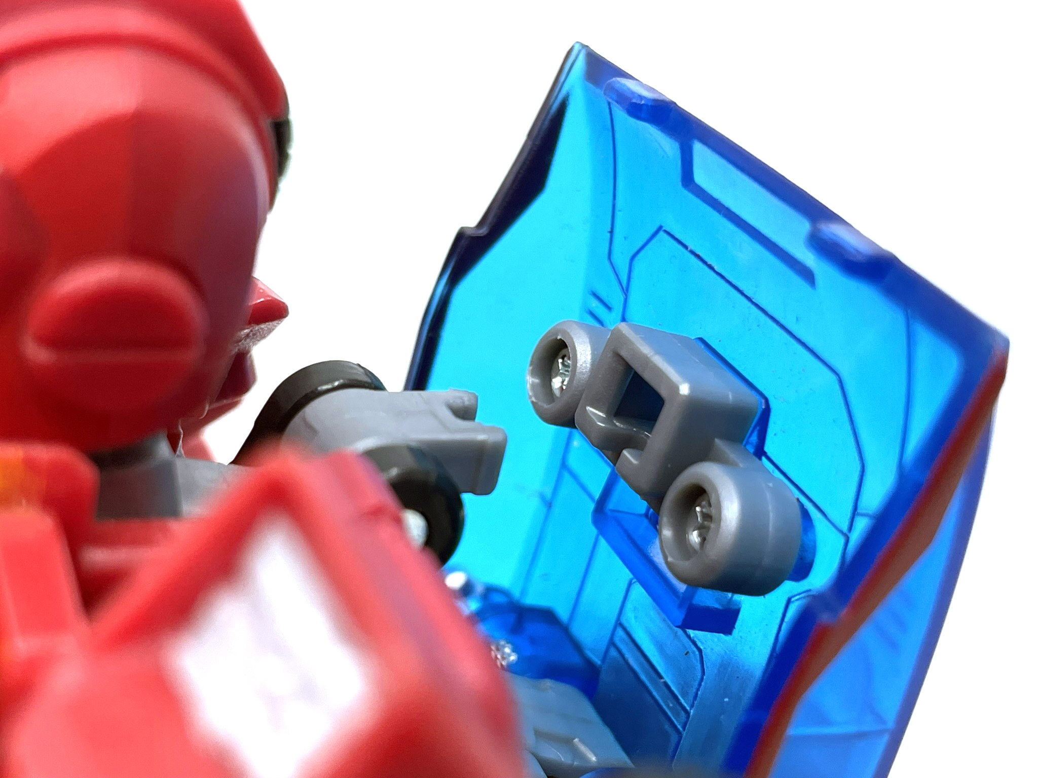 뼈대에 로디머스의 몸체를 숙여 결합시킨 뒤, 클리어 부품에 달린 결합부에 연결시켜줍니다. 스포일러 역시 구멍을 통해 결합시킵니다.