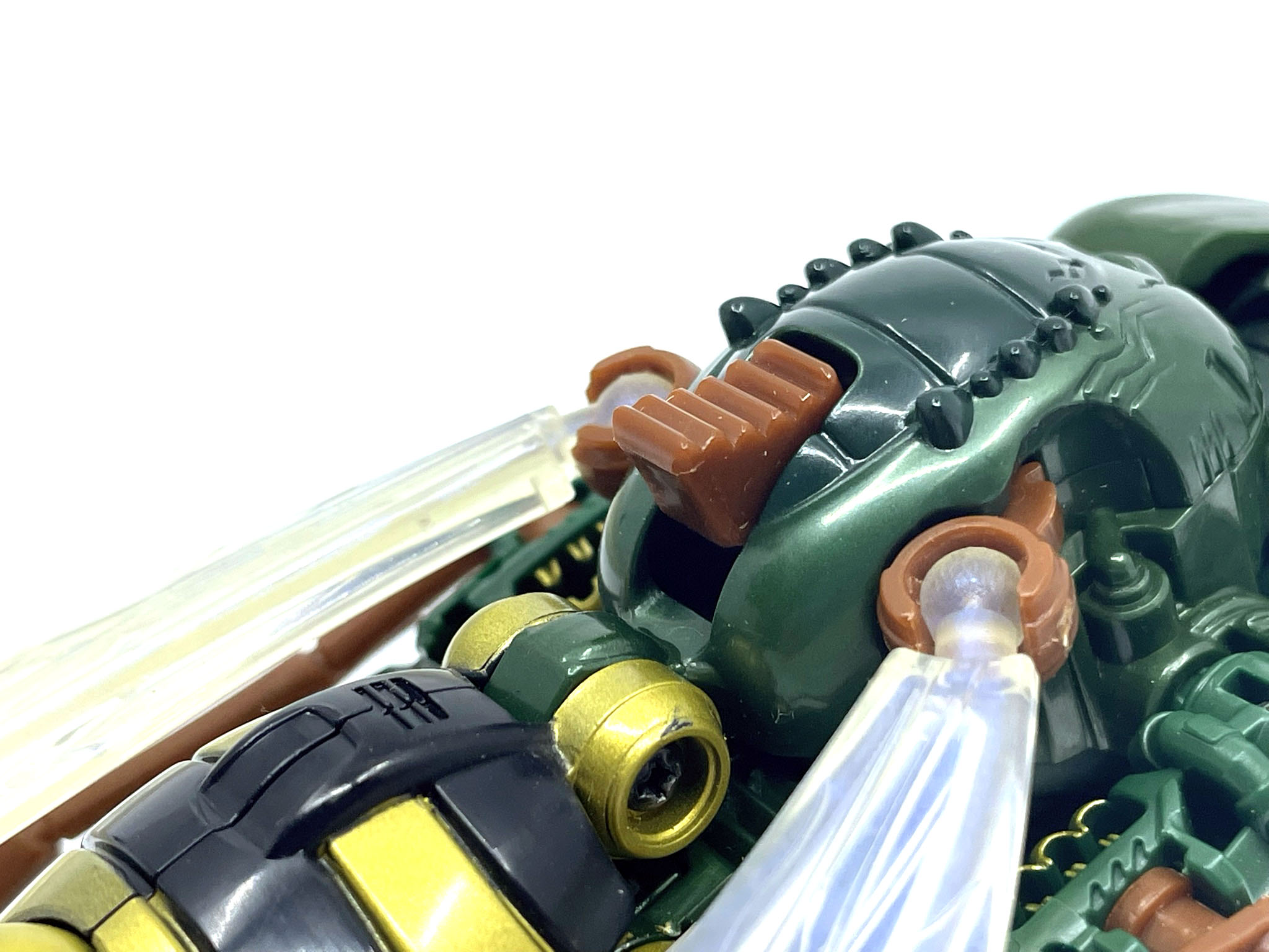측면에 달린 프레데콘 마크 고증까지 잘 재현됐습니다. 투광 기믹 때문에 뒤통수가 반투명 재질이지만 엄청 신경 썼지요.