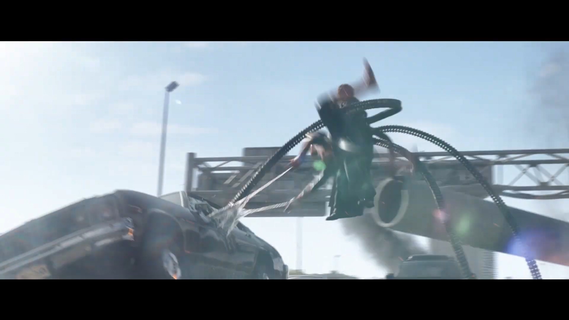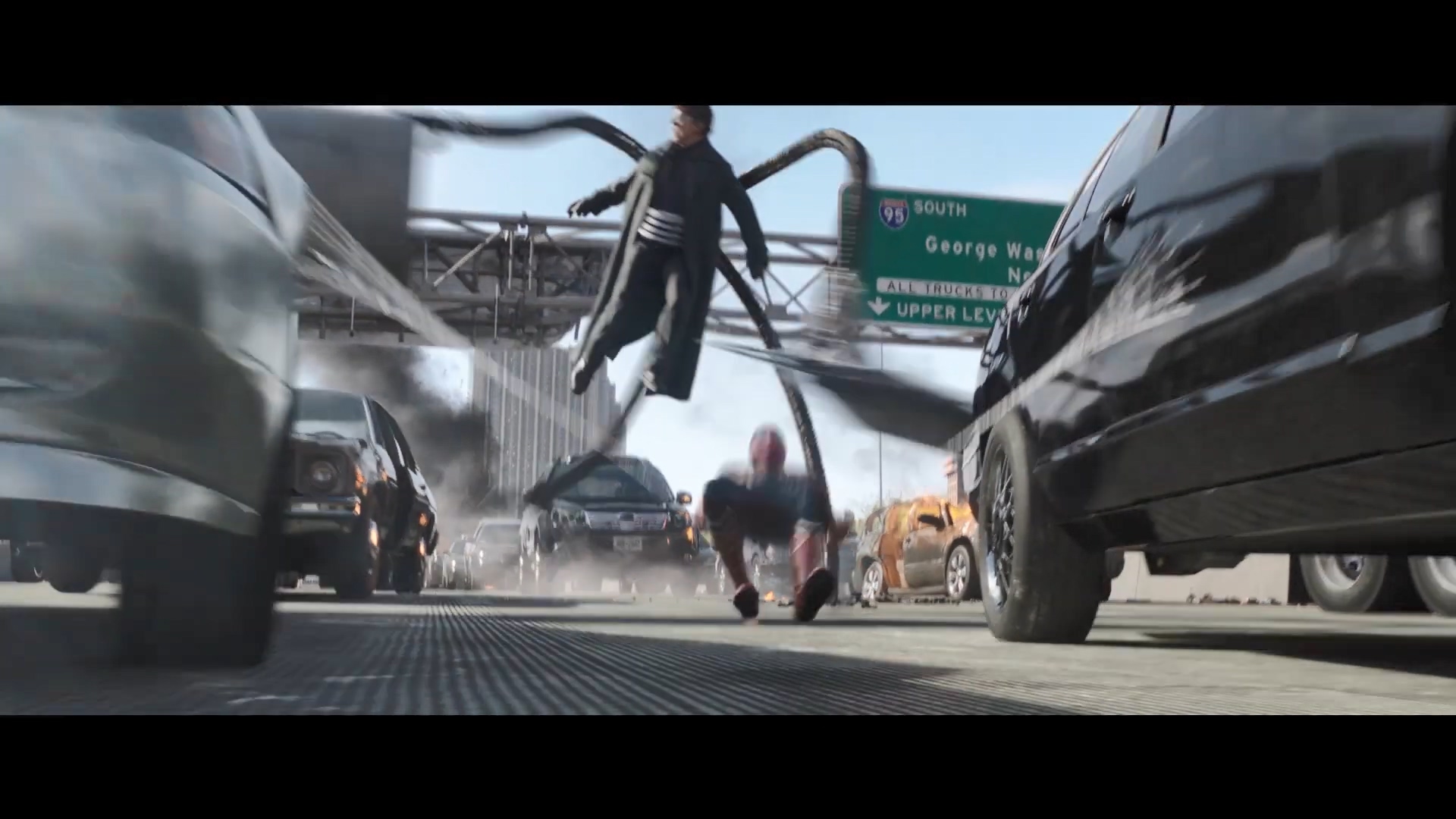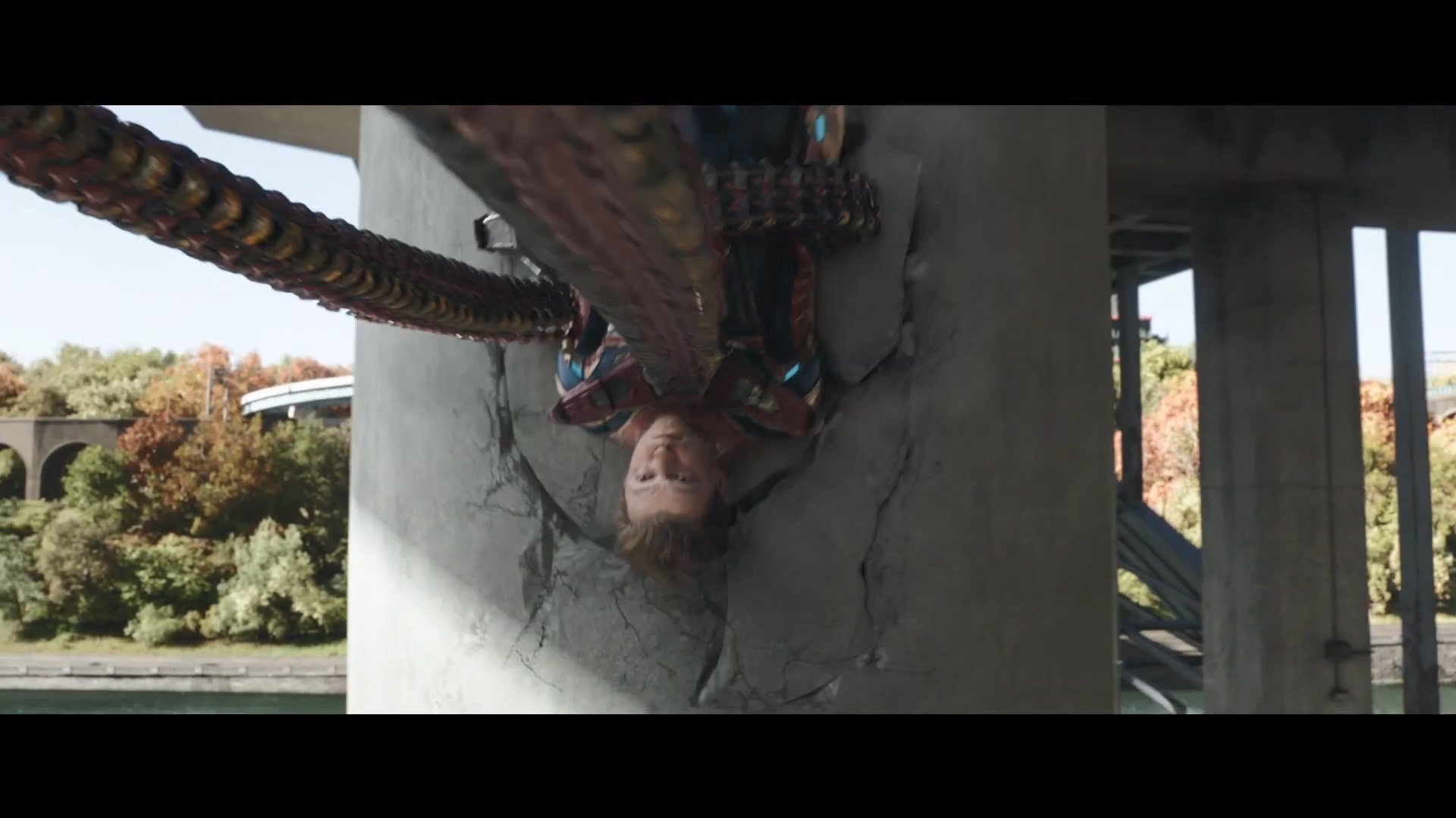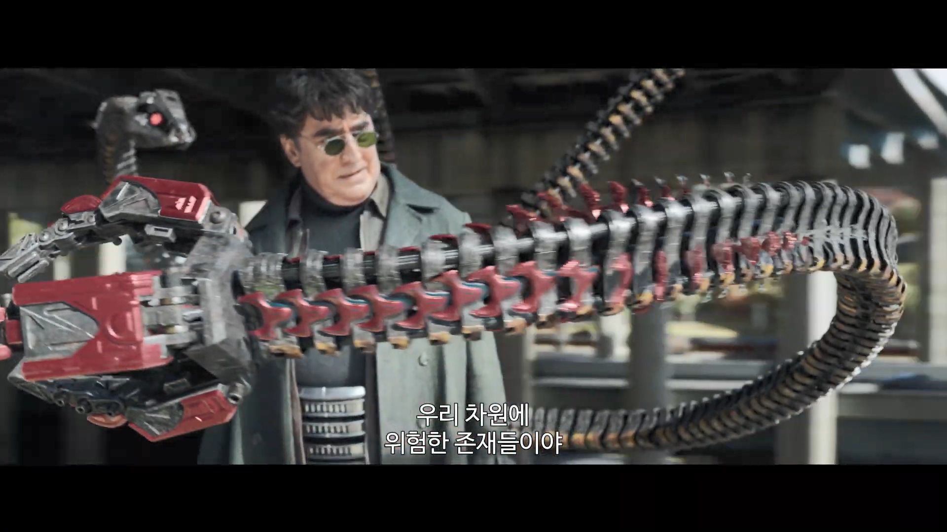 헌데, 이 장면을 유심히 보면 옥토퍼스와 피터가 있는 장소의 배경이 너무나도 다릅니다. 교차 편집 가능성이 커요.