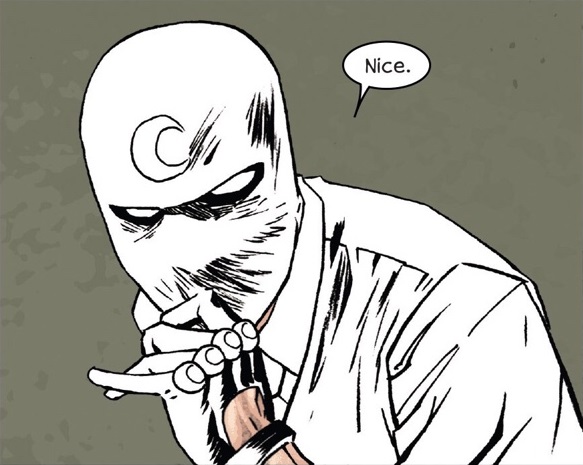 흰 가면에 흰 정장을 입은 모습에 의아할 수 있는데, 이 모습은 문 나이트가 활동하는 방식 중 하나인 미스터 나이트로 불리는 일종의 배리에이션이라고 볼 수 있습니다. 문 나이트는 자경단을, 미스터 나이트는 경찰과 협력하는 탐정의 모습으로 활동하는 것으로 문 나이트가 DC 코믹스의 배트맨을 모티브했다는 걸 보여주는 장치 중 하나기도 합니다.