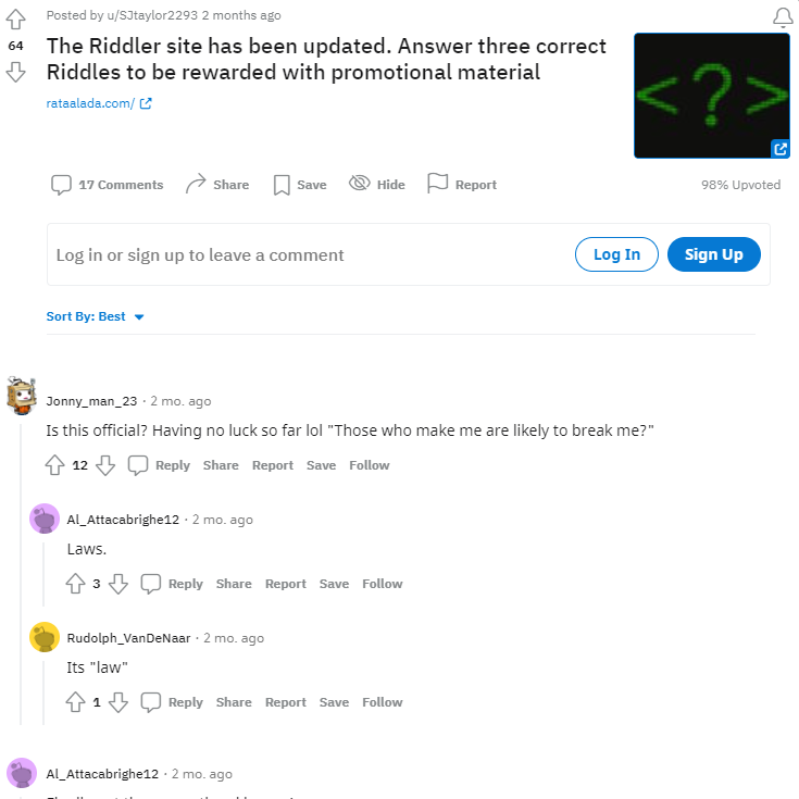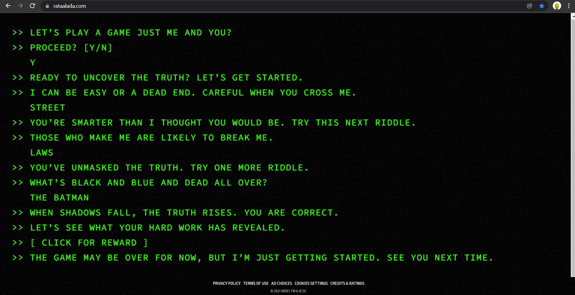 사이트 접속하시면 영화를 보고 나서 사이트를 방문한 관객에게 리들러가 질문을 합니다. 더 보고 싶냐는 질문에 Y를 누르면 수수께끼를. N을 누르면 답하지 않습니다.