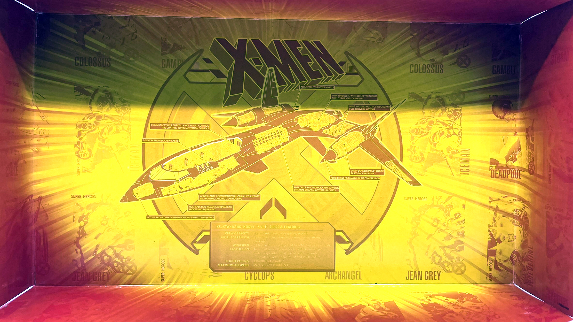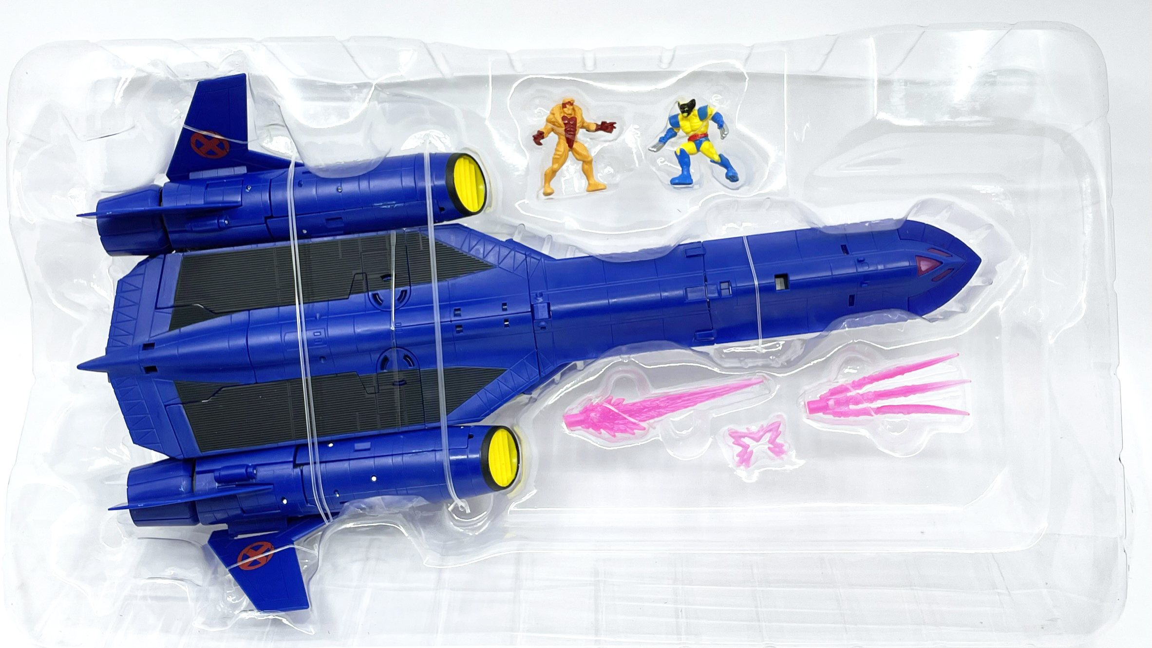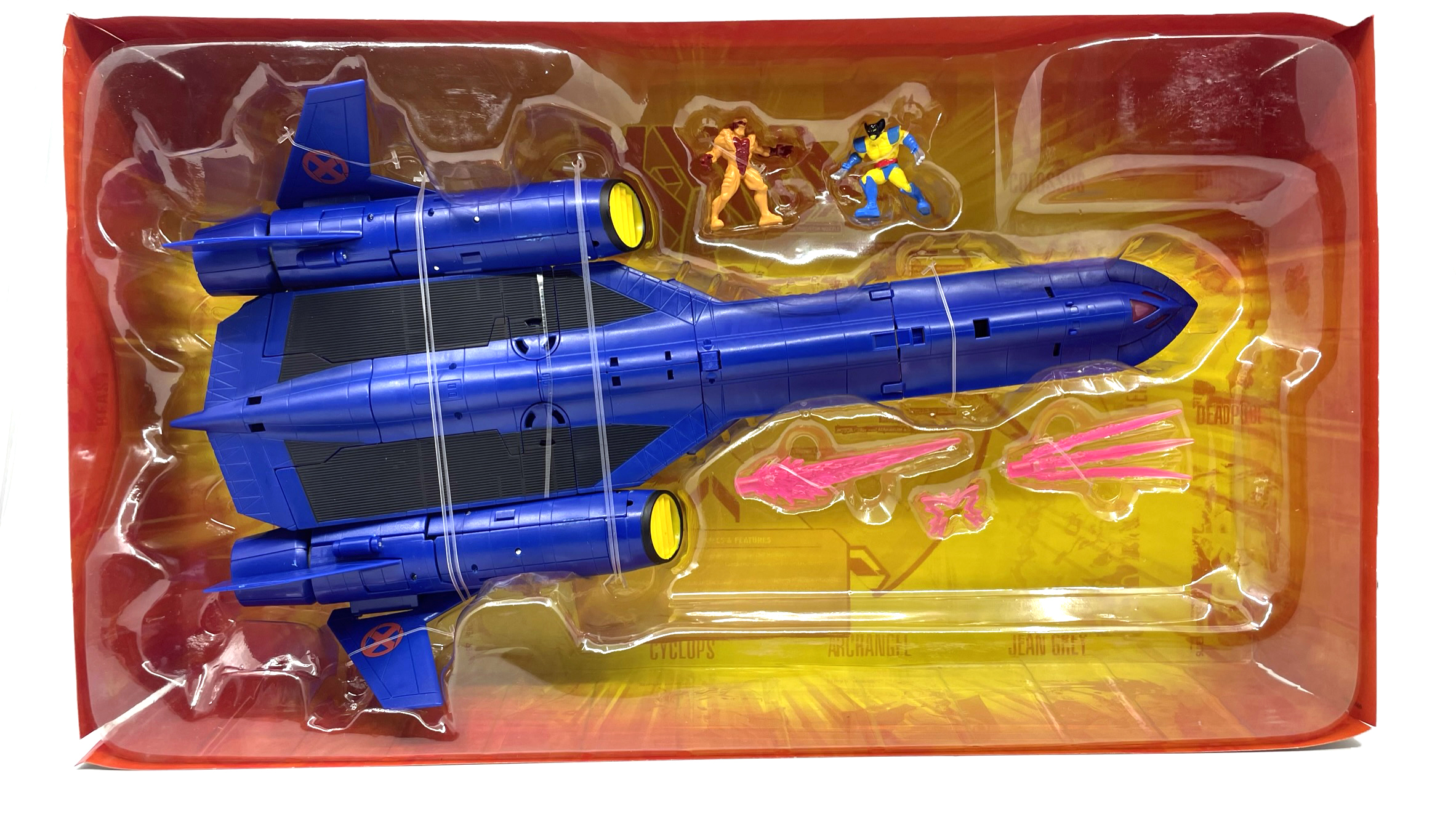 블리스터 케이스엔 엑스제트의 내부 구조와 사이클롭스, 울버린, 콜러서스, 아크엔젤, 진 그레이, 데드풀 등 다양한 엑스맨 이름이 그려져 있습니다.