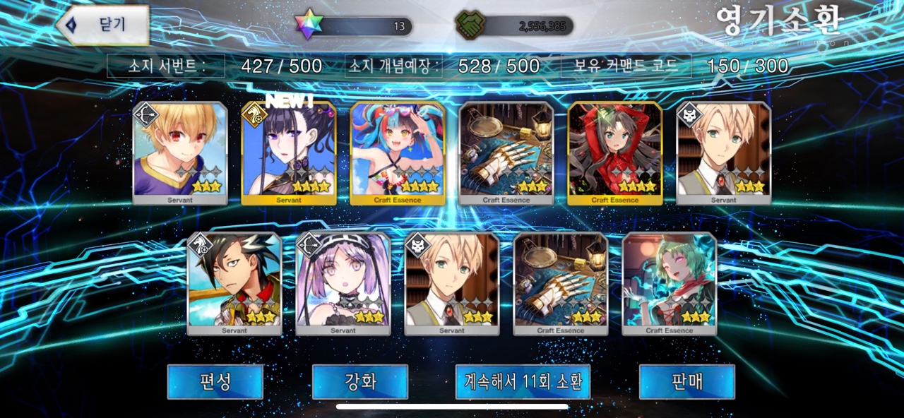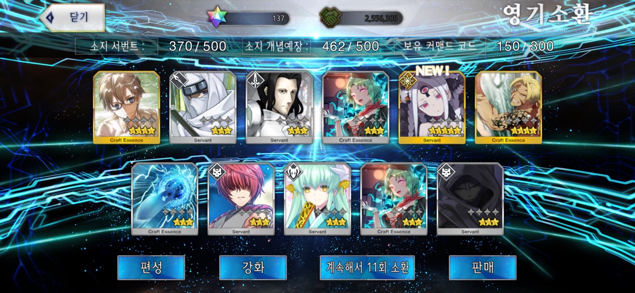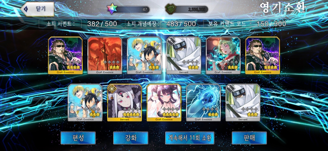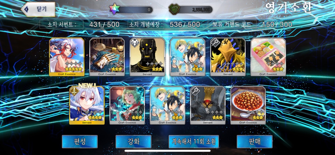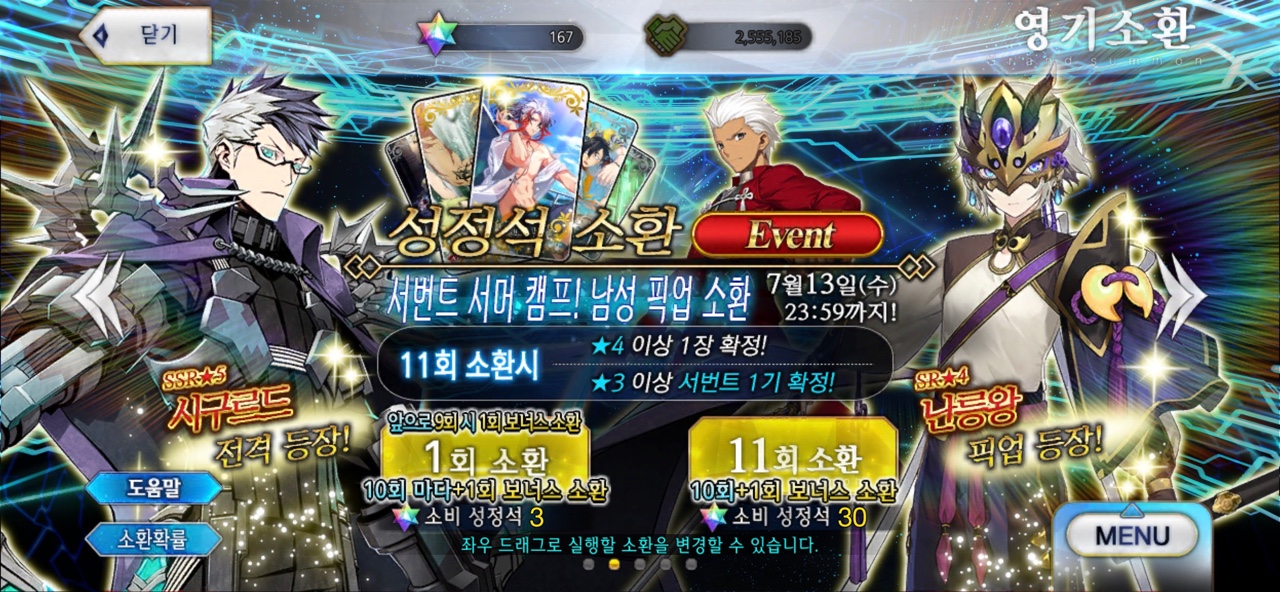 거의 2년 동안 시구르드를 뽑기 위해 노력했던 것 같은데, 이제야 시구르드를 뽑게 됩니다. 북유럽 신화의 뵐숭 사가를 재밌게 본 것도 있지만 담당 성우가 <유희왕>의 카이바 세토로 유명한 츠다 켄지로라는 점에서 안 뽑을 수가 없었는데 이제라도 뽑게 됩니다. 특별한 경우가 아니면 명함 이상을 노리지 않기에 추가 소환은 하지 않을 예정이라는 것이 다행이라면 다행.
