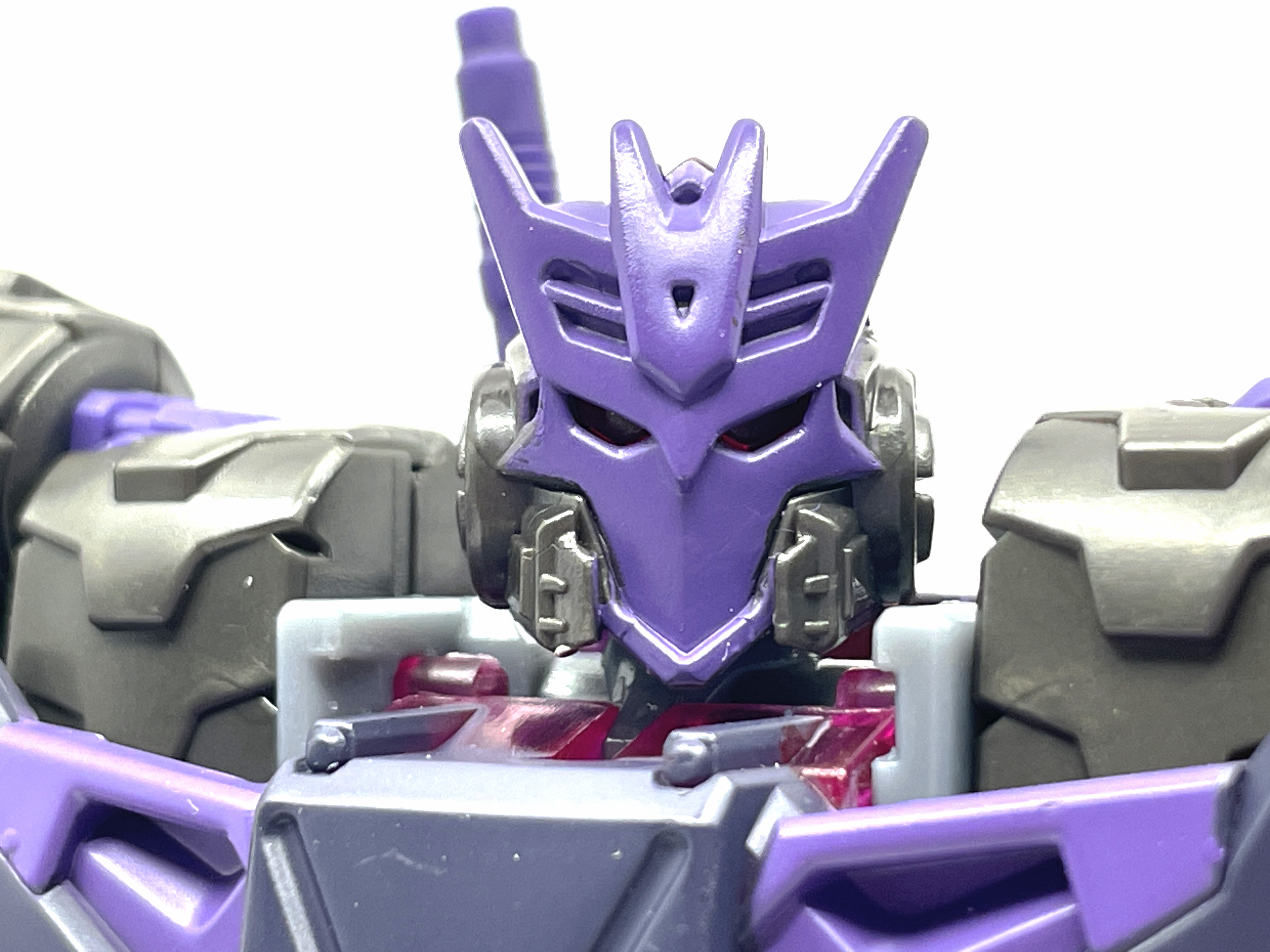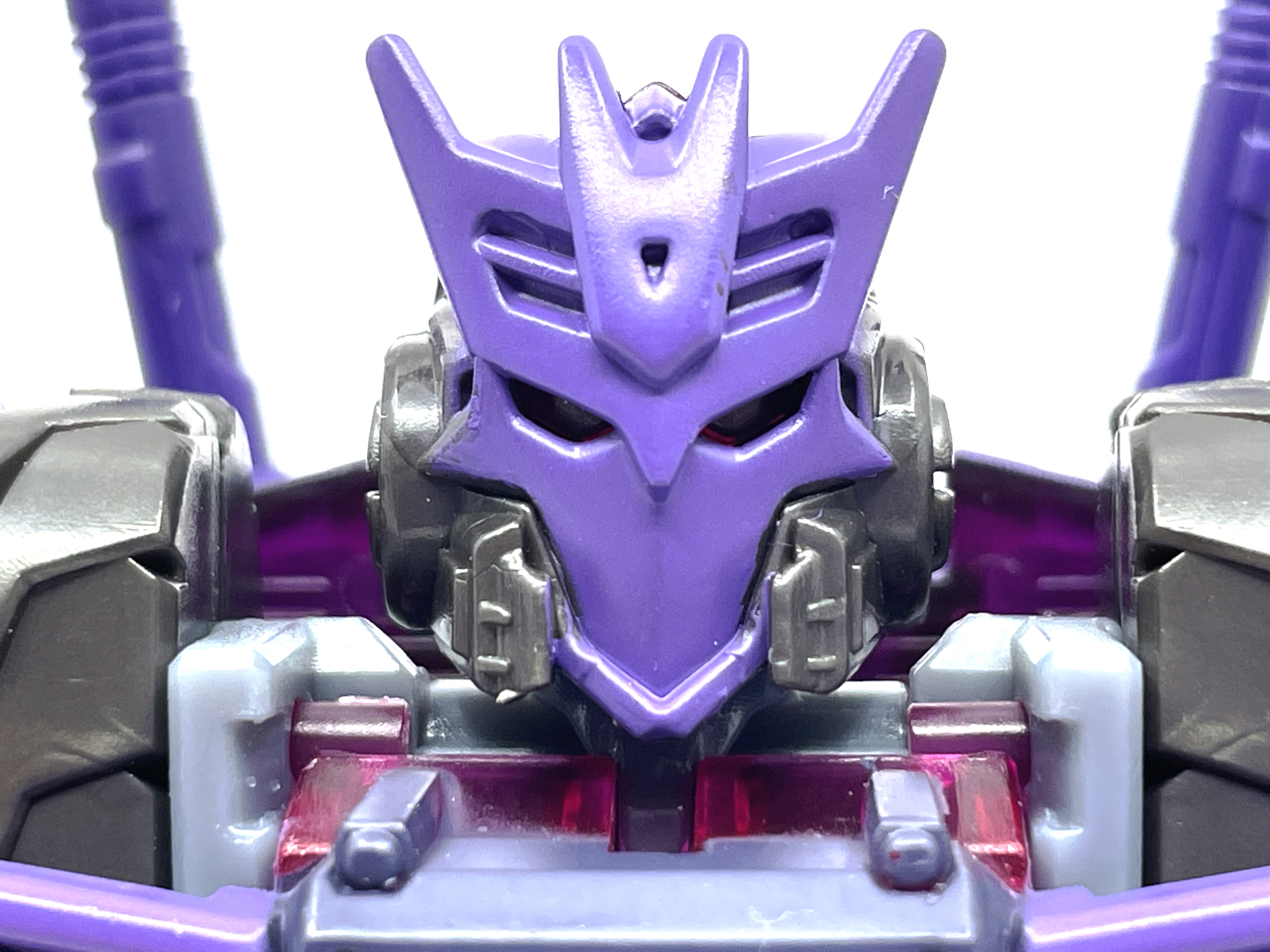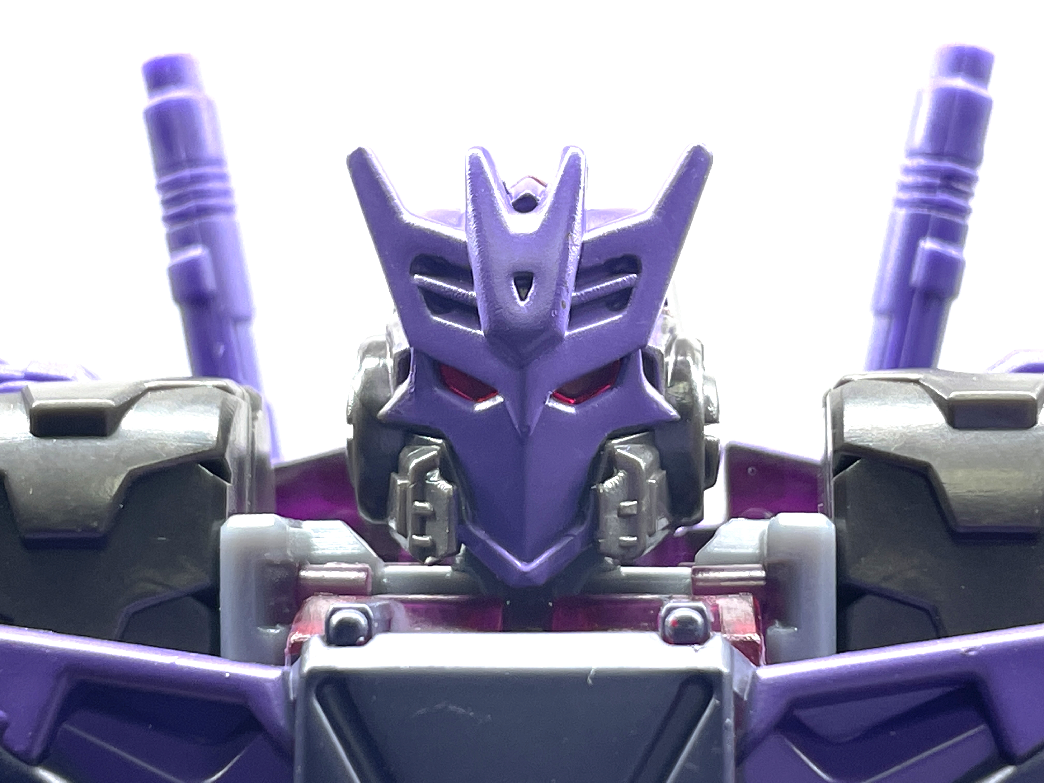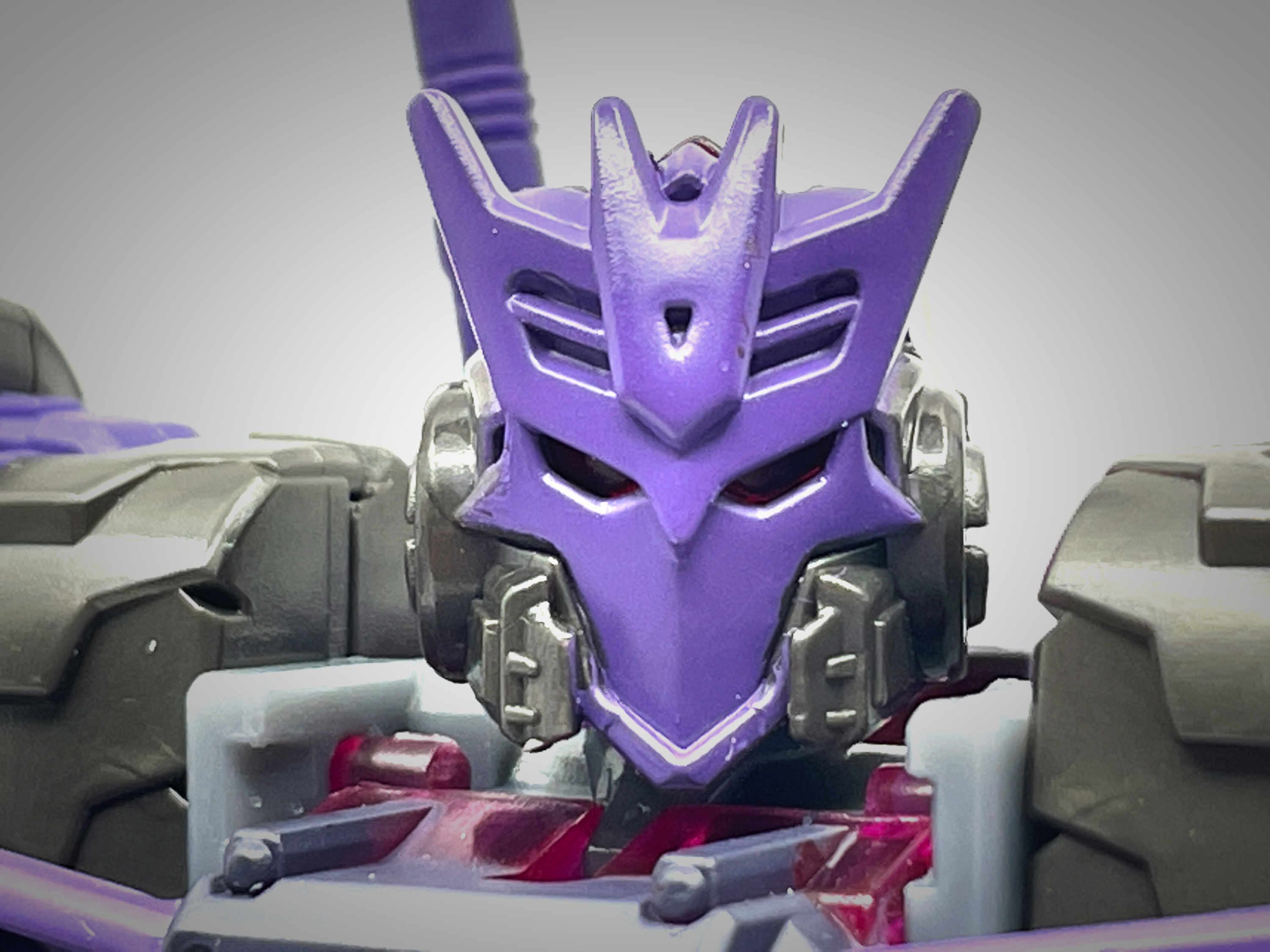 디셉티콘 사상에 심취한 나머지 디셉티콘 가면을 착용합니다. 디셉티콘 진영 마크는 사운드웨이브의 얼굴을 기반으로 만들어졌다는 걸 생각하면 이건 또 재미난 부분이지요.
