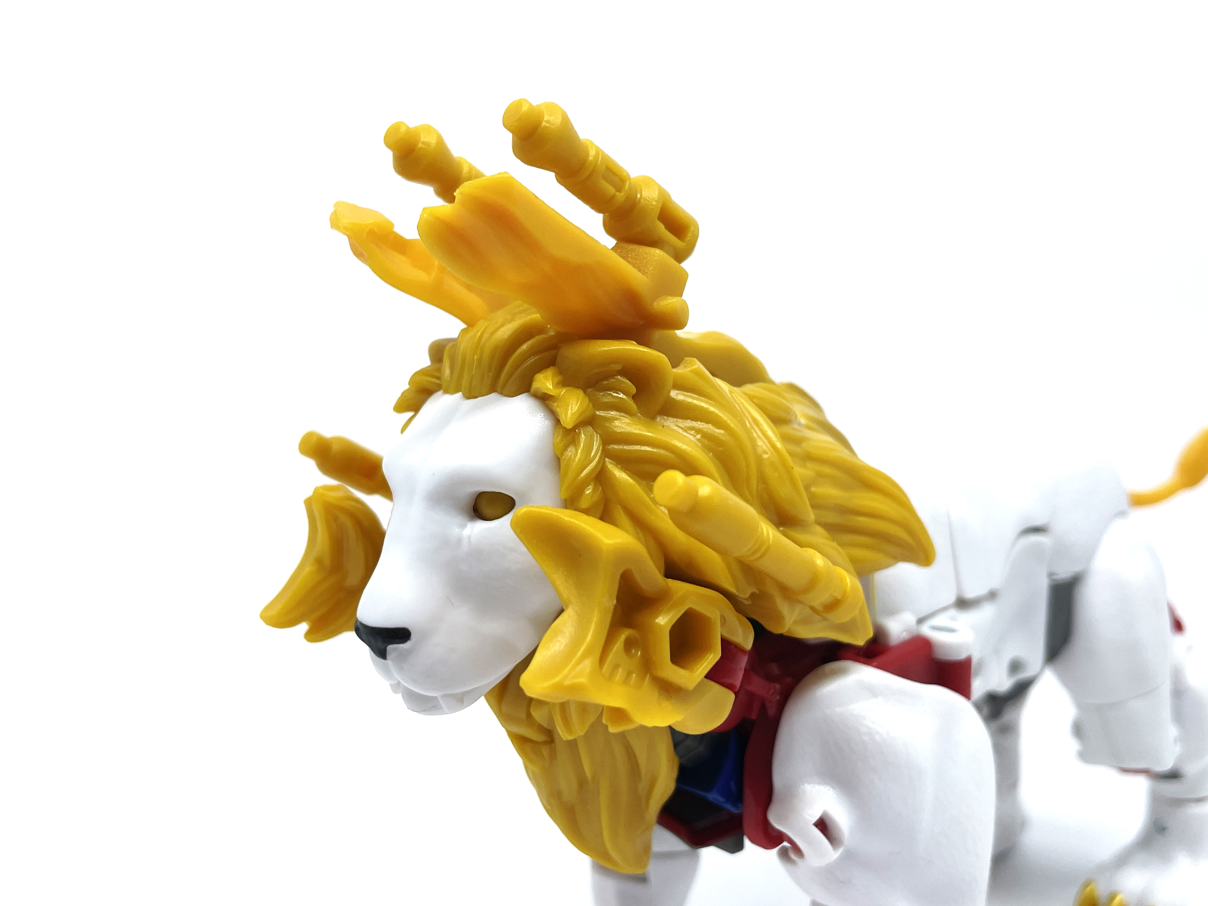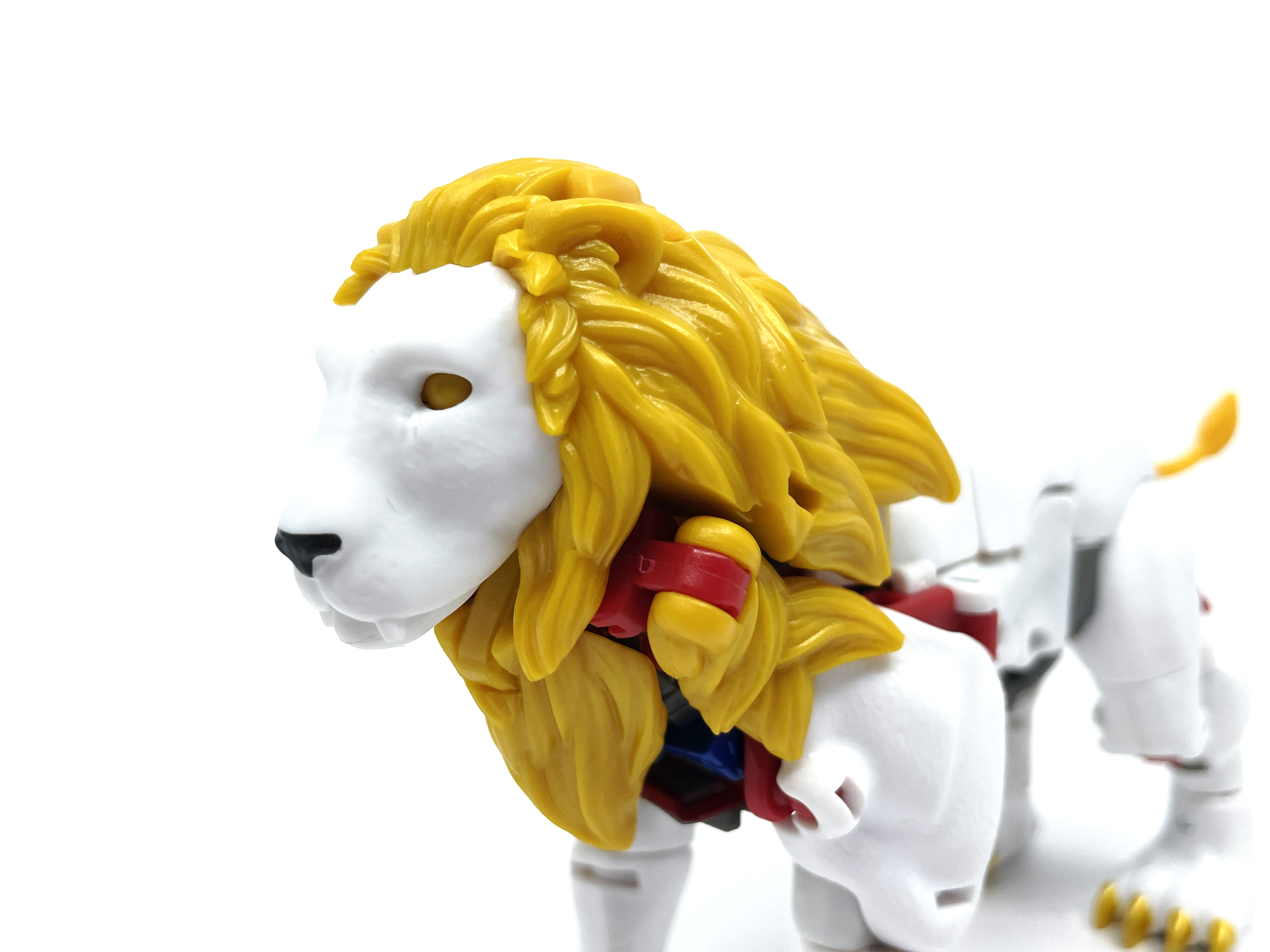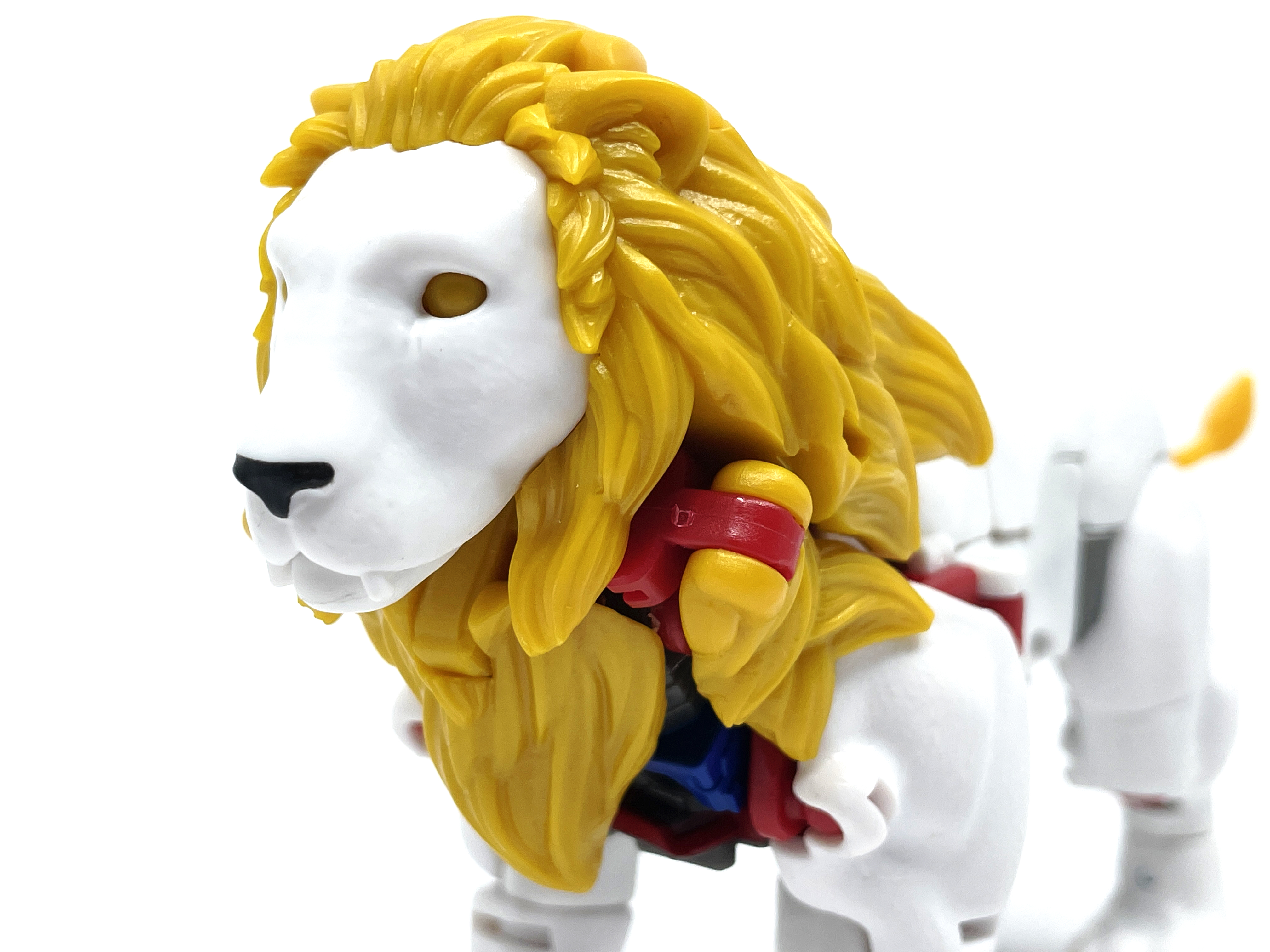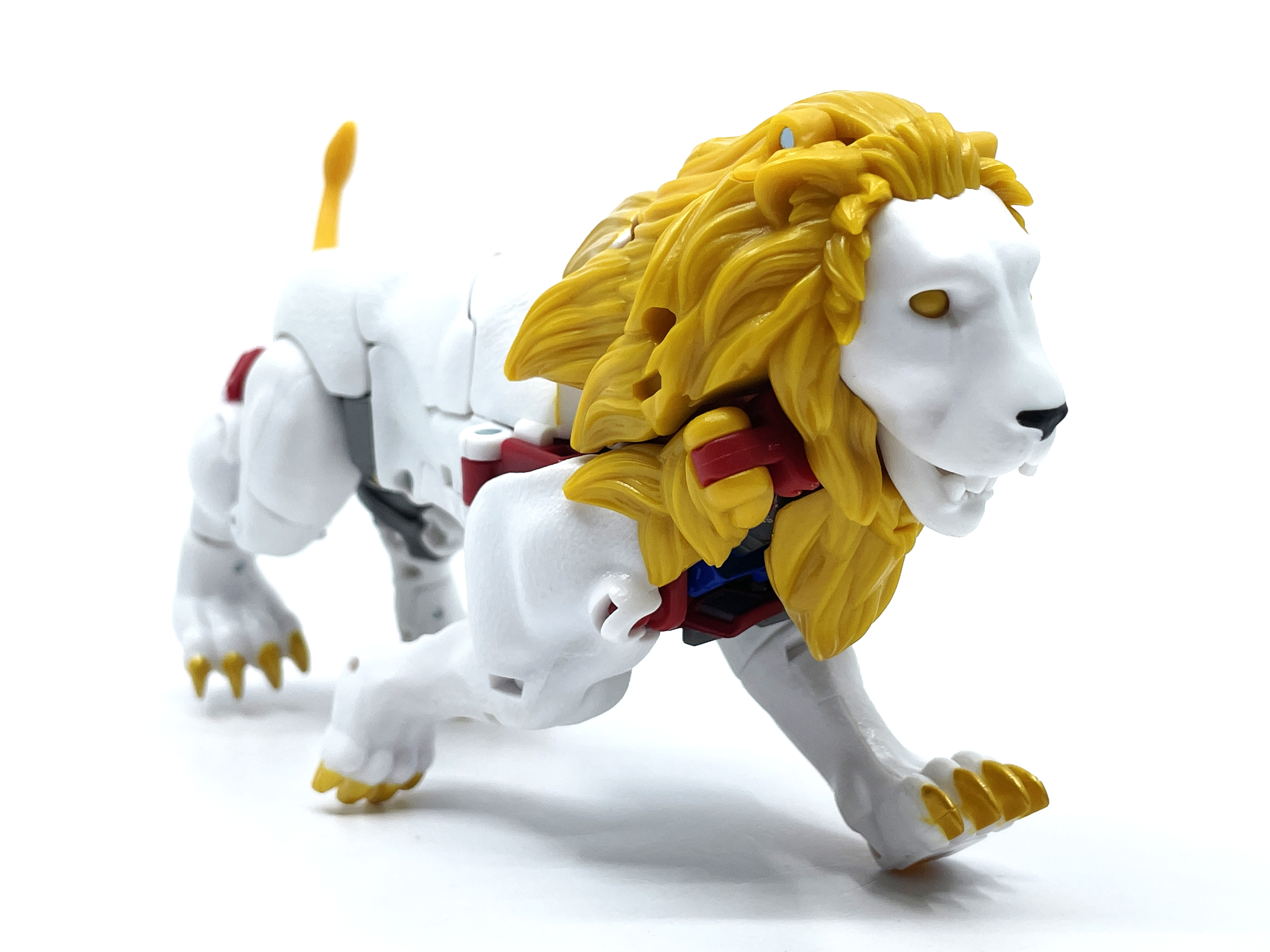 흰 숫사자로 변신하는 레오 프라임. 킹덤 비스트 워즈 제품들처럼 사실적인 동물로 만들어졌습니다.