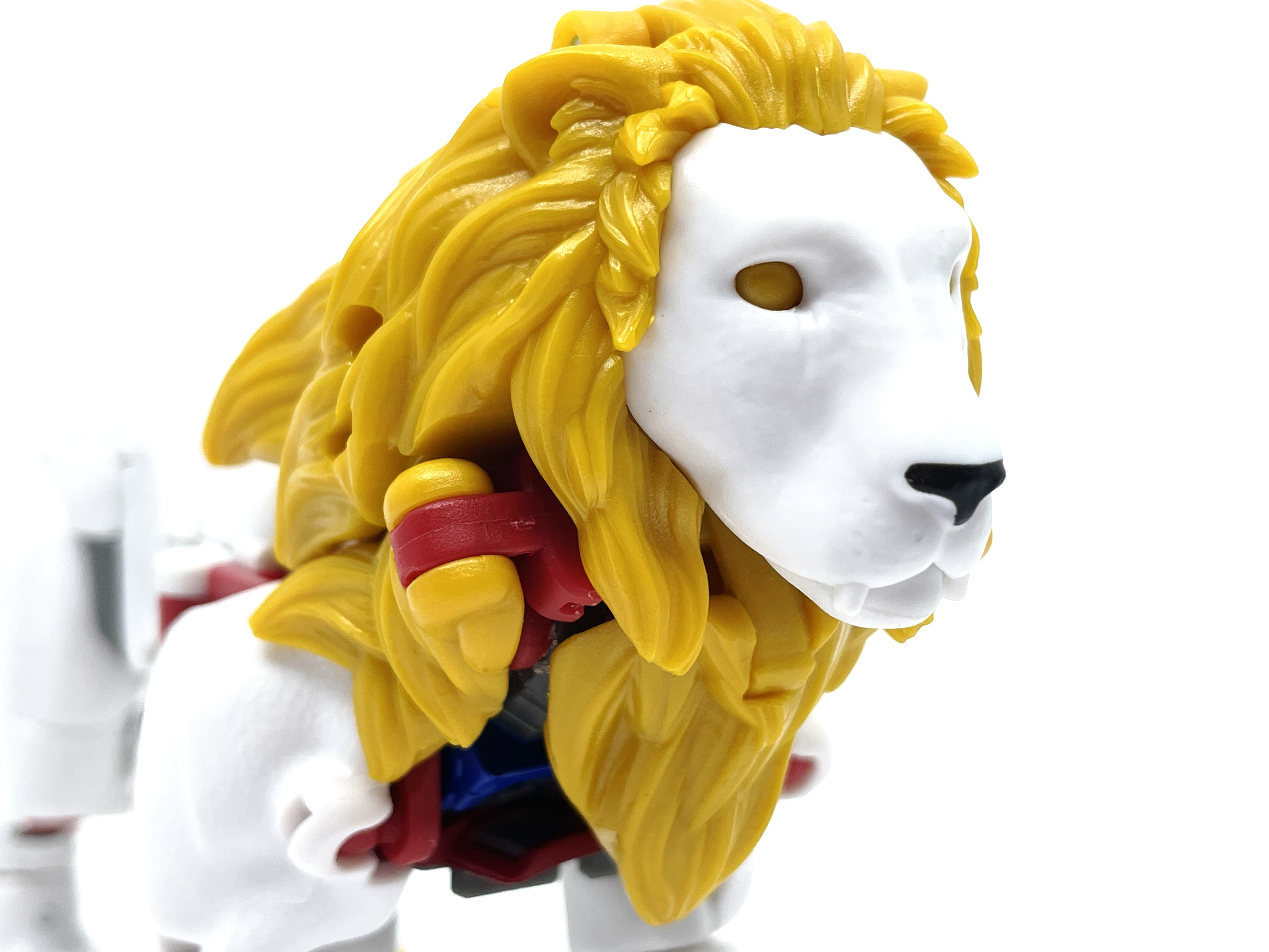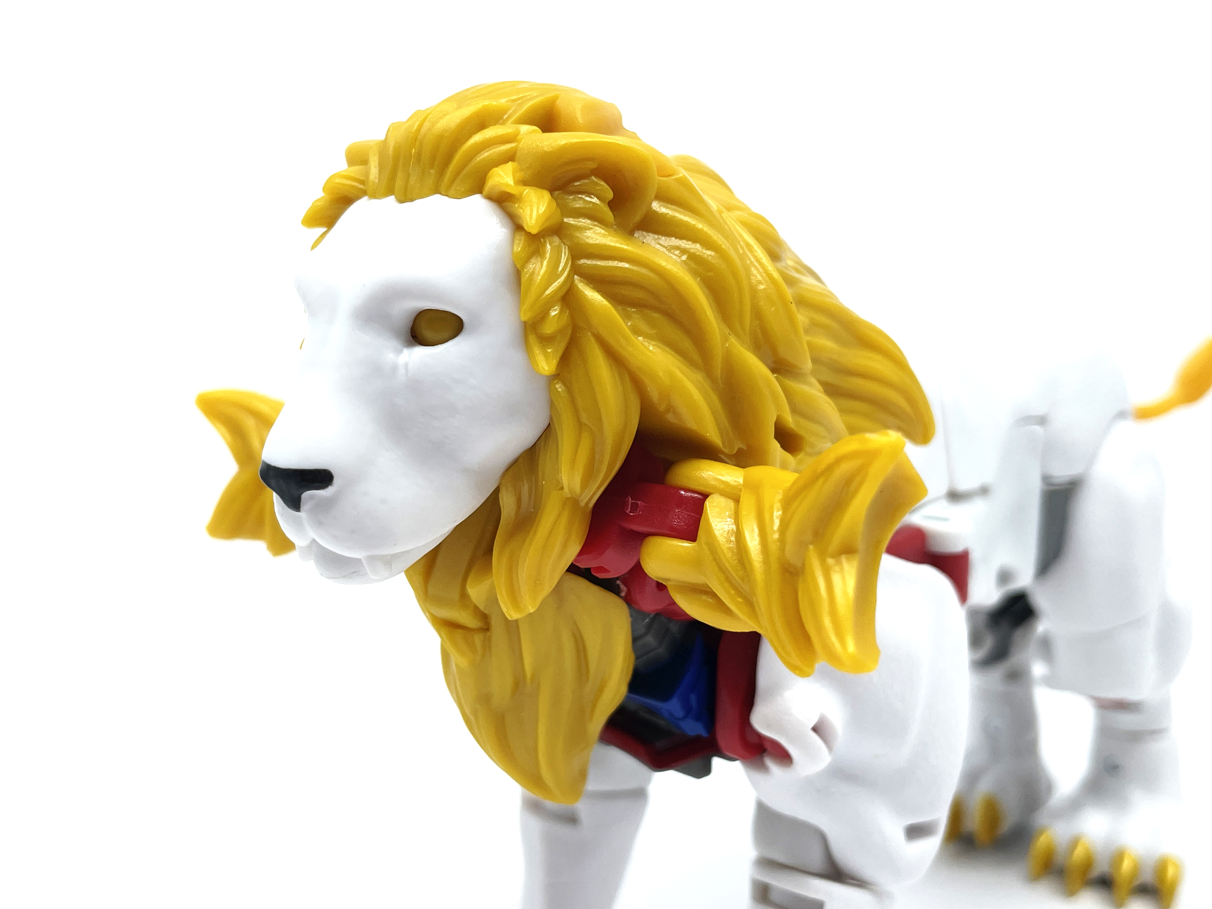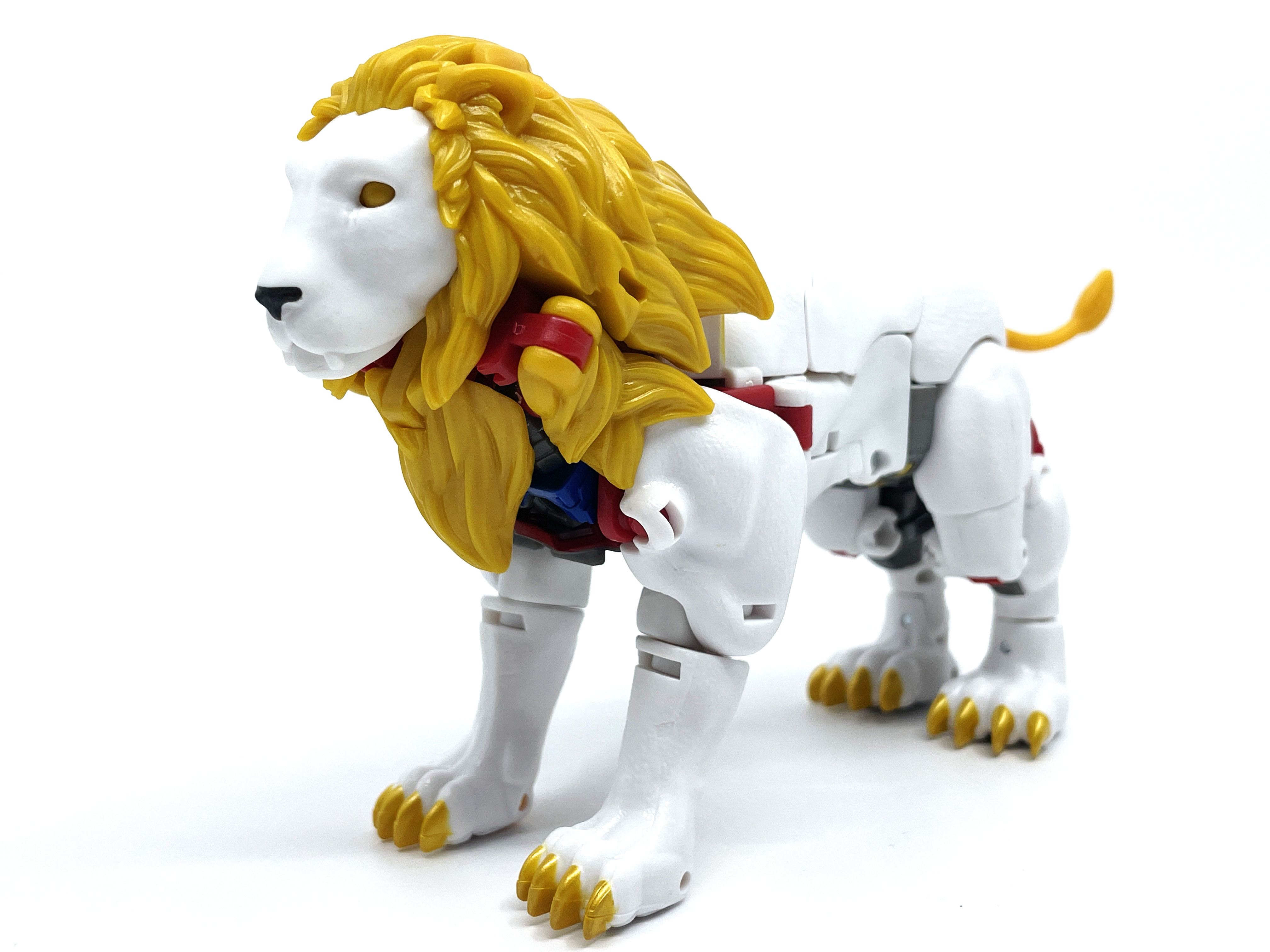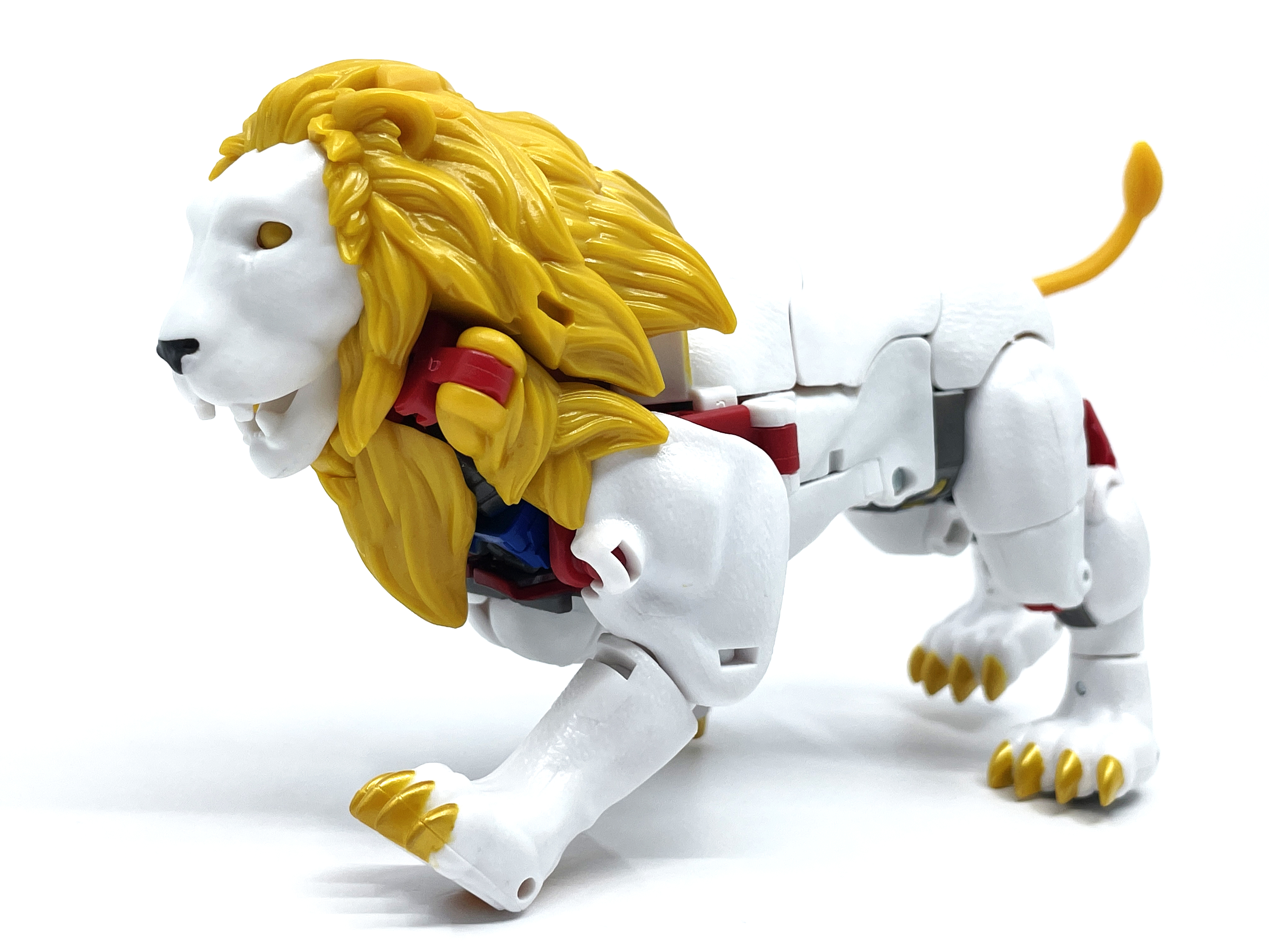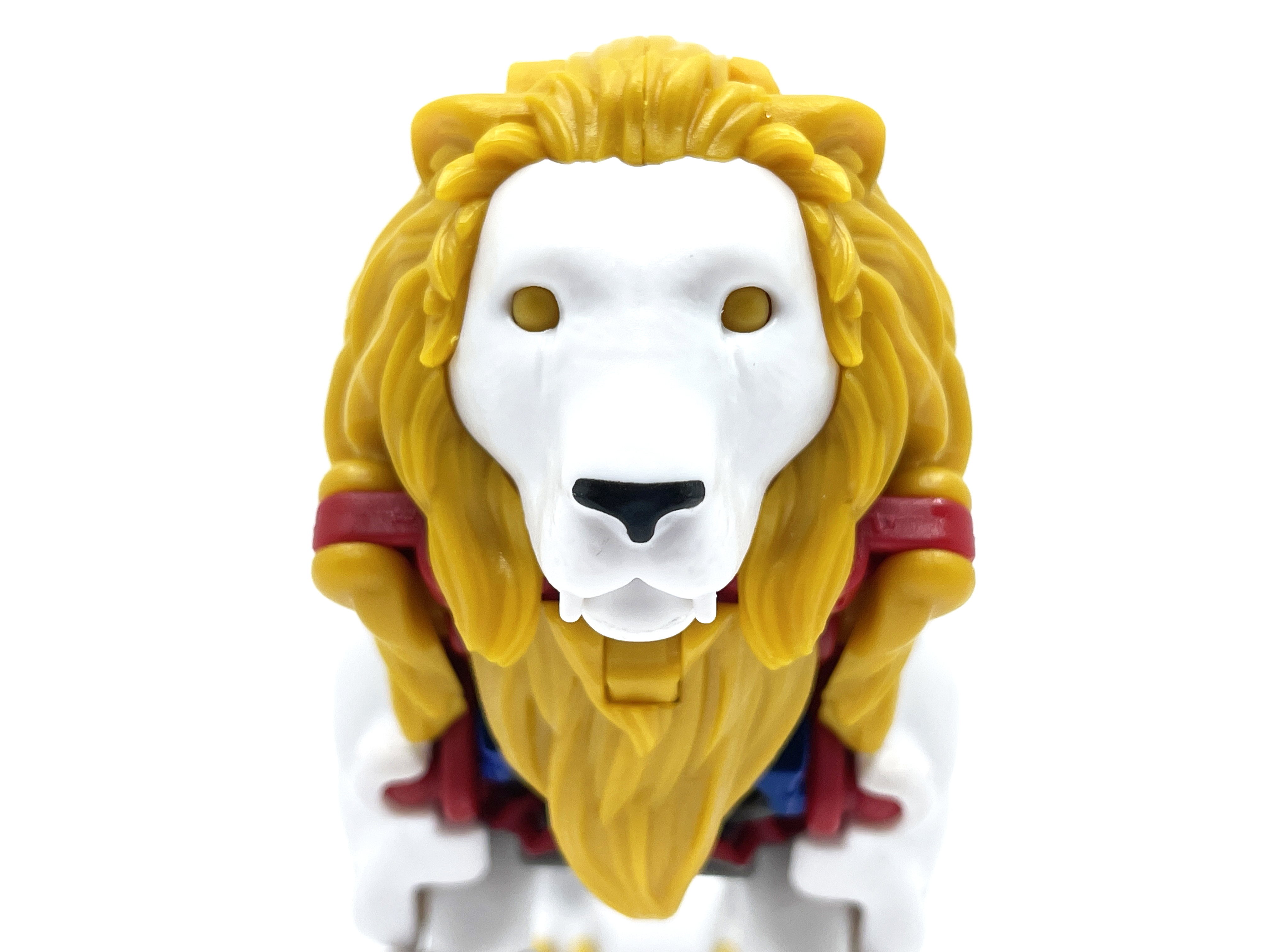 흰 숫사자로 변신하는 레오 프라임. 킹덤 비스트 워즈 제품들처럼 사실적인 동물로 만들어졌습니다.