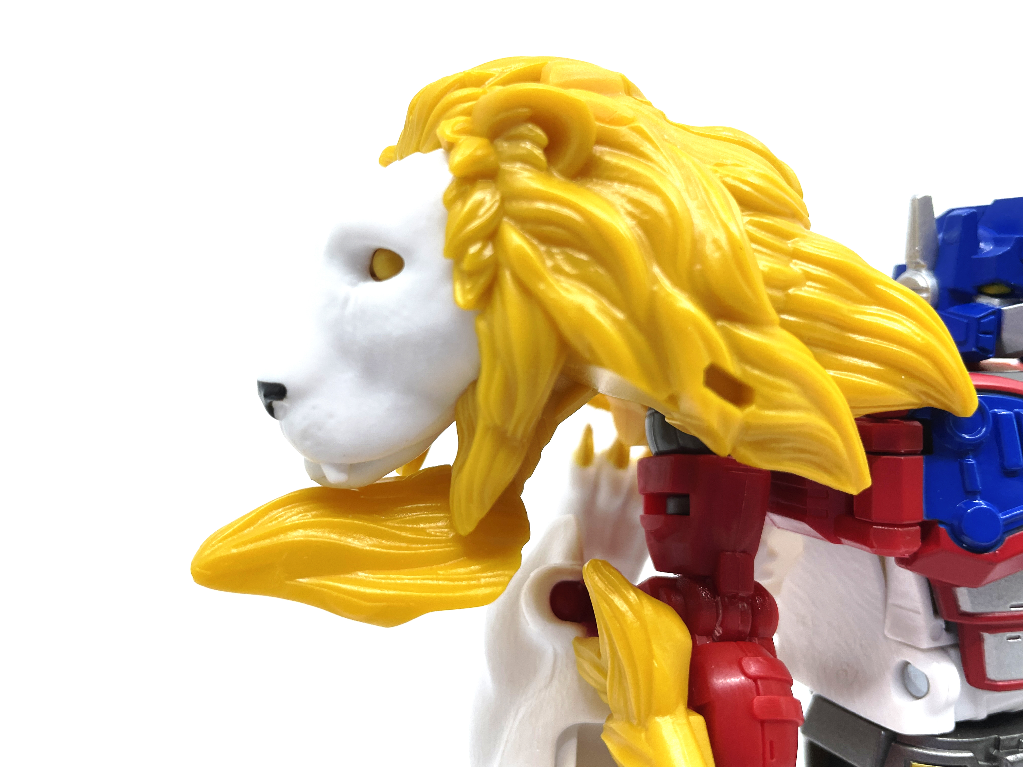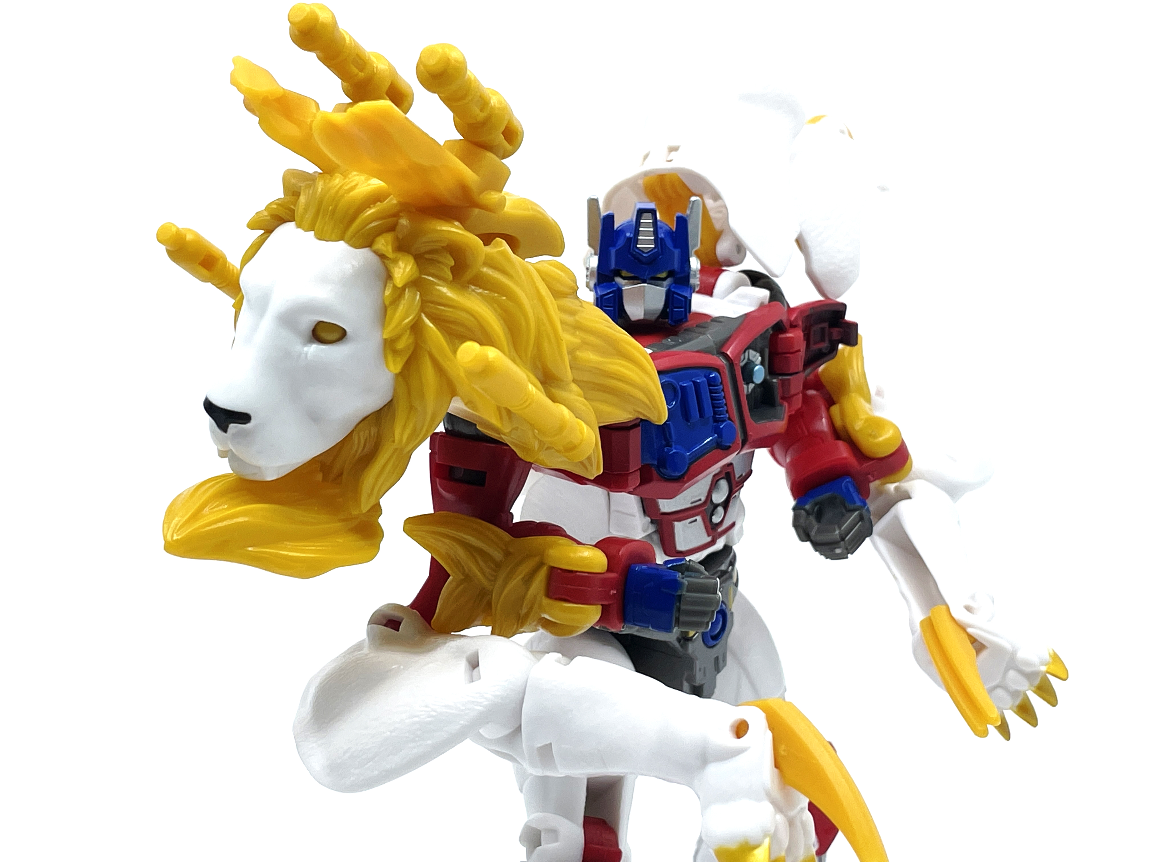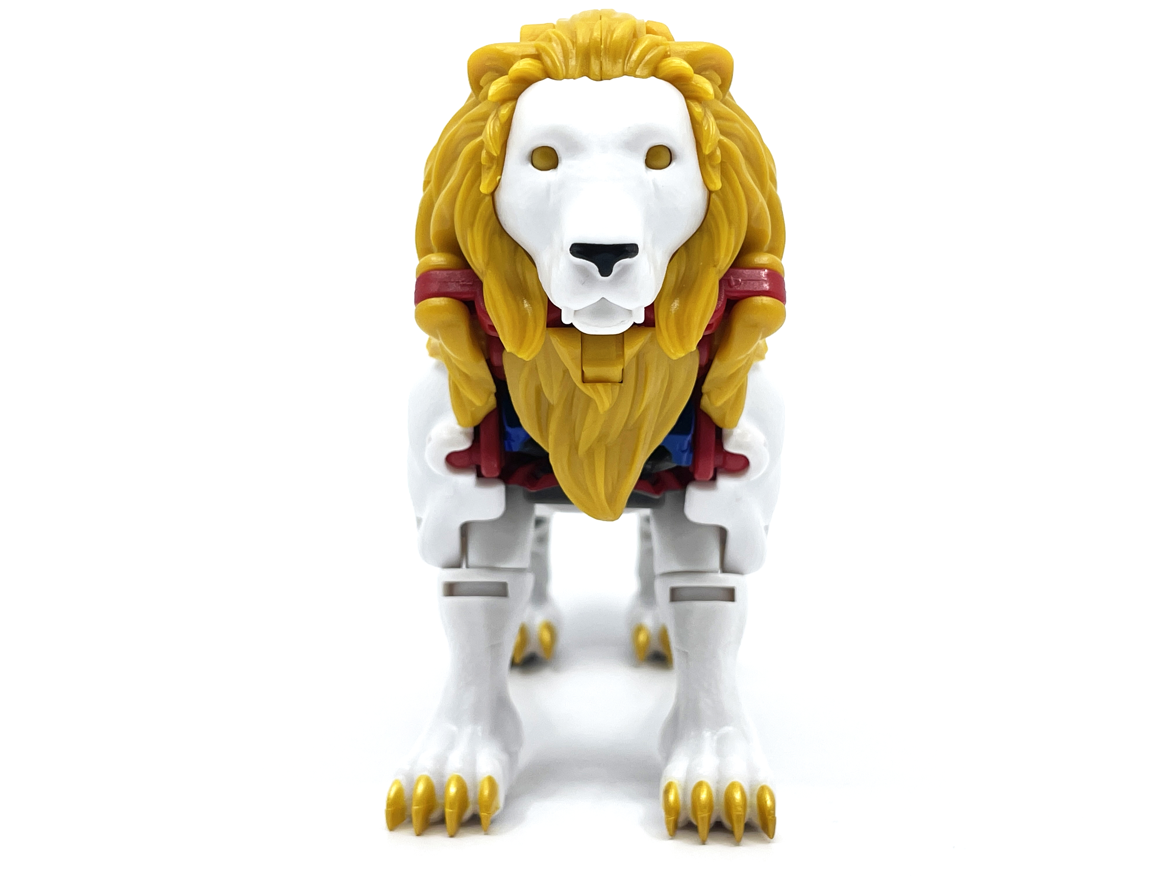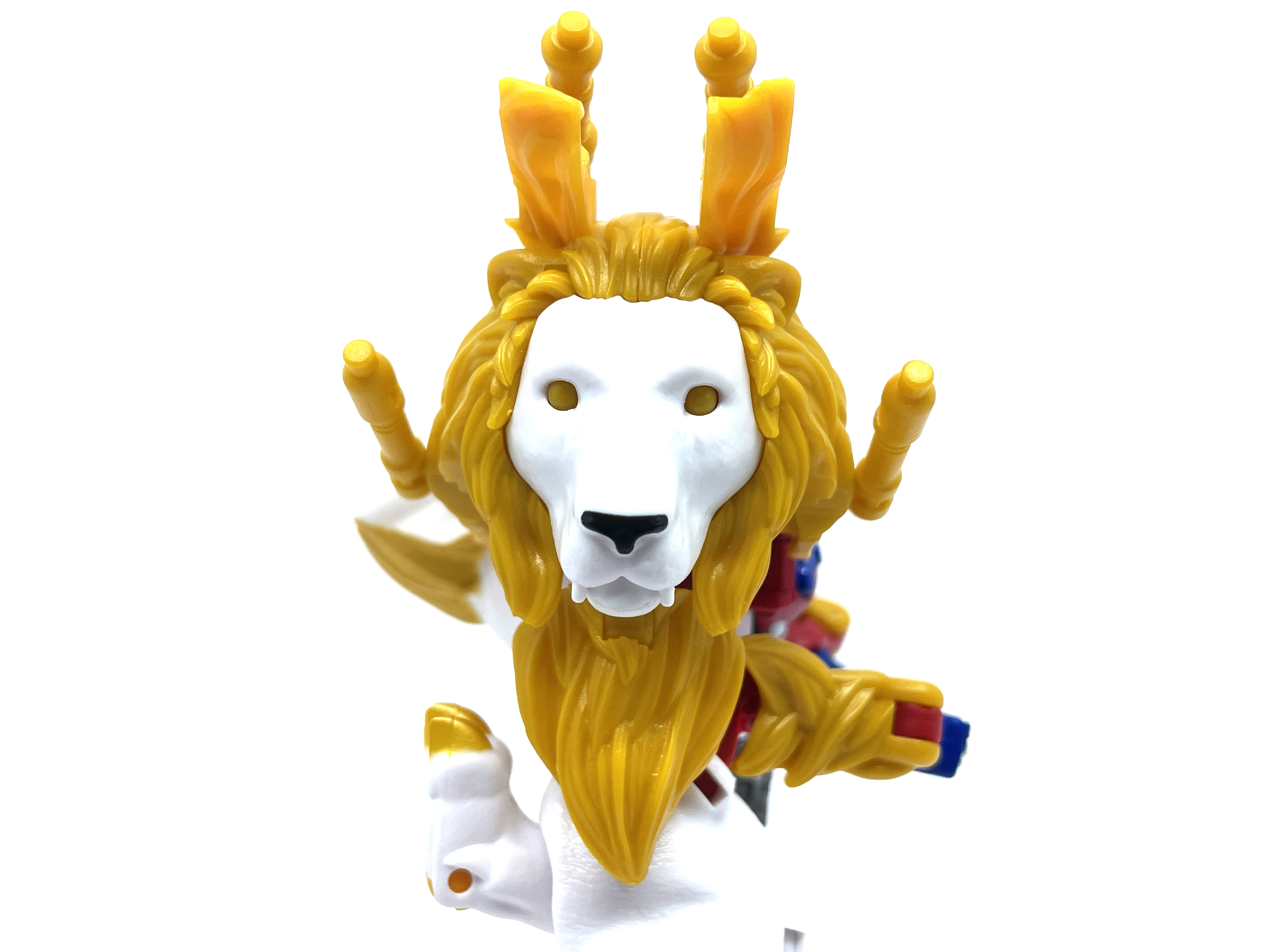 흰 숫사자로 변신하는 레오 프라임. 킹덤 비스트 워즈 제품들처럼 사실적인 동물로 만들어졌습니다.