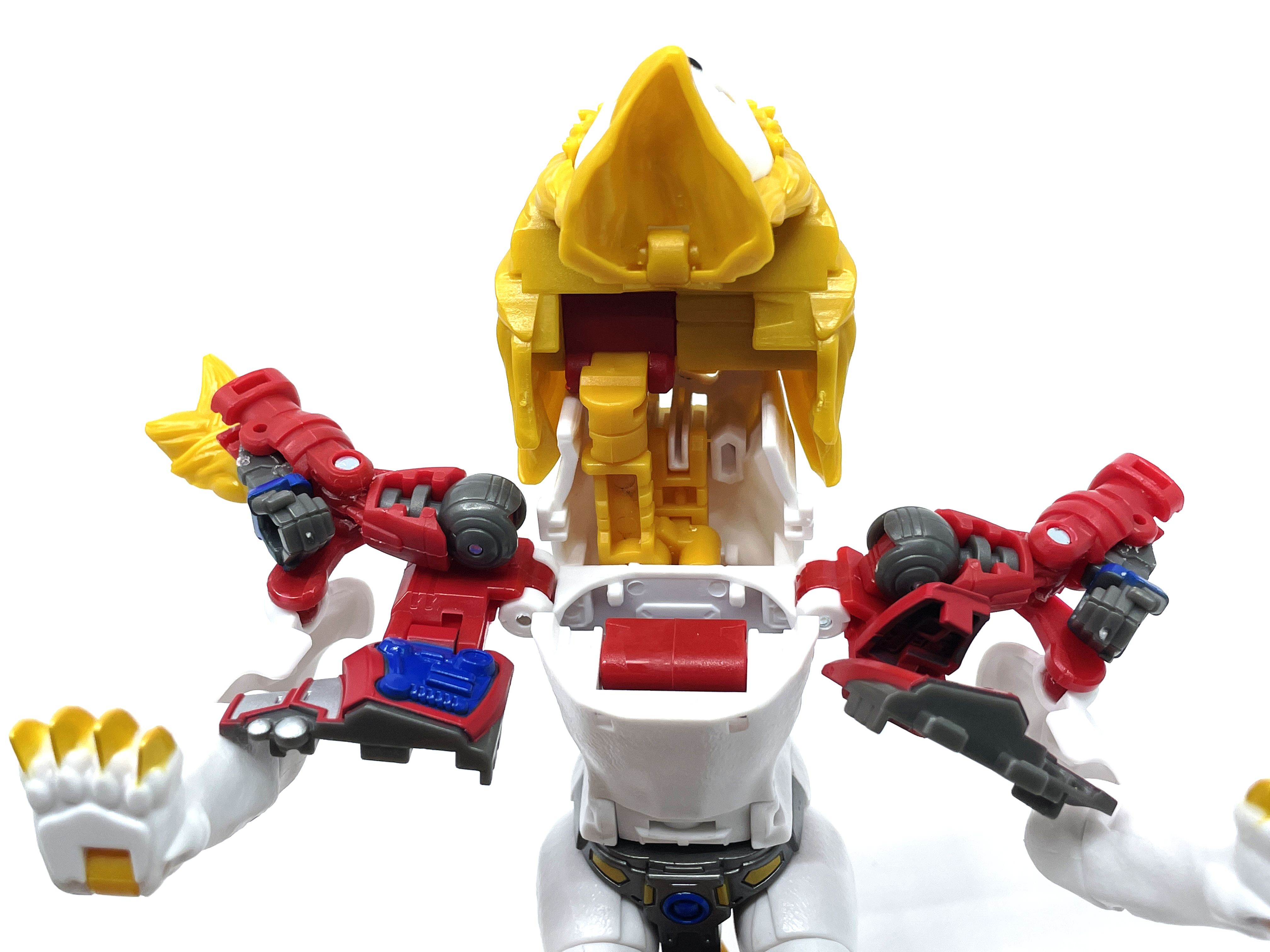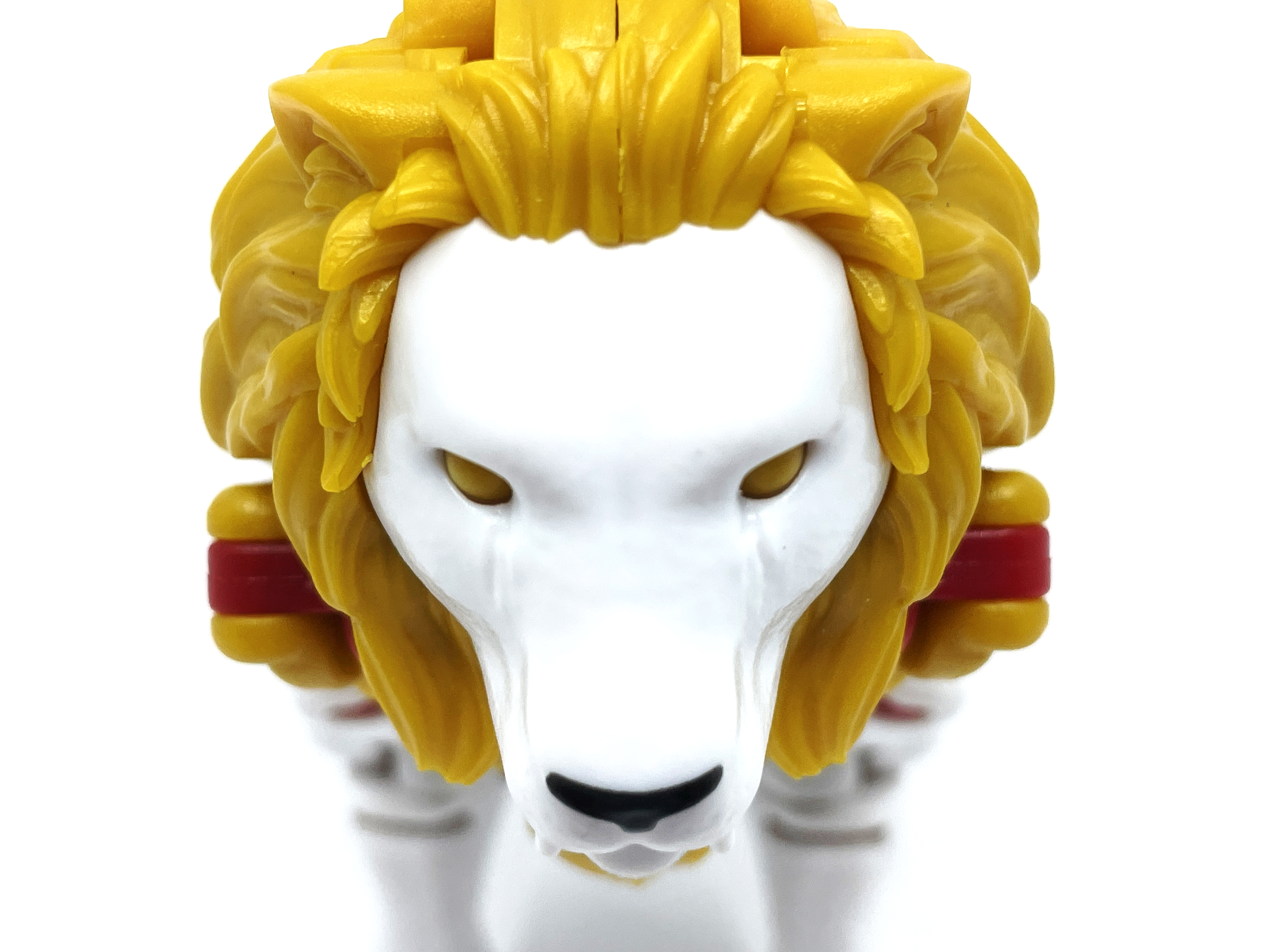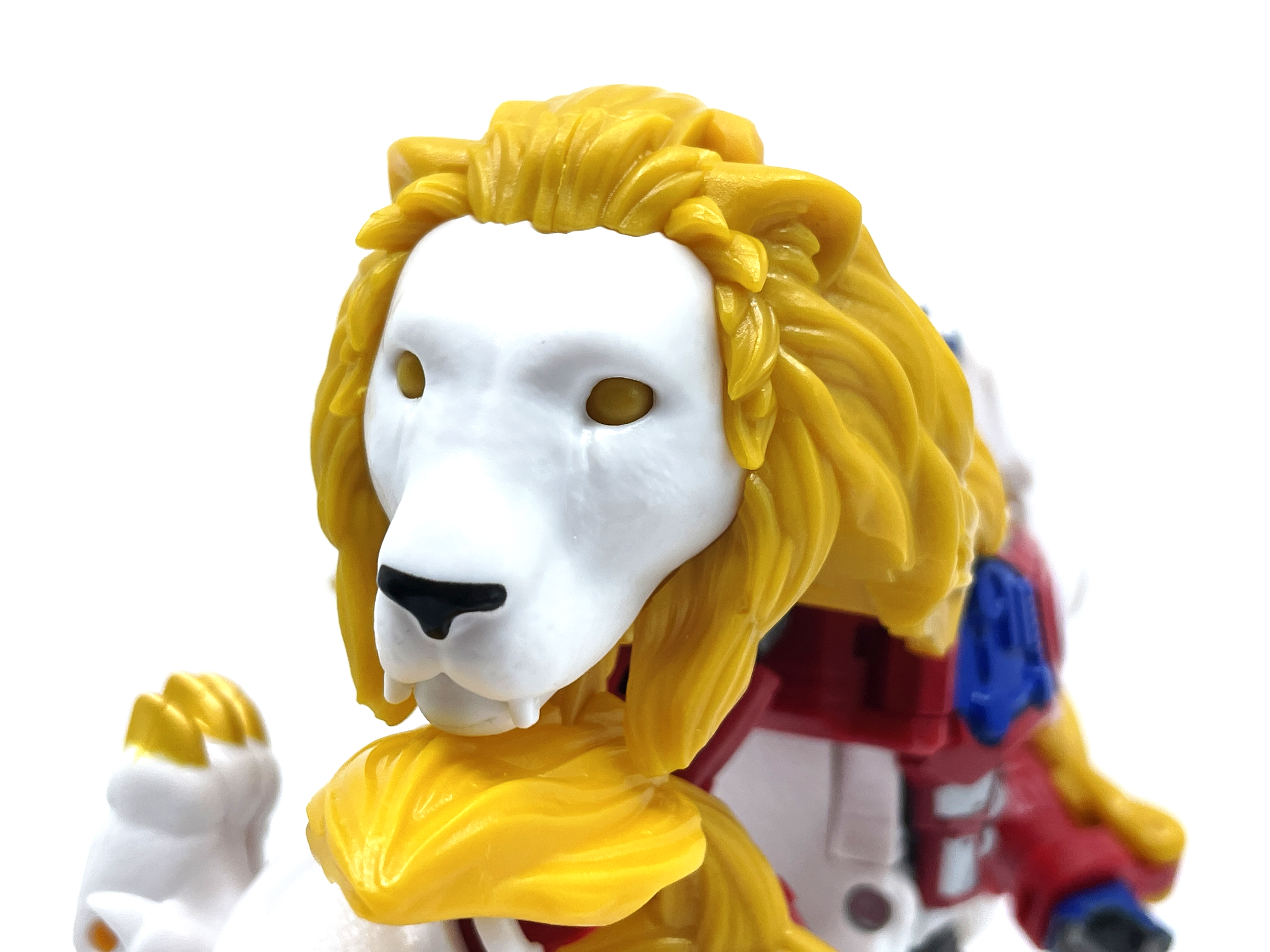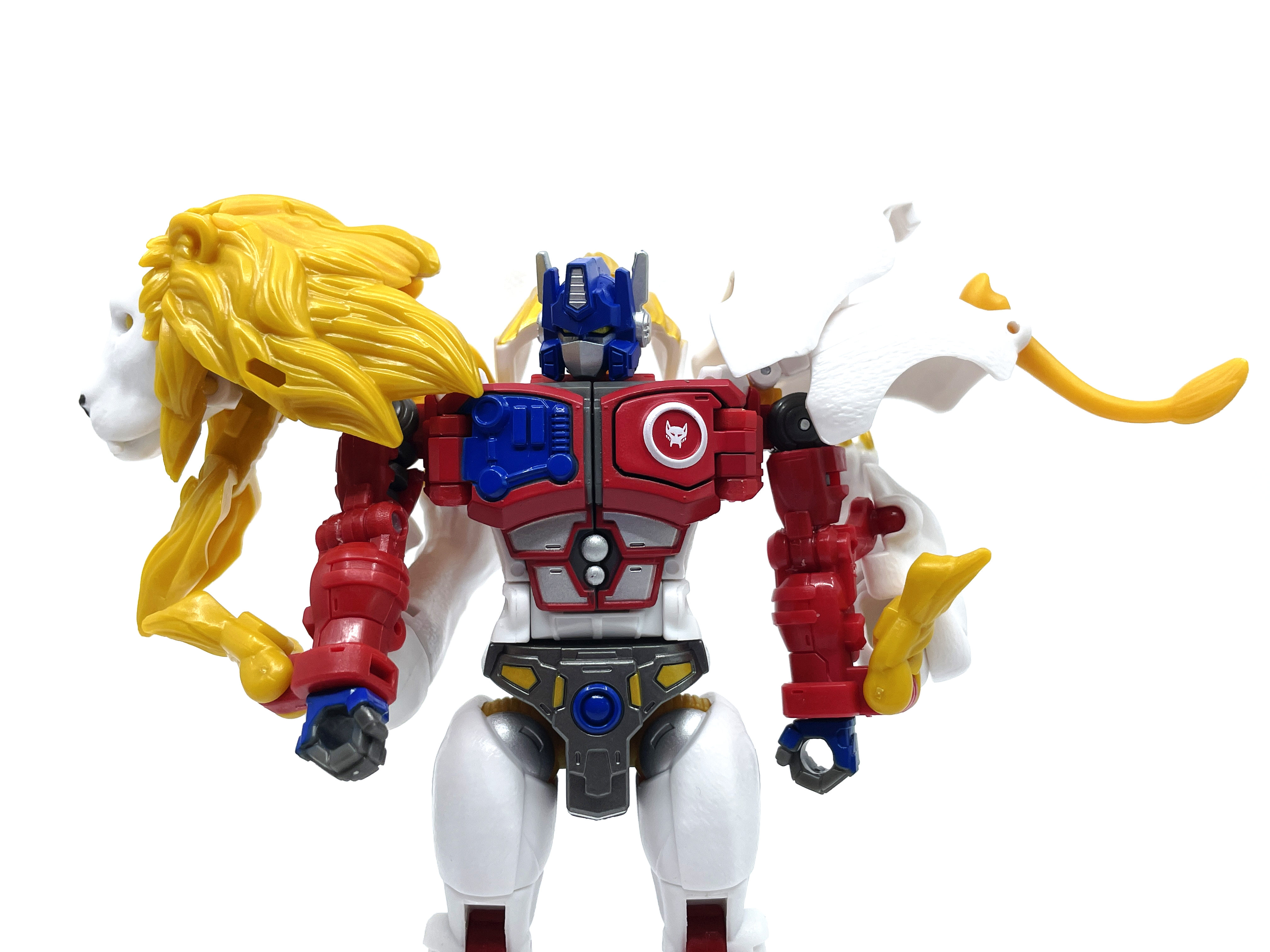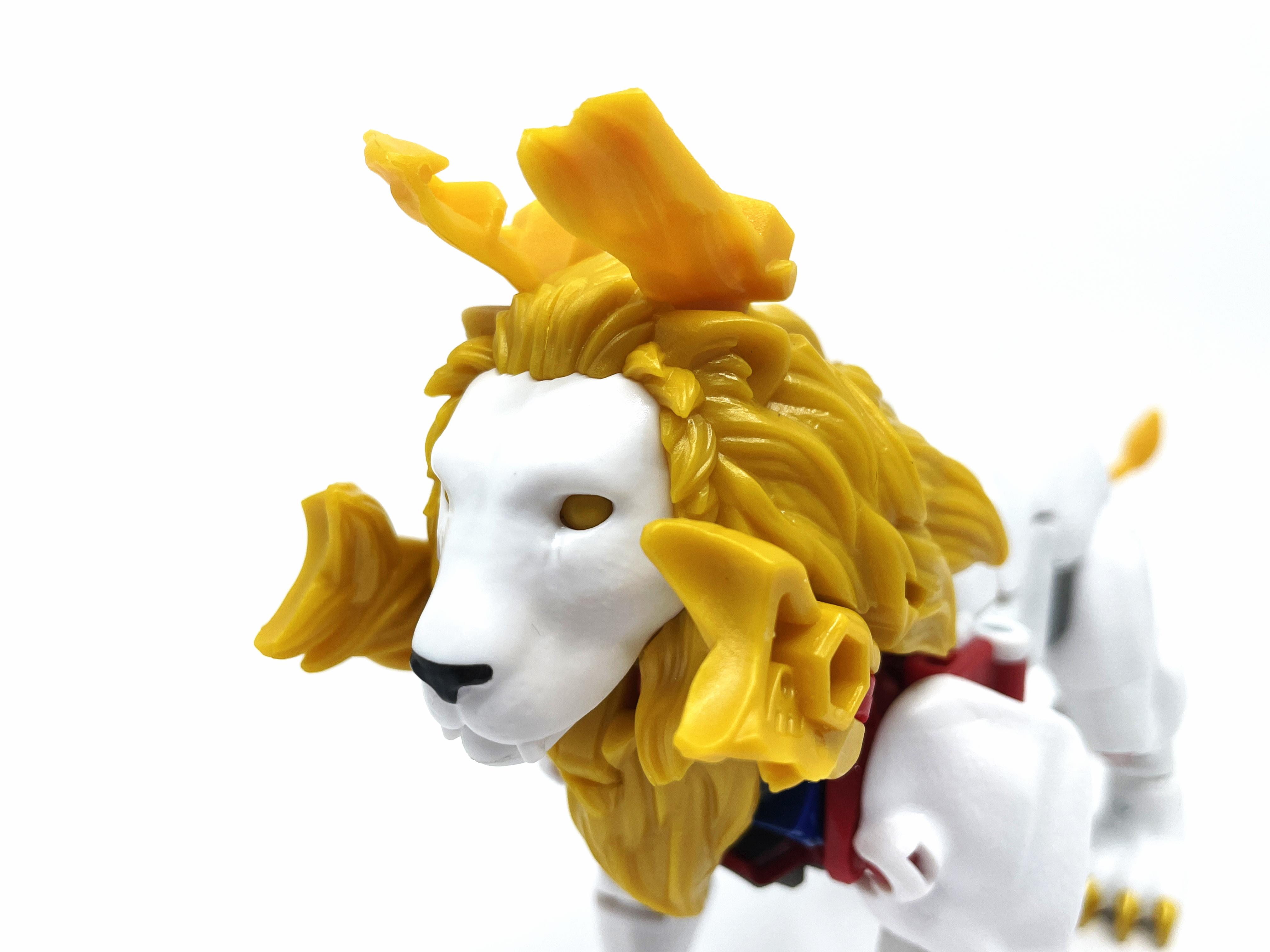 흰 숫사자로 변신하는 레오 프라임. 킹덤 비스트 워즈 제품들처럼 사실적인 동물로 만들어졌습니다.