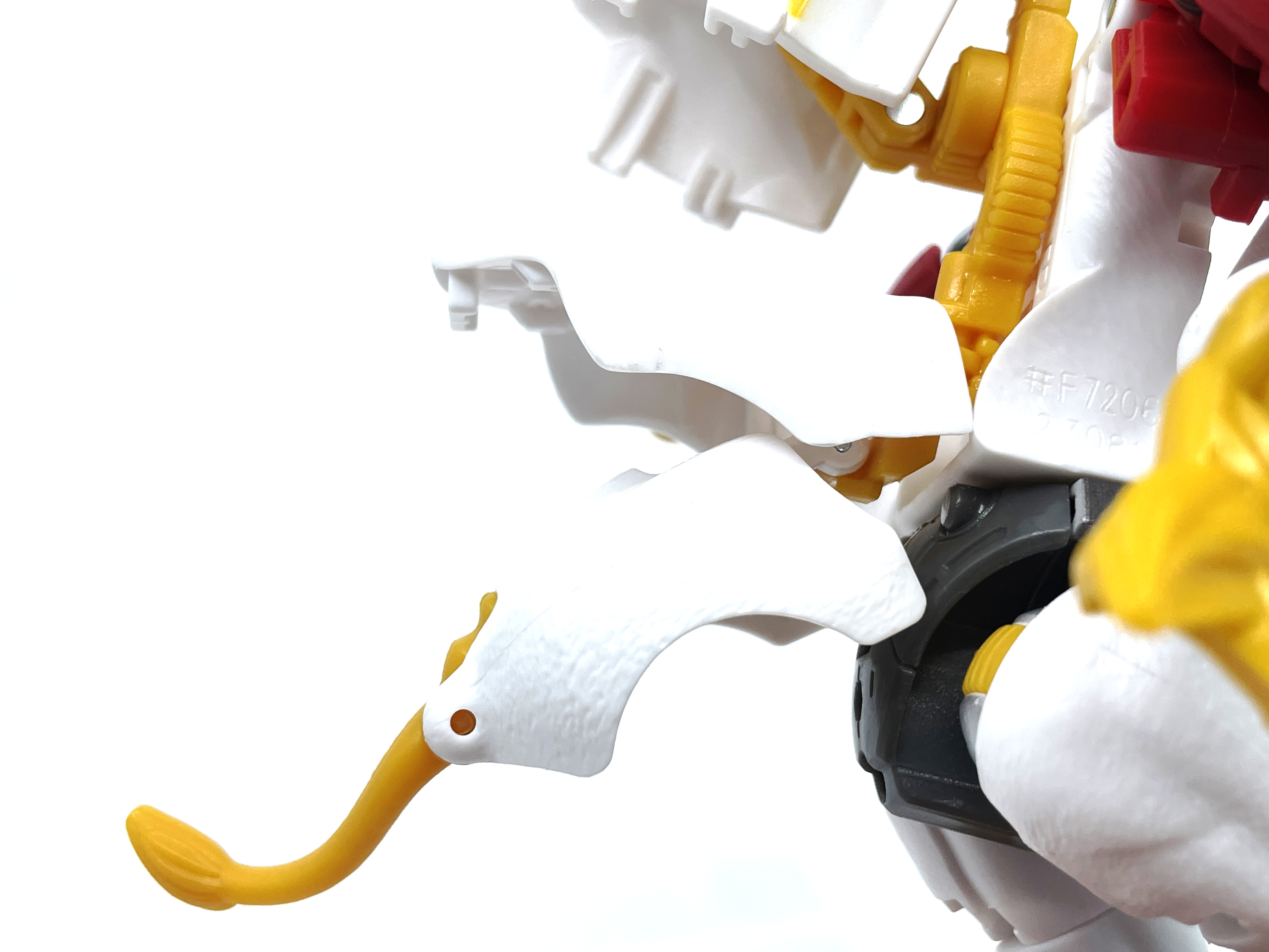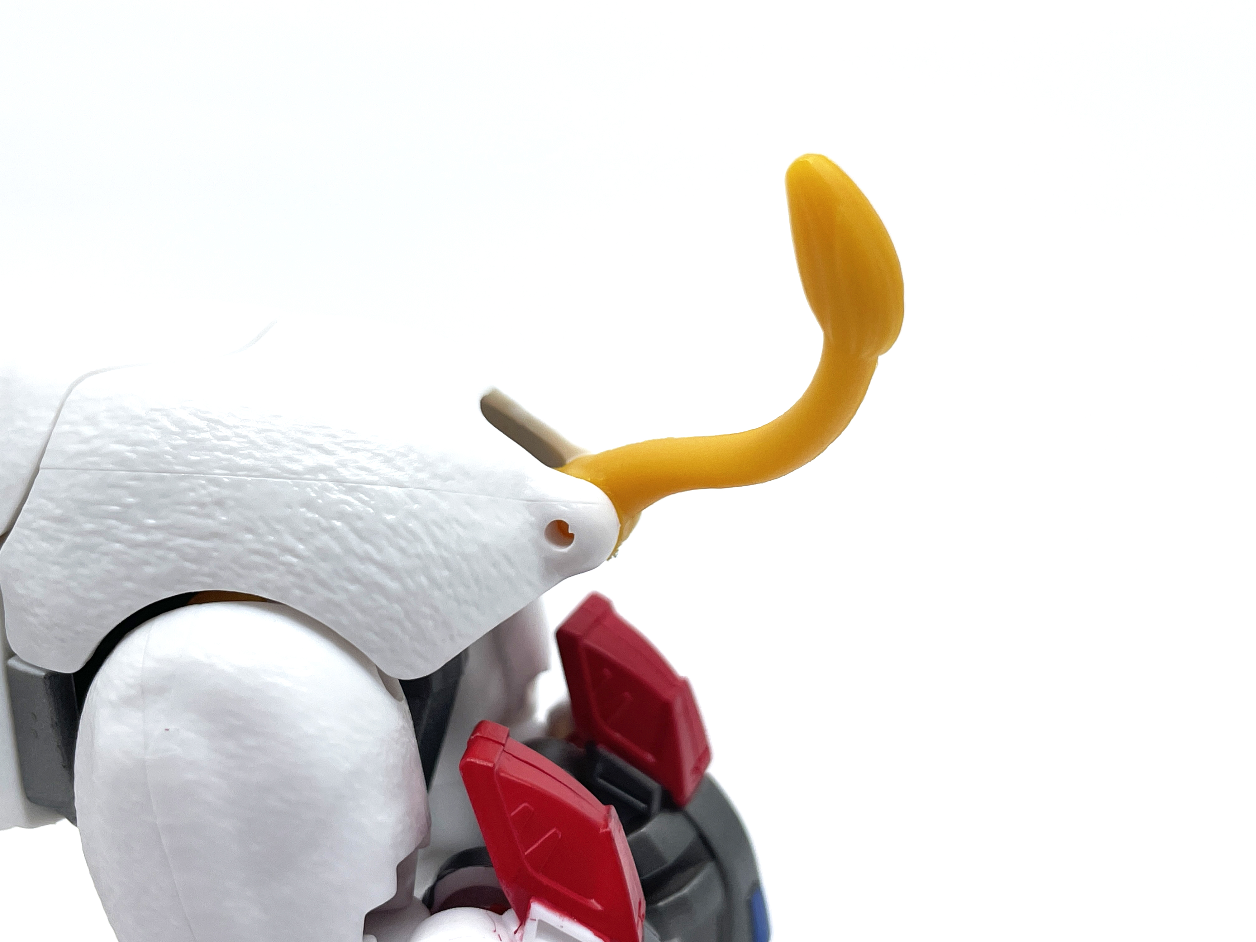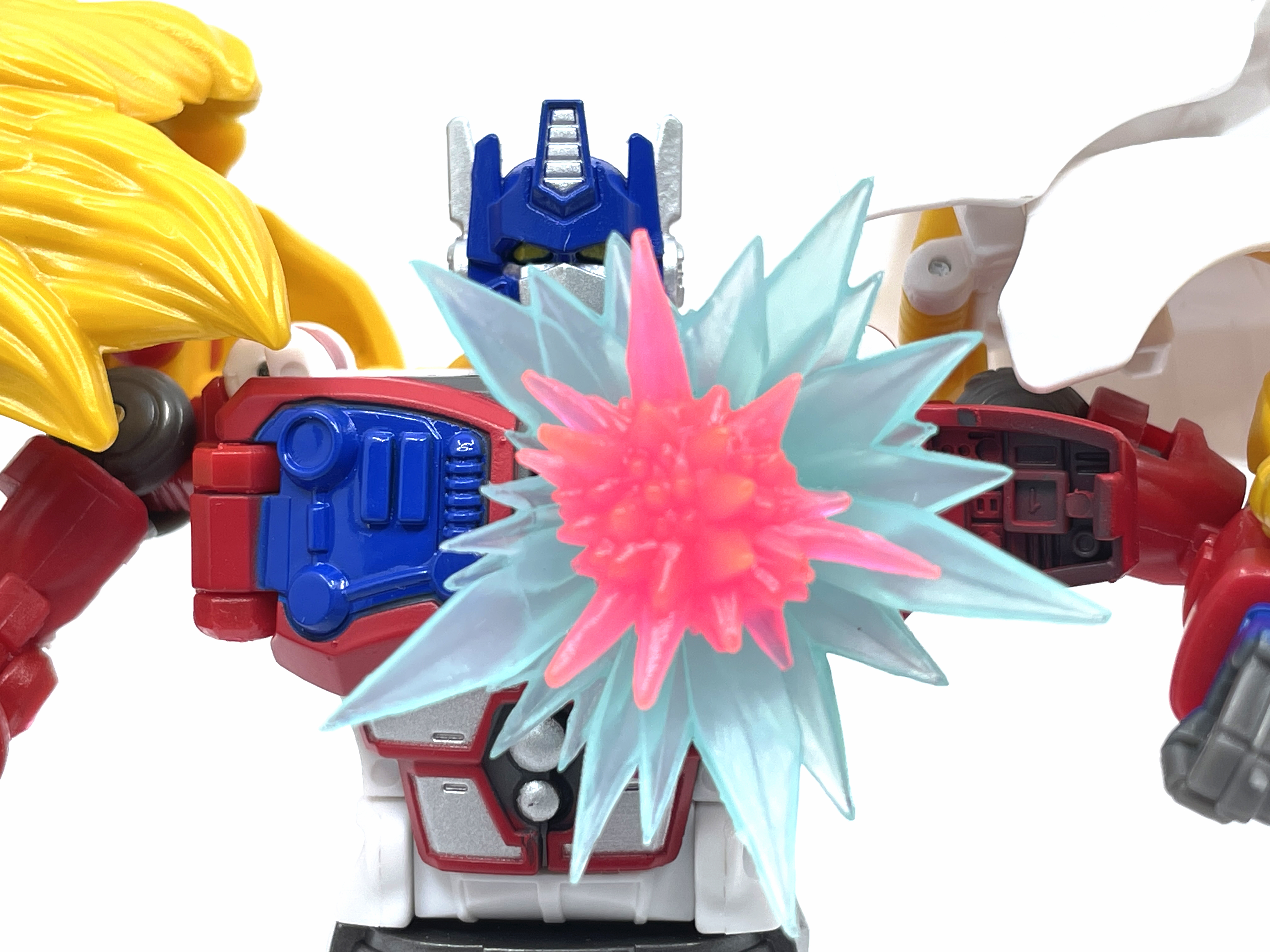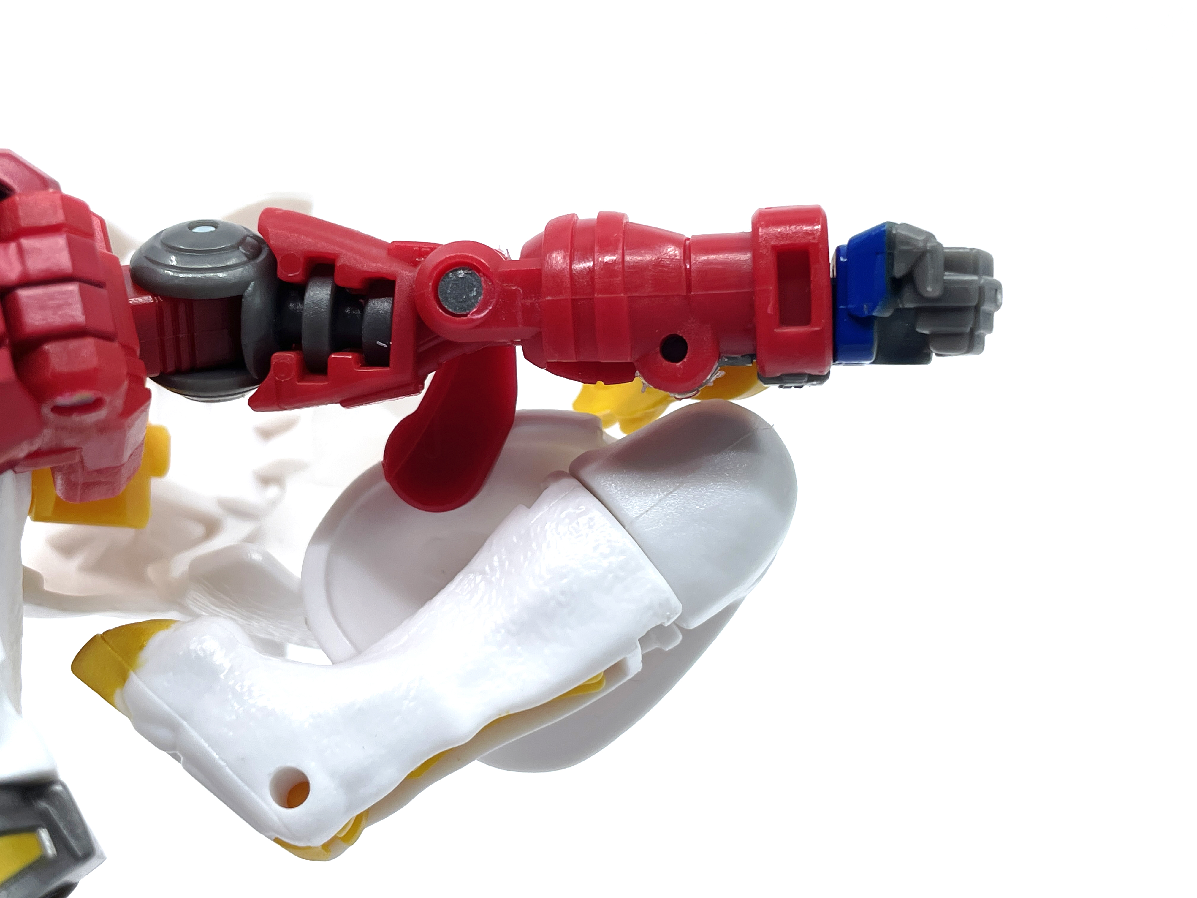 DX 완구 시절엔 커다란 미사일 발사 기믹이 존재했기에 커다란 무기로 구현됐습니다. 마스터피스와 달리 DX 완구처럼 금색 무기로 나왔는데 너무 작게 구현된 것이 아쉽게 느껴집니다. 단색 처리 역시 아쉬운 점.
